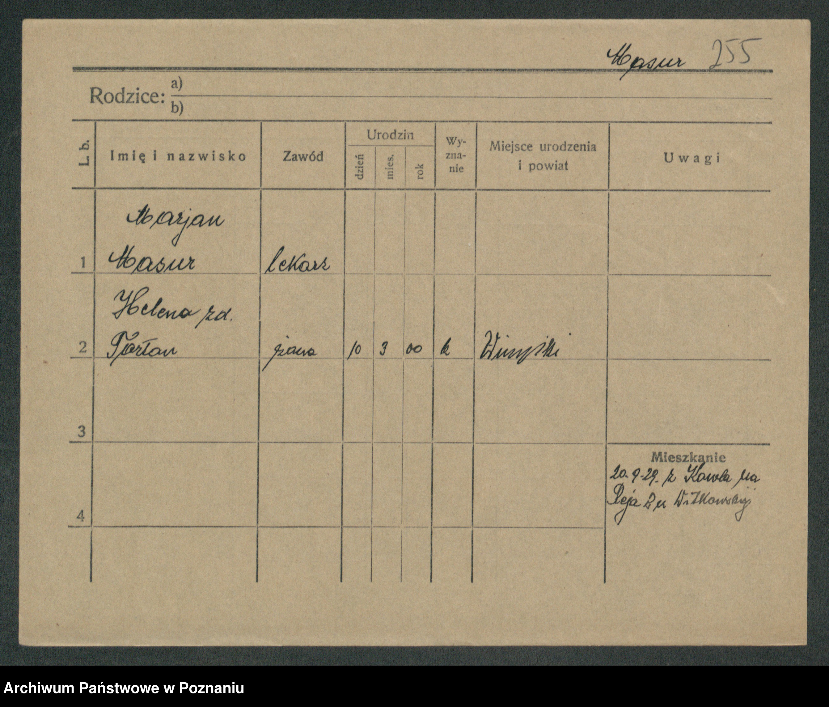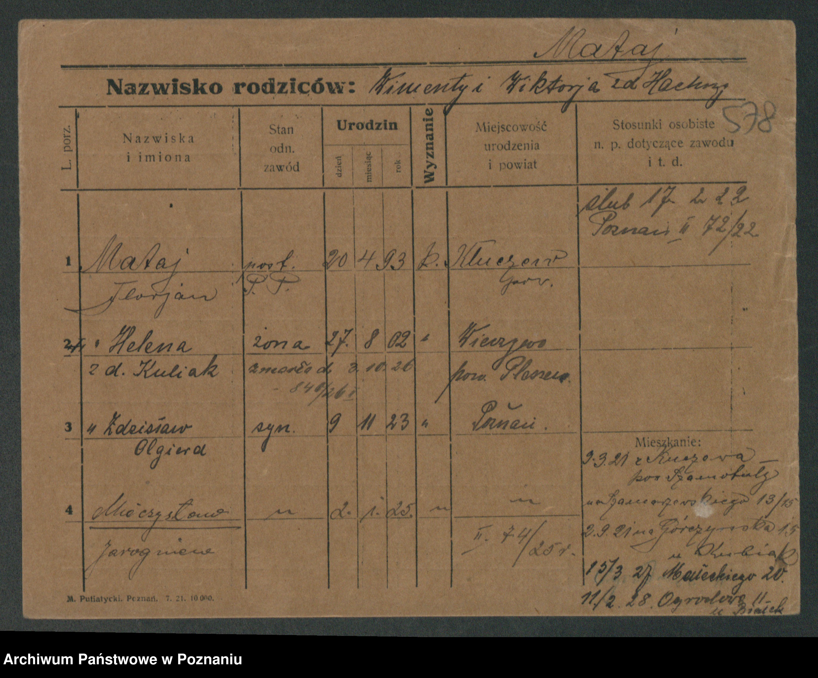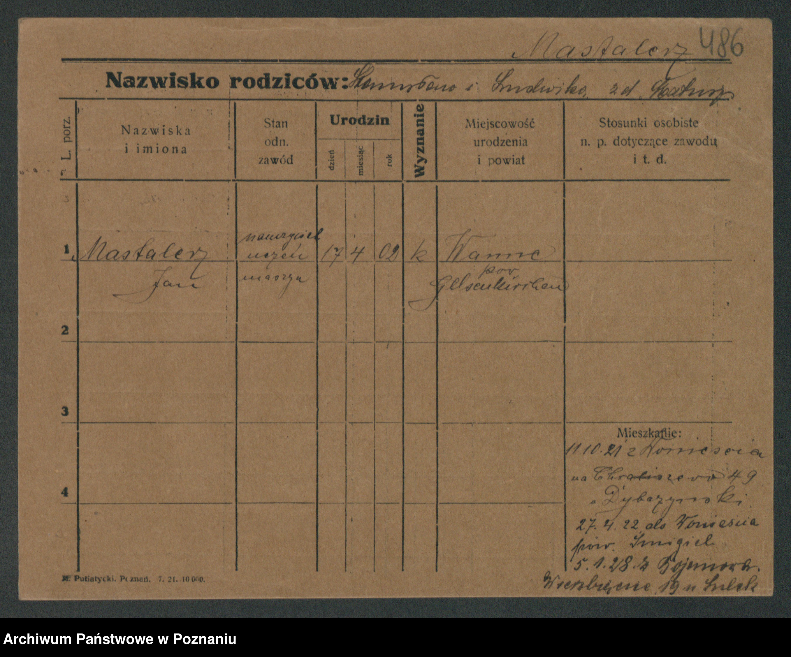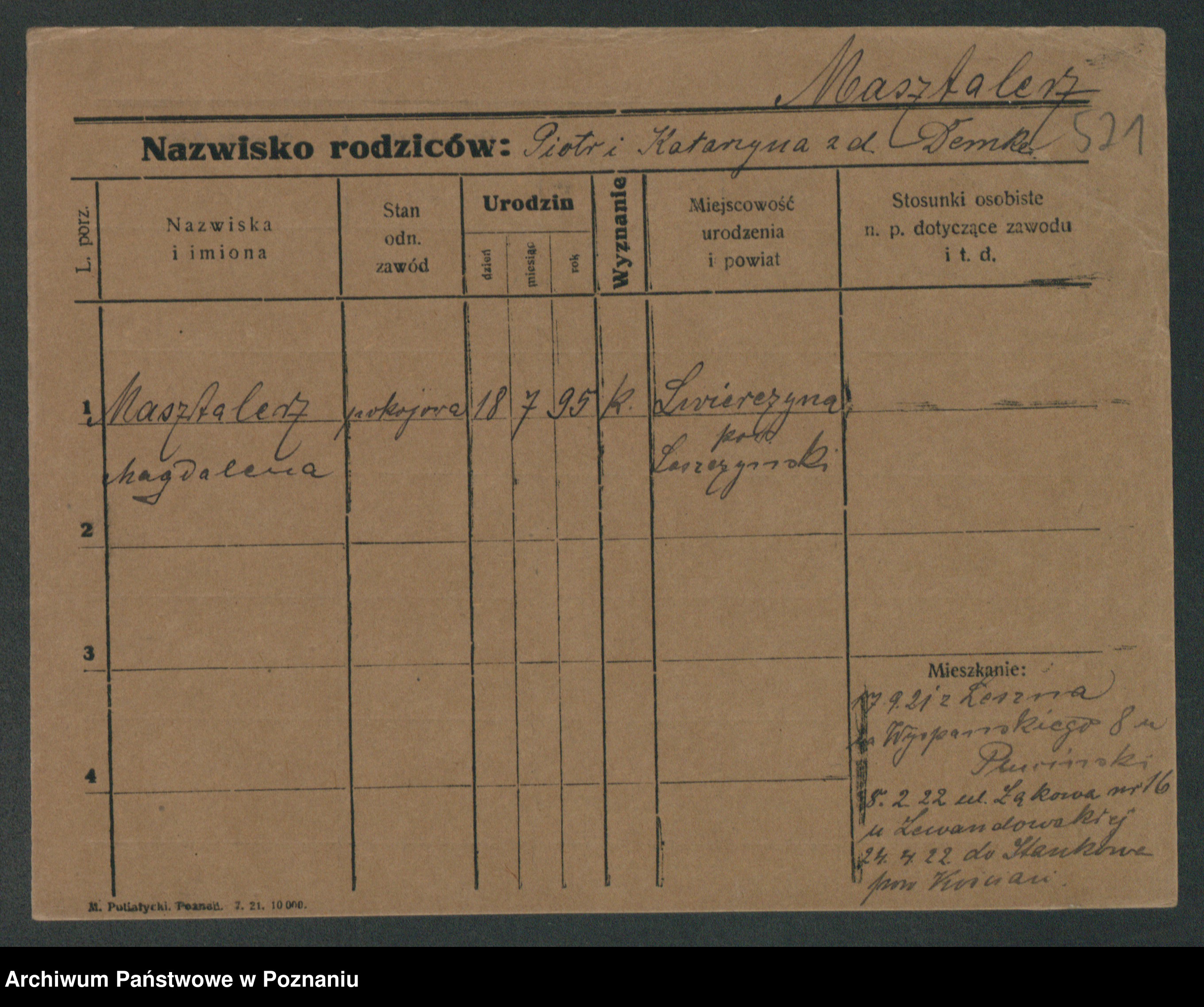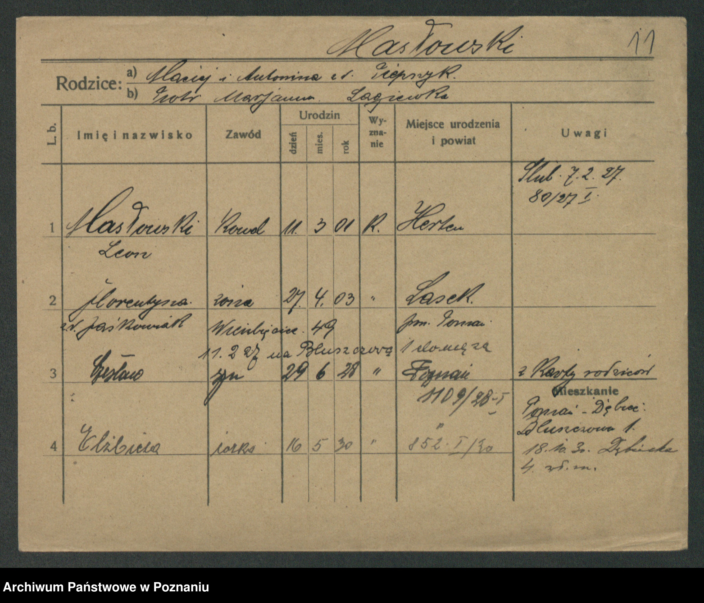 Podgląd karty osobowej dostępny jest po kliknięciu na nazwisko lub ikonkę karty. Można dokonywać powiększenia (ikony na górze) lub przechodzić między kolejnymi skanami (strzałki po bokach).