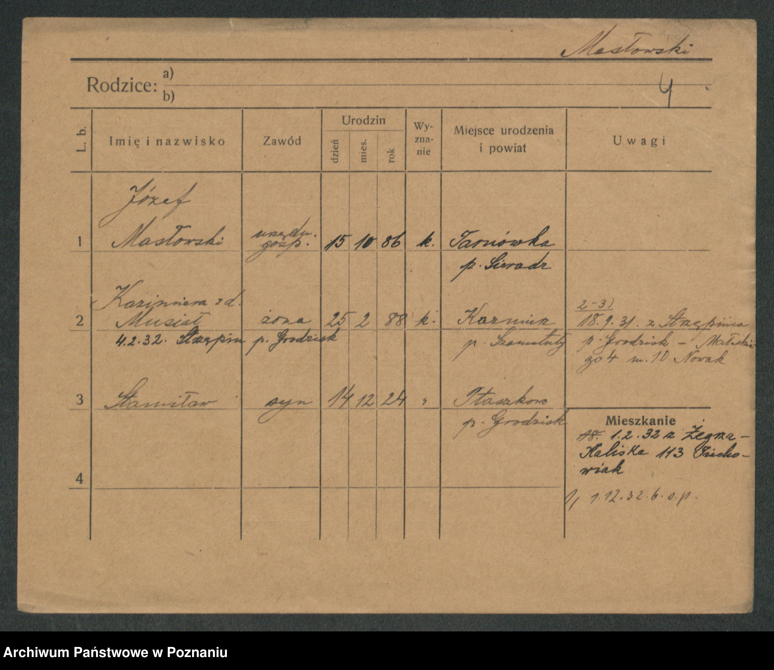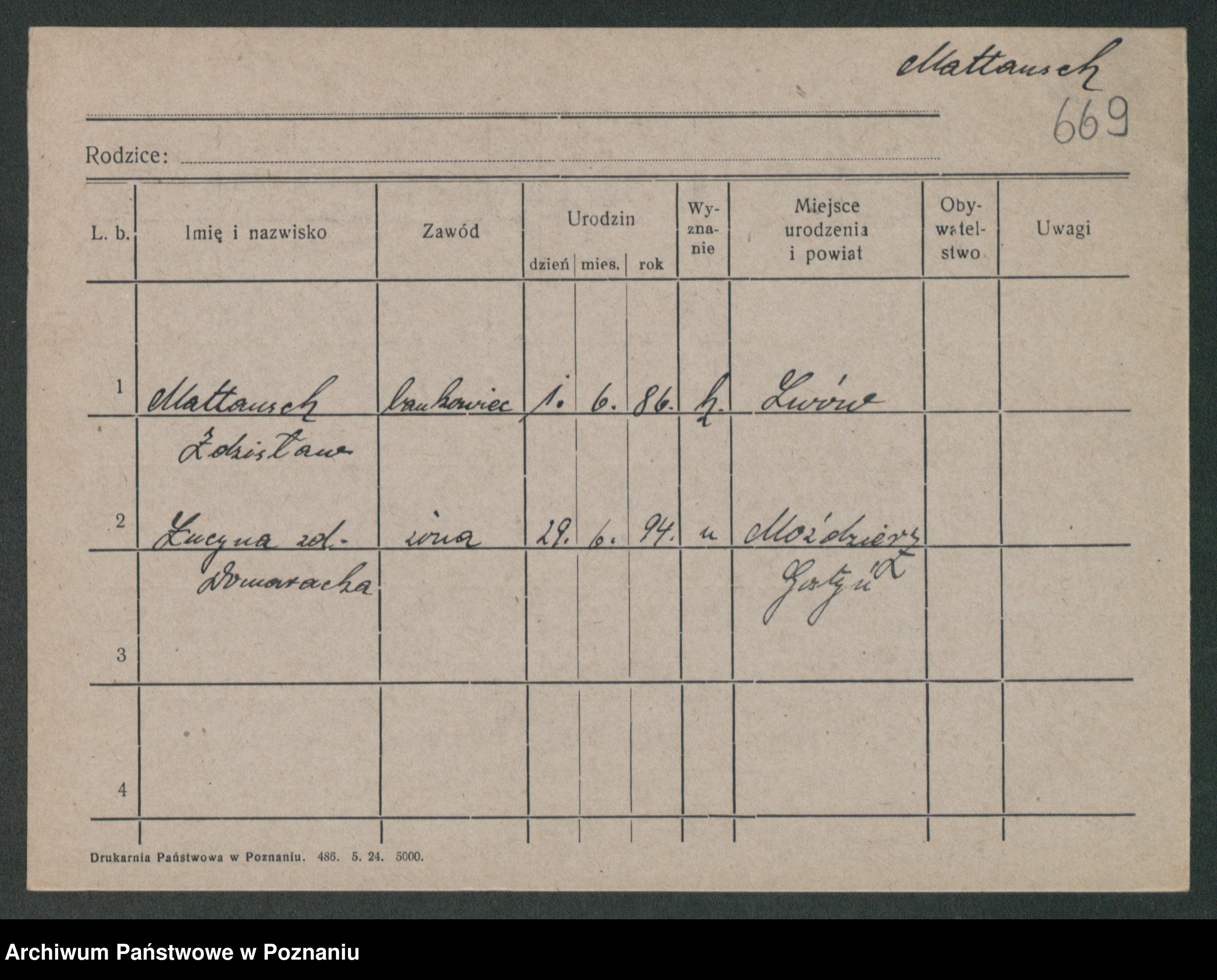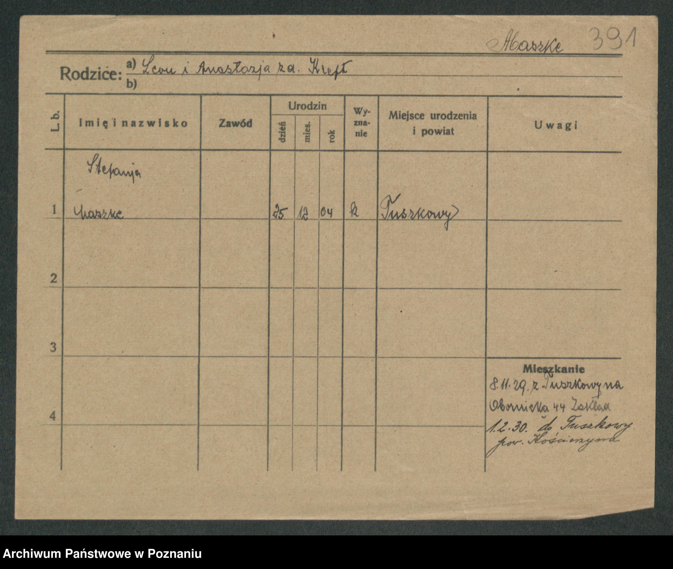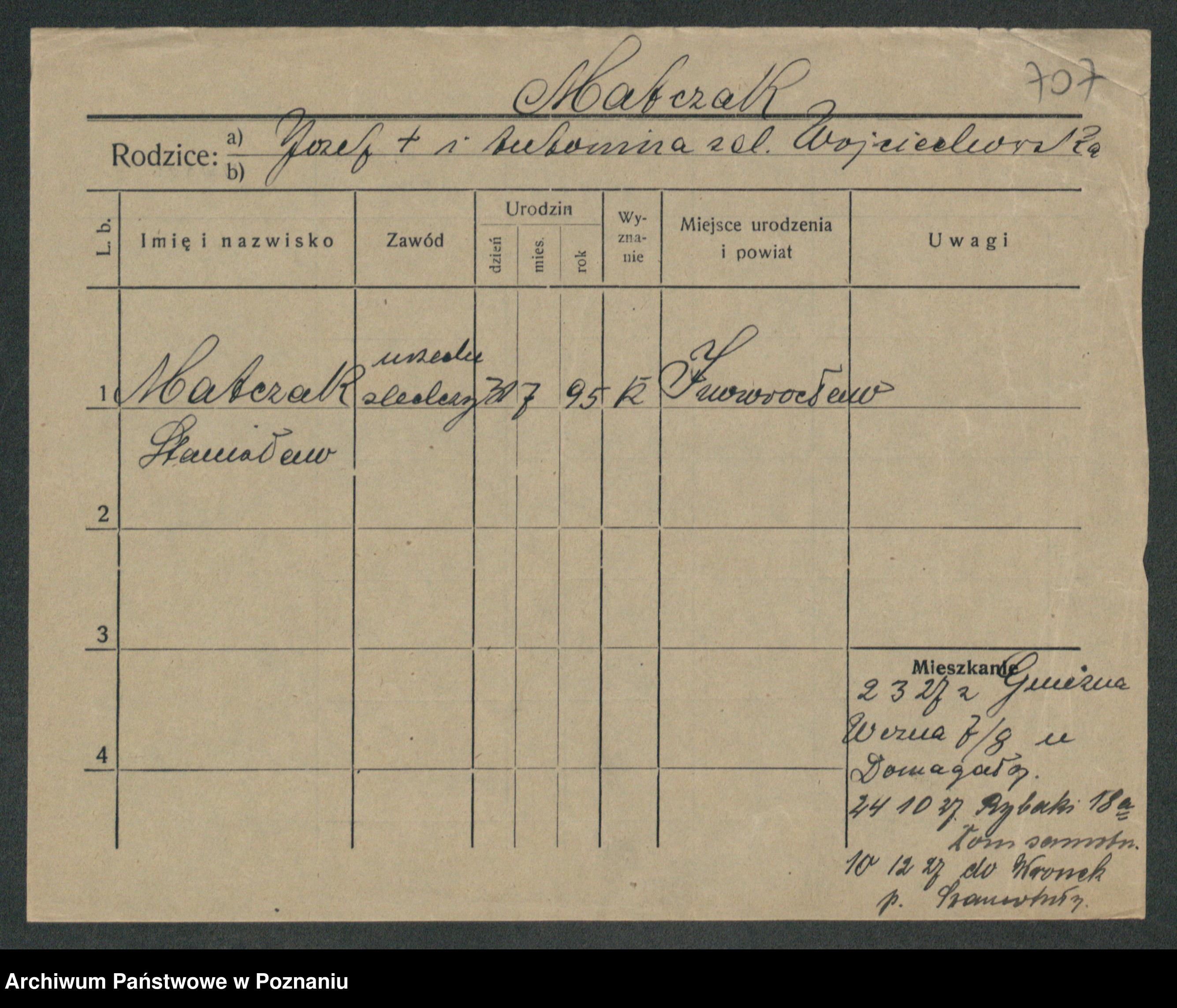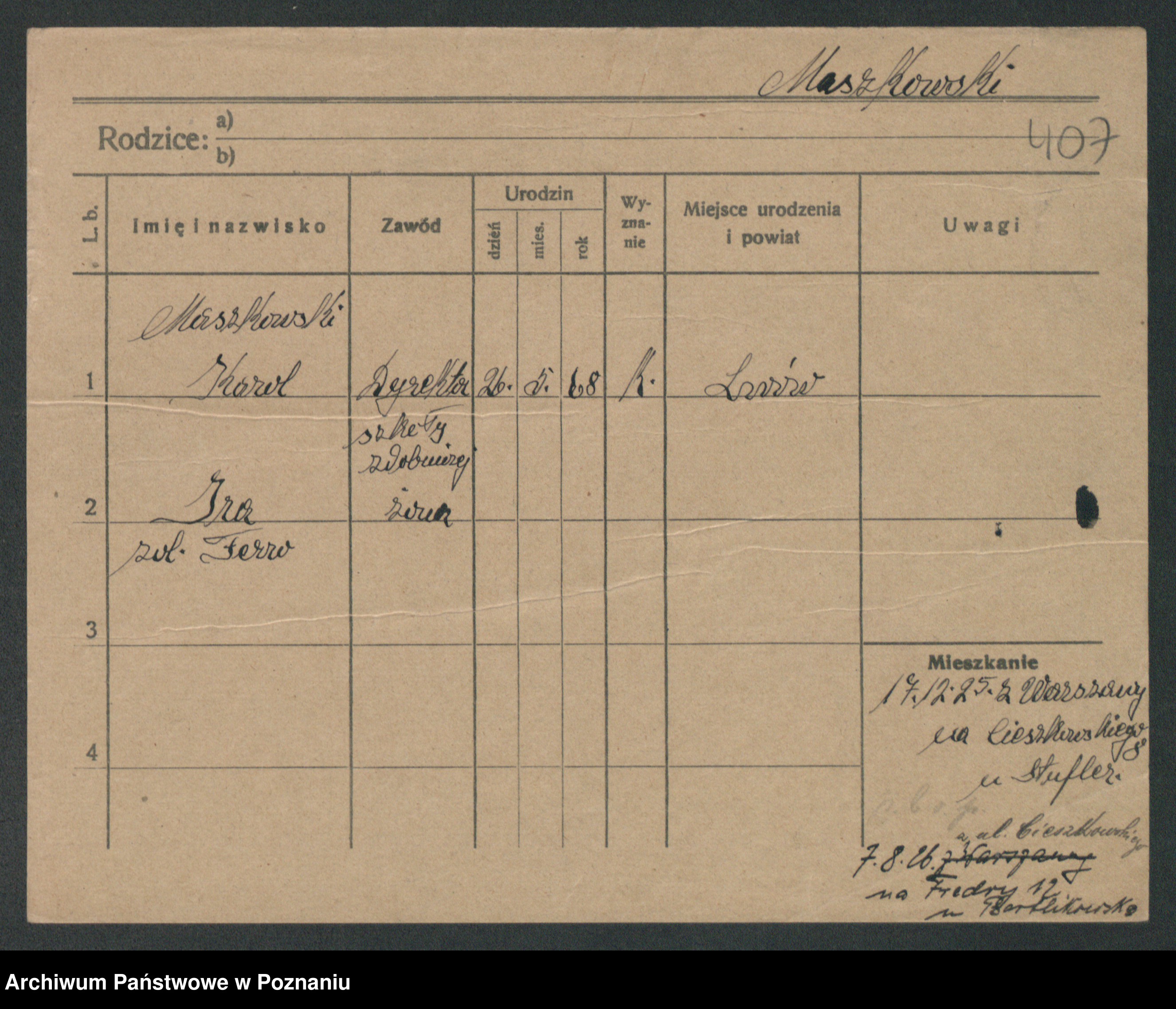 Podgląd karty osobowej dostępny jest po kliknięciu na nazwisko lub ikonkę karty. Można dokonywać powiększenia (ikony na górze) lub przechodzić między kolejnymi skanami (strzałki po bokach).