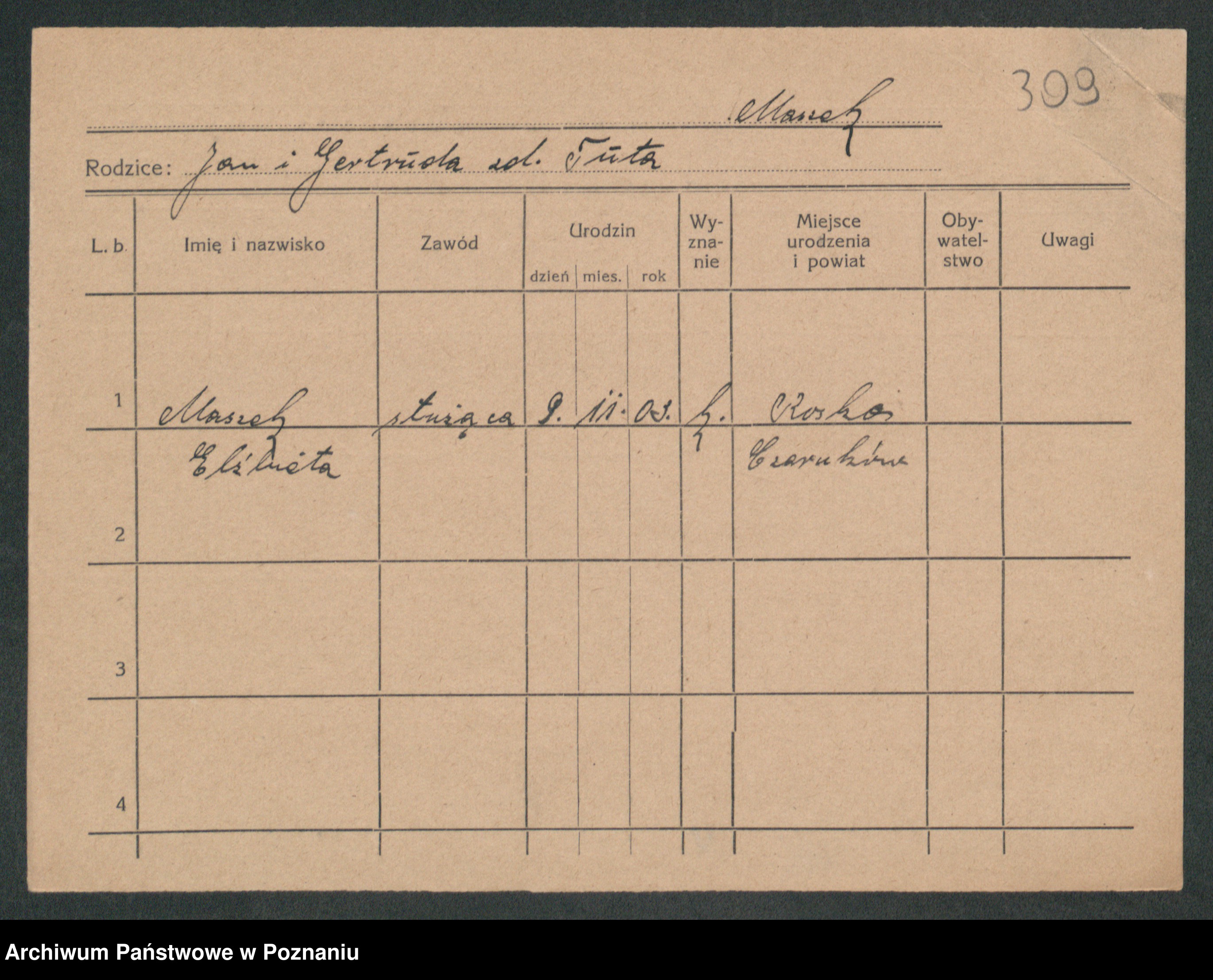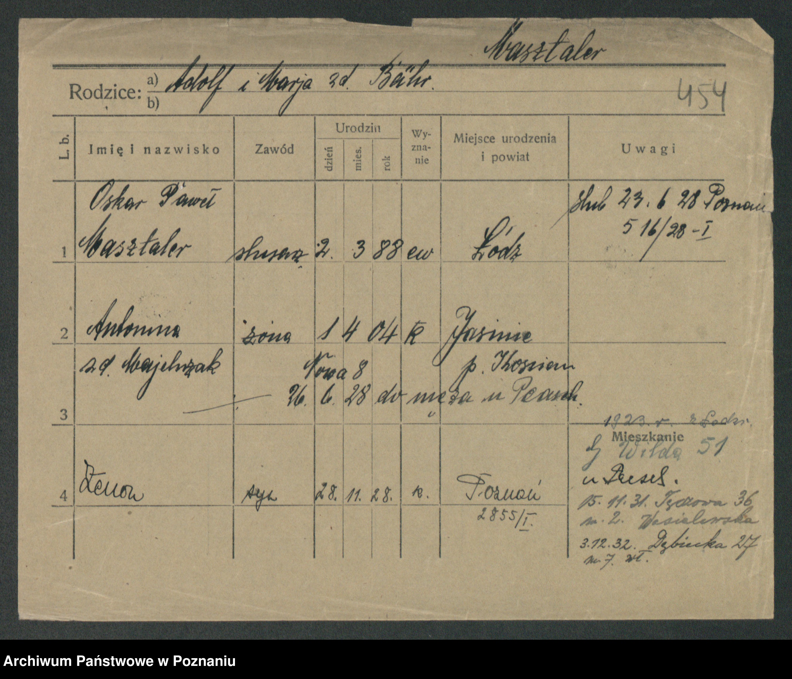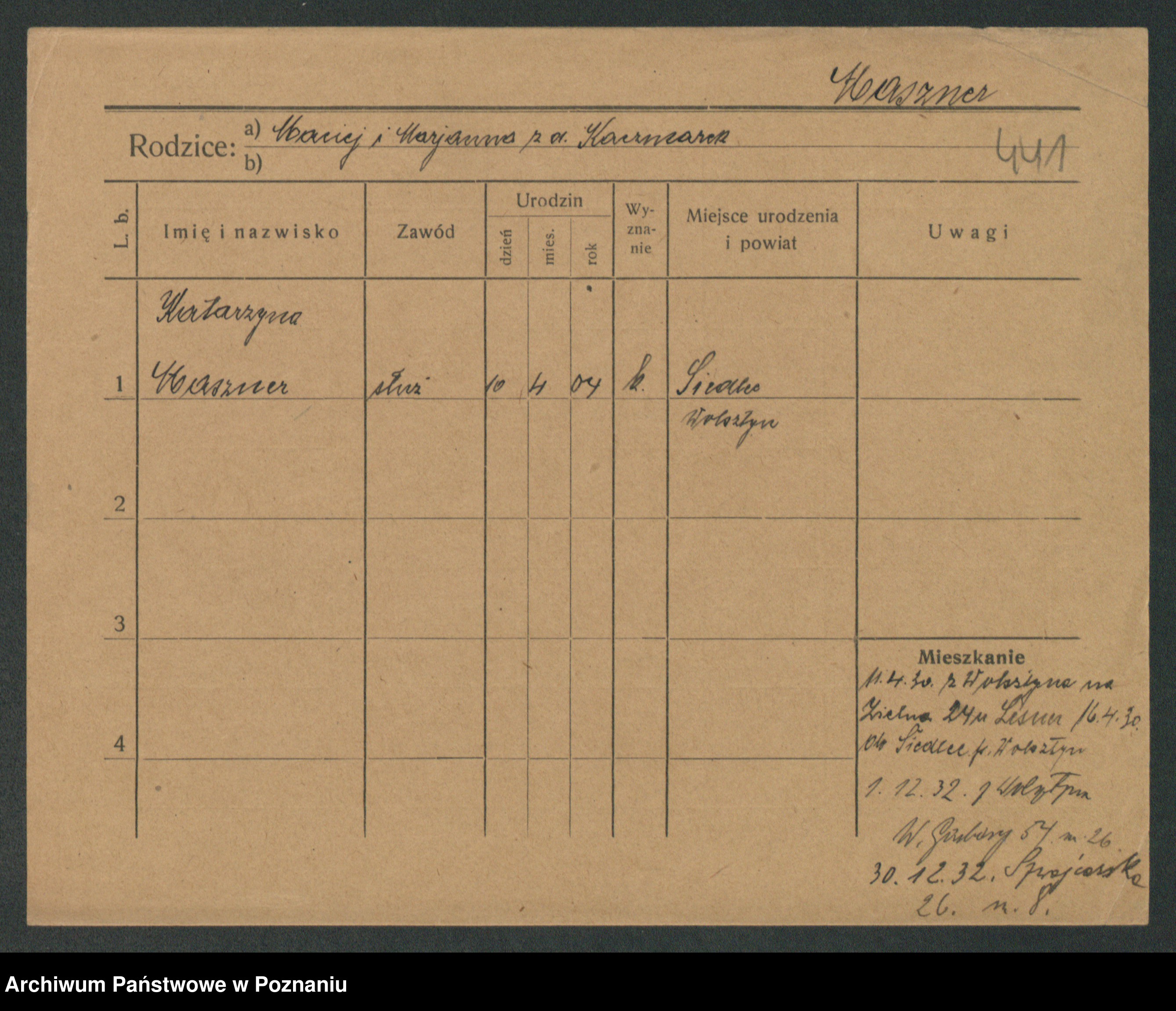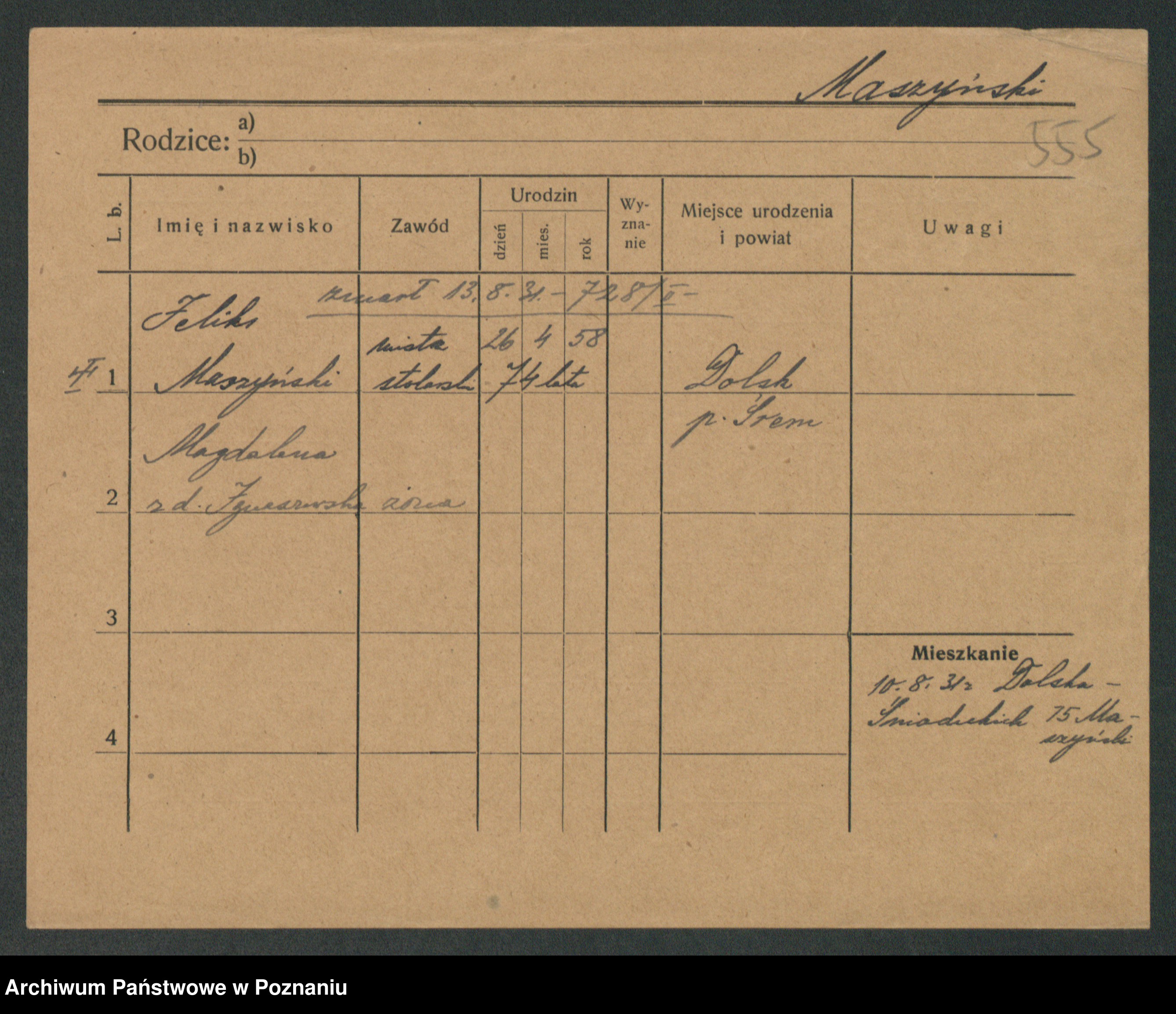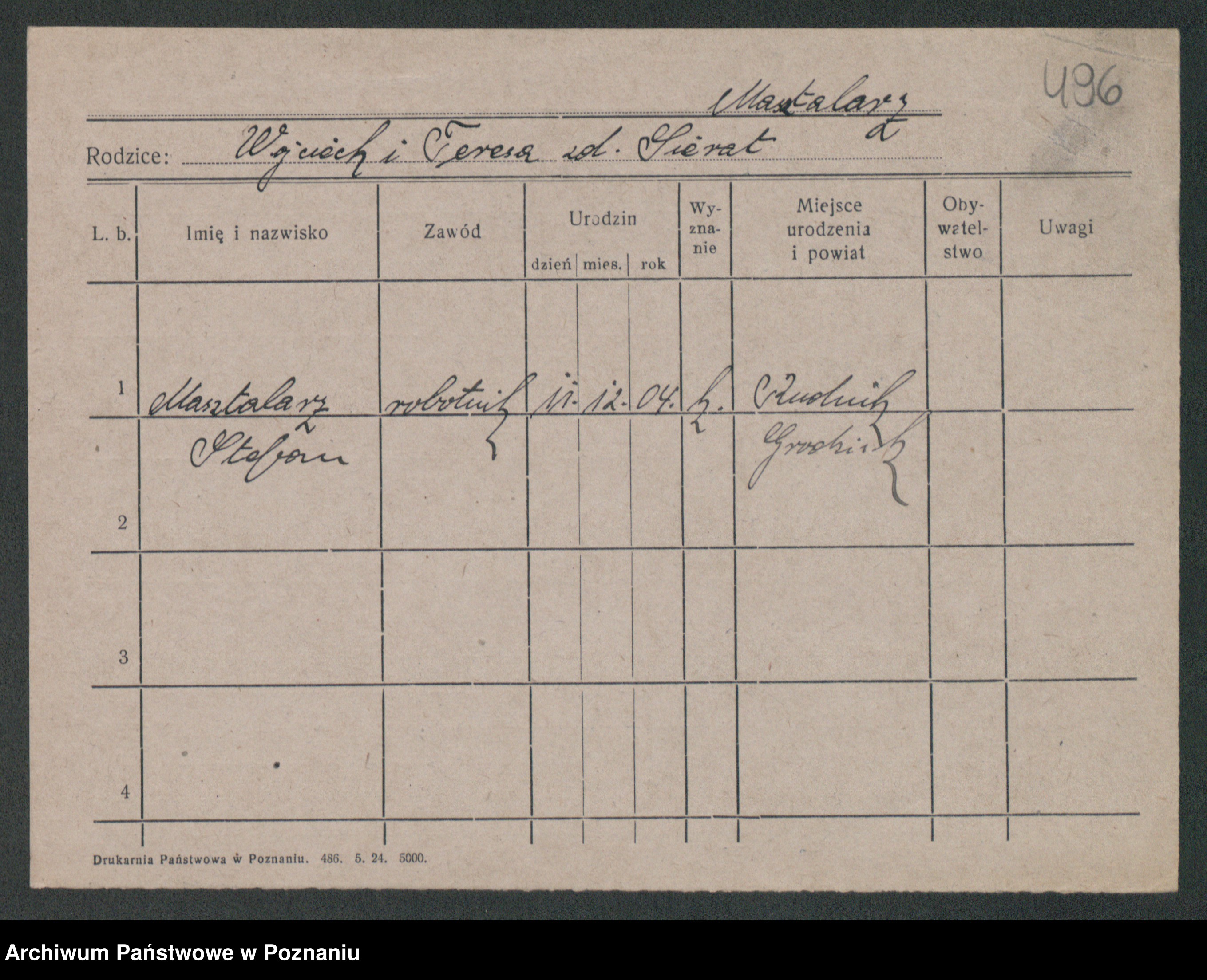 Podgląd karty osobowej dostępny jest po kliknięciu na nazwisko lub ikonkę karty. Można dokonywać powiększenia (ikony na górze) lub przechodzić między kolejnymi skanami (strzałki po bokach).