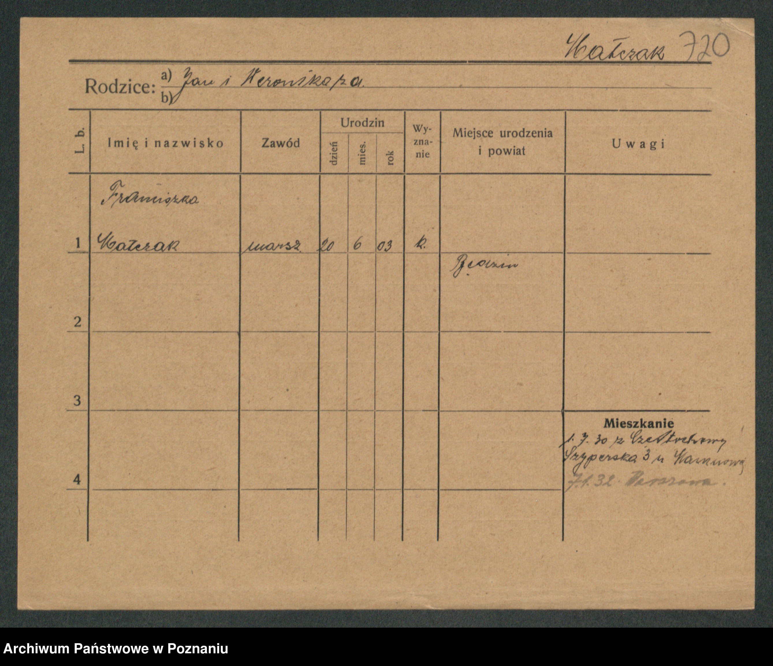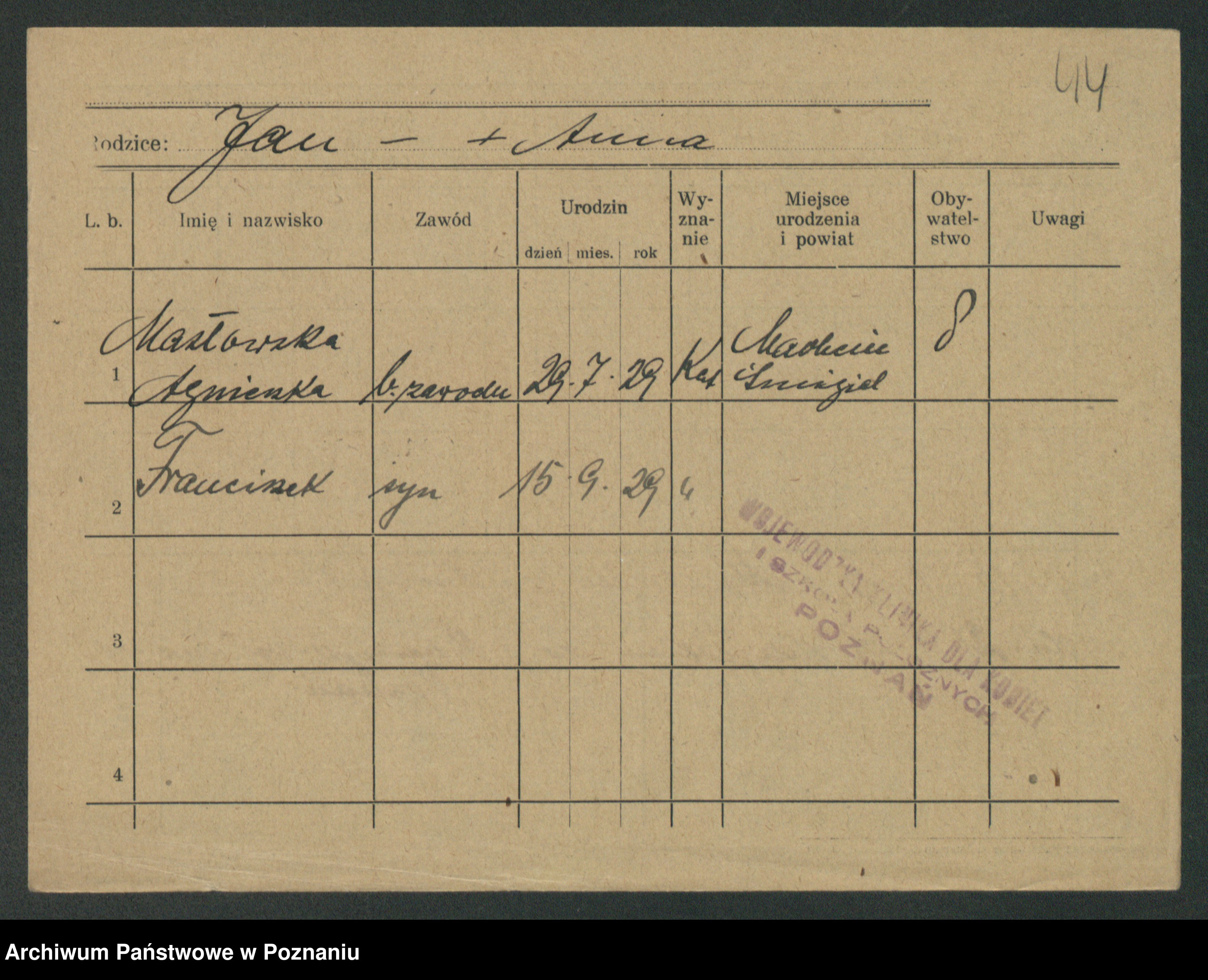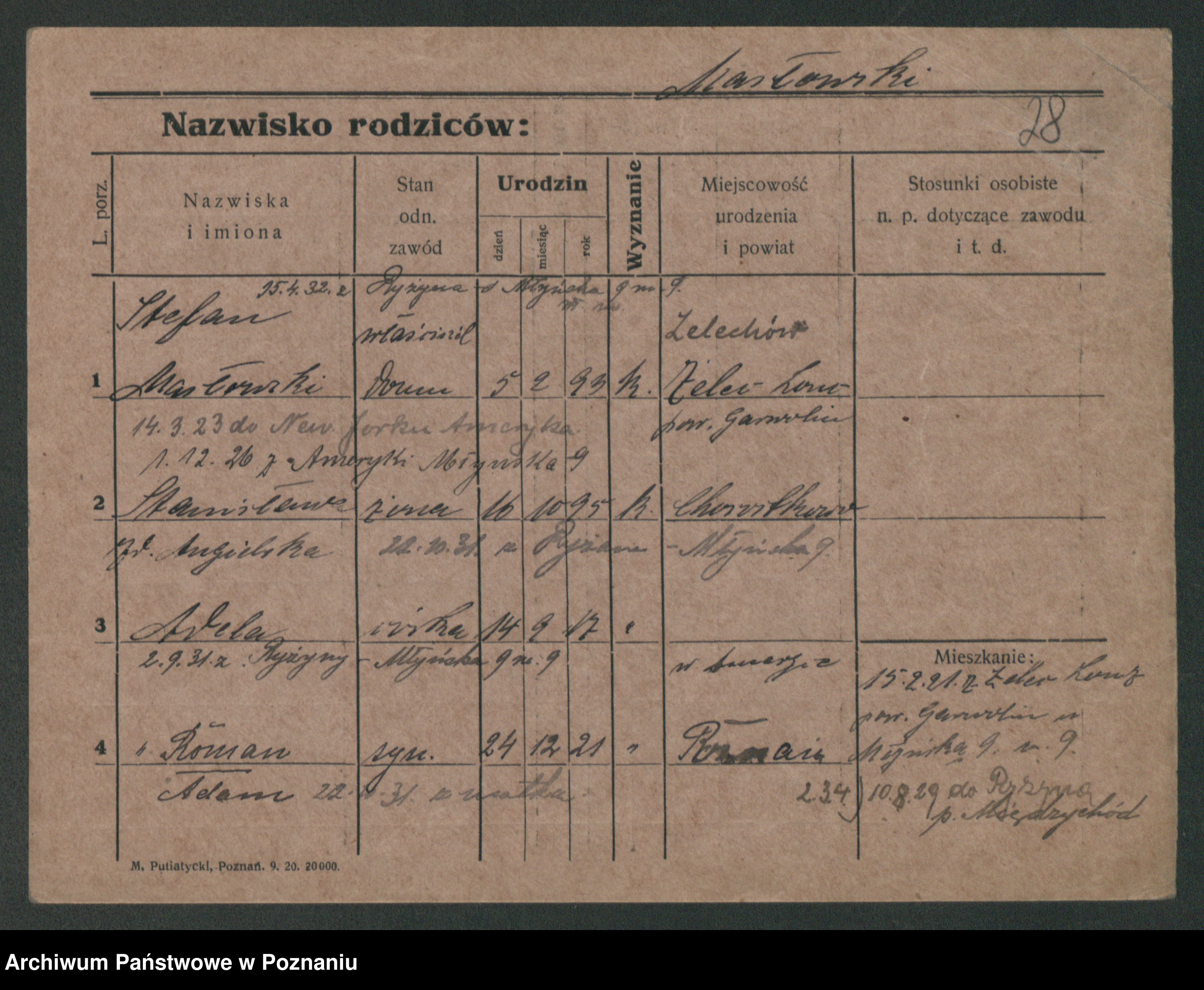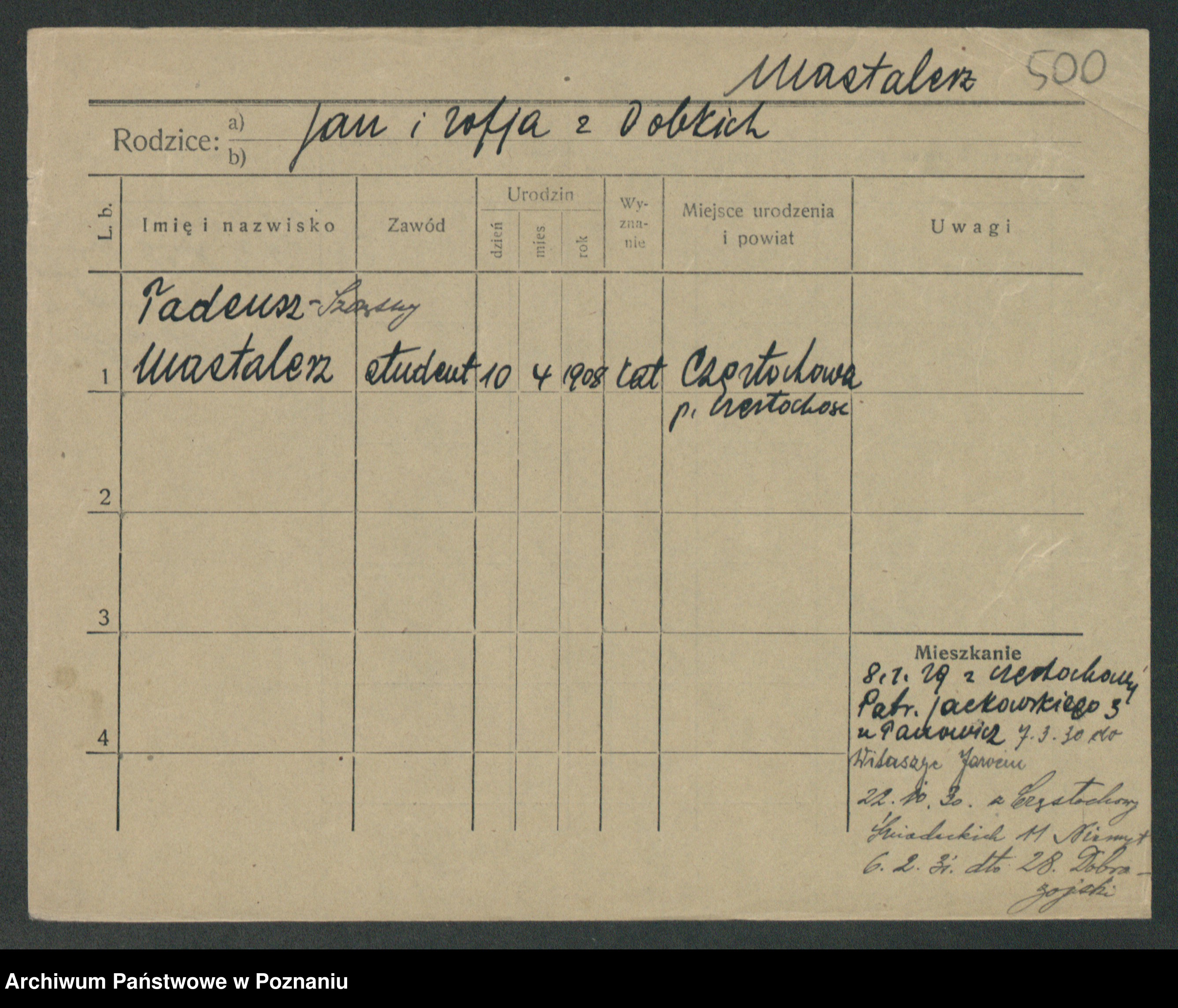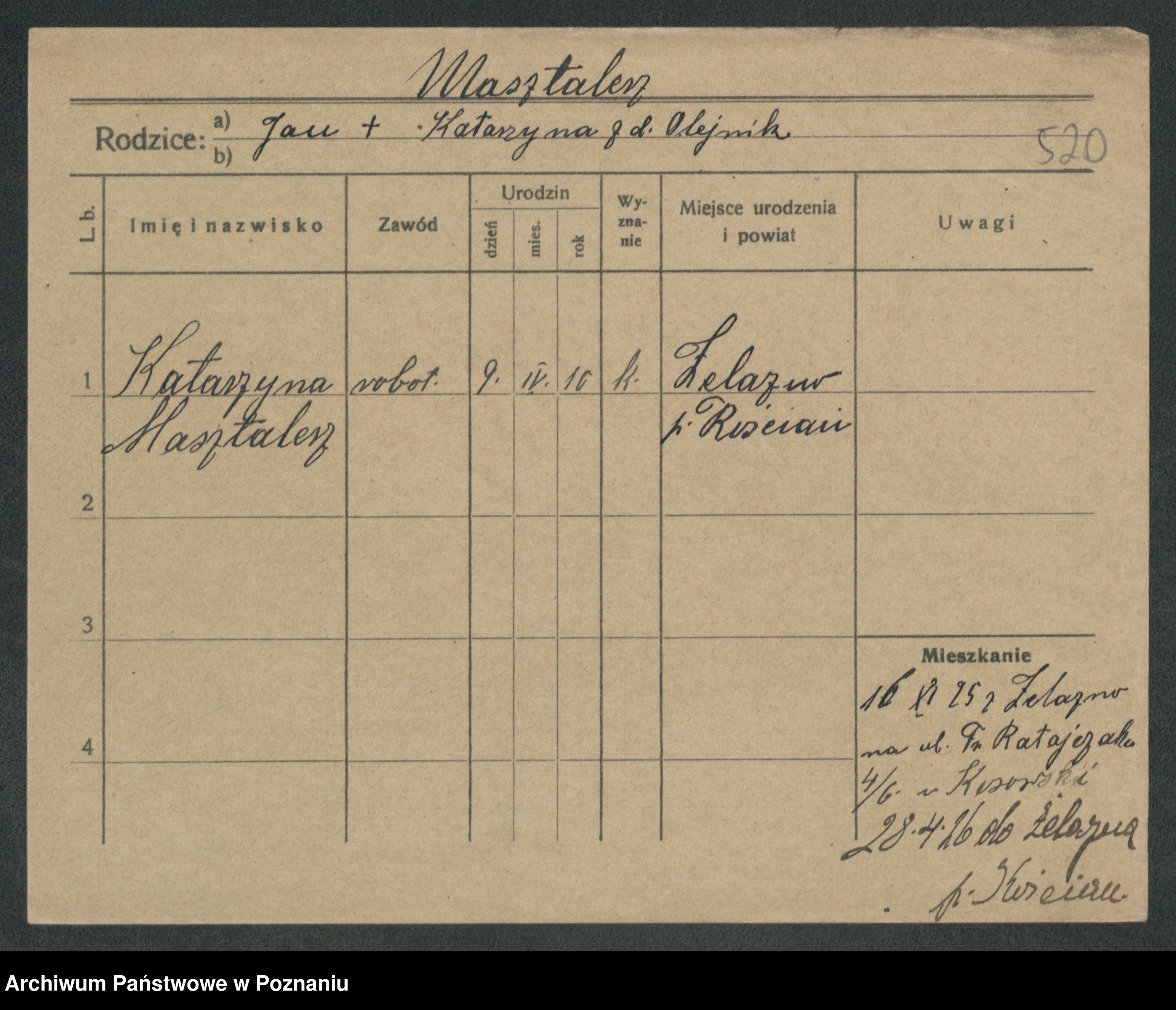 Podgląd karty osobowej dostępny jest po kliknięciu na nazwisko lub ikonkę karty. Można dokonywać powiększenia (ikony na górze) lub przechodzić między kolejnymi skanami (strzałki po bokach).