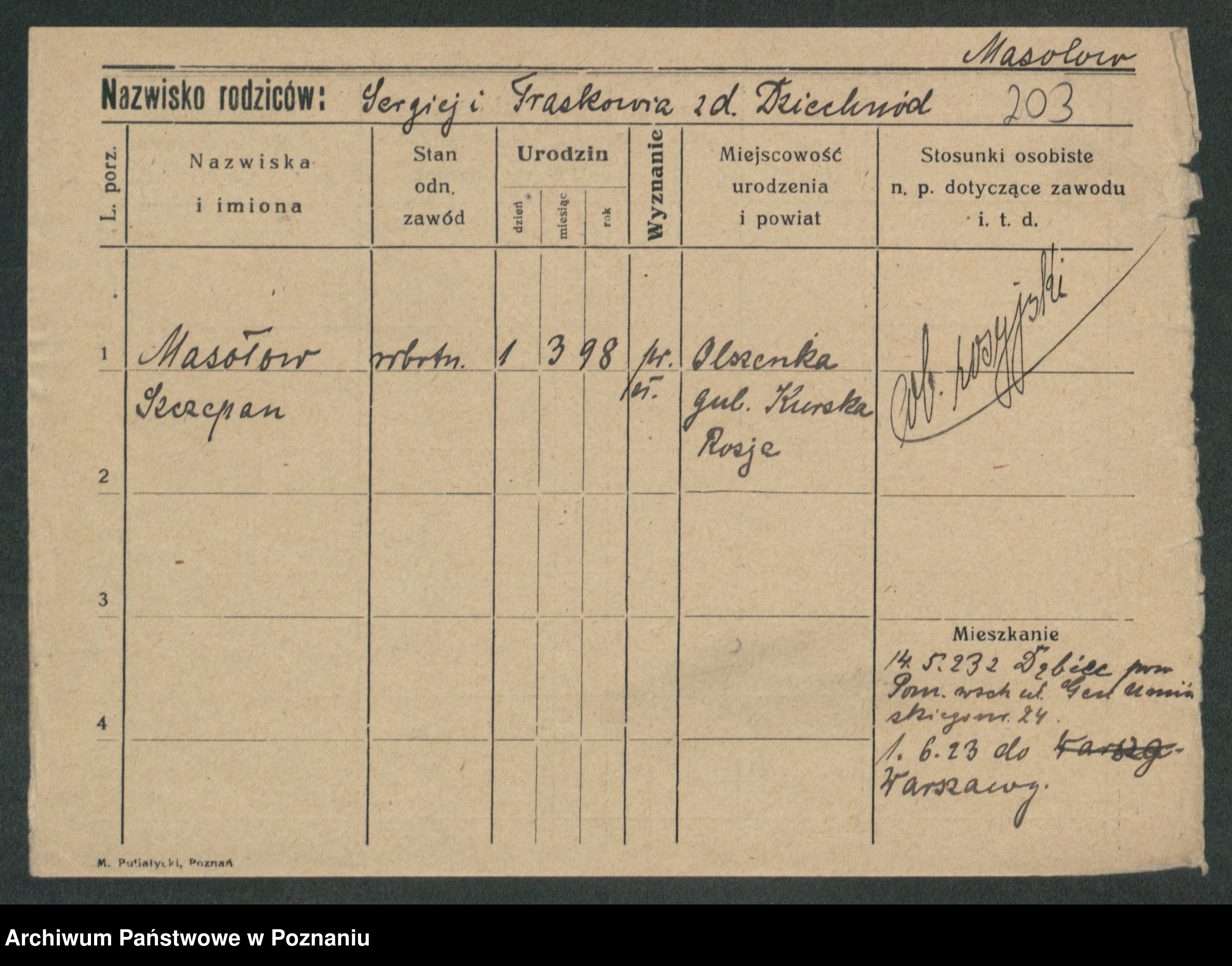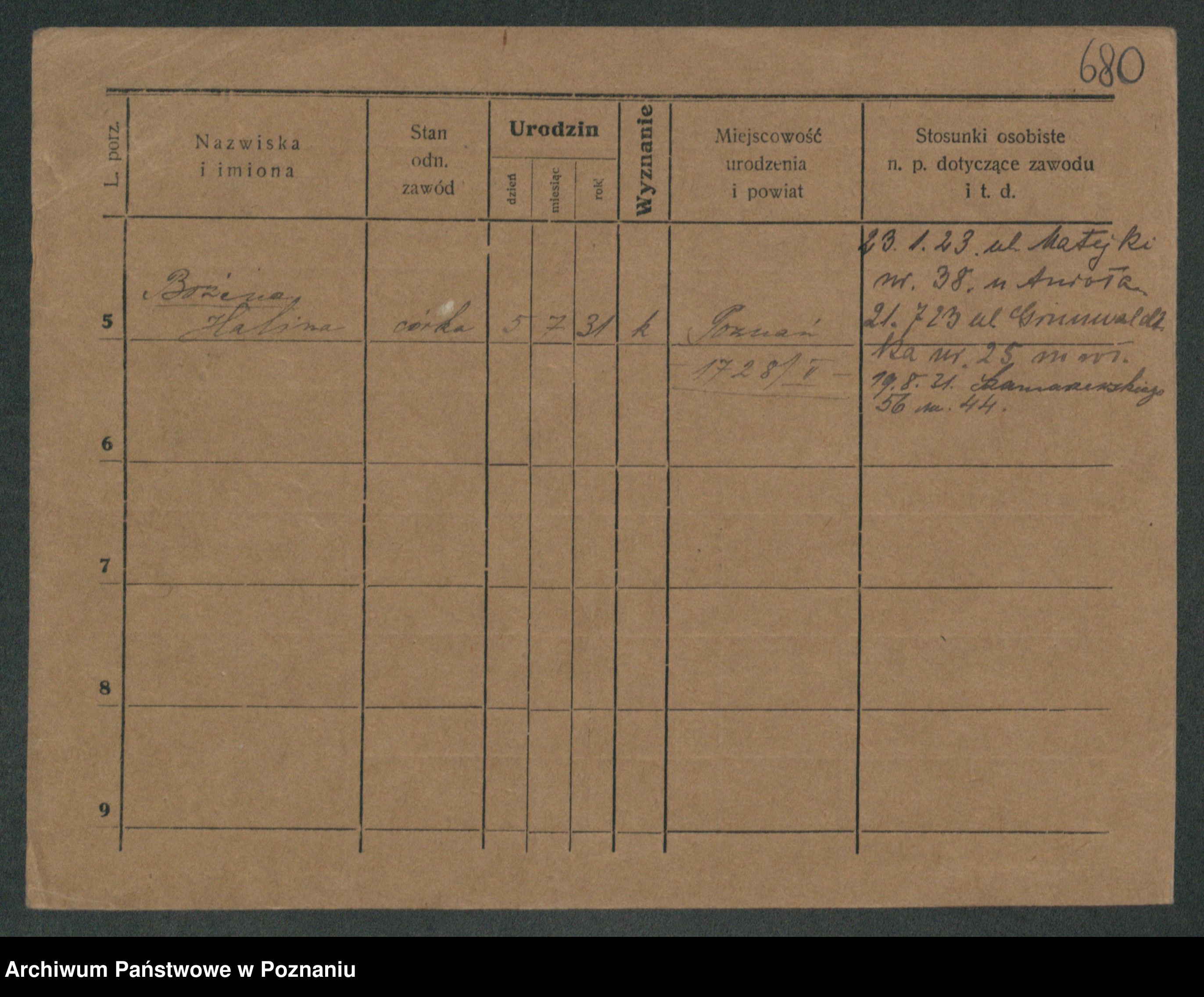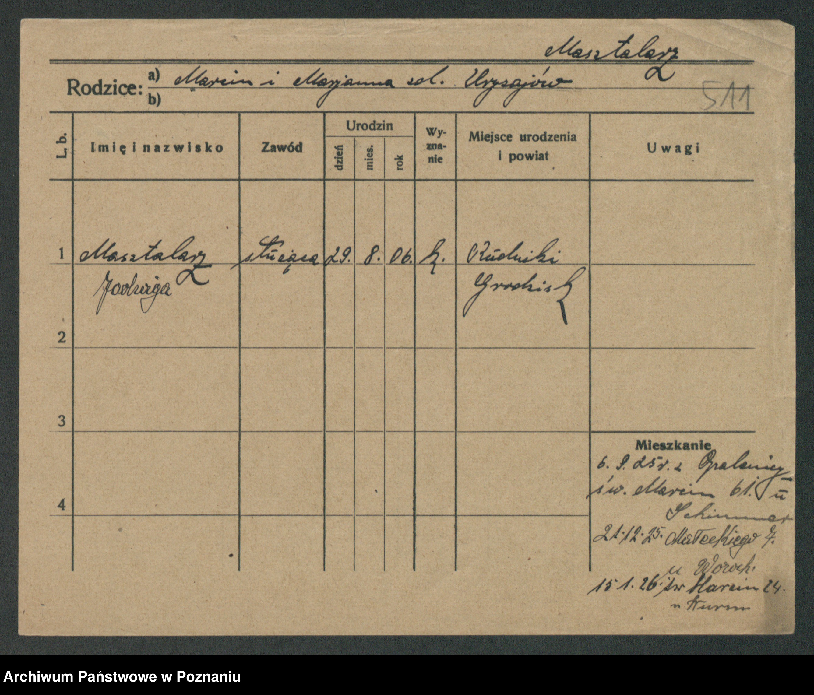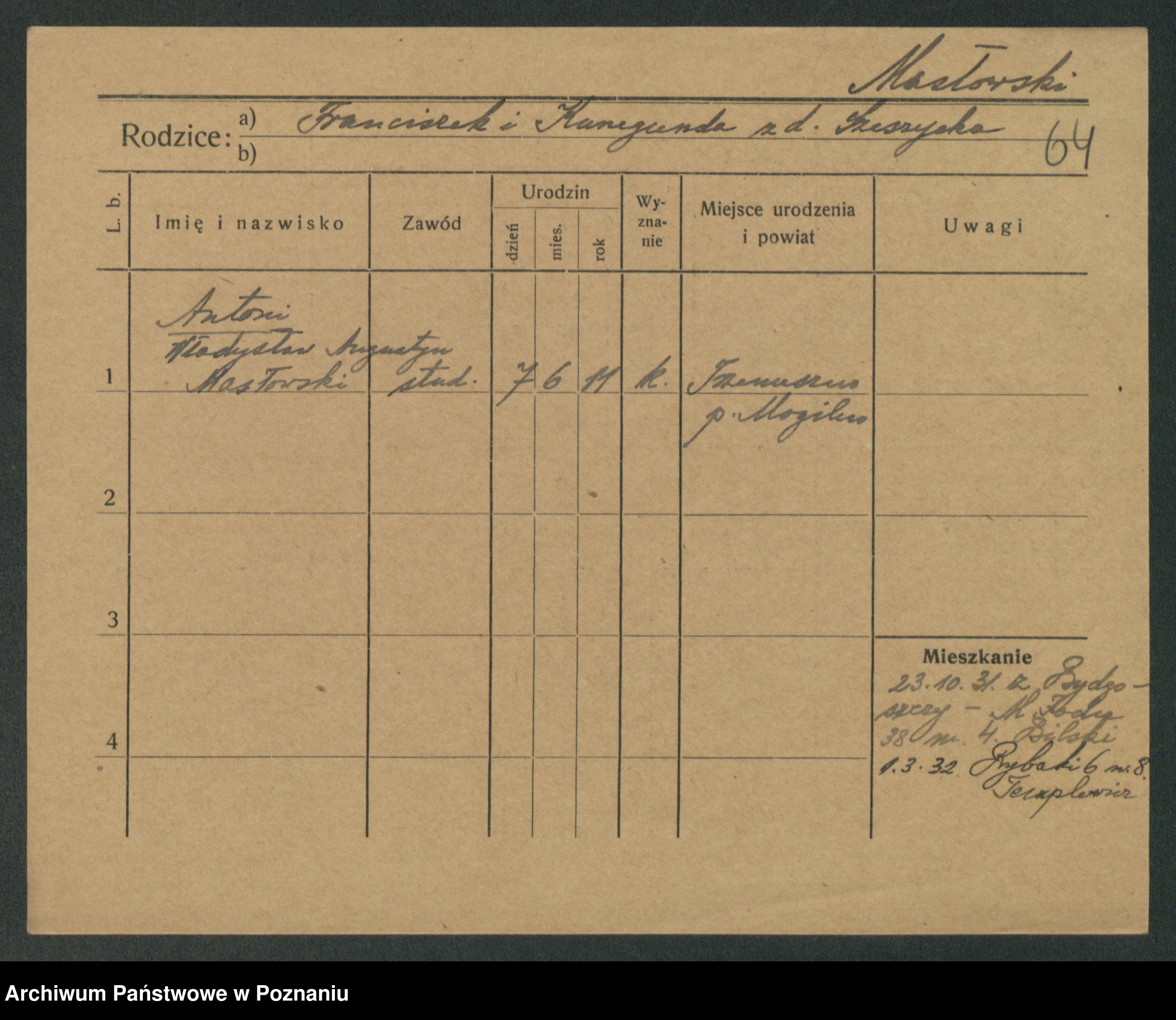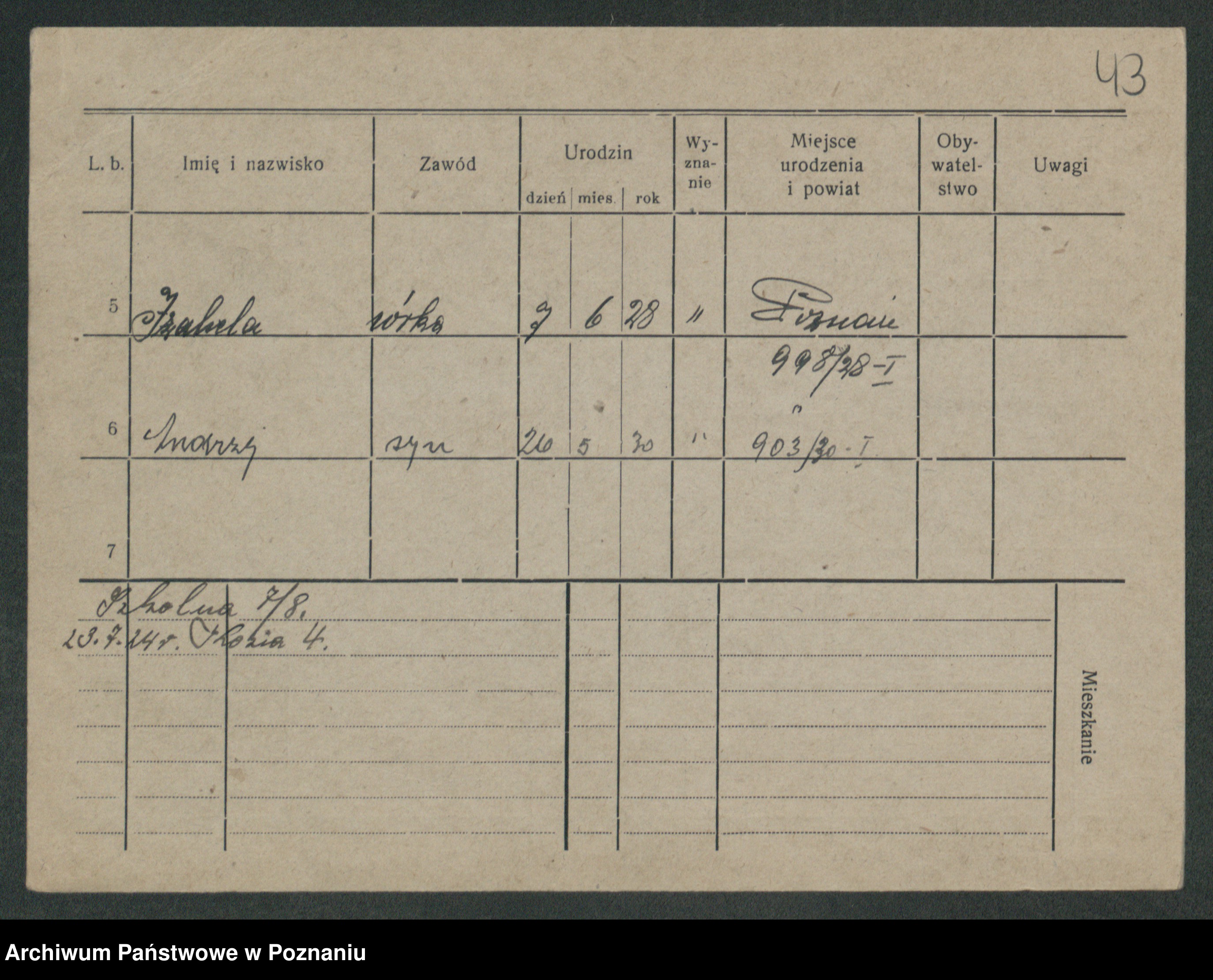 Podgląd karty osobowej dostępny jest po kliknięciu na nazwisko lub ikonkę karty. Można dokonywać powiększenia (ikony na górze) lub przechodzić między kolejnymi skanami (strzałki po bokach).