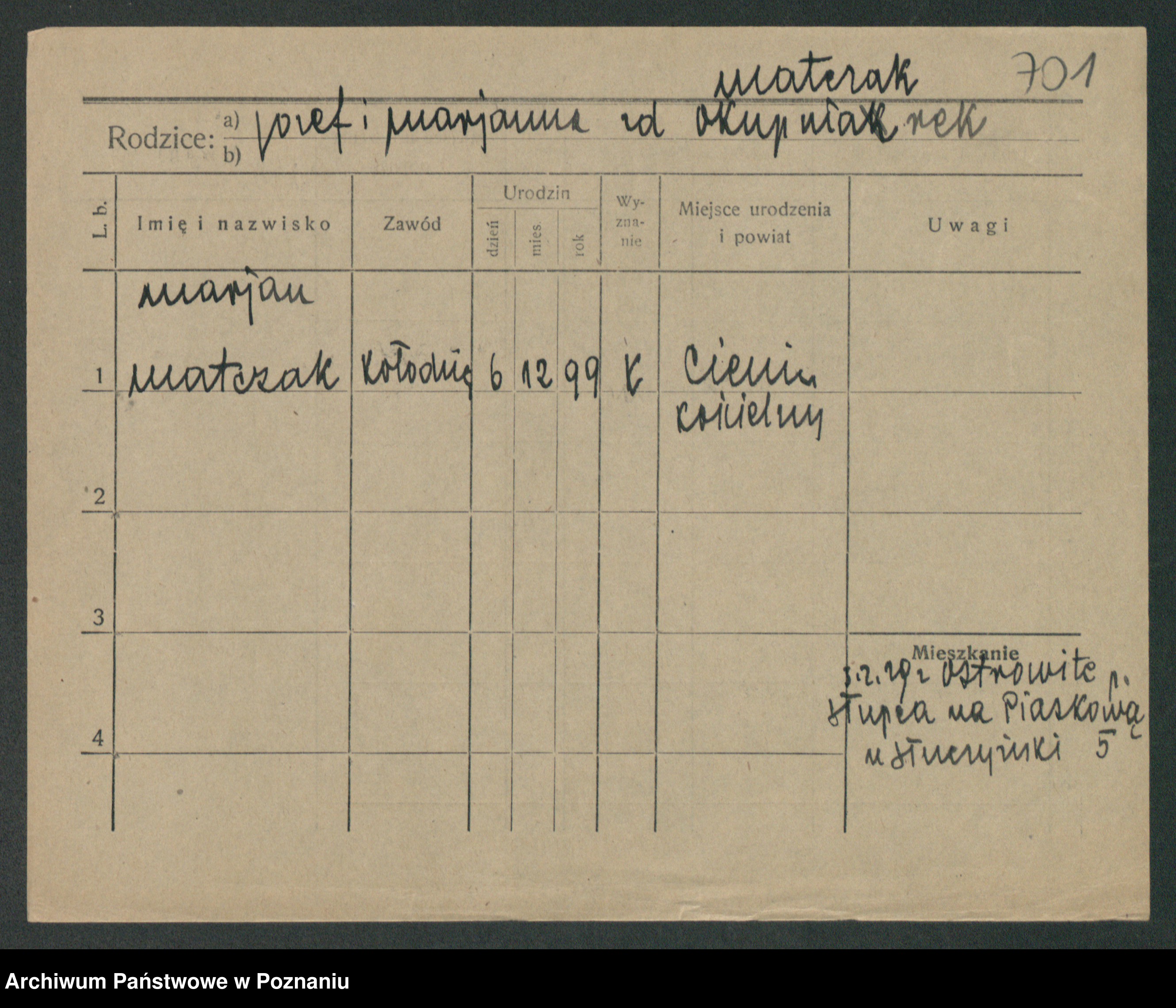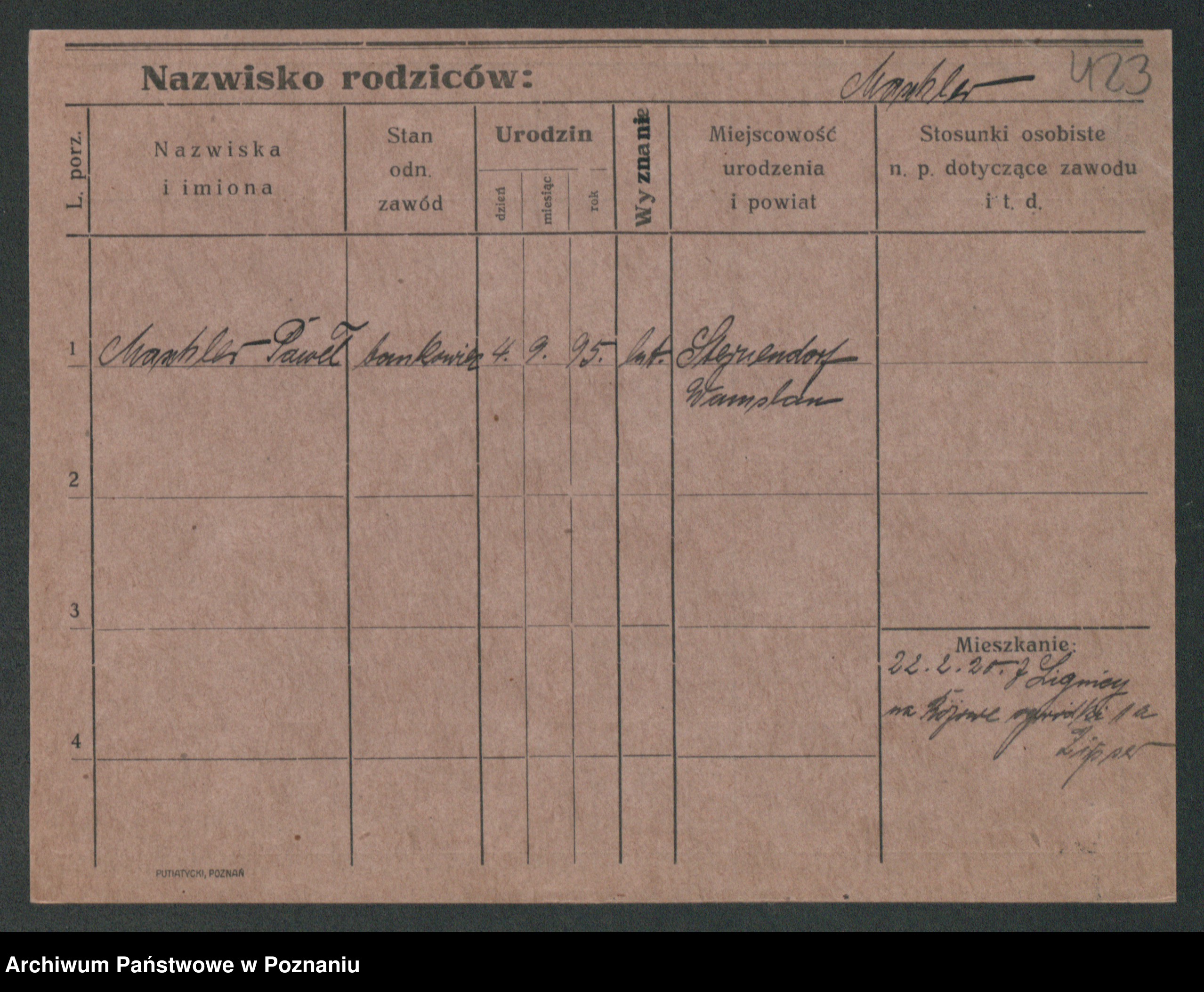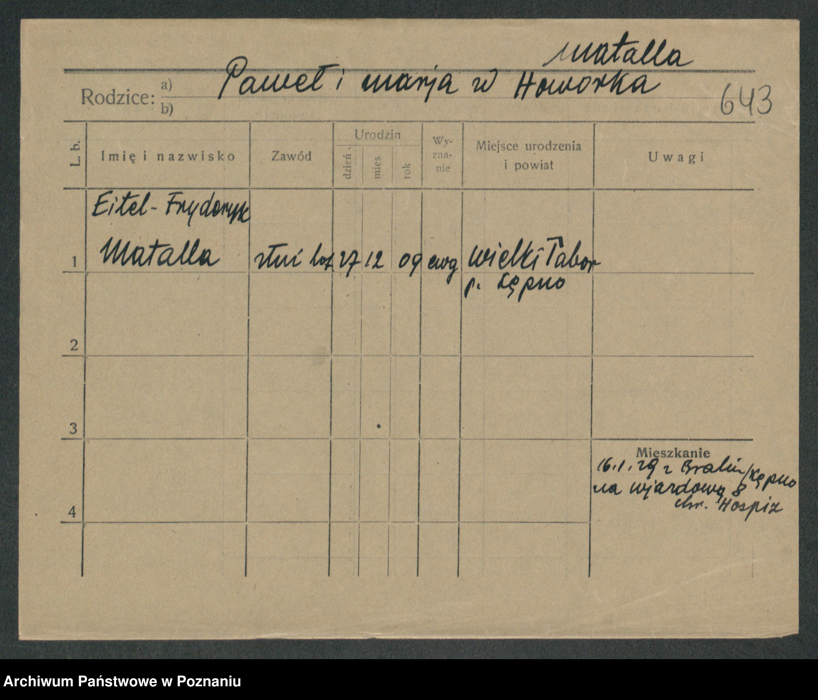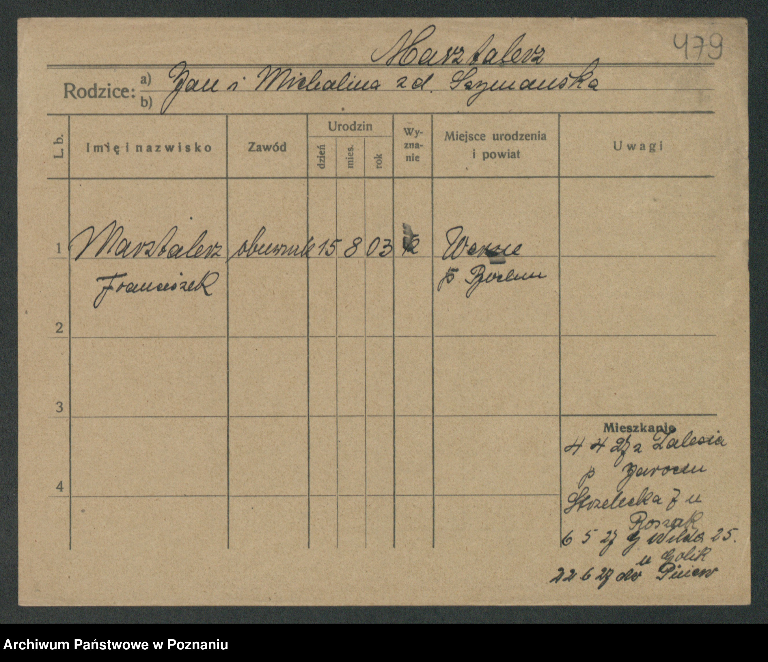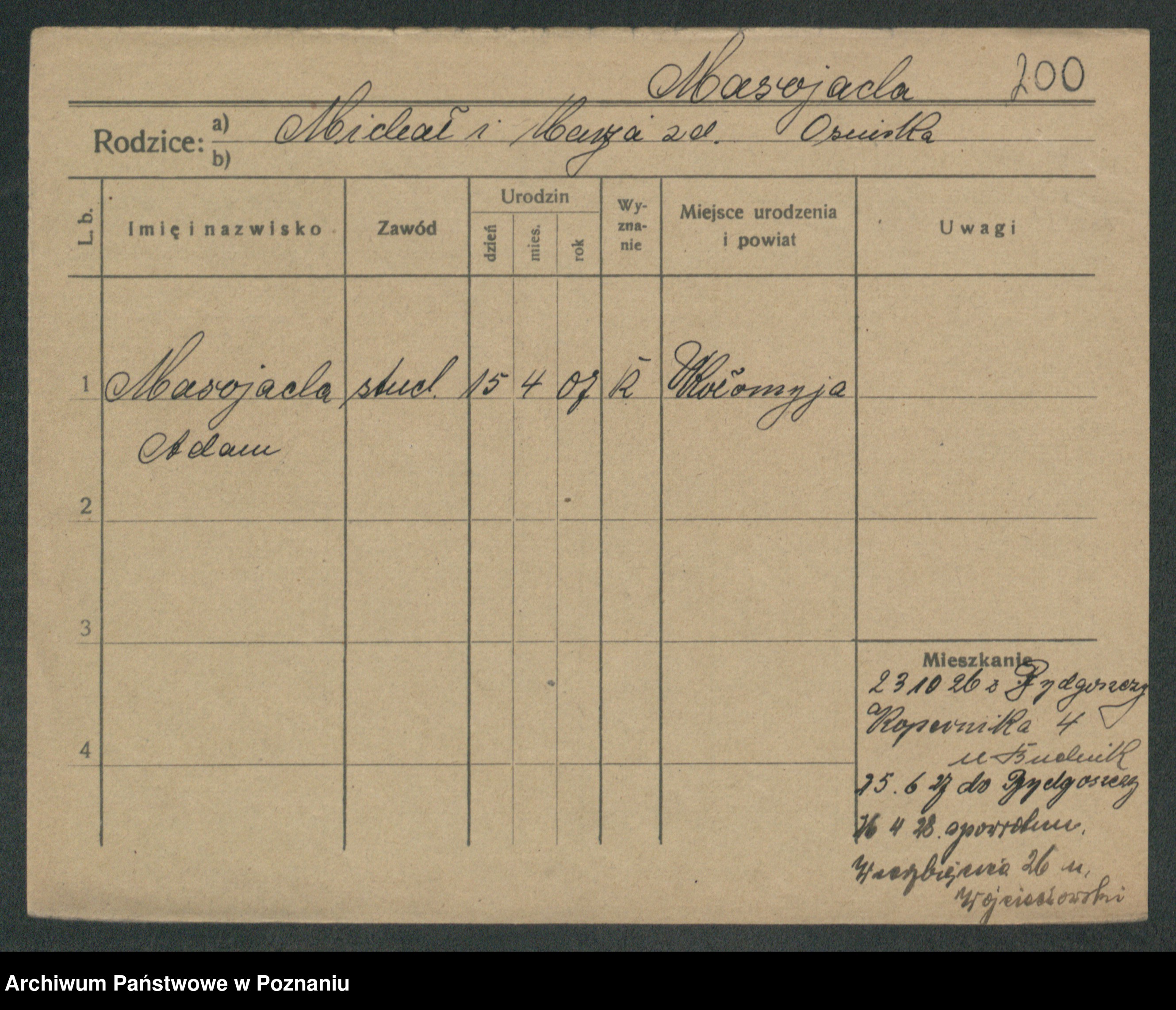 Podgląd karty osobowej dostępny jest po kliknięciu na nazwisko lub ikonkę karty. Można dokonywać powiększenia (ikony na górze) lub przechodzić między kolejnymi skanami (strzałki po bokach).