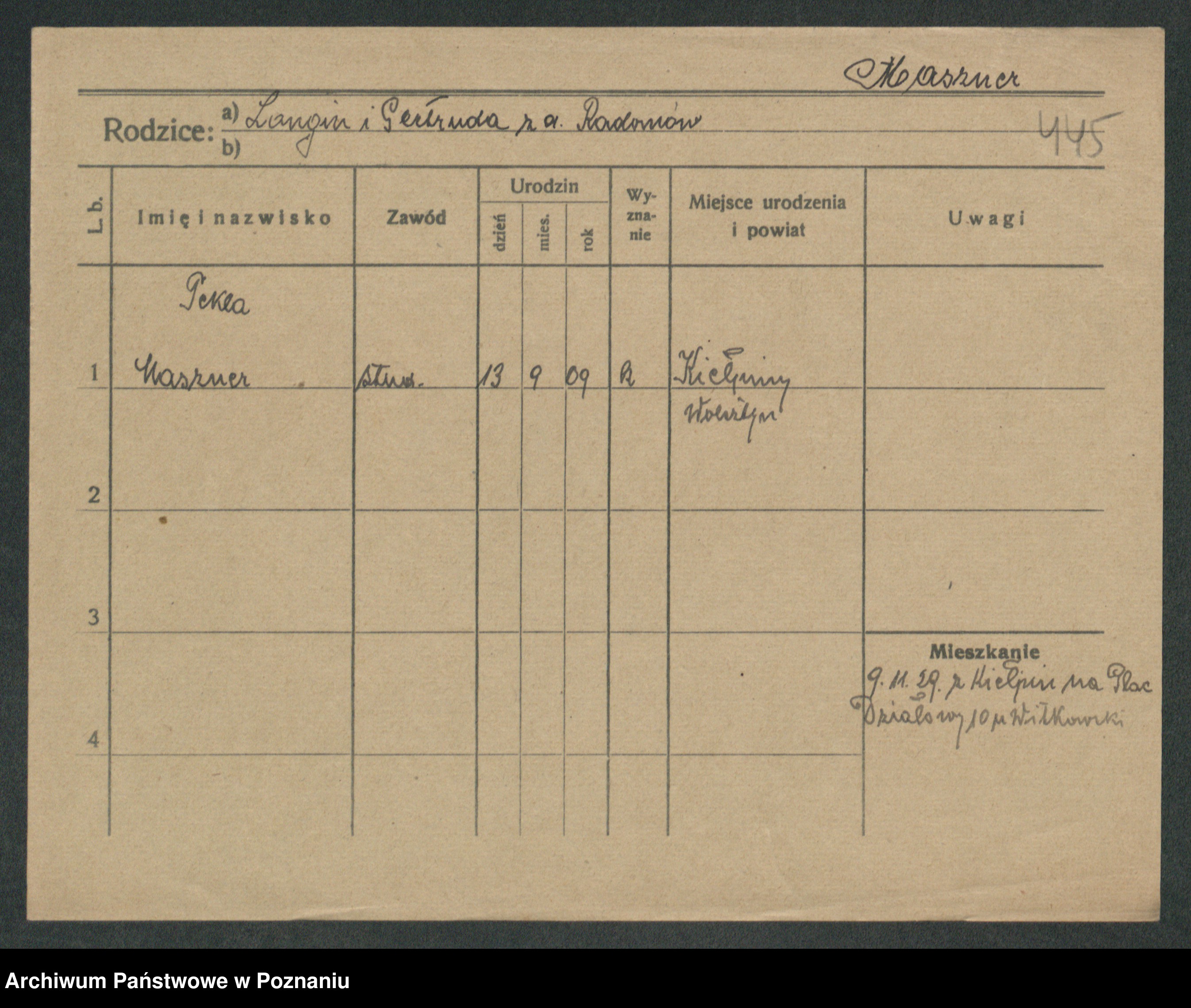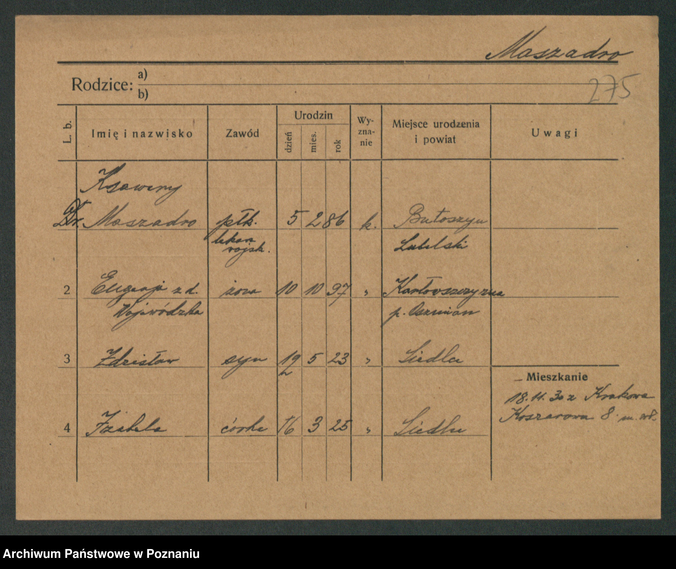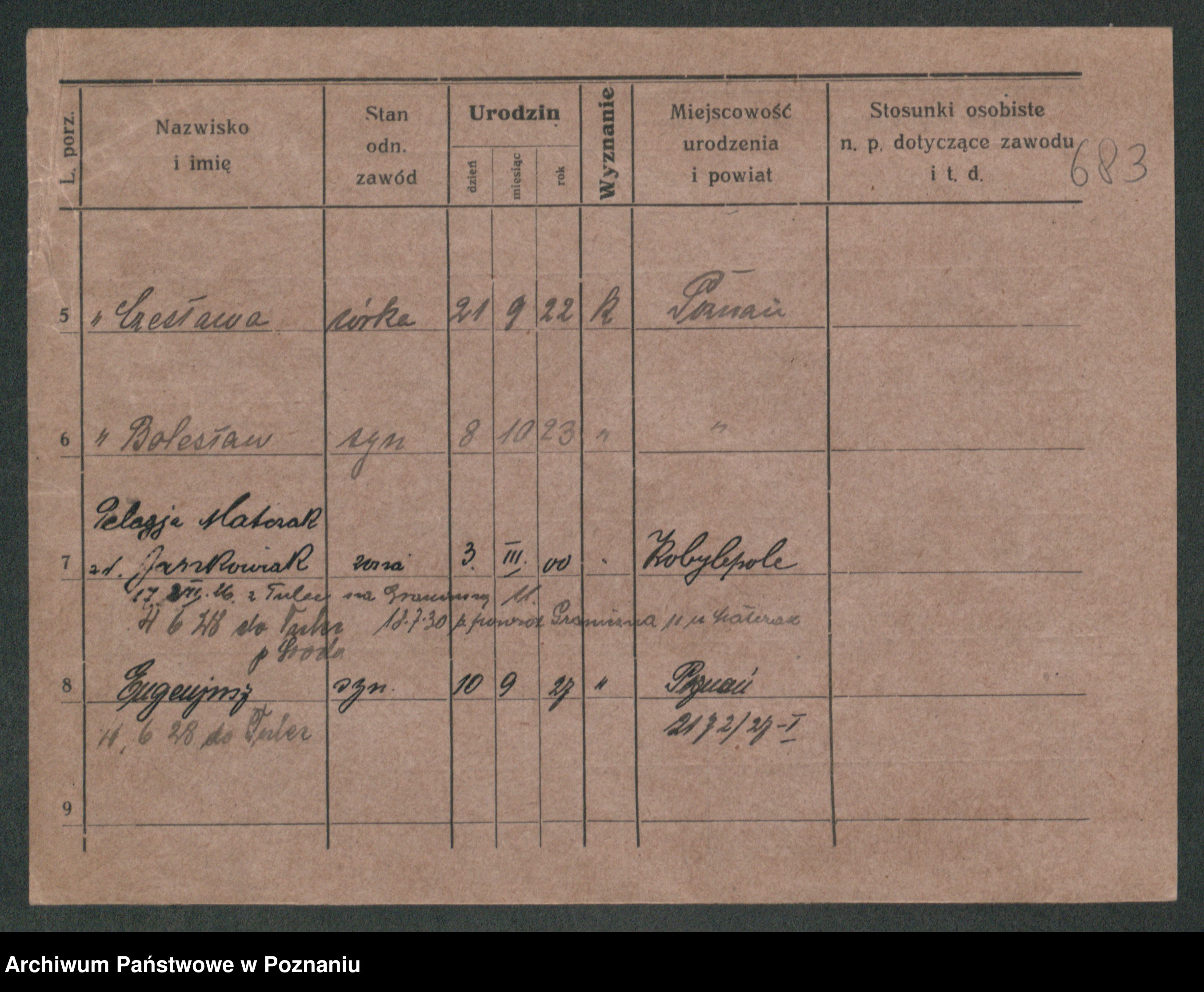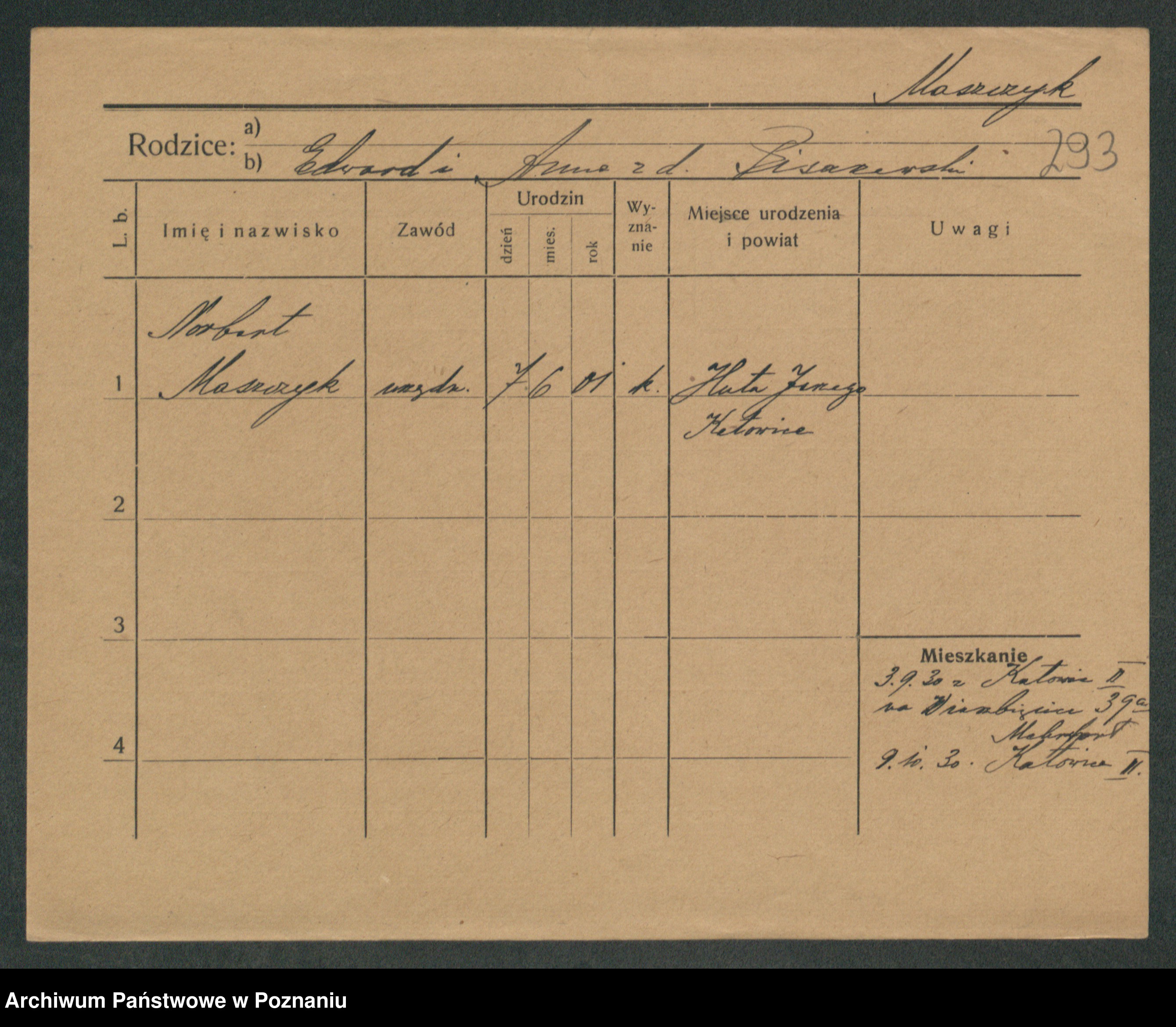 Podgląd karty osobowej dostępny jest po kliknięciu na nazwisko lub ikonkę karty. Można dokonywać powiększenia (ikony na górze) lub przechodzić między kolejnymi skanami (strzałki po bokach).