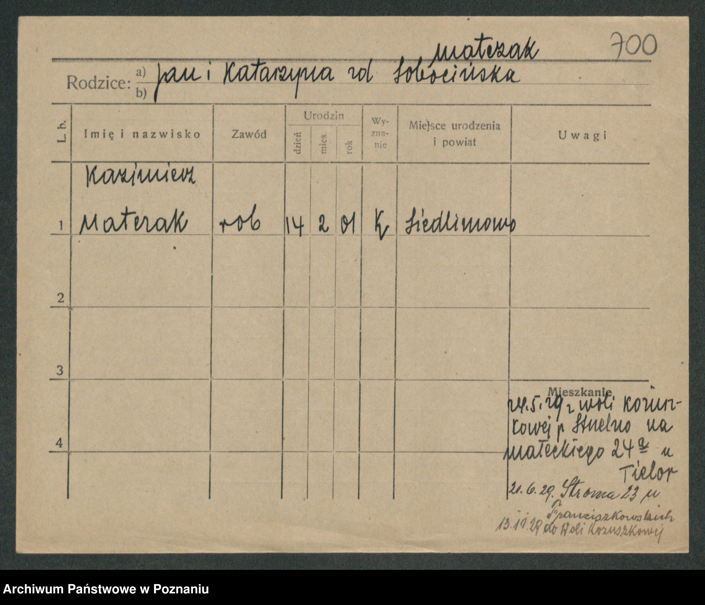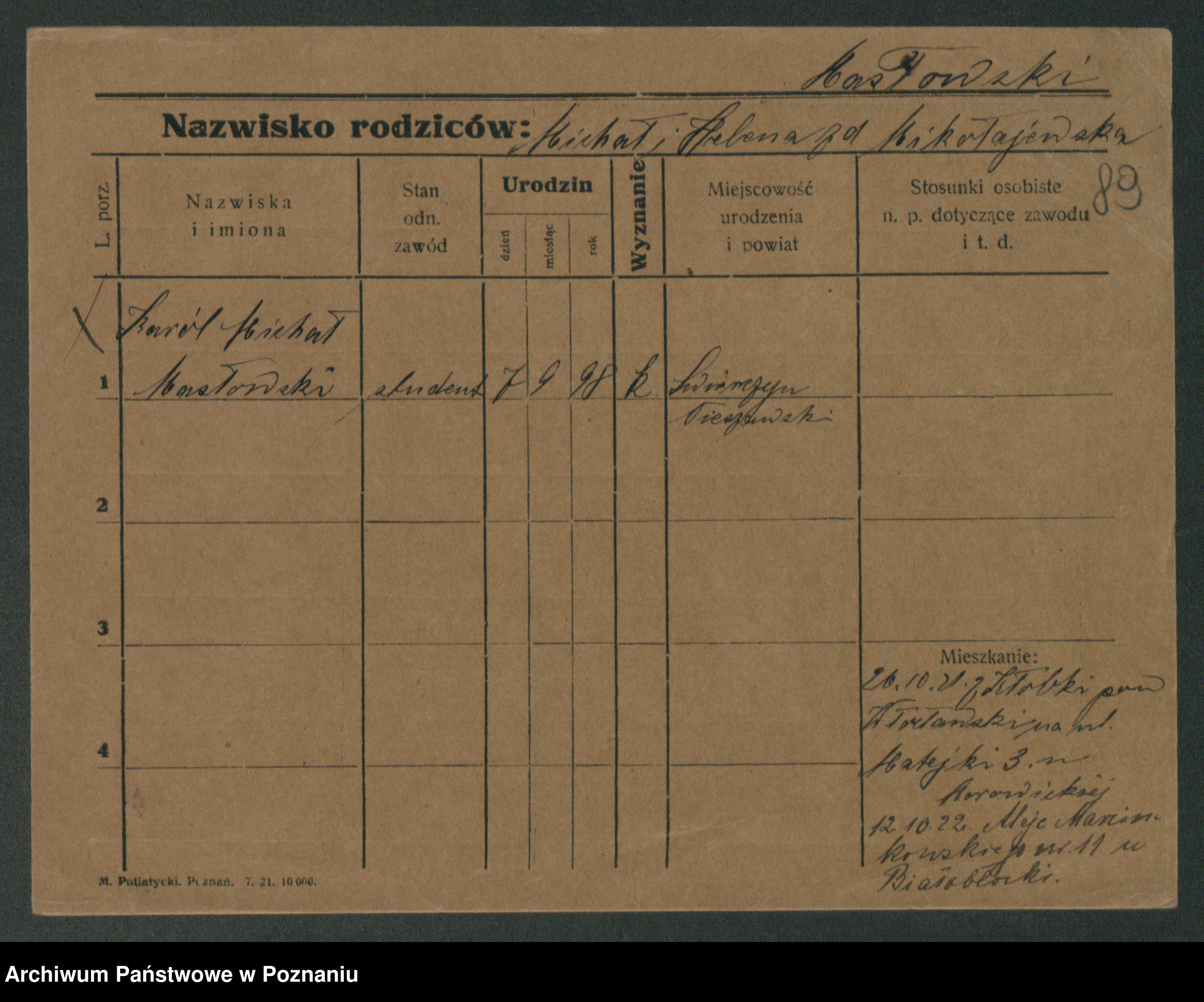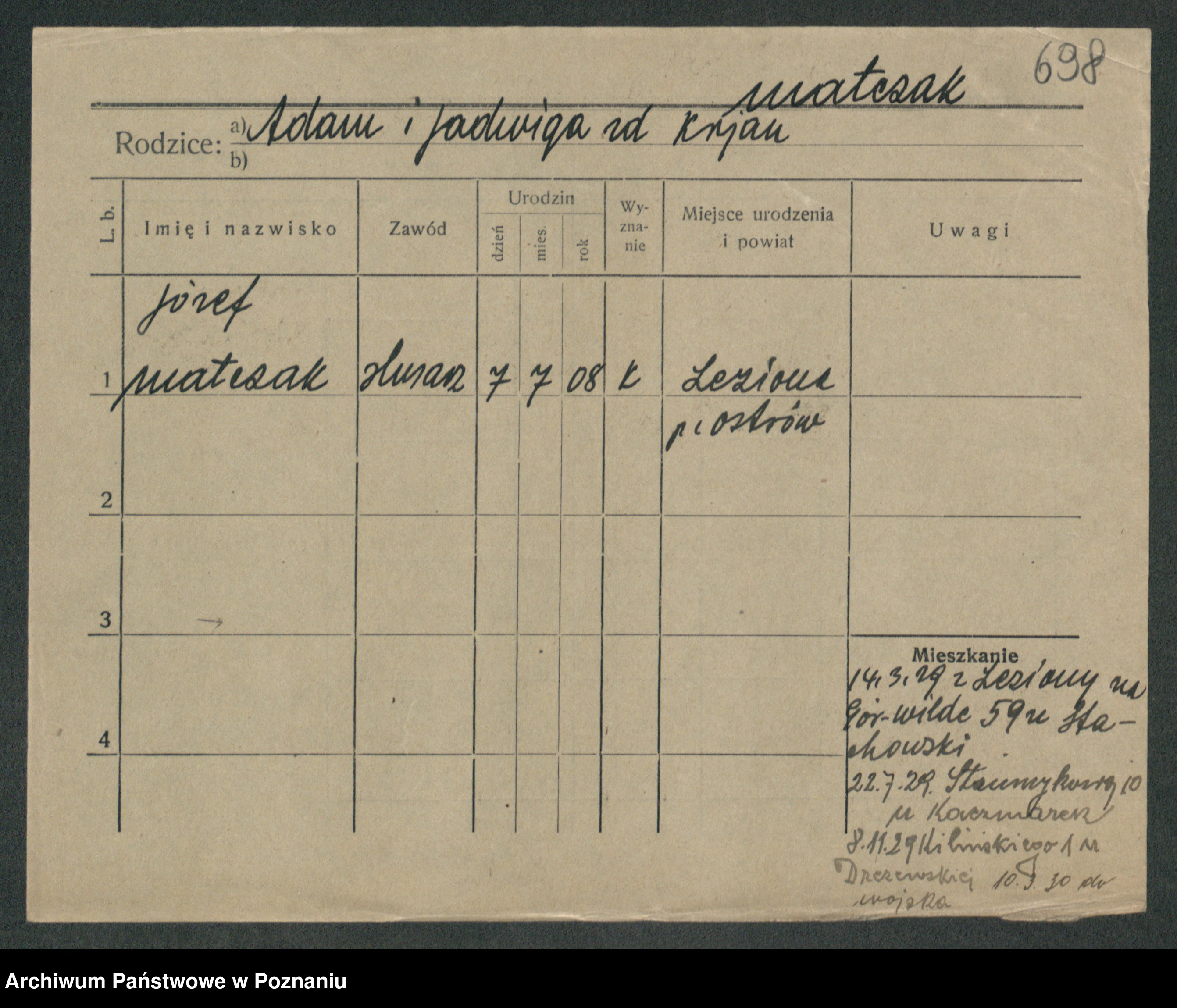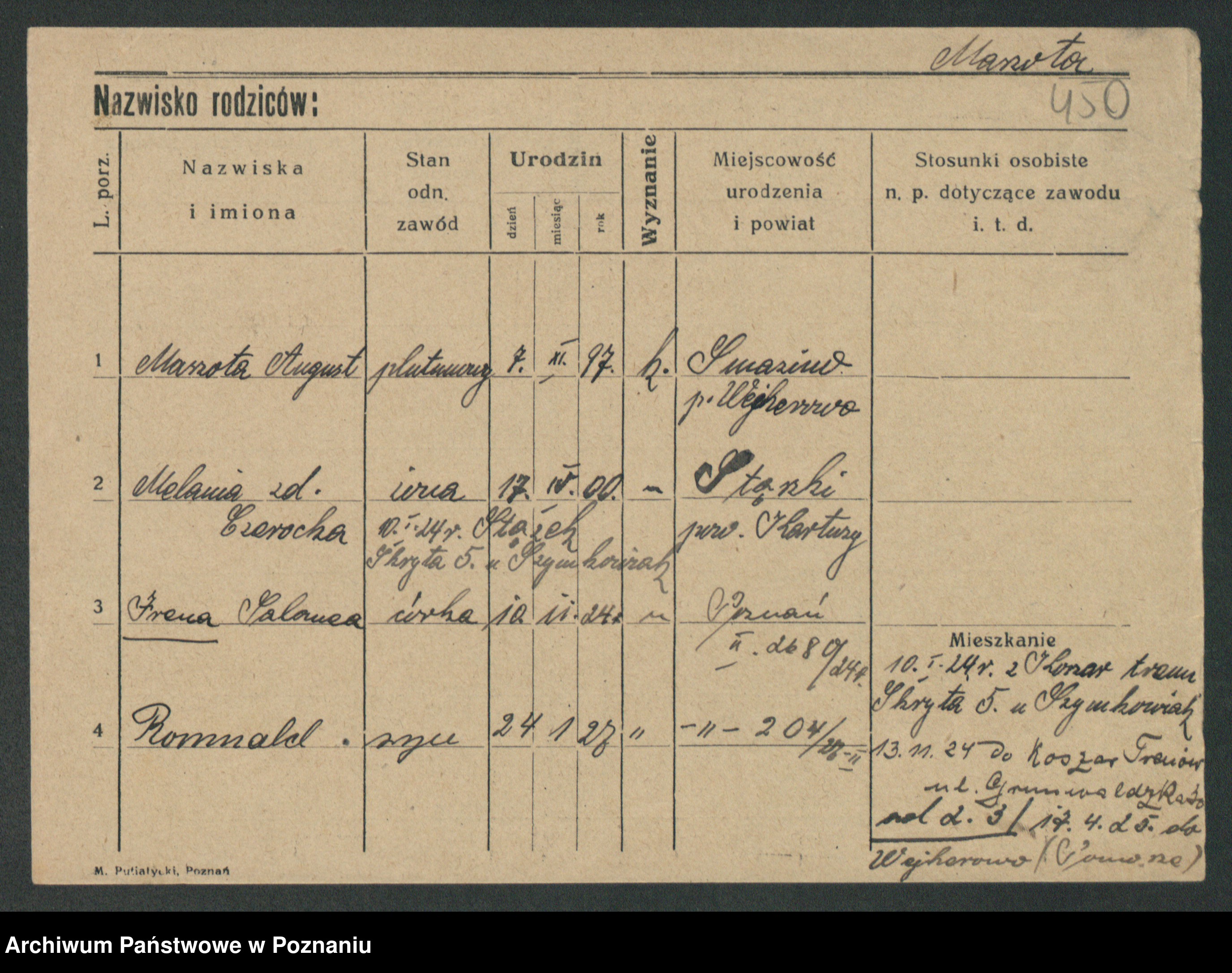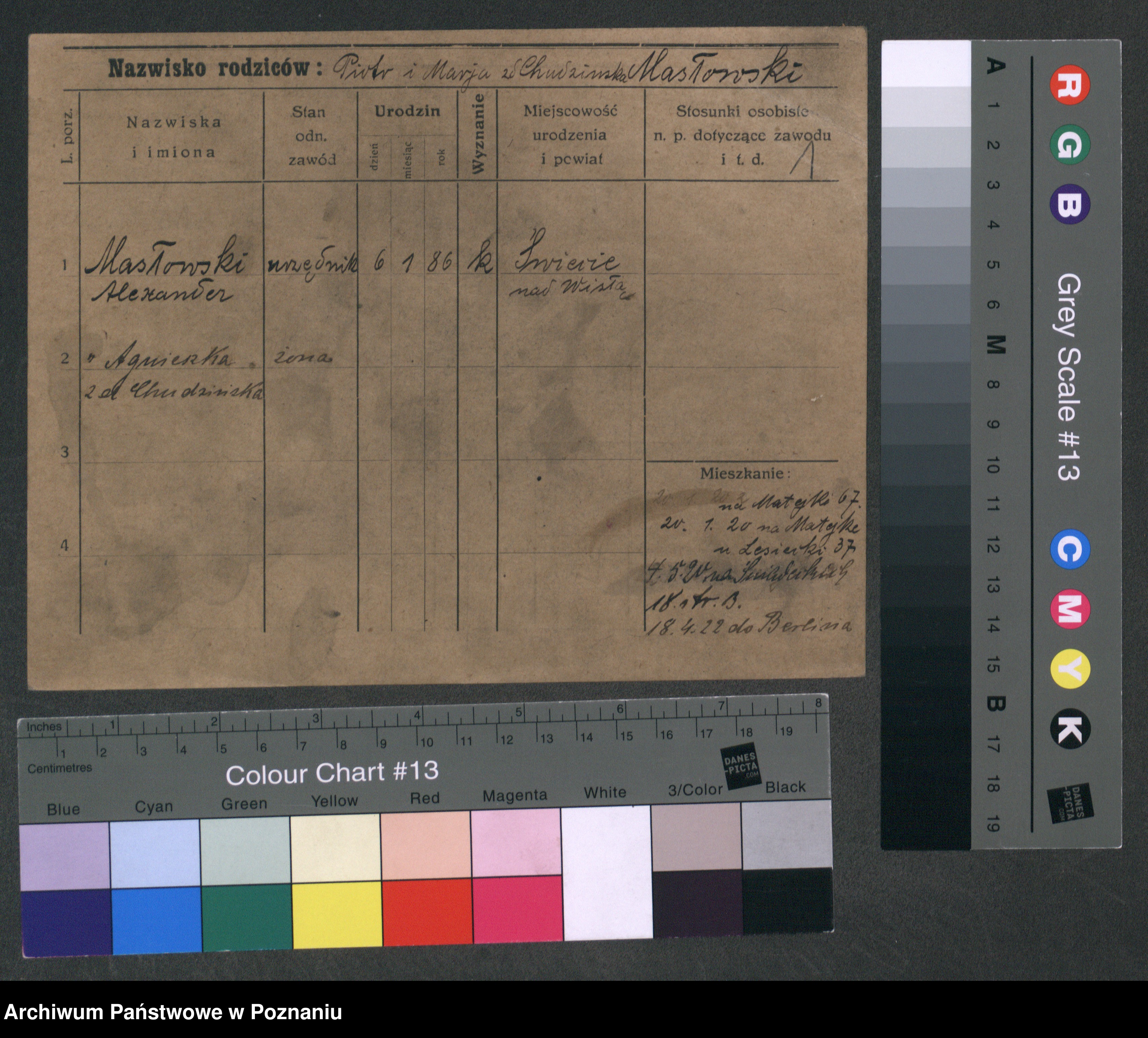 Podgląd karty osobowej dostępny jest po kliknięciu na nazwisko lub ikonkę karty. Można dokonywać powiększenia (ikony na górze) lub przechodzić między kolejnymi skanami (strzałki po bokach).