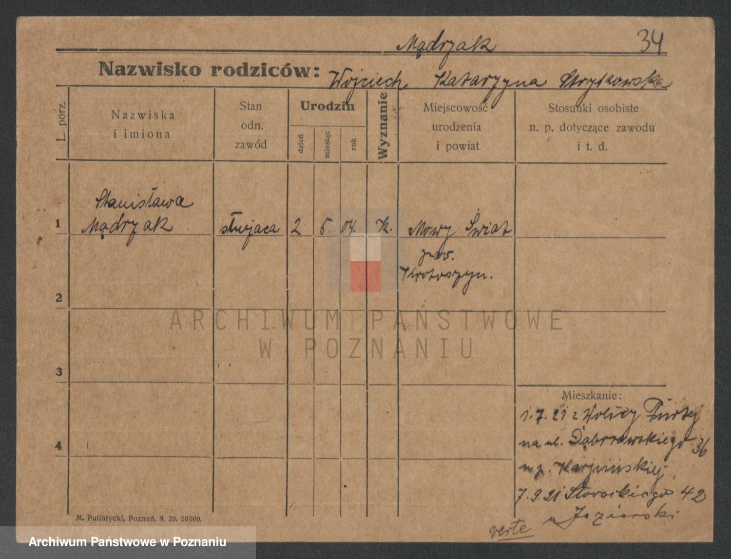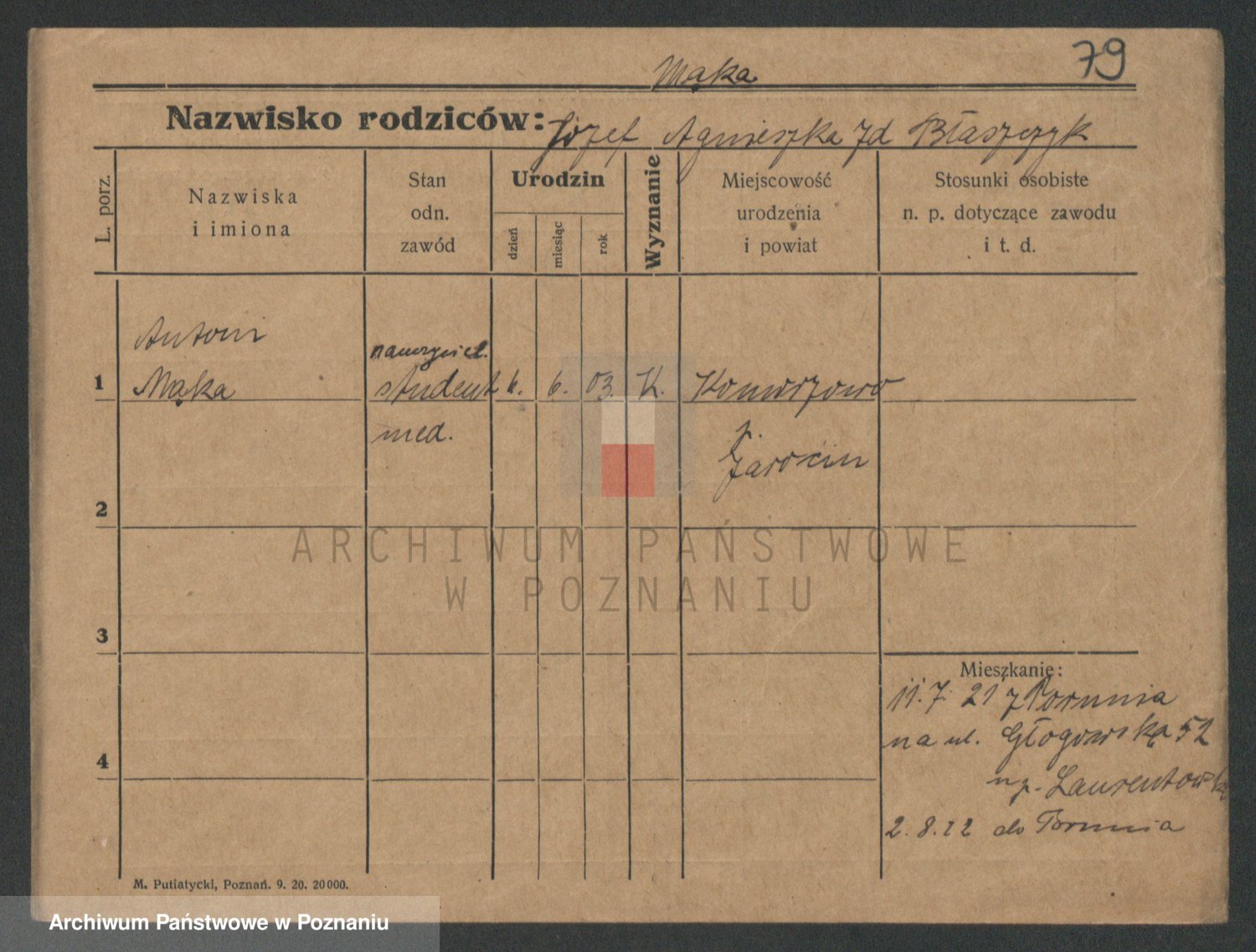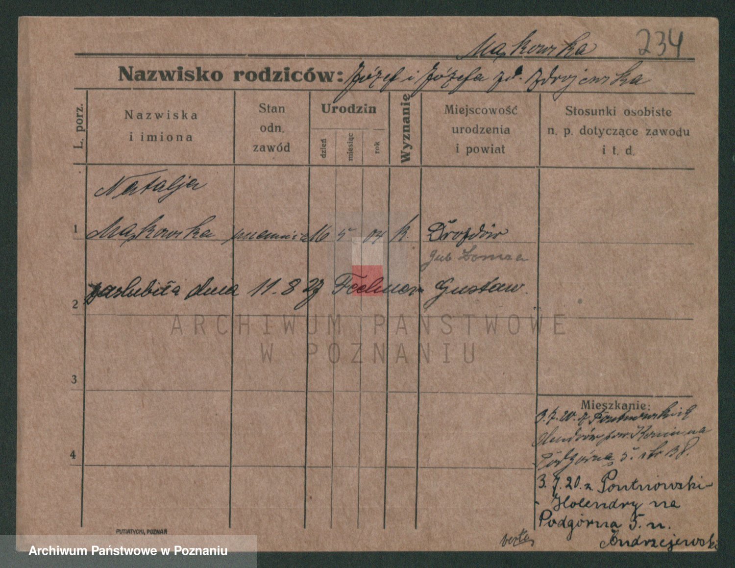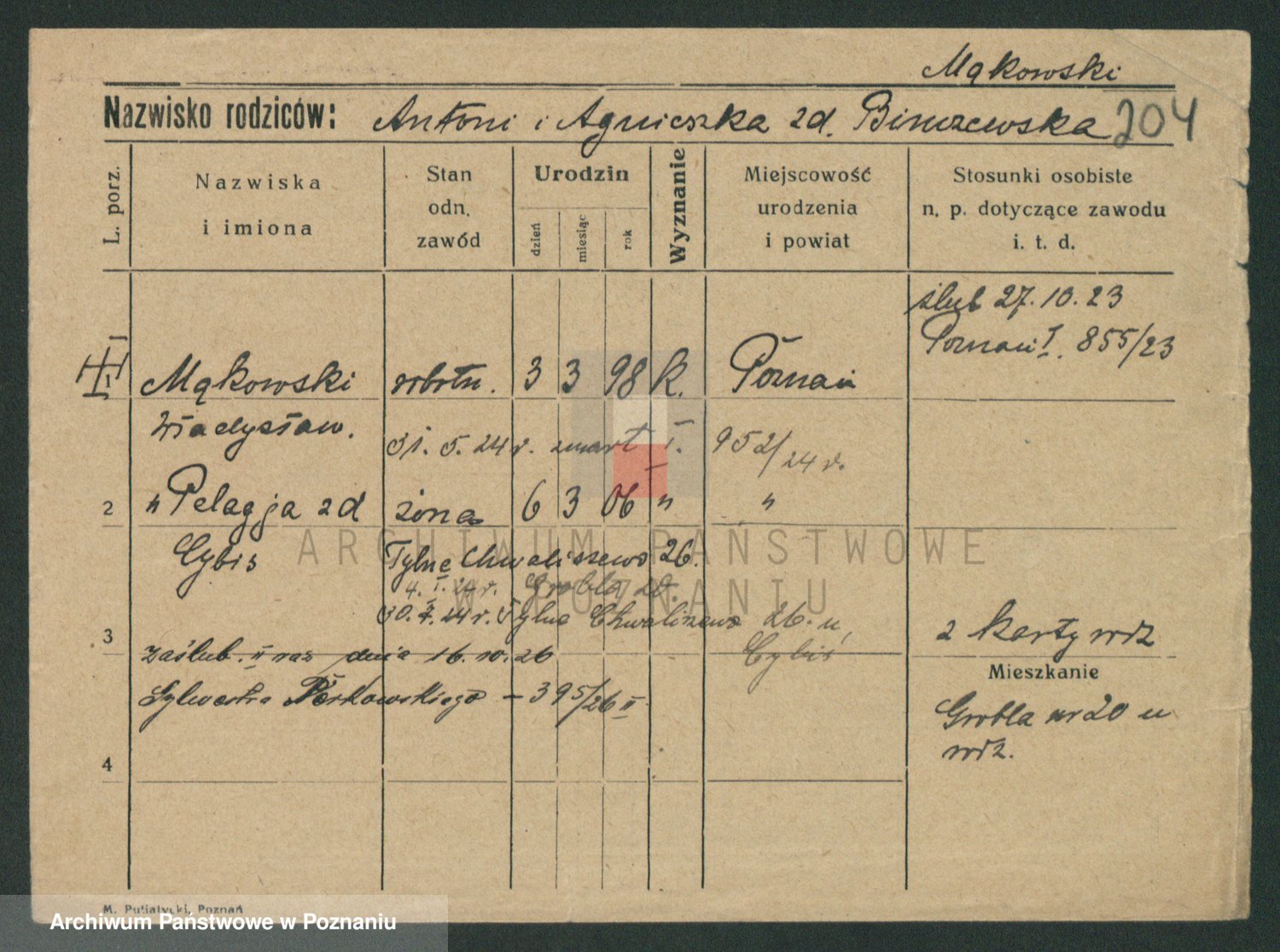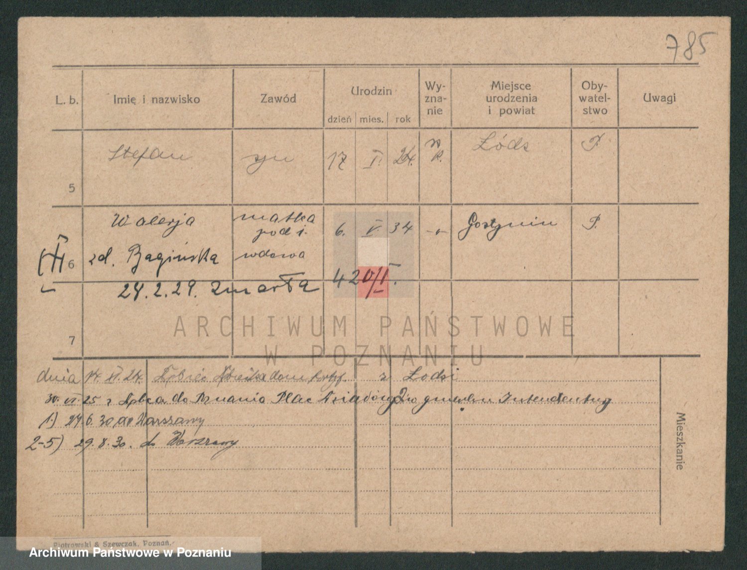 Podgląd karty osobowej dostępny jest po kliknięciu na nazwisko lub ikonkę karty. Można dokonywać powiększenia (ikony na górze) lub przechodzić między kolejnymi skanami (strzałki po bokach).