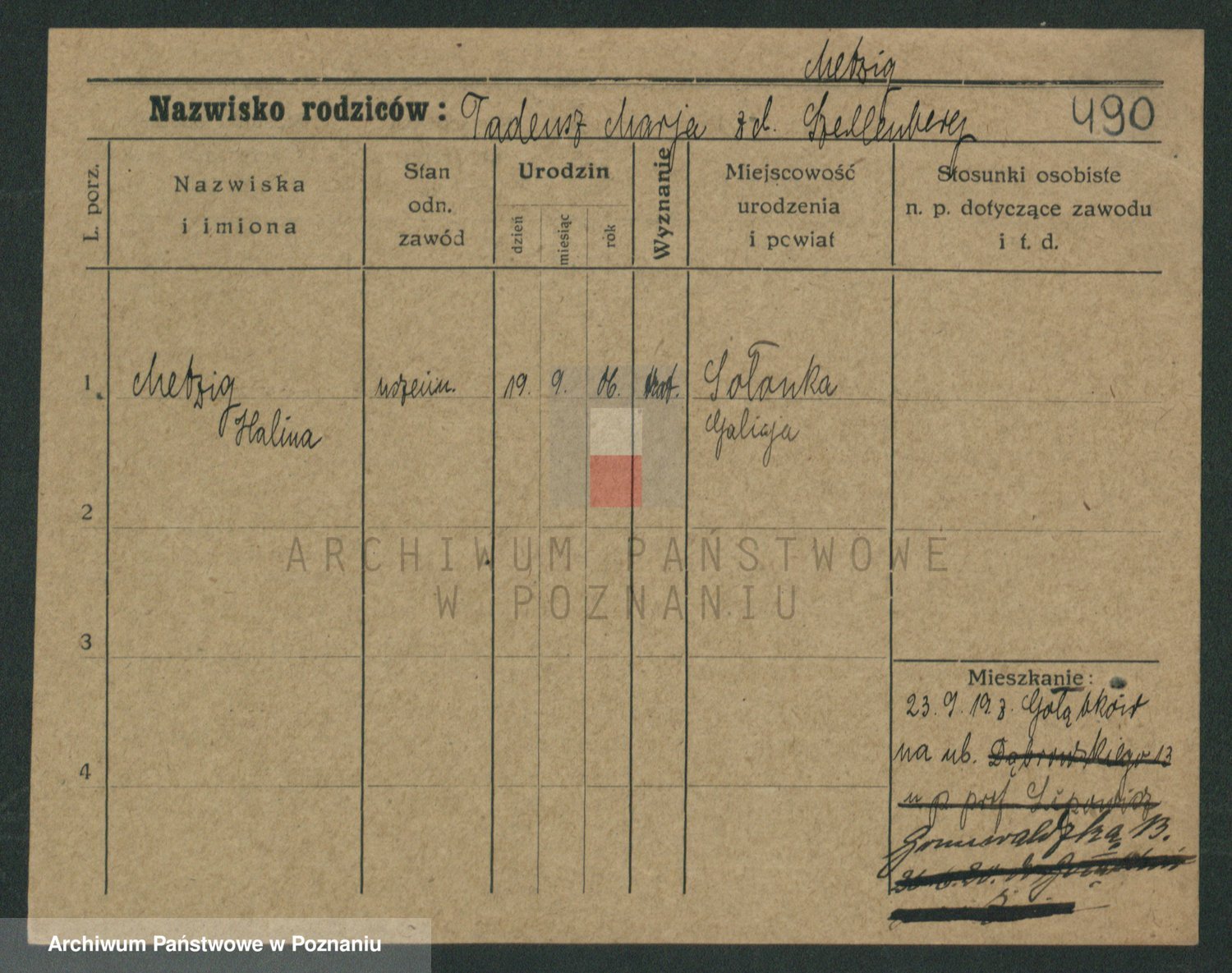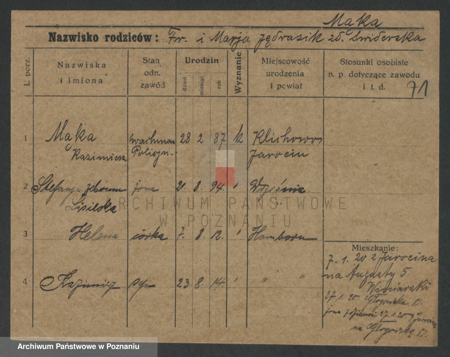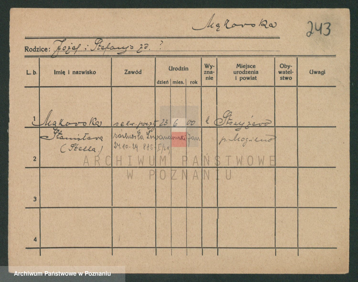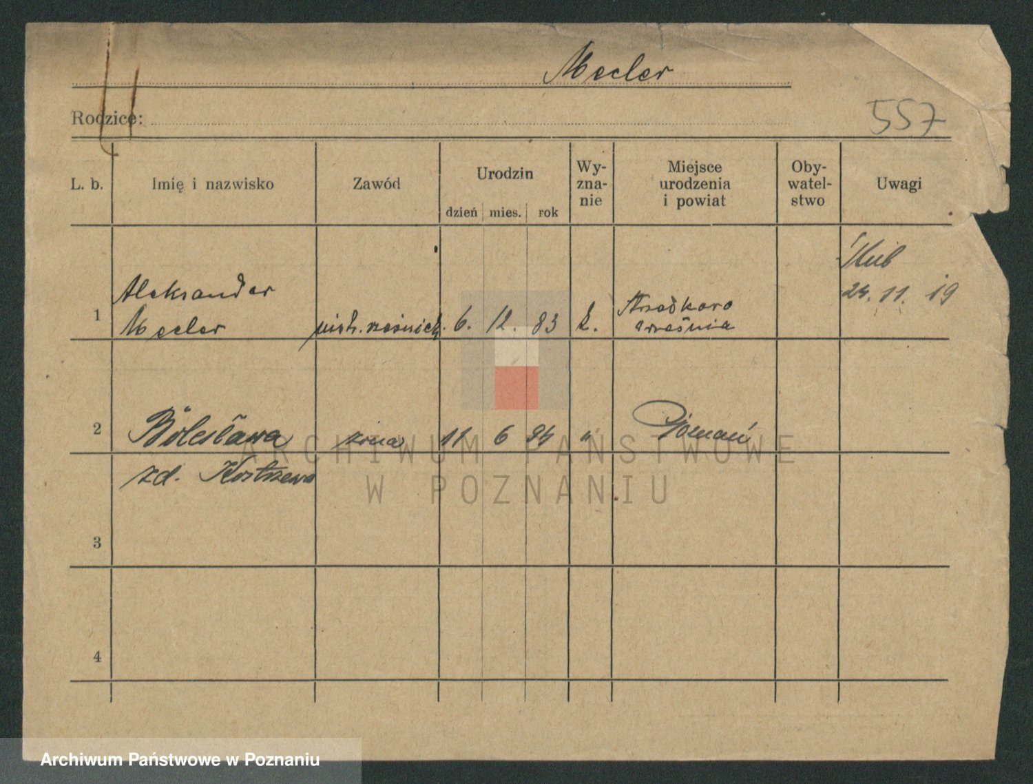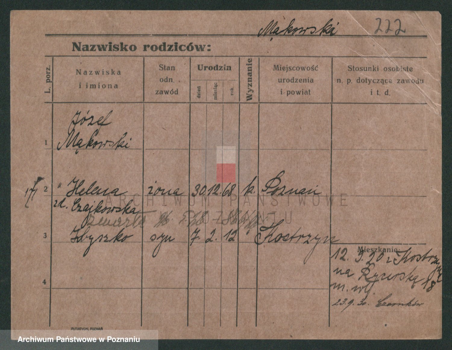 Podgląd karty osobowej dostępny jest po kliknięciu na nazwisko lub ikonkę karty. Można dokonywać powiększenia (ikony na górze) lub przechodzić między kolejnymi skanami (strzałki po bokach).