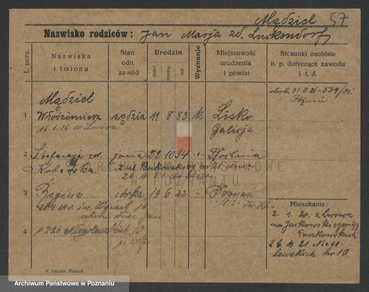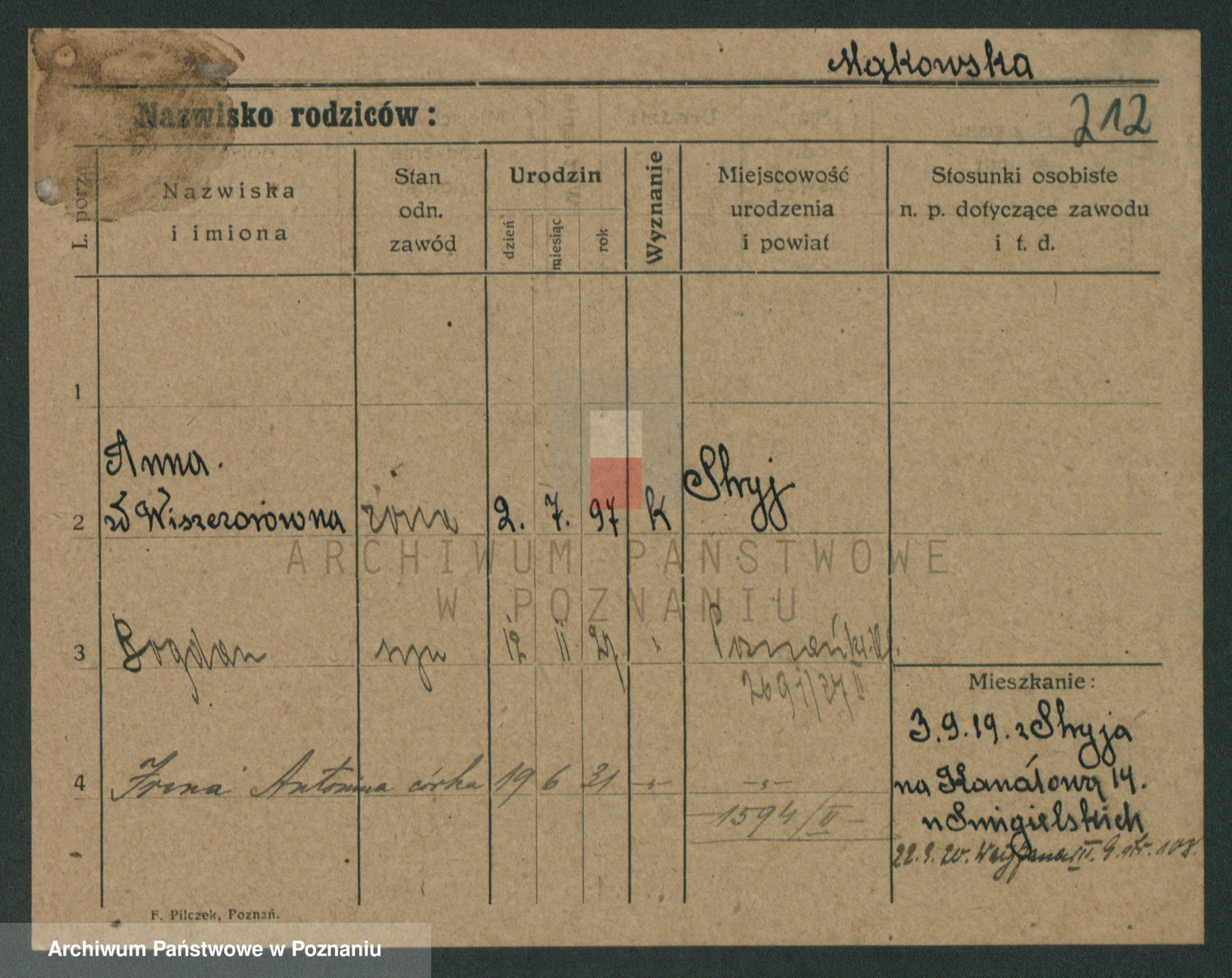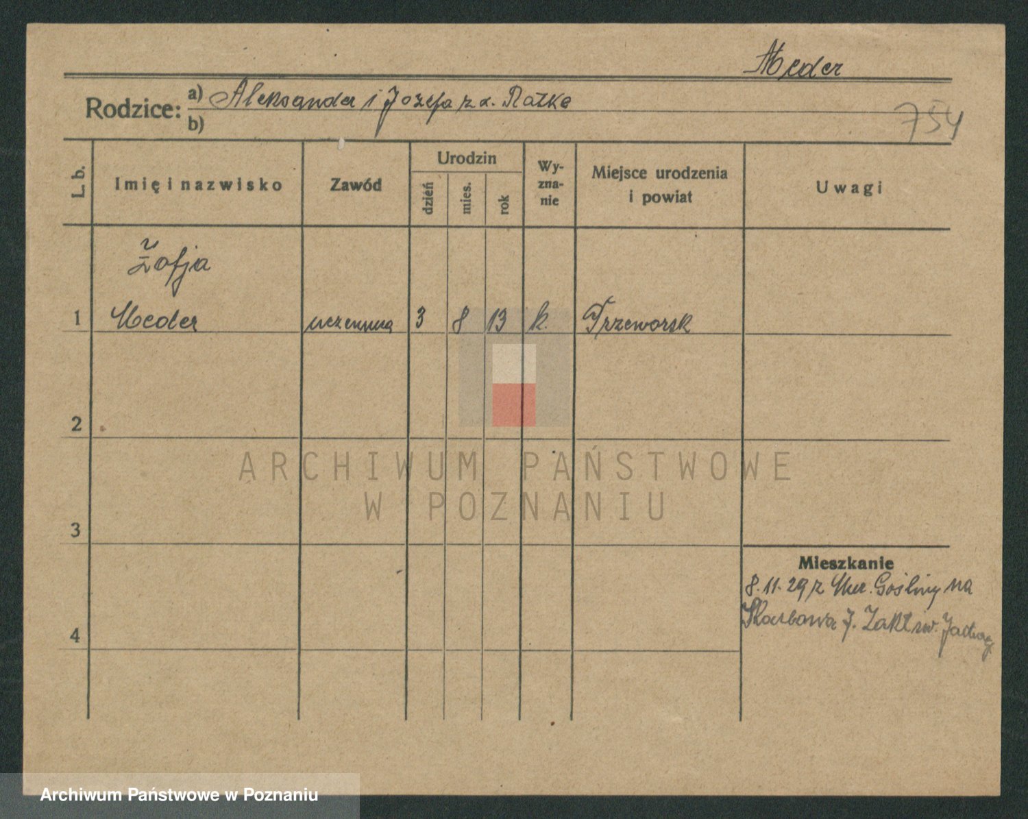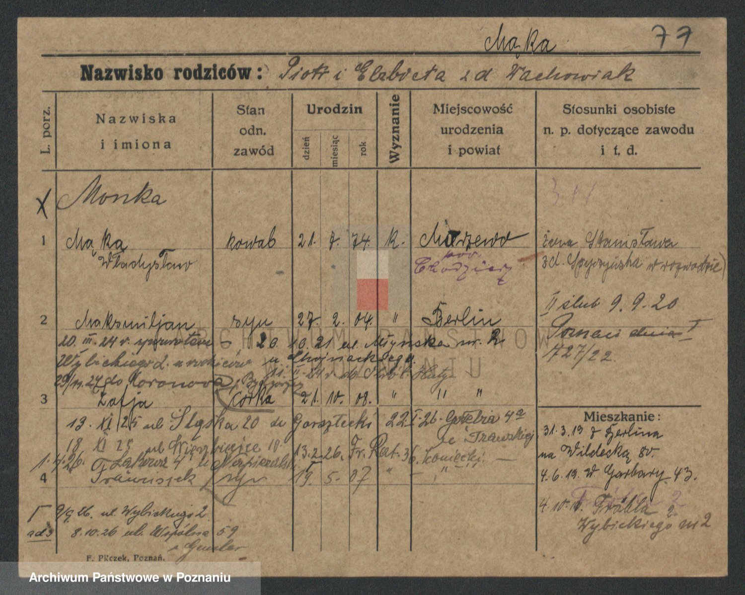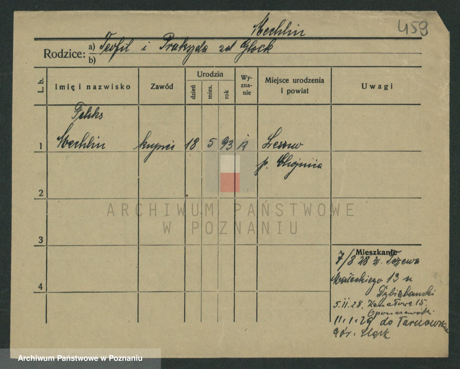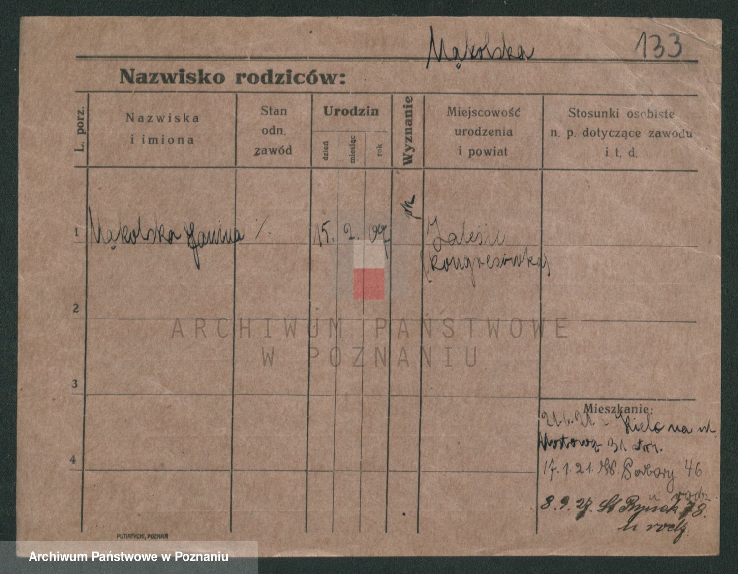 Podgląd karty osobowej dostępny jest po kliknięciu na nazwisko lub ikonkę karty. Można dokonywać powiększenia (ikony na górze) lub przechodzić między kolejnymi skanami (strzałki po bokach).