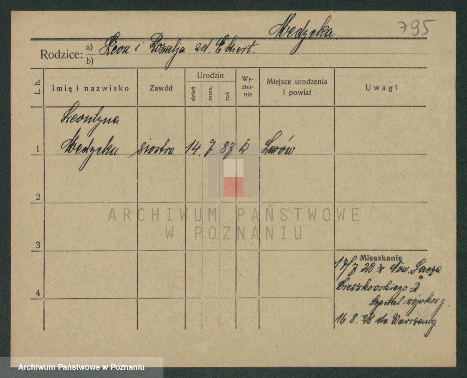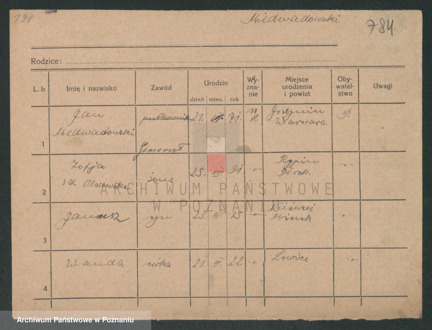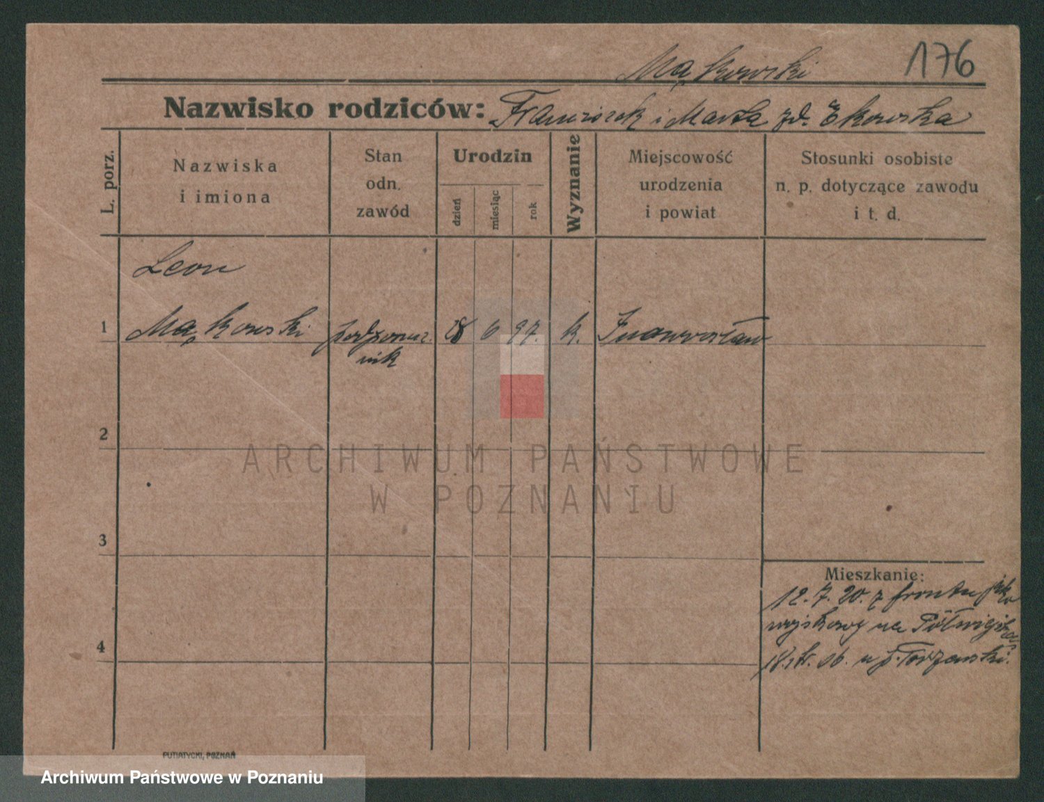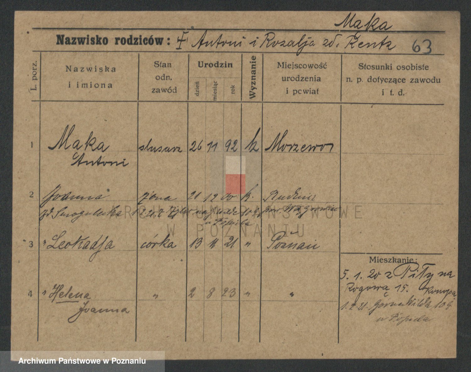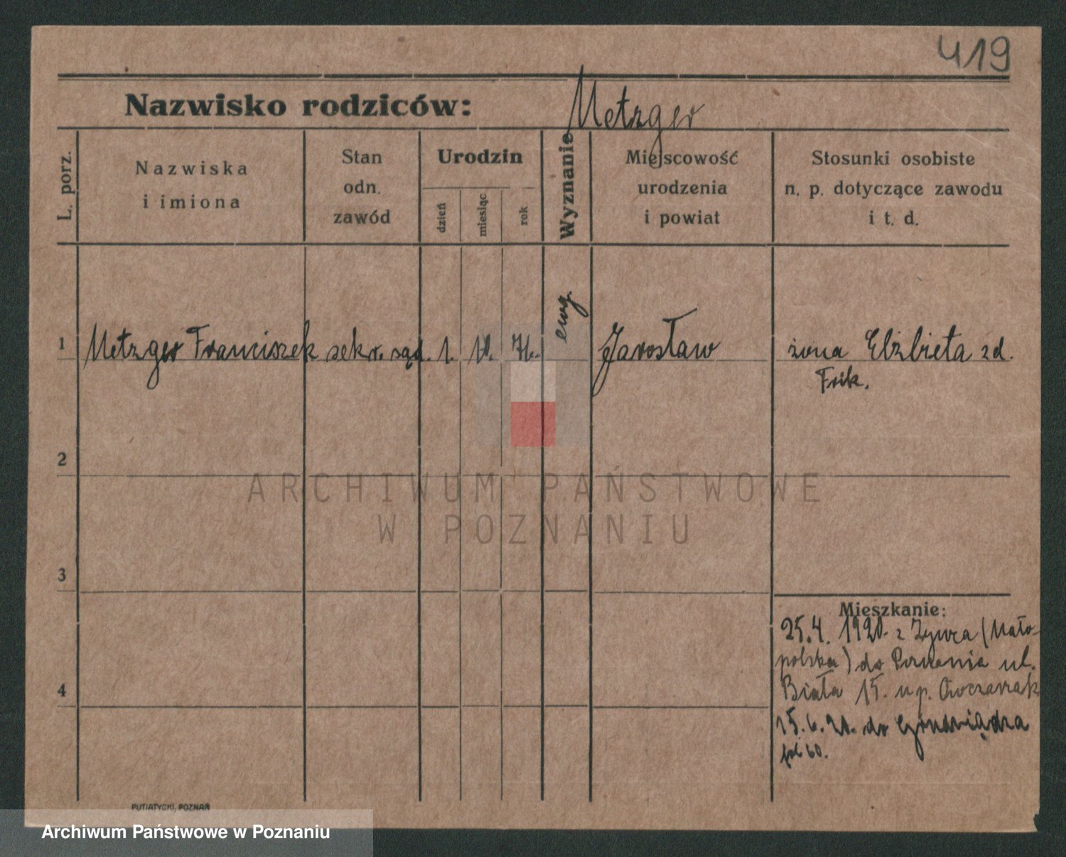 Podgląd karty osobowej dostępny jest po kliknięciu na nazwisko lub ikonkę karty. Można dokonywać powiększenia (ikony na górze) lub przechodzić między kolejnymi skanami (strzałki po bokach).