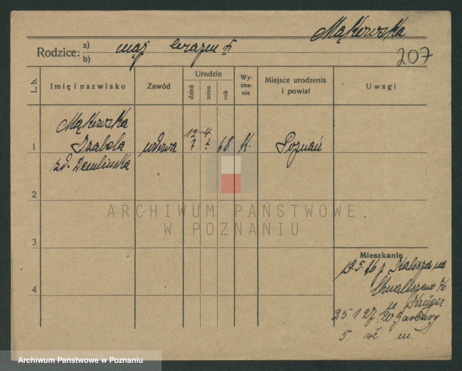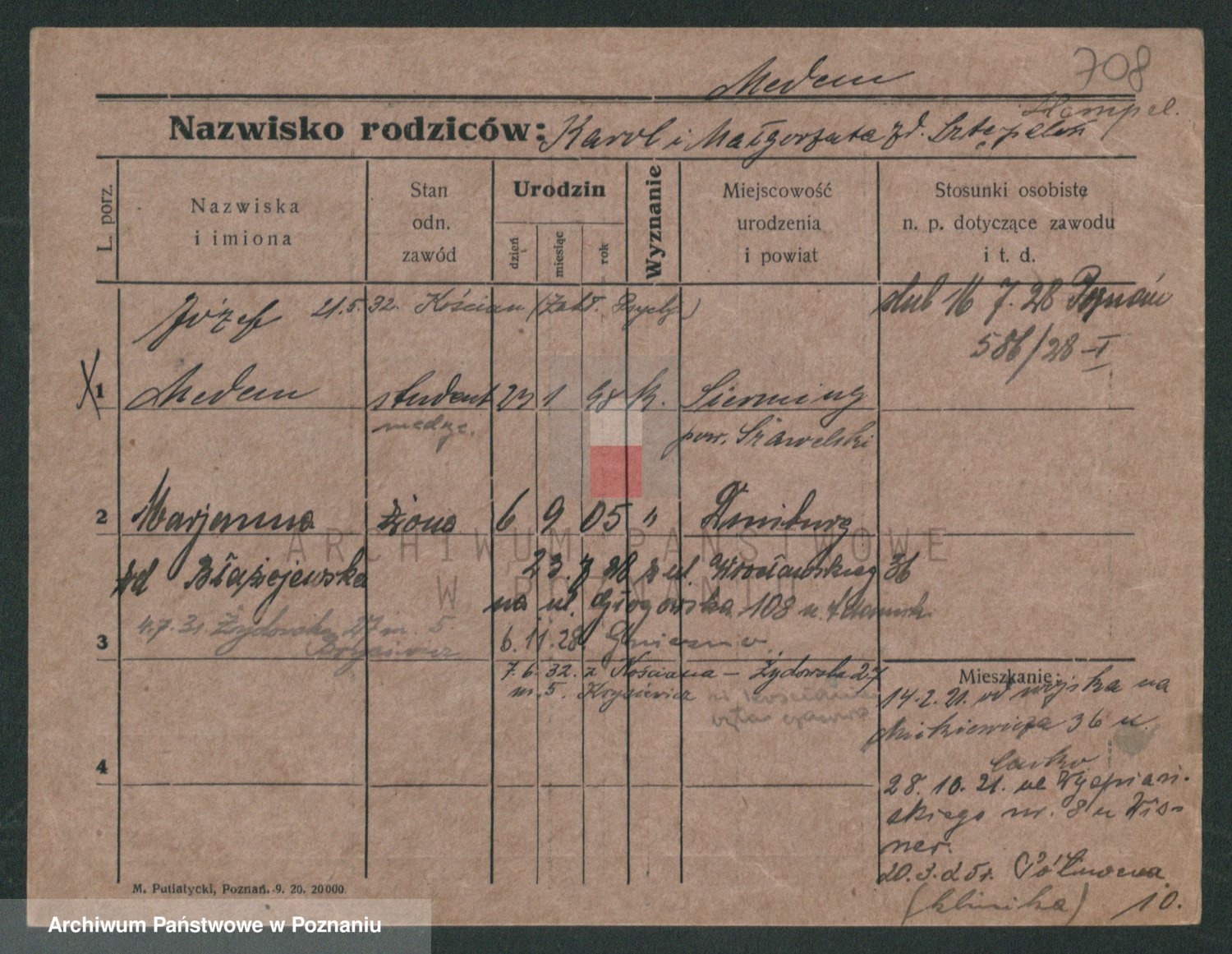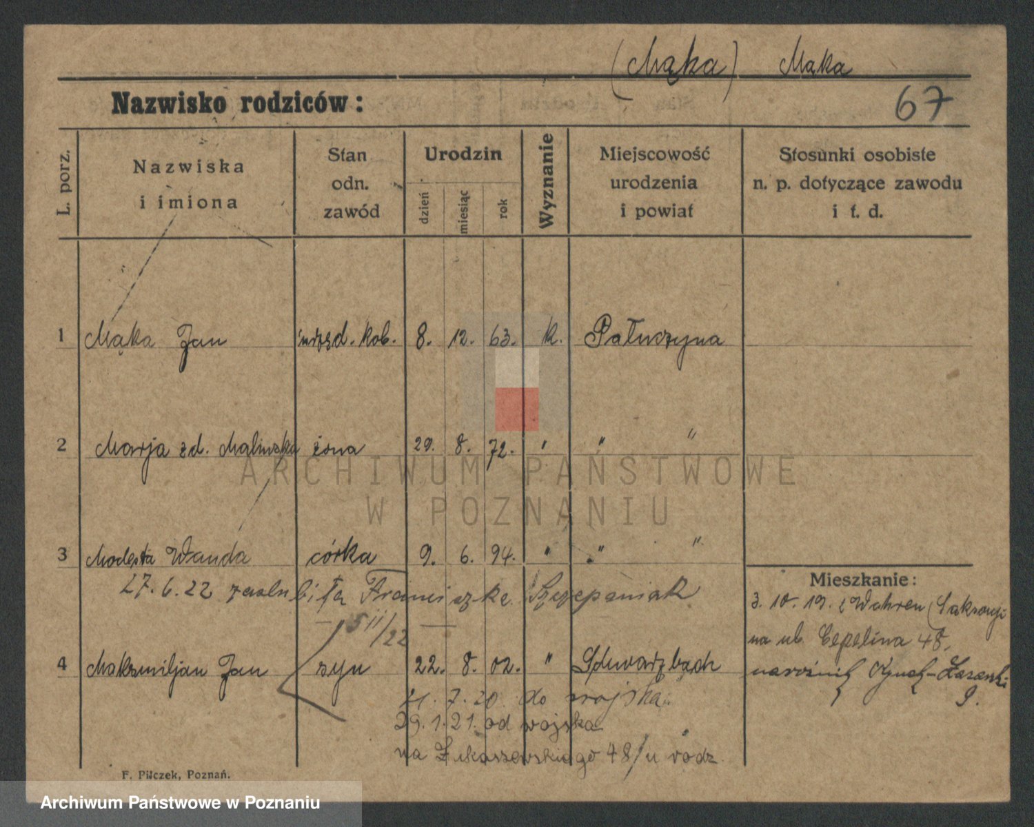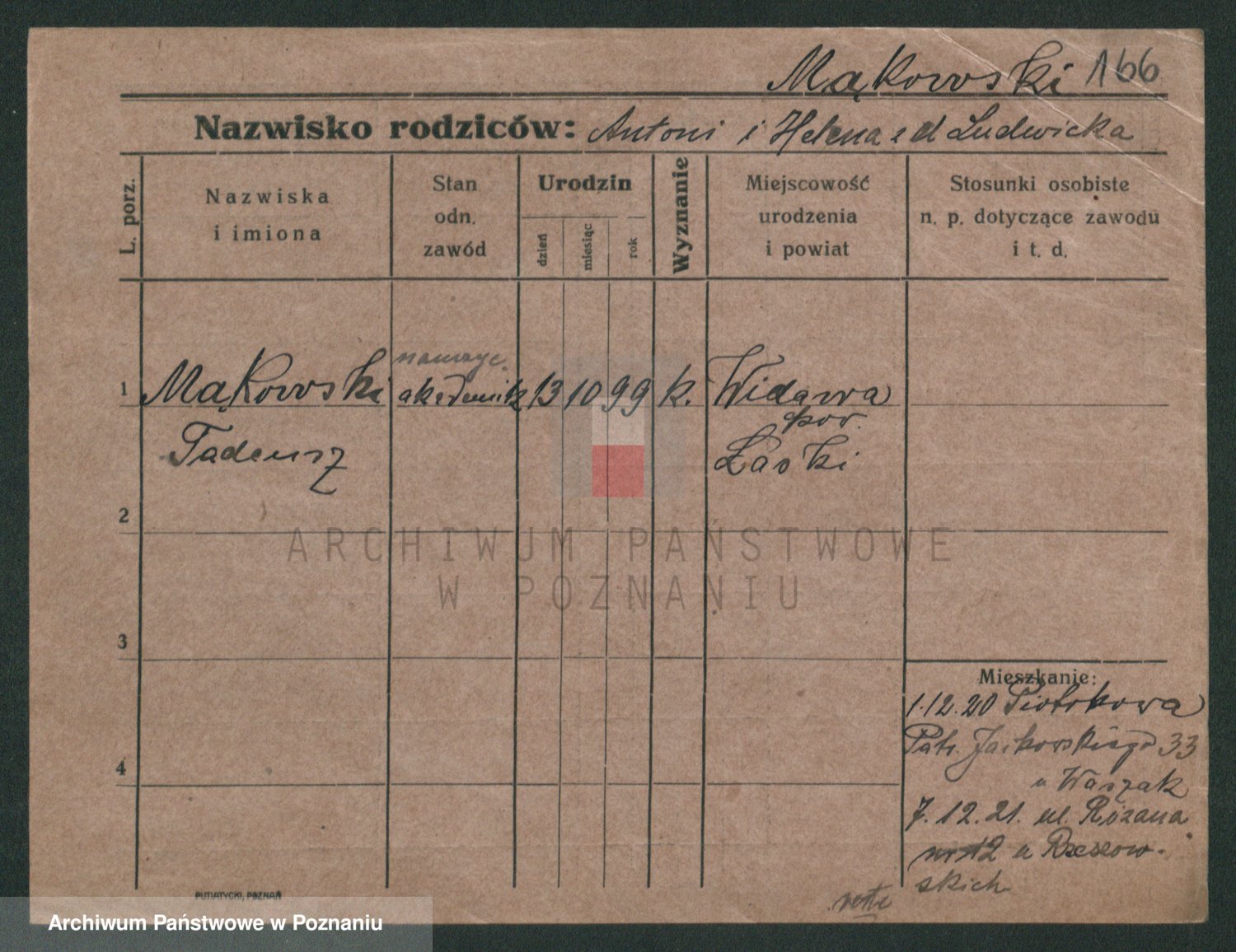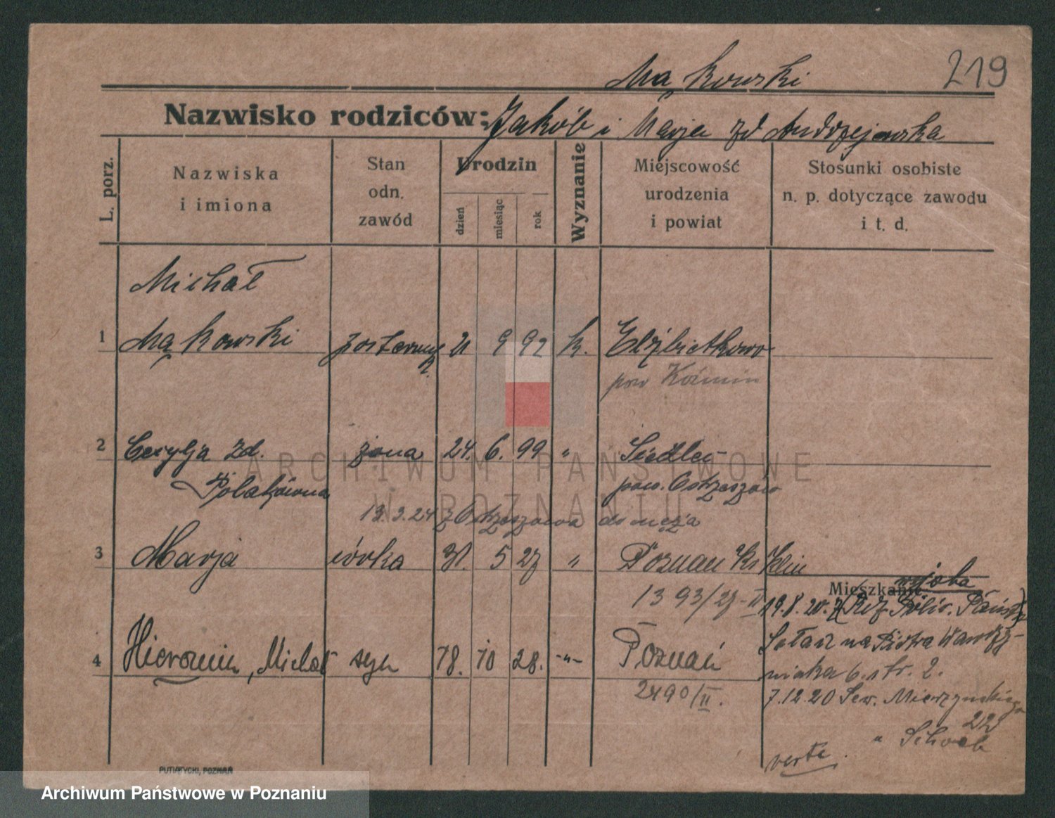 Podgląd karty osobowej dostępny jest po kliknięciu na nazwisko lub ikonkę karty. Można dokonywać powiększenia (ikony na górze) lub przechodzić między kolejnymi skanami (strzałki po bokach).
