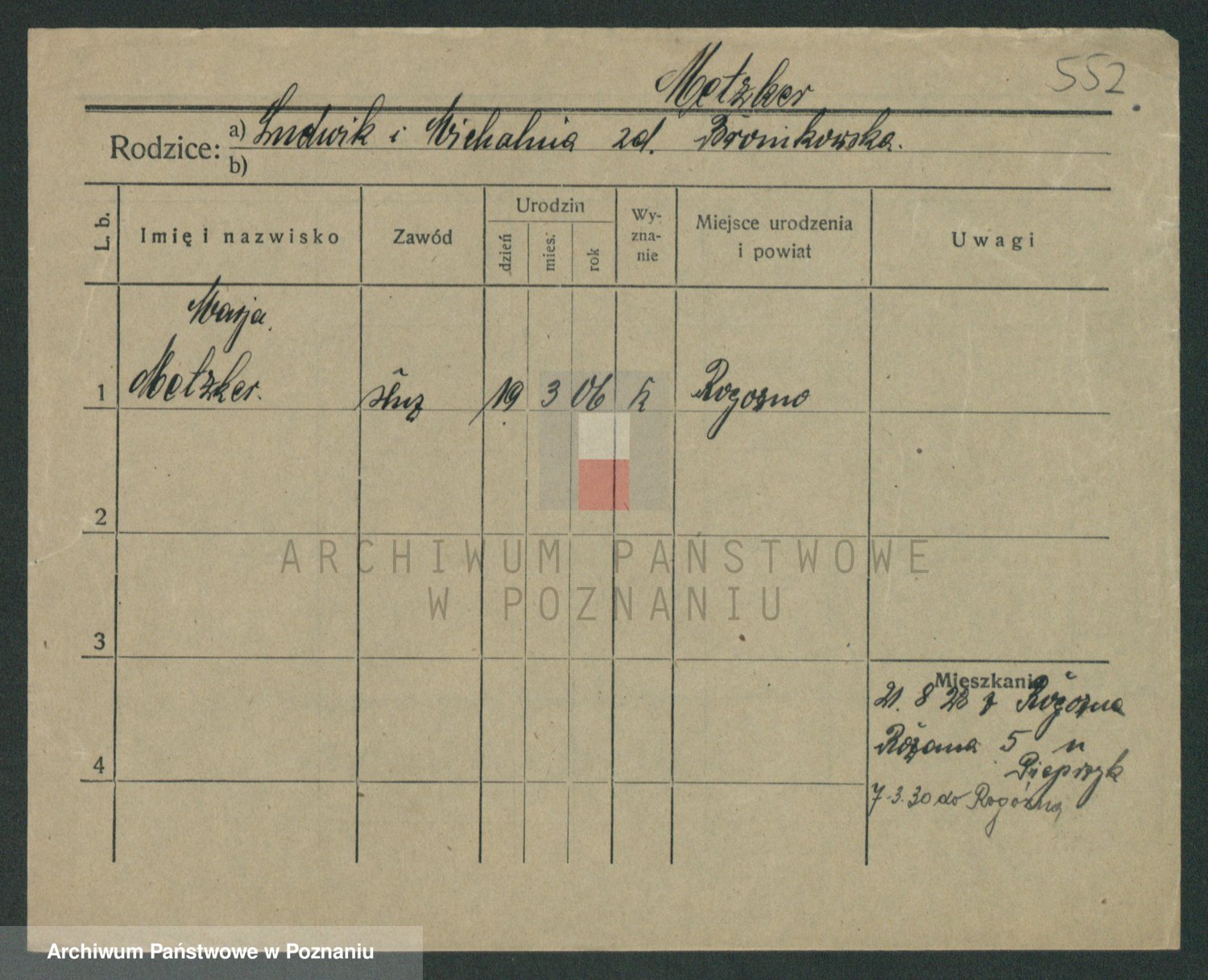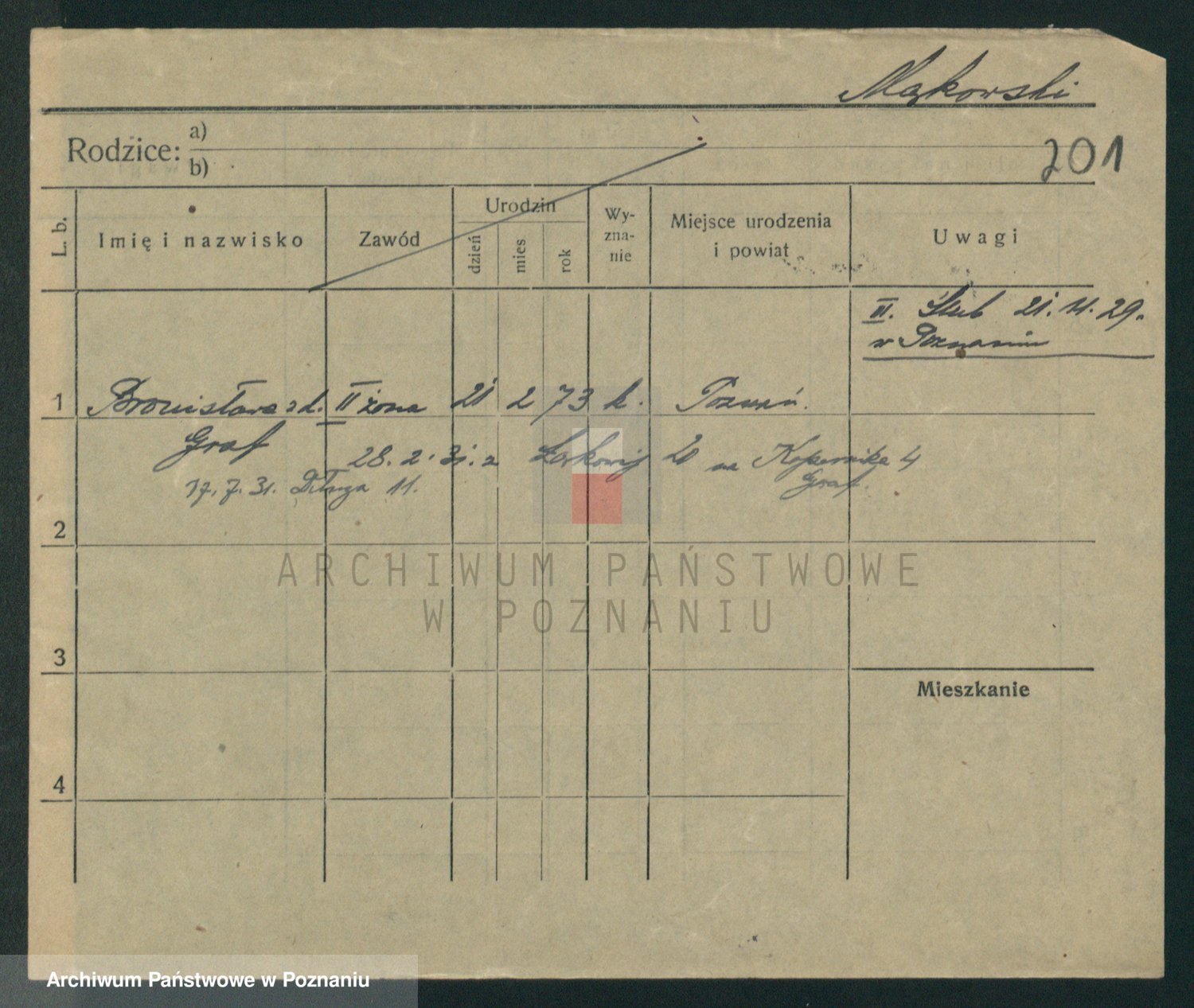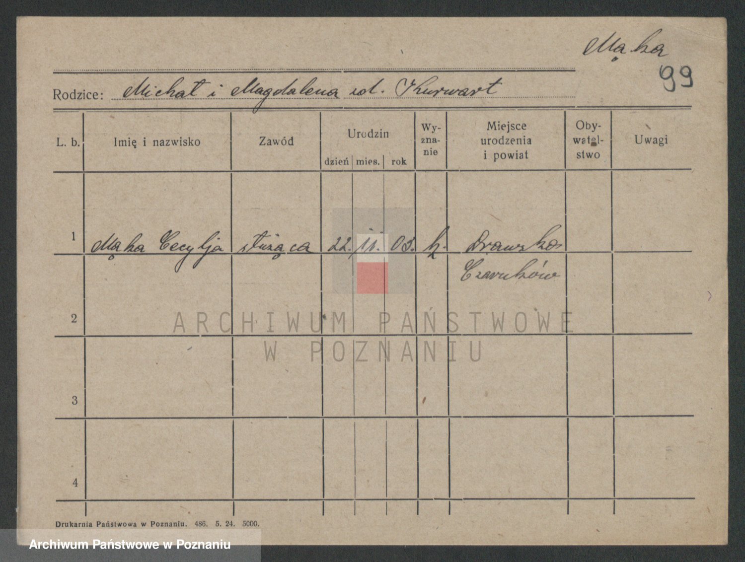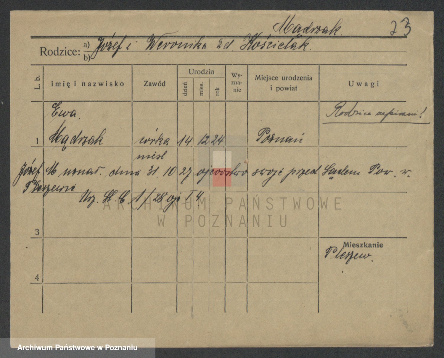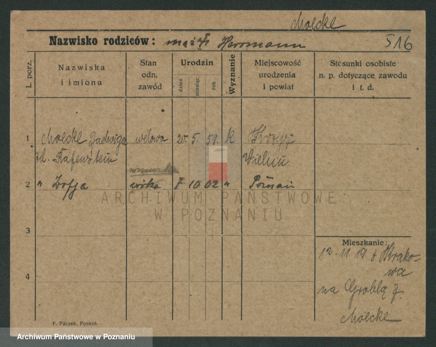 Podgląd karty osobowej dostępny jest po kliknięciu na nazwisko lub ikonkę karty. Można dokonywać powiększenia (ikony na górze) lub przechodzić między kolejnymi skanami (strzałki po bokach).