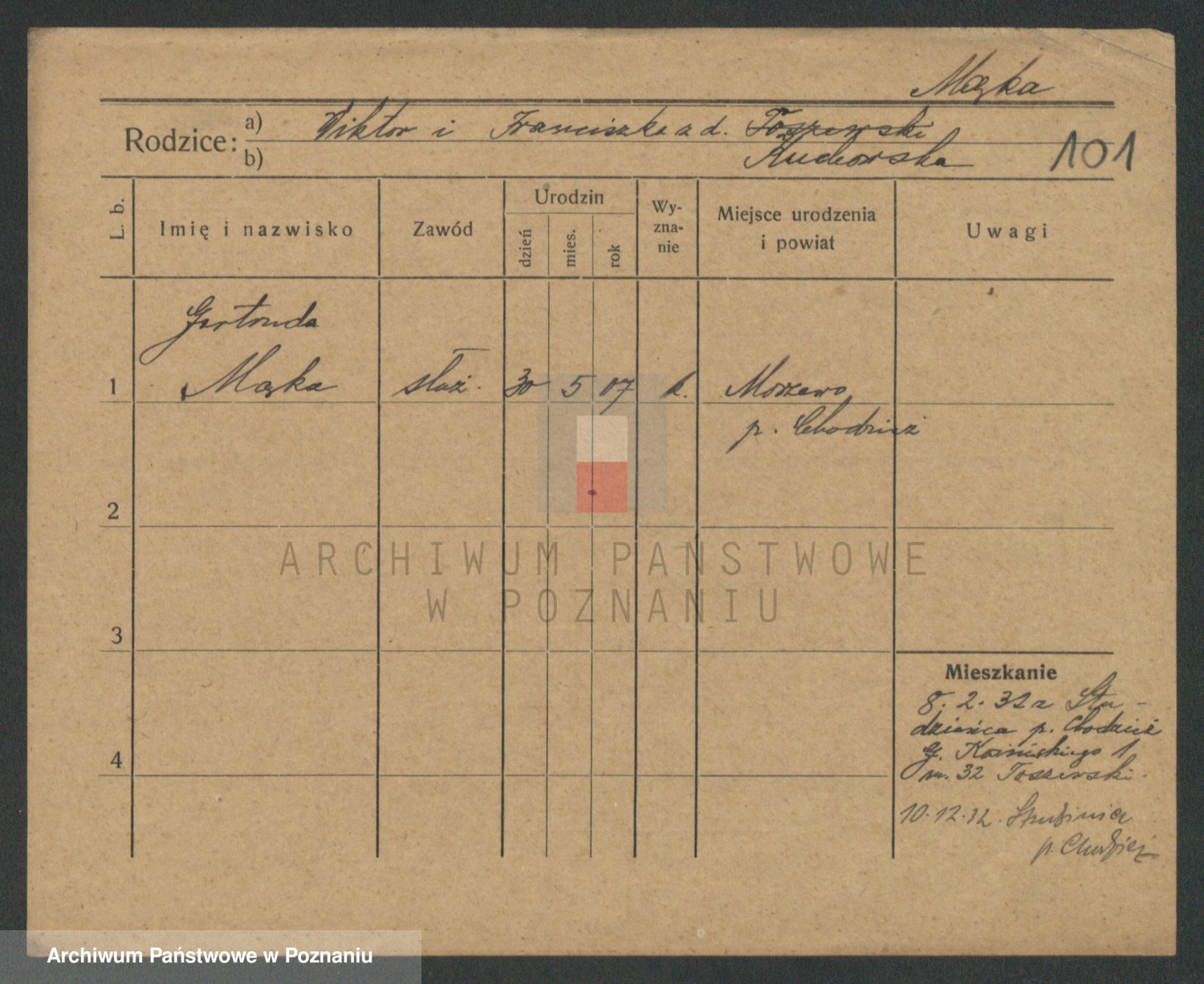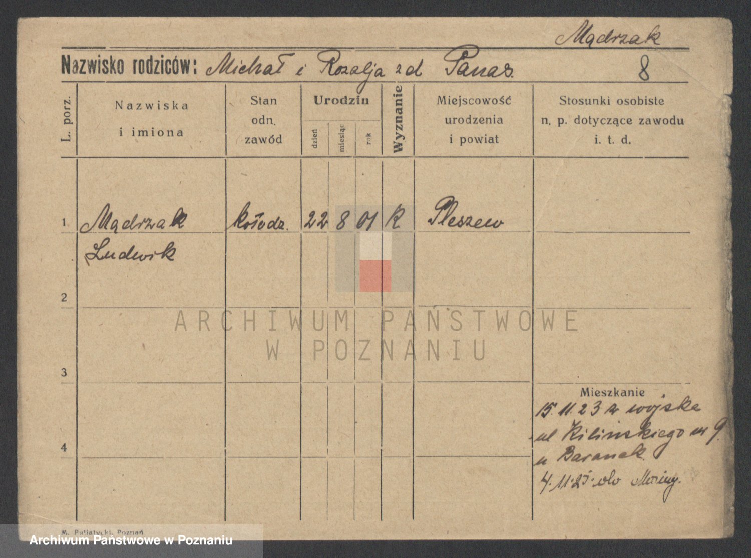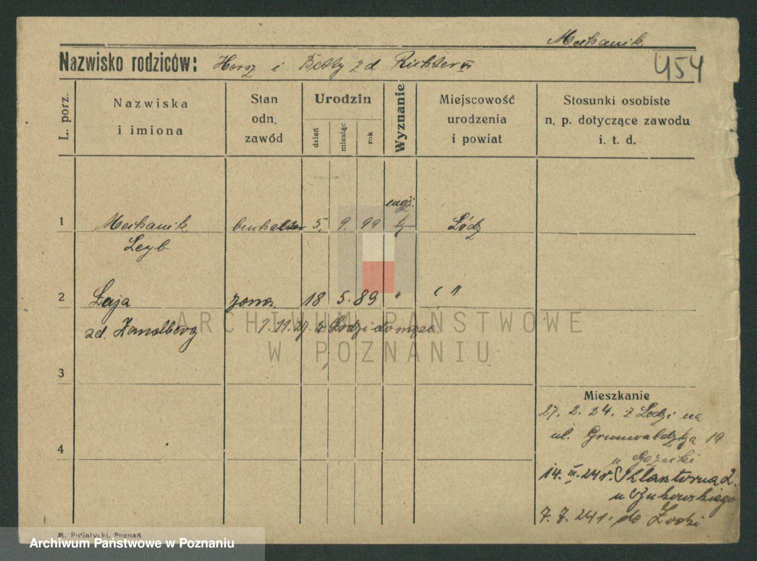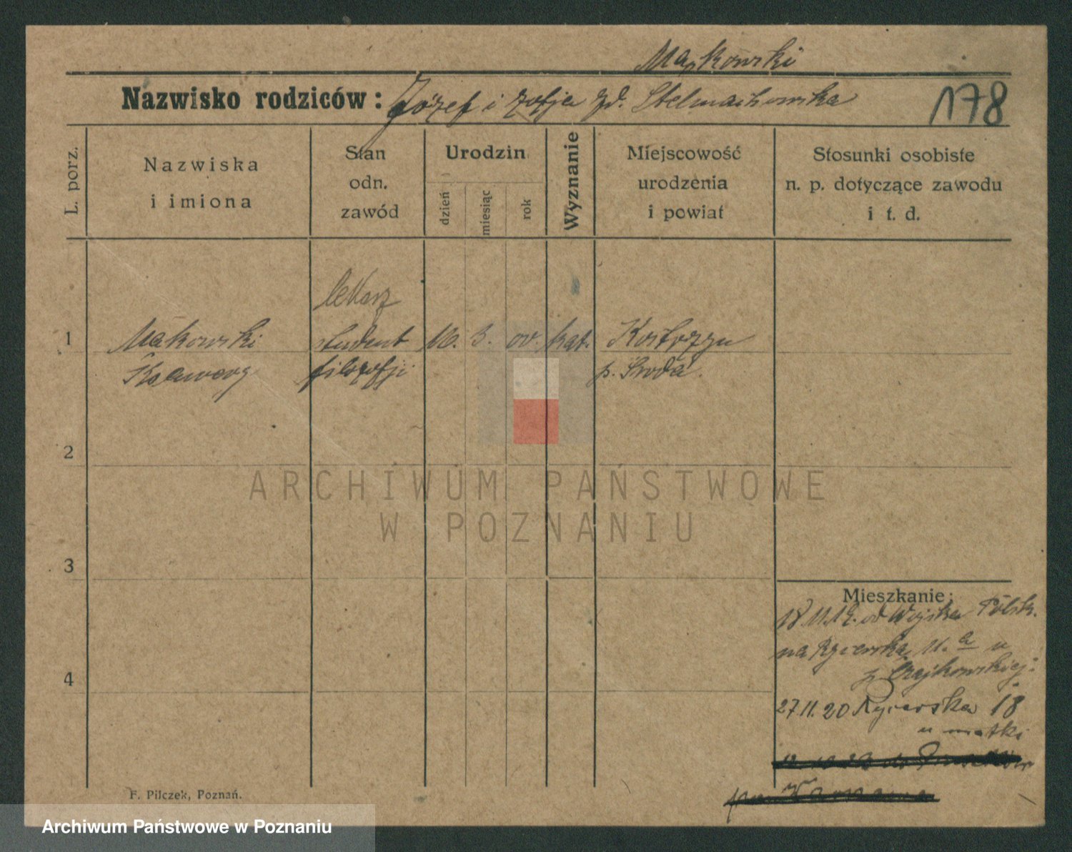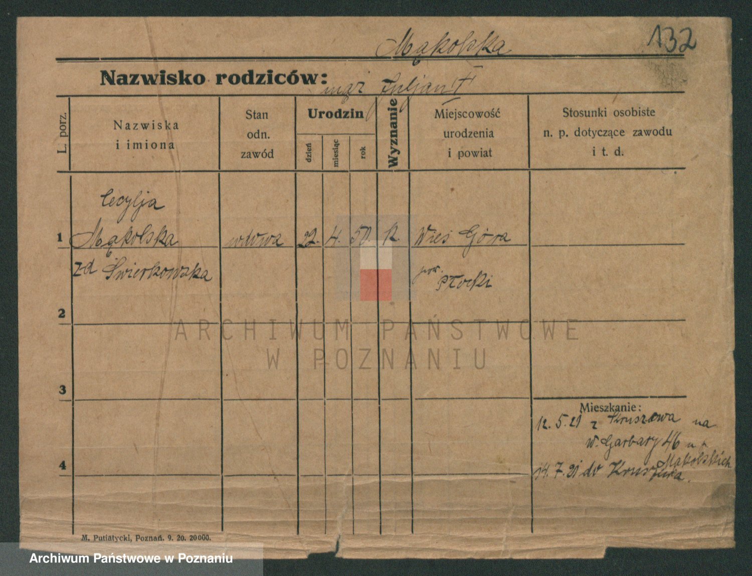 Podgląd karty osobowej dostępny jest po kliknięciu na nazwisko lub ikonkę karty. Można dokonywać powiększenia (ikony na górze) lub przechodzić między kolejnymi skanami (strzałki po bokach).