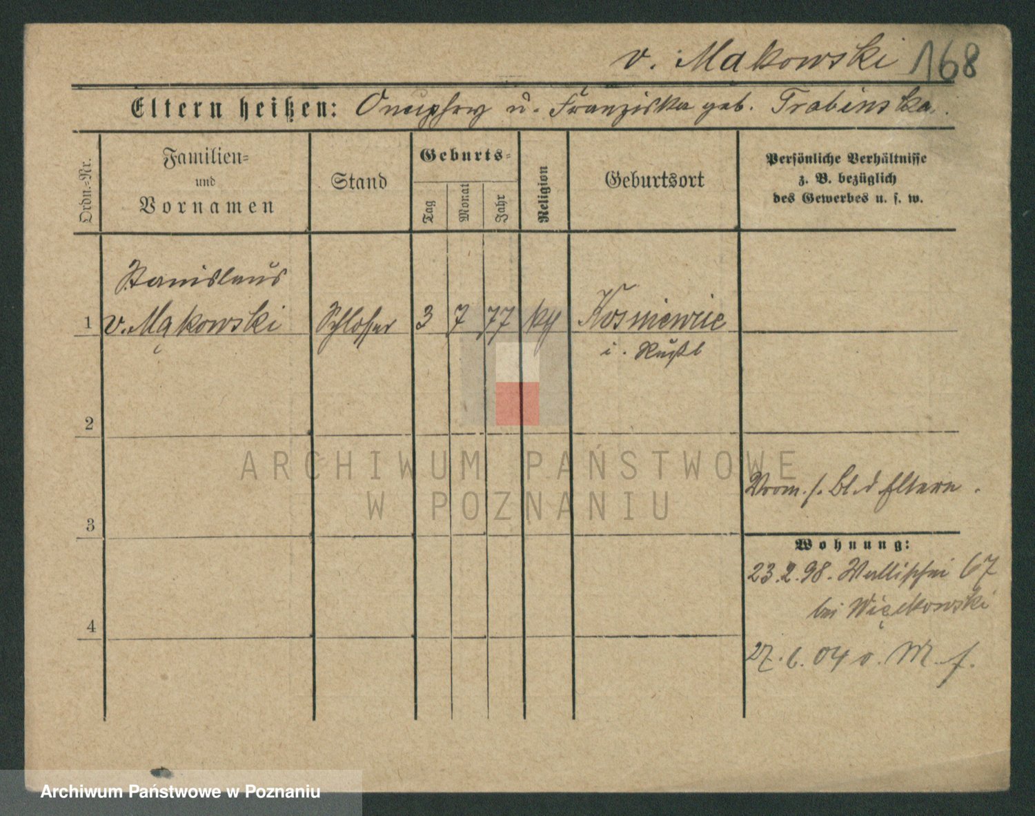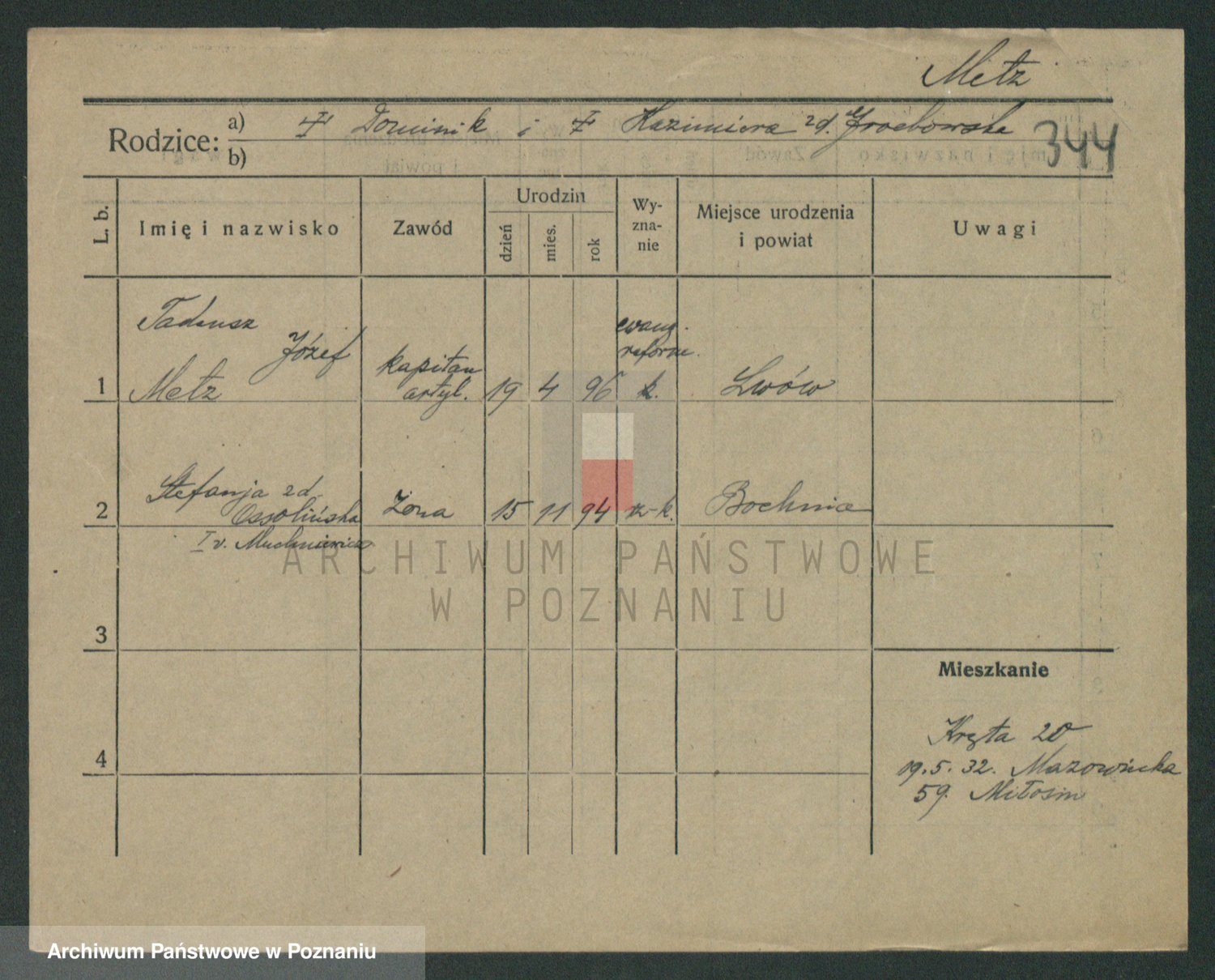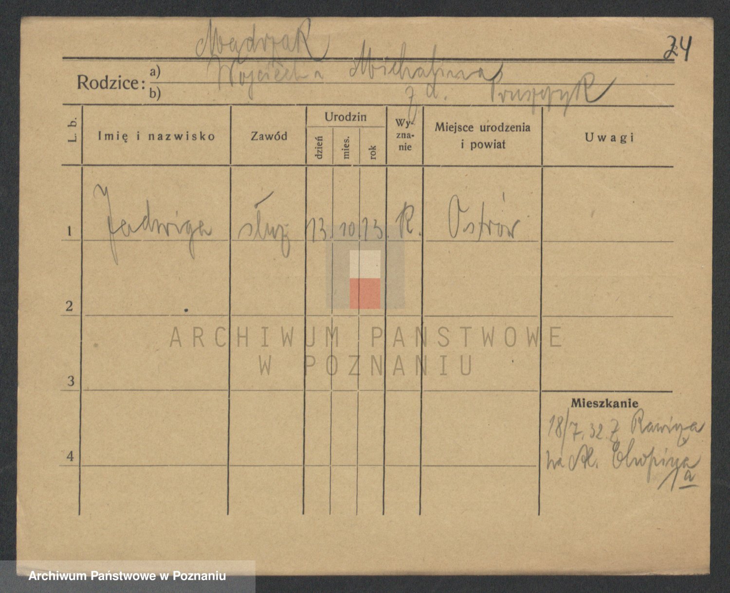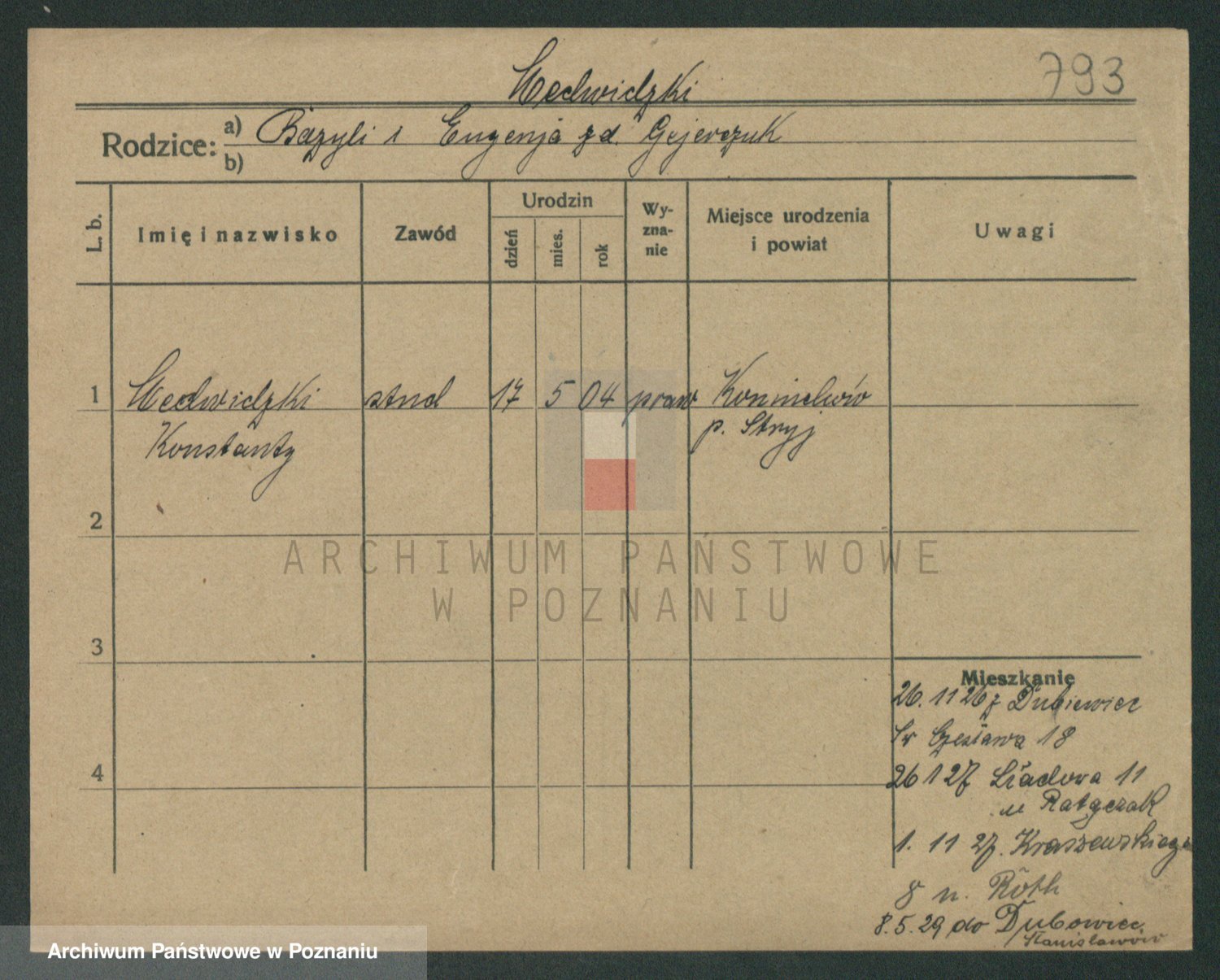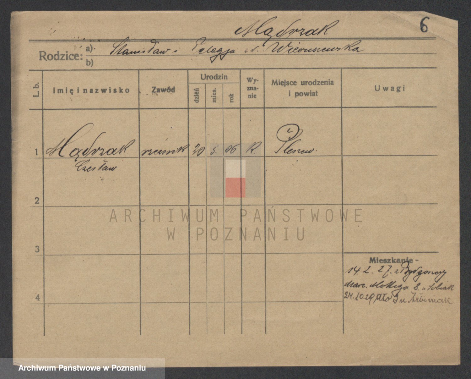 Podgląd karty osobowej dostępny jest po kliknięciu na nazwisko lub ikonkę karty. Można dokonywać powiększenia (ikony na górze) lub przechodzić między kolejnymi skanami (strzałki po bokach).
