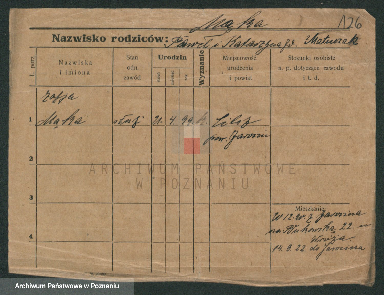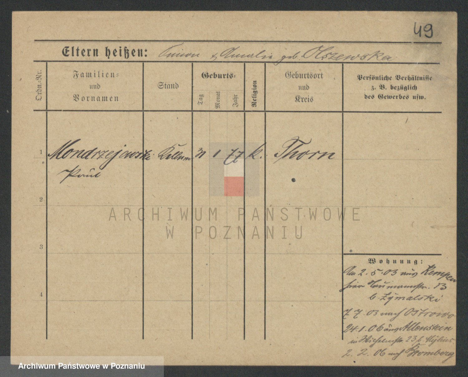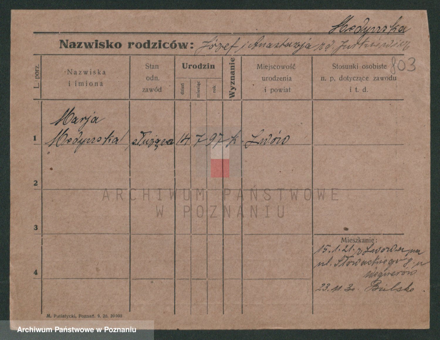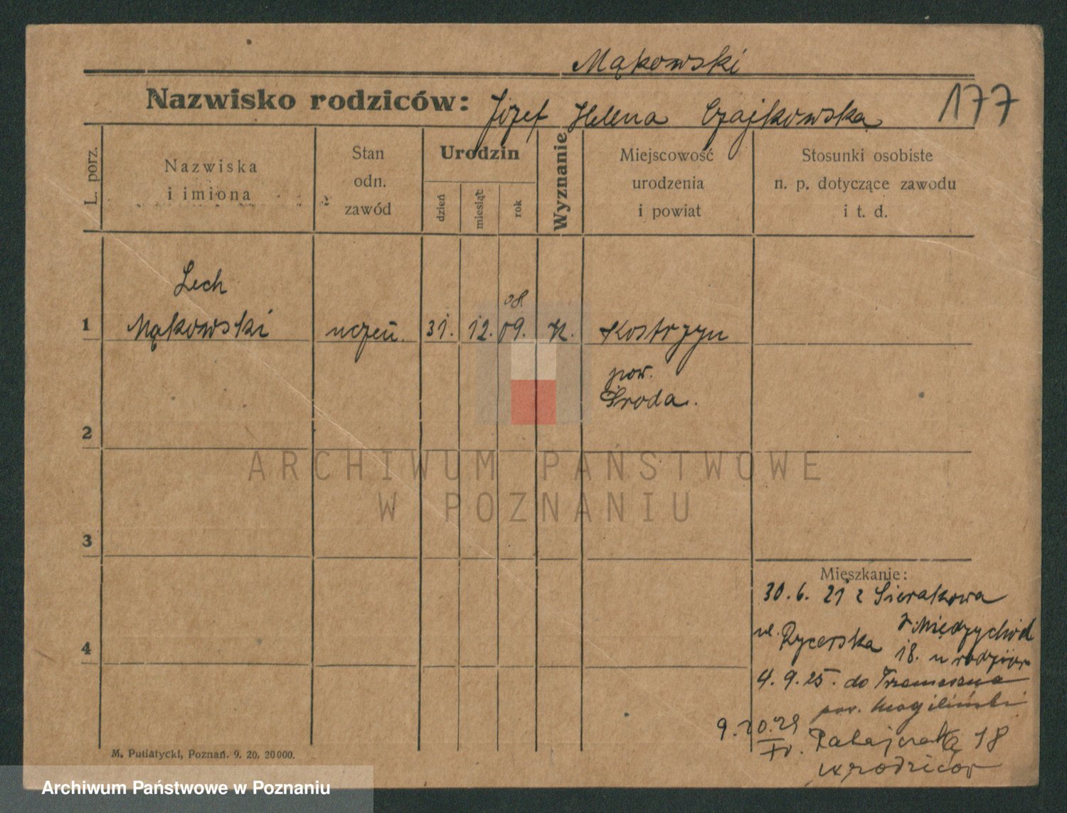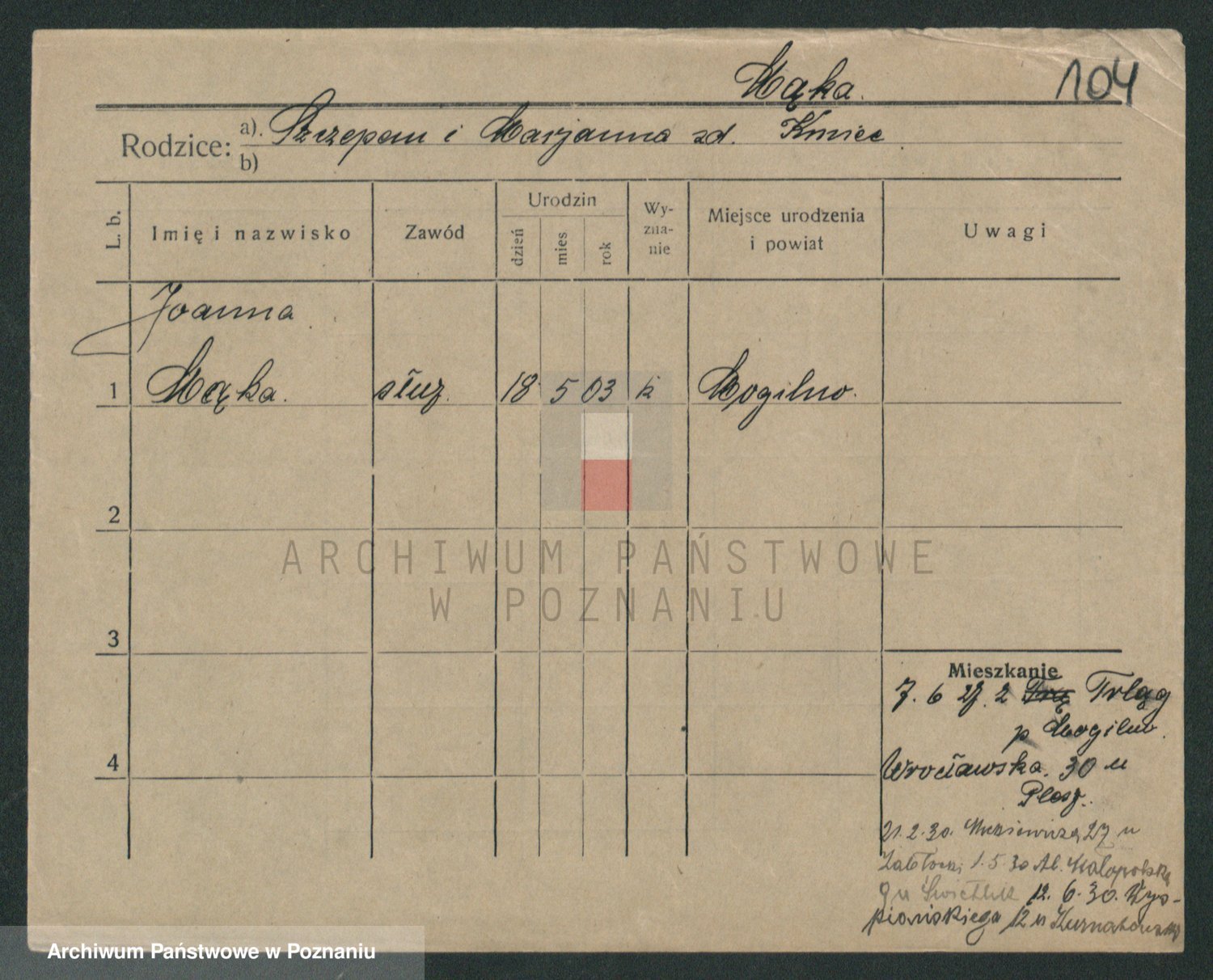 Podgląd karty osobowej dostępny jest po kliknięciu na nazwisko lub ikonkę karty. Można dokonywać powiększenia (ikony na górze) lub przechodzić między kolejnymi skanami (strzałki po bokach).