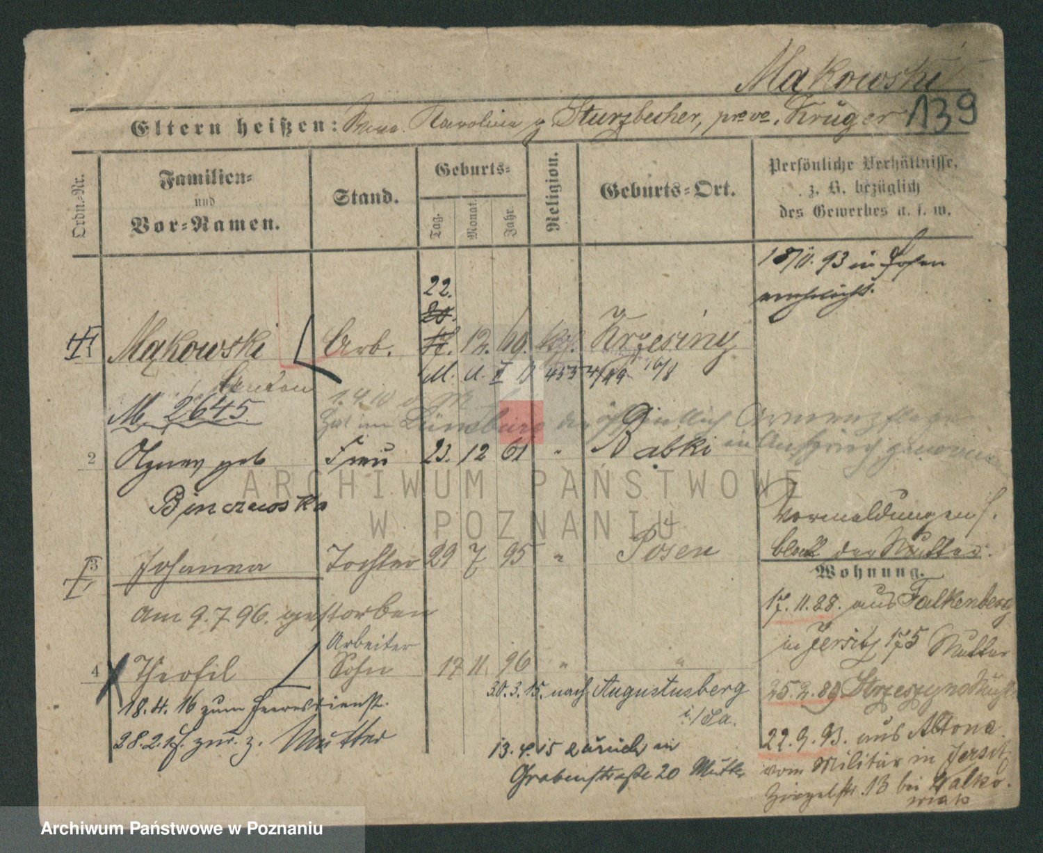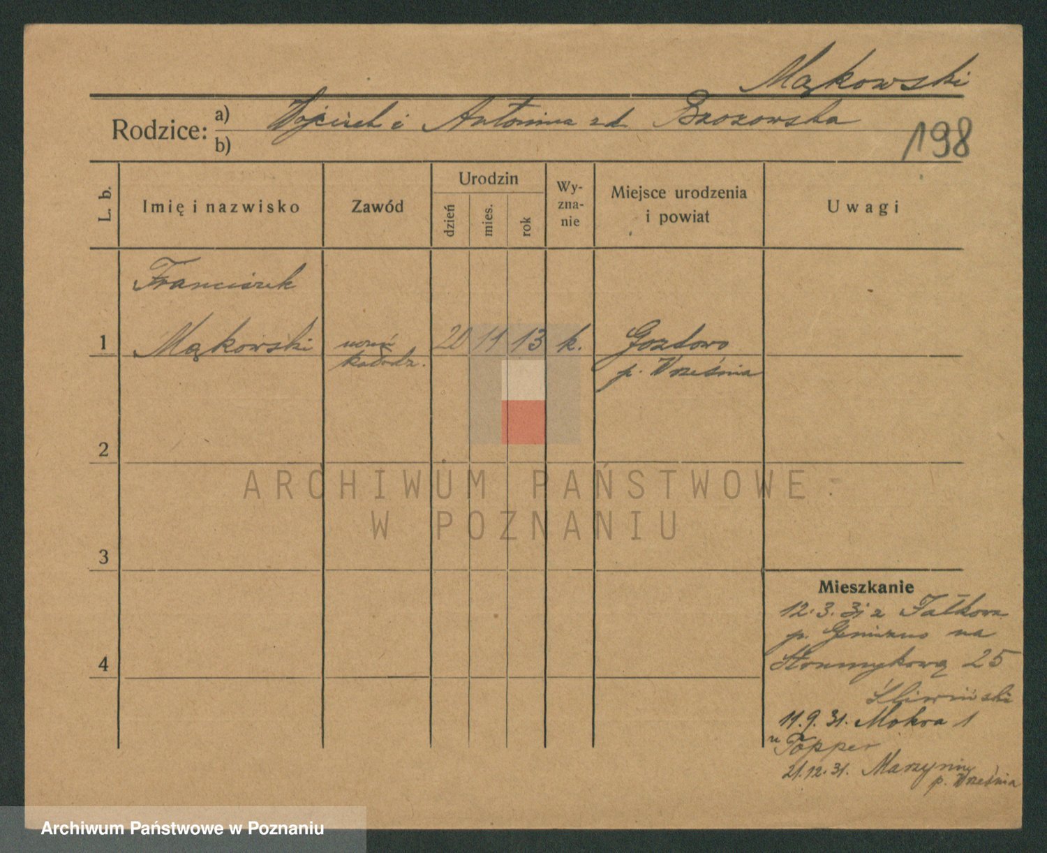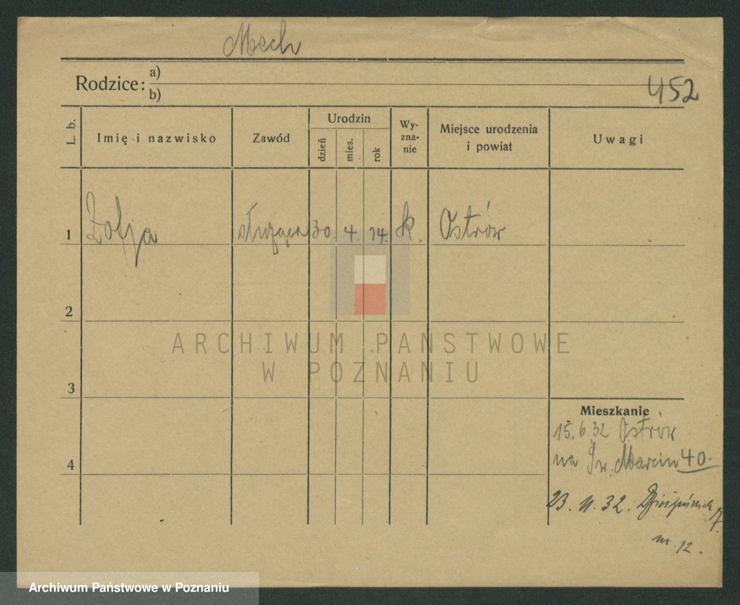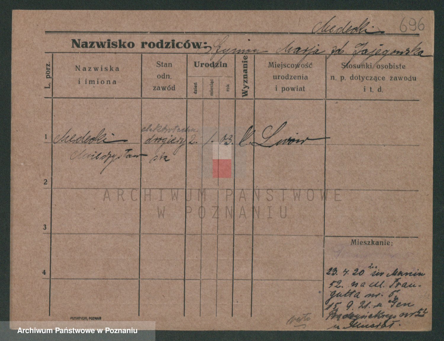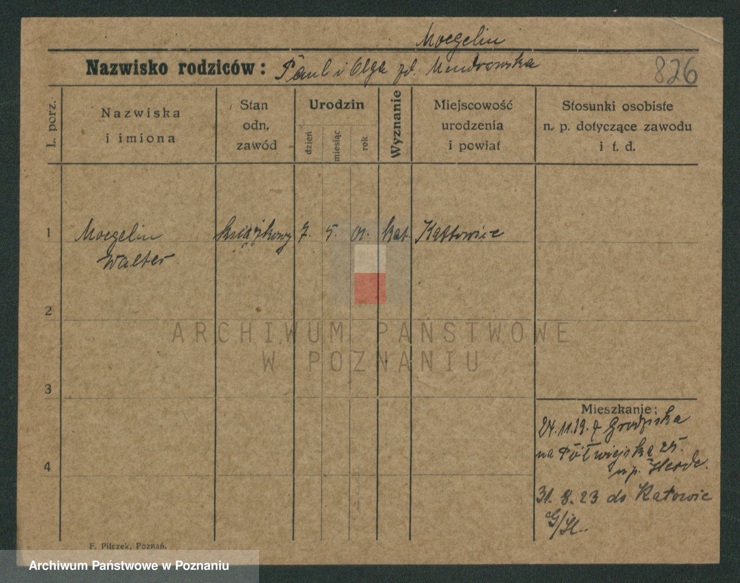 Podgląd karty osobowej dostępny jest po kliknięciu na nazwisko lub ikonkę karty. Można dokonywać powiększenia (ikony na górze) lub przechodzić między kolejnymi skanami (strzałki po bokach).