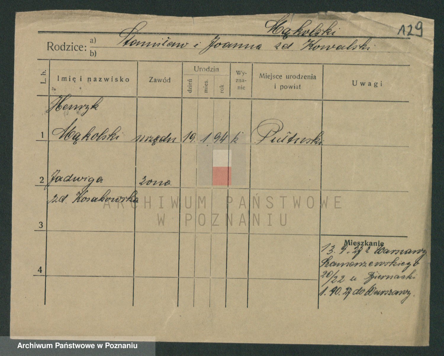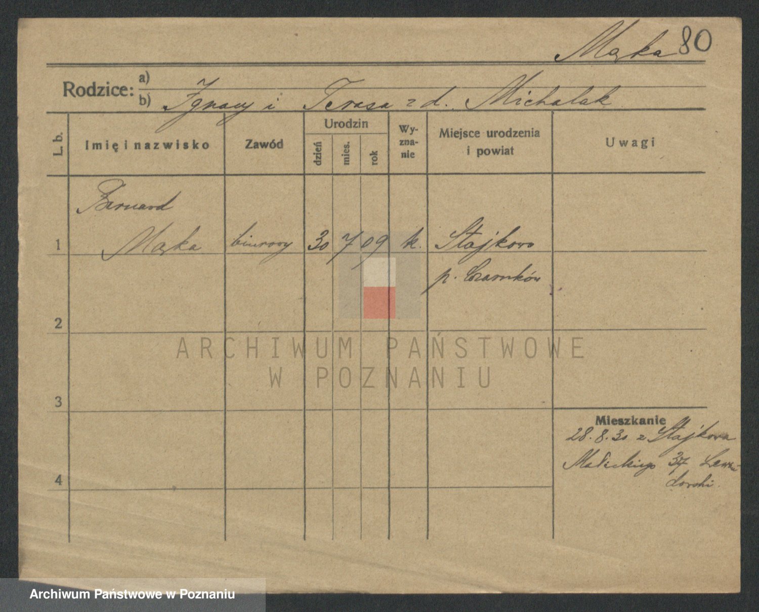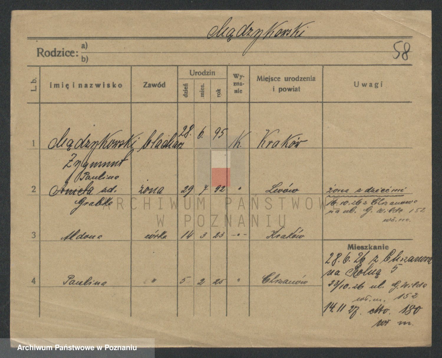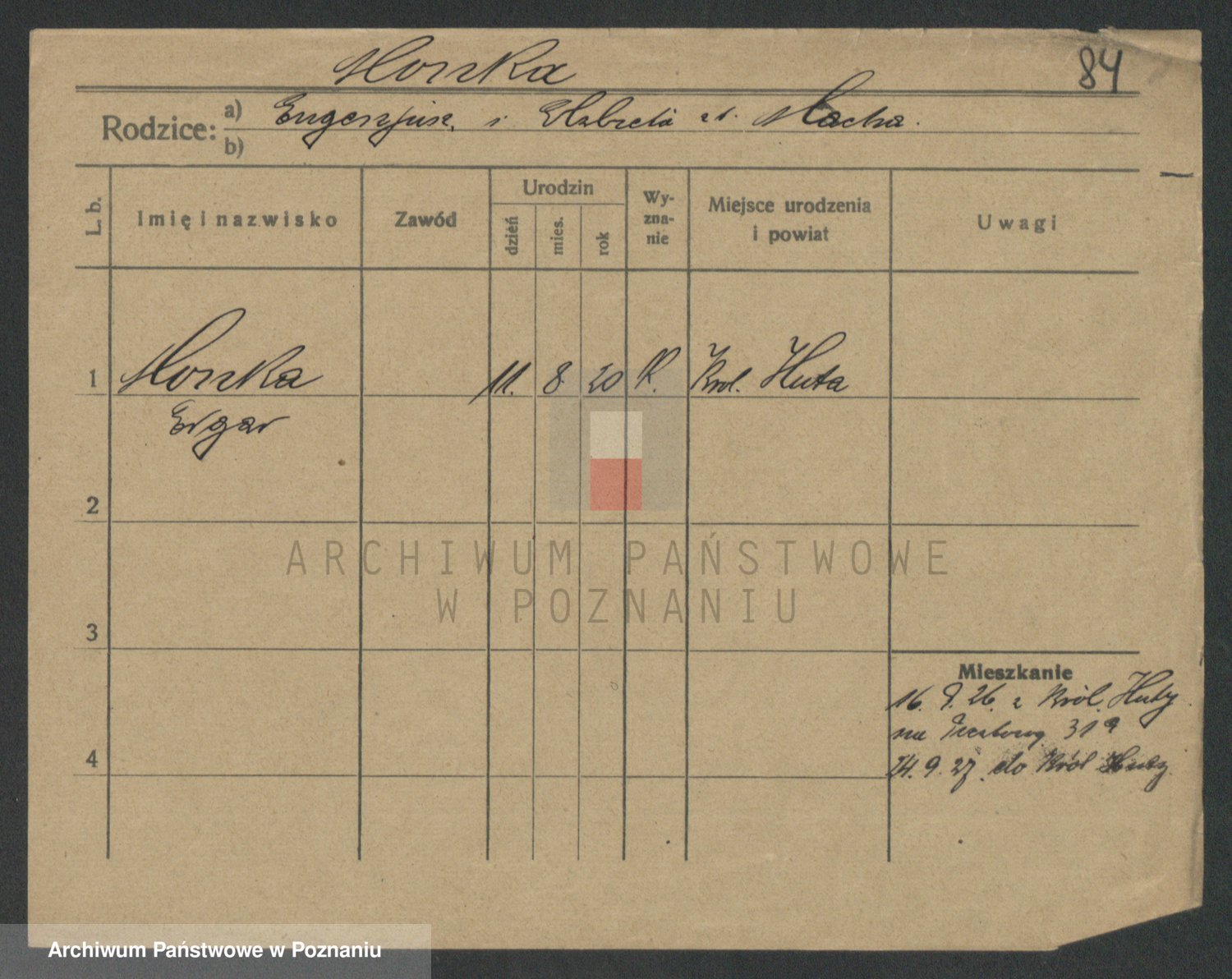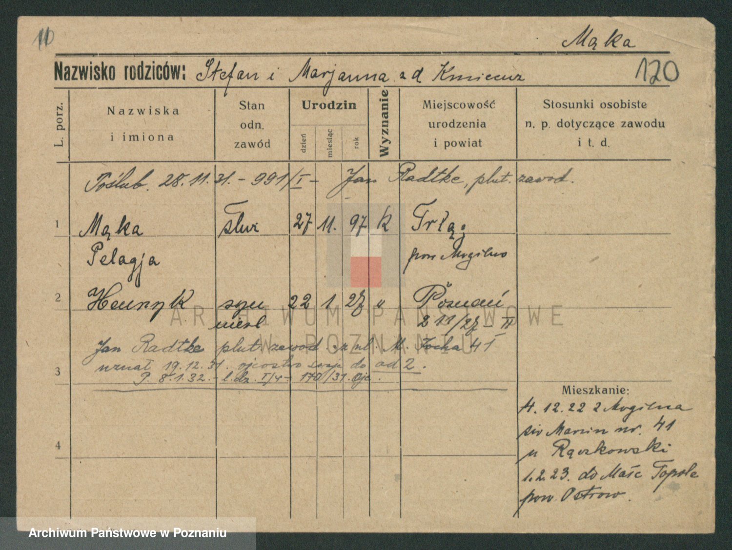 Podgląd karty osobowej dostępny jest po kliknięciu na nazwisko lub ikonkę karty. Można dokonywać powiększenia (ikony na górze) lub przechodzić między kolejnymi skanami (strzałki po bokach).