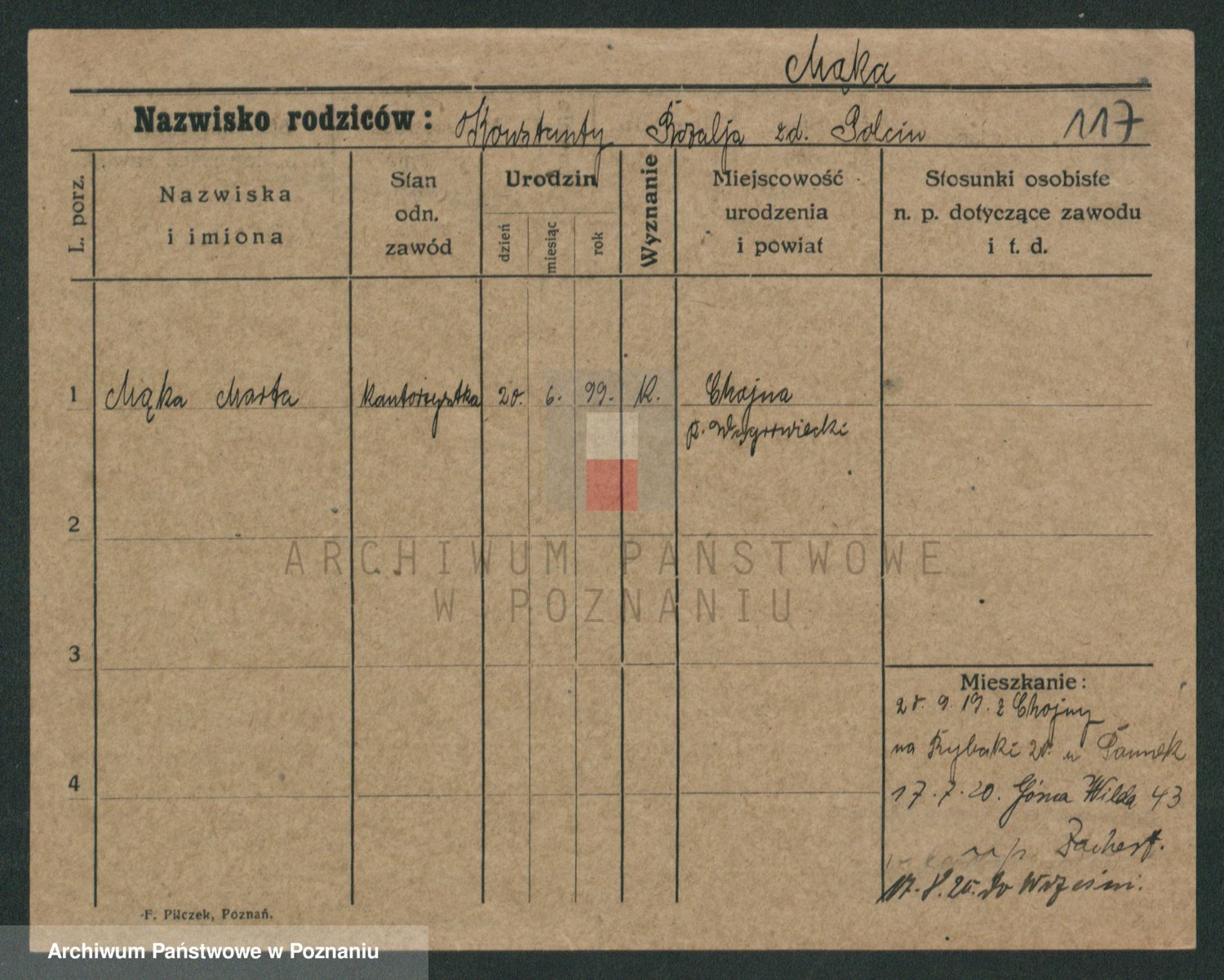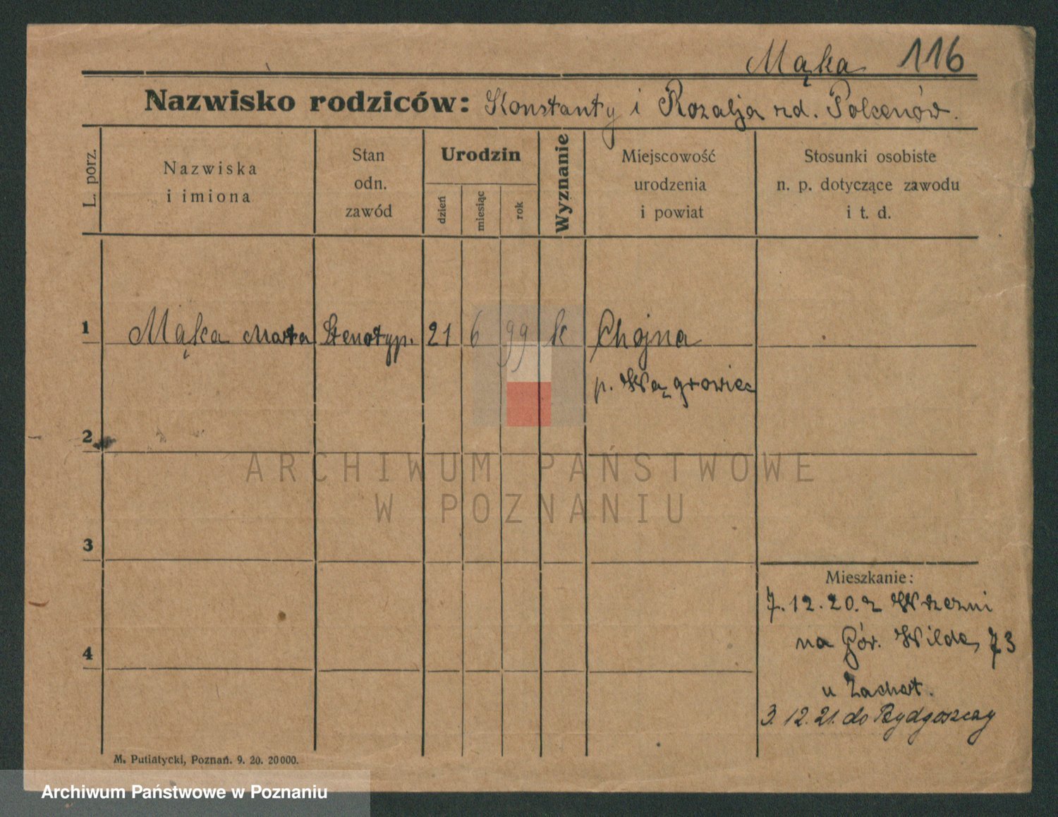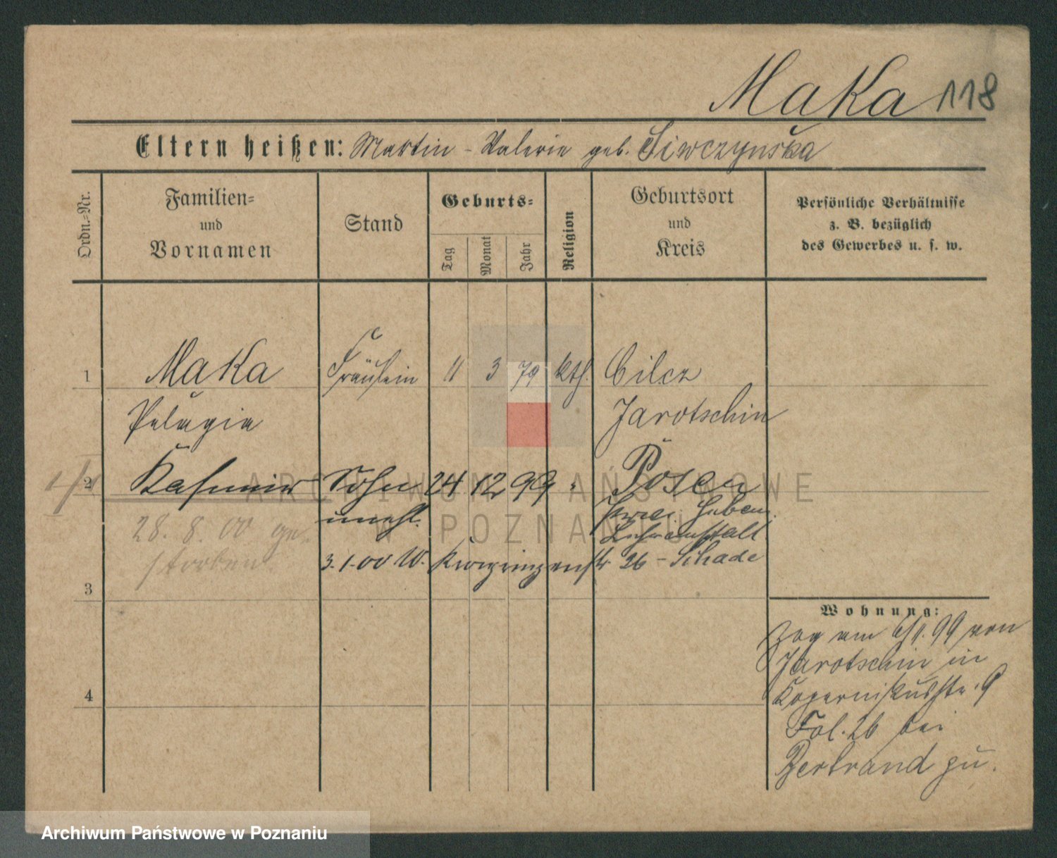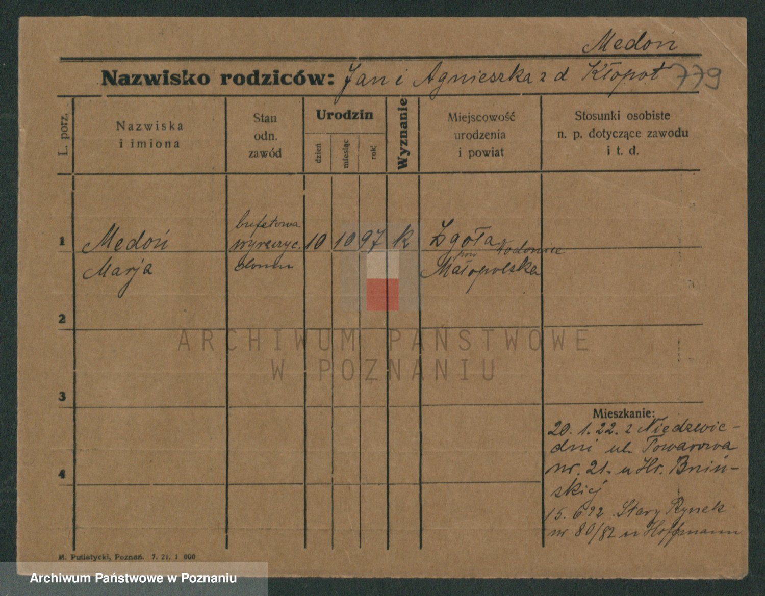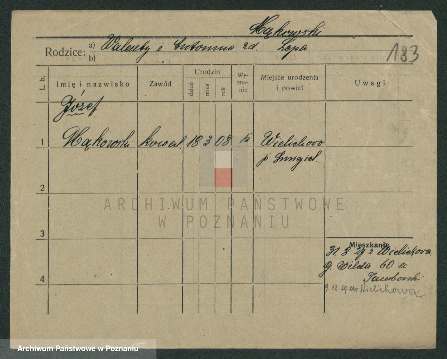 Podgląd karty osobowej dostępny jest po kliknięciu na nazwisko lub ikonkę karty. Można dokonywać powiększenia (ikony na górze) lub przechodzić między kolejnymi skanami (strzałki po bokach).