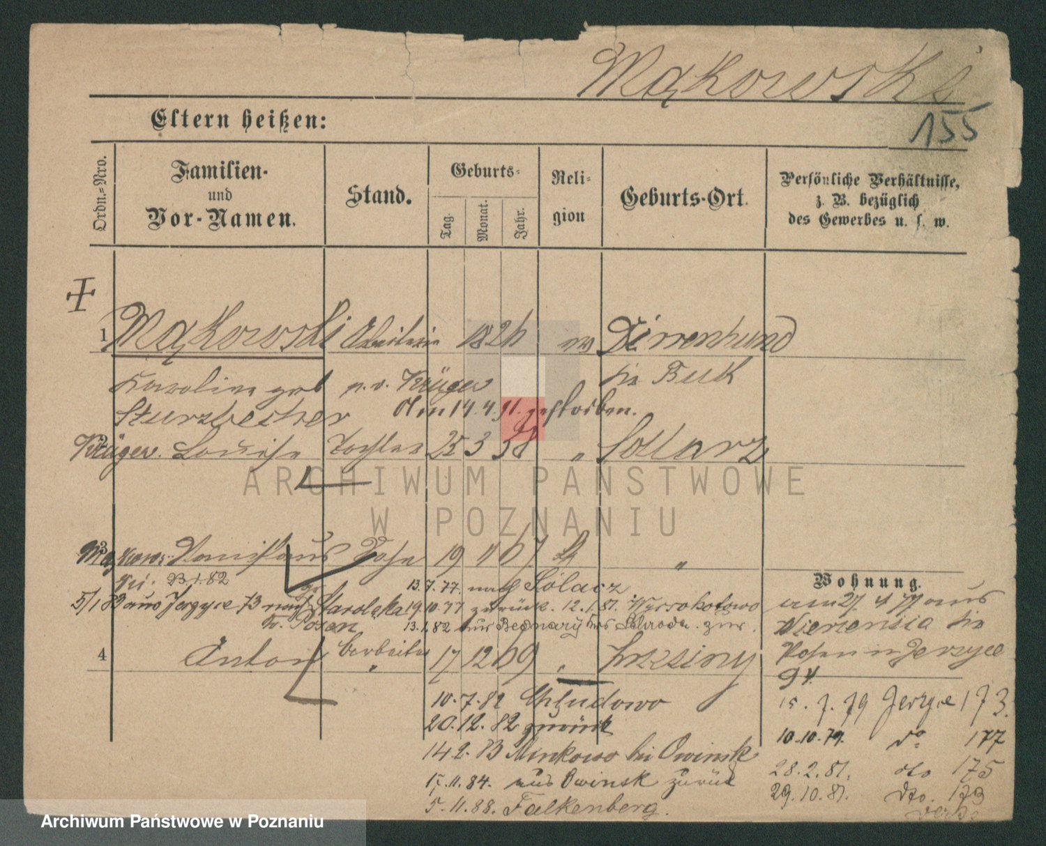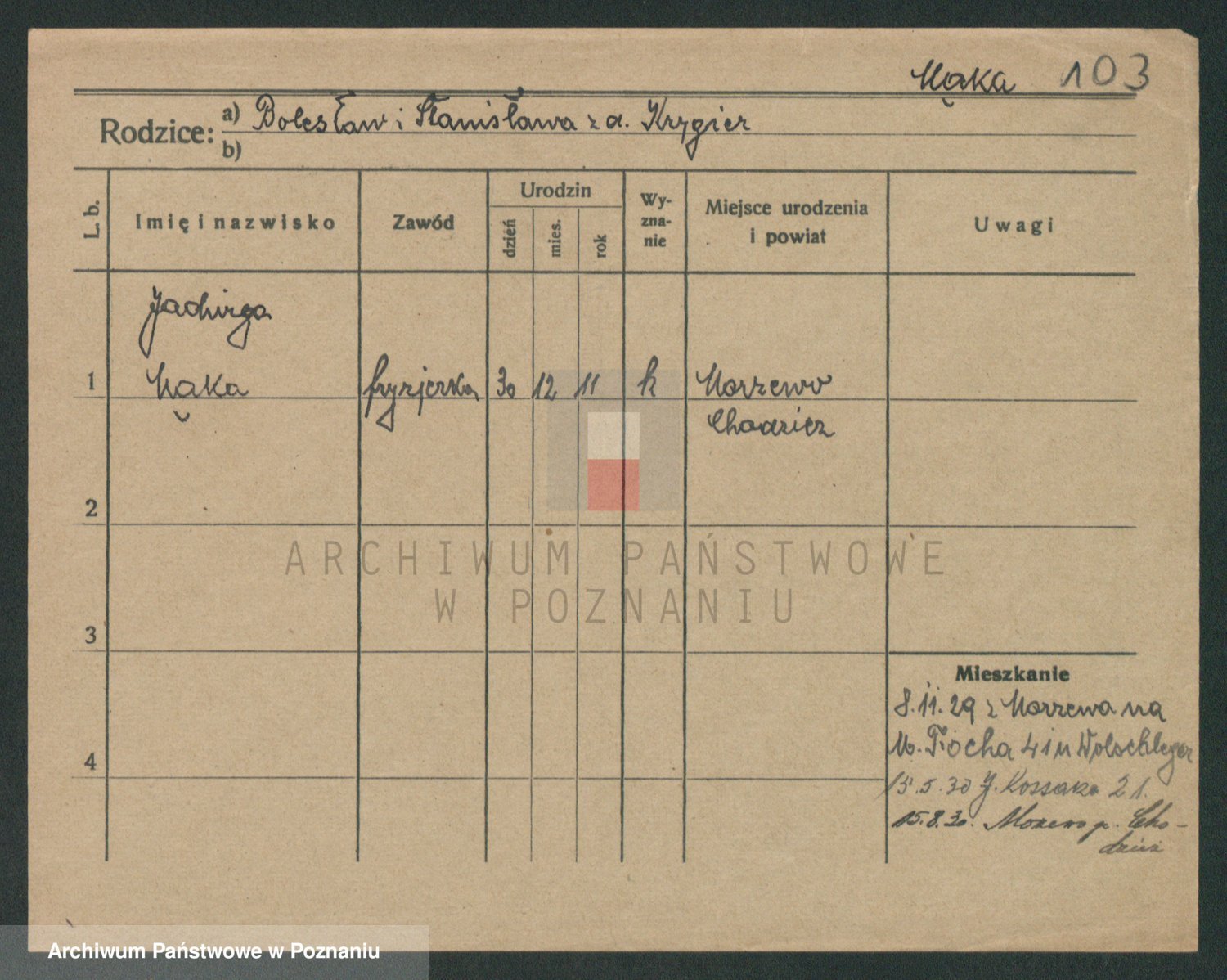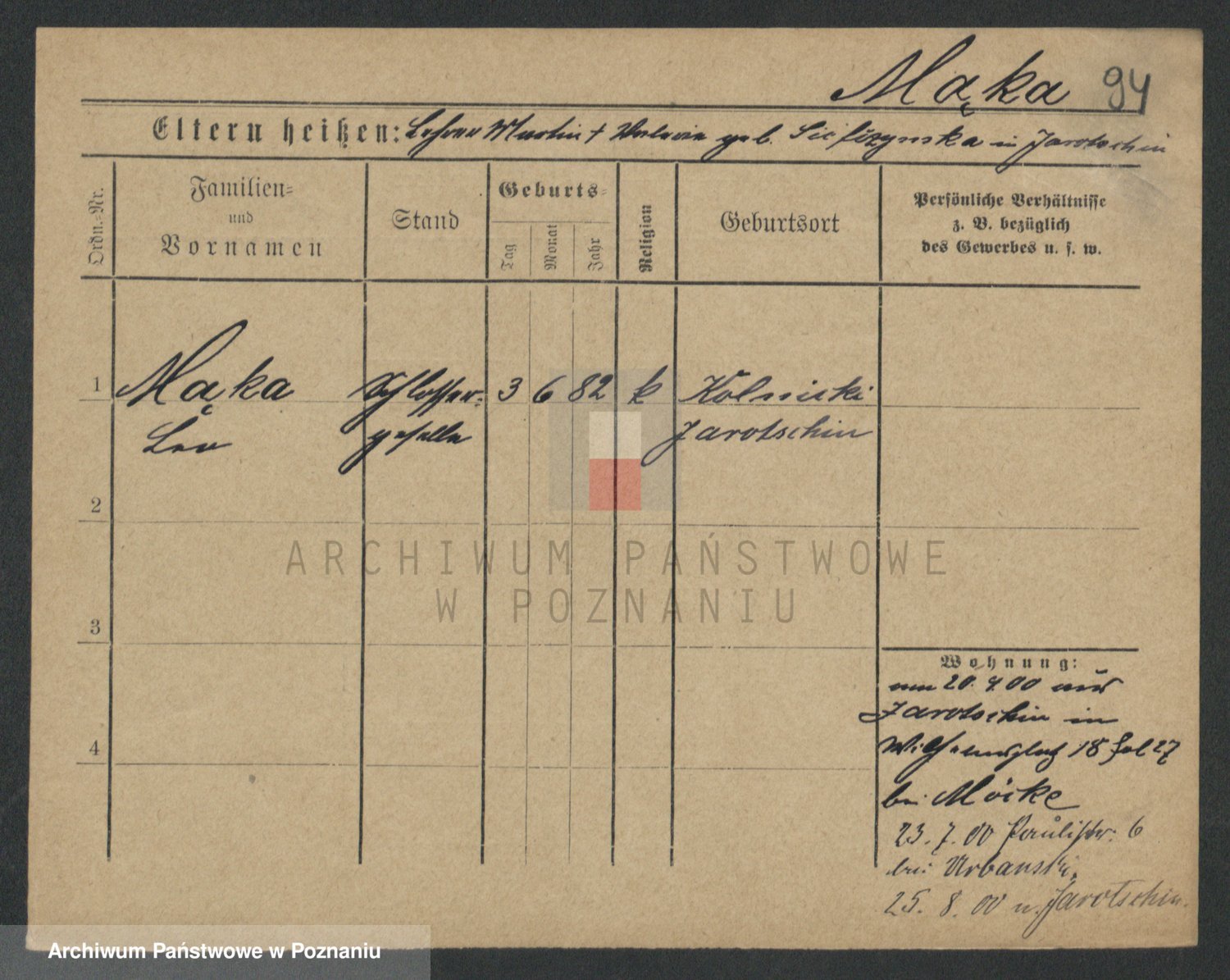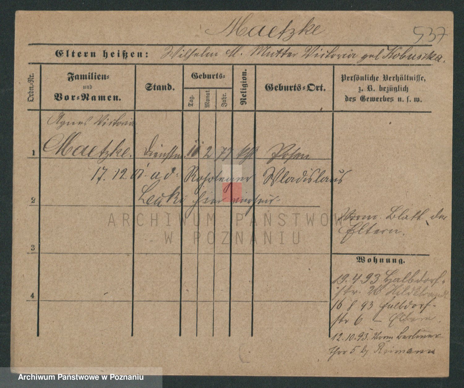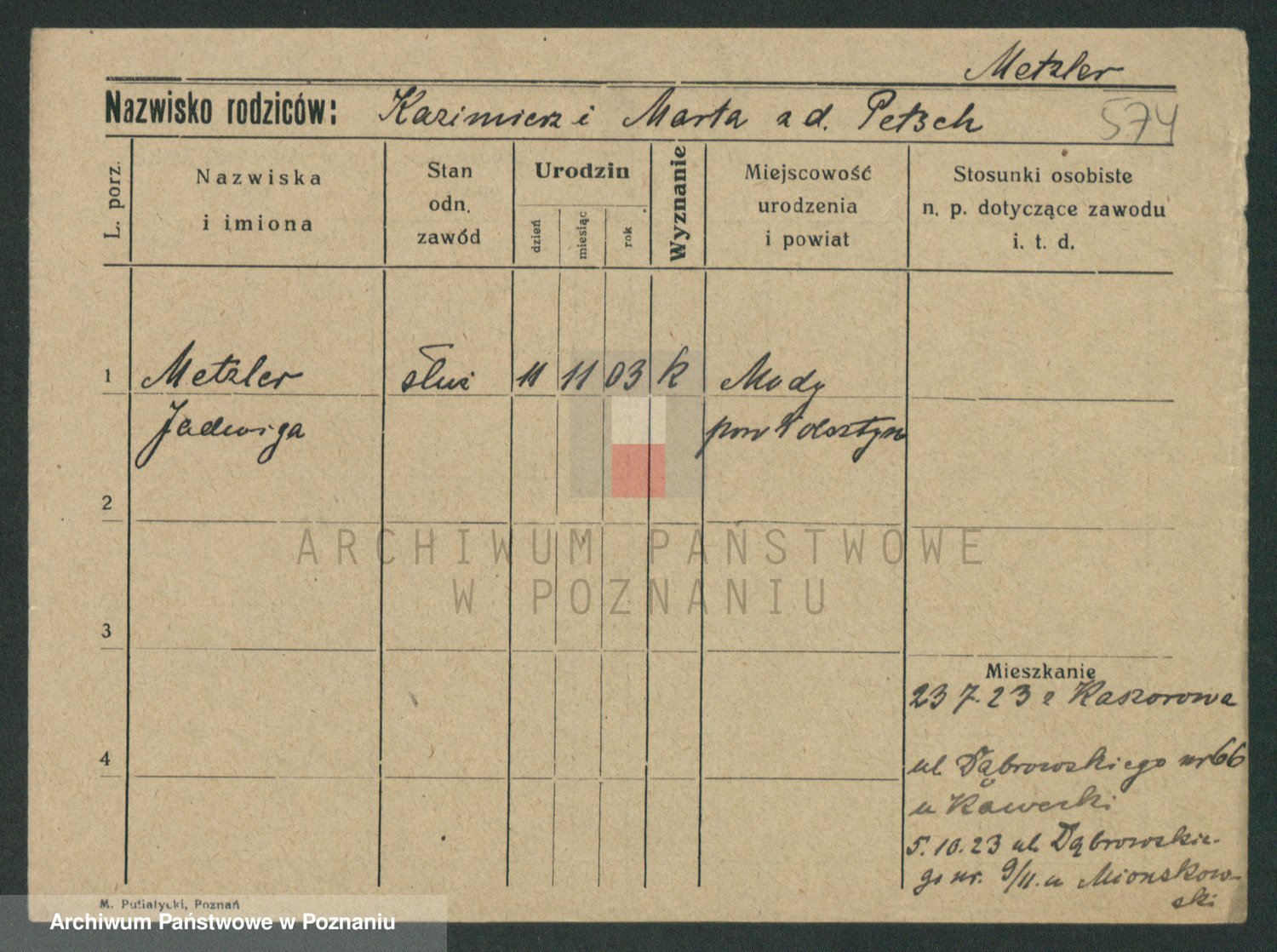 Podgląd karty osobowej dostępny jest po kliknięciu na nazwisko lub ikonkę karty. Można dokonywać powiększenia (ikony na górze) lub przechodzić między kolejnymi skanami (strzałki po bokach).