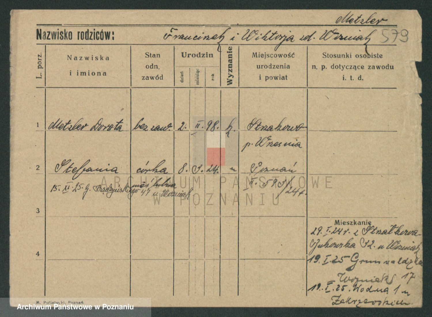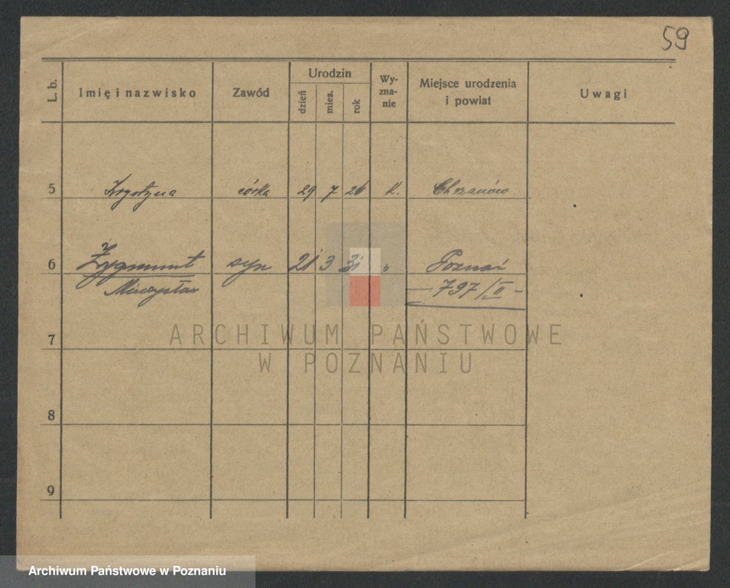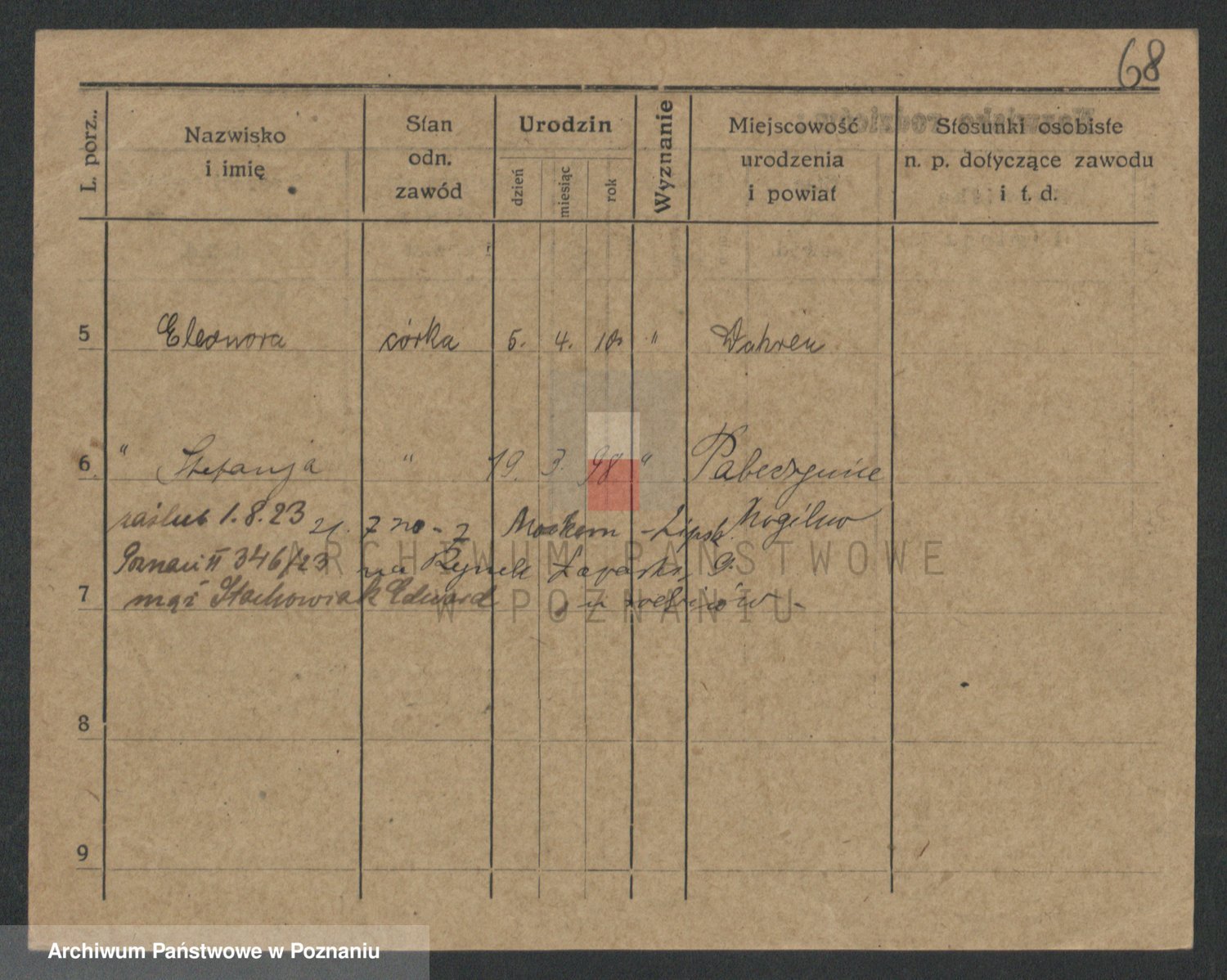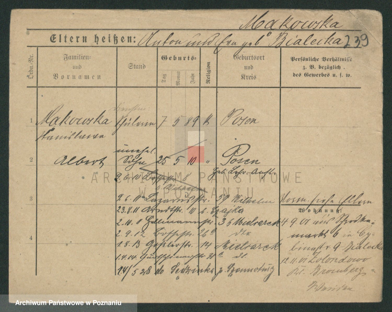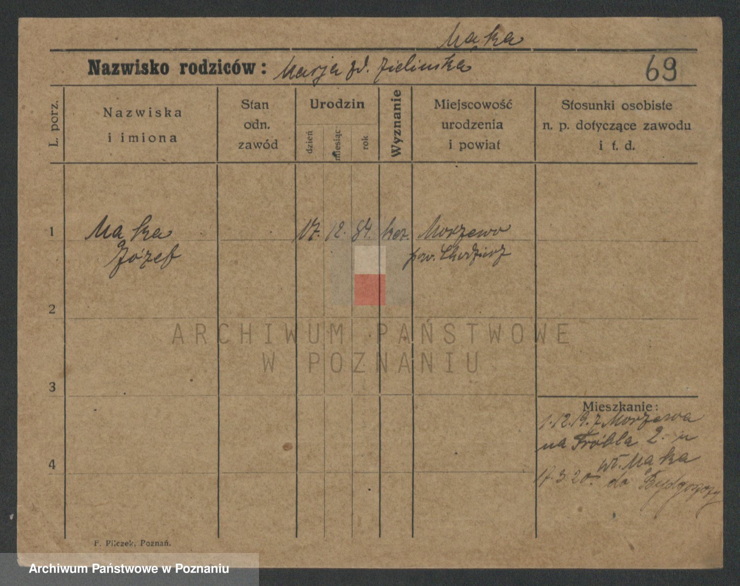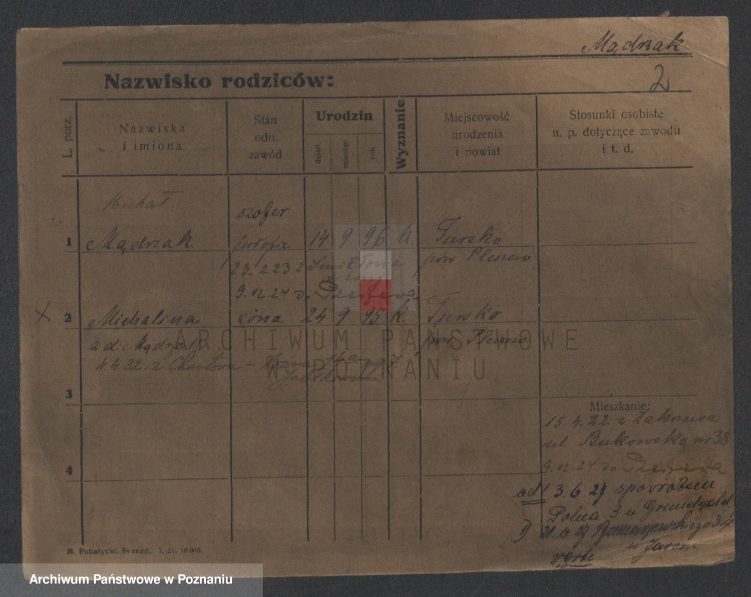 Podgląd karty osobowej dostępny jest po kliknięciu na nazwisko lub ikonkę karty. Można dokonywać powiększenia (ikony na górze) lub przechodzić między kolejnymi skanami (strzałki po bokach).