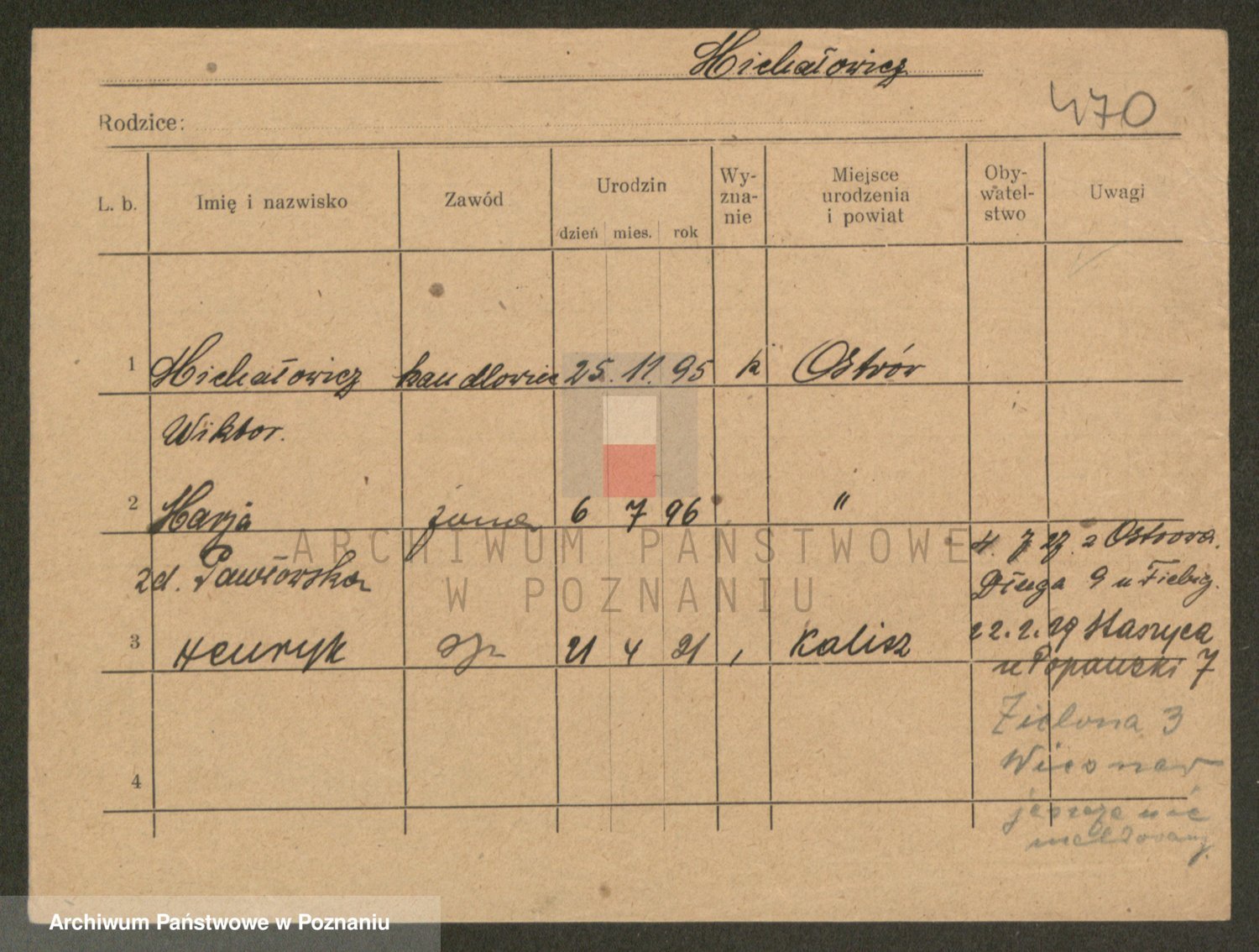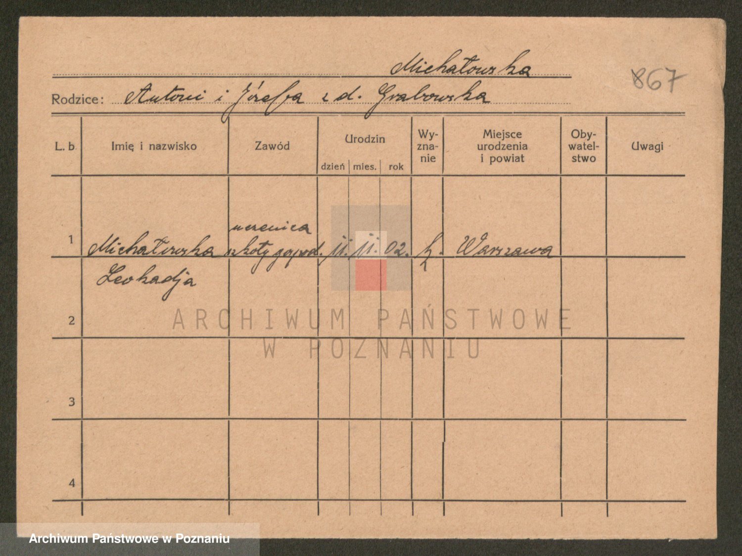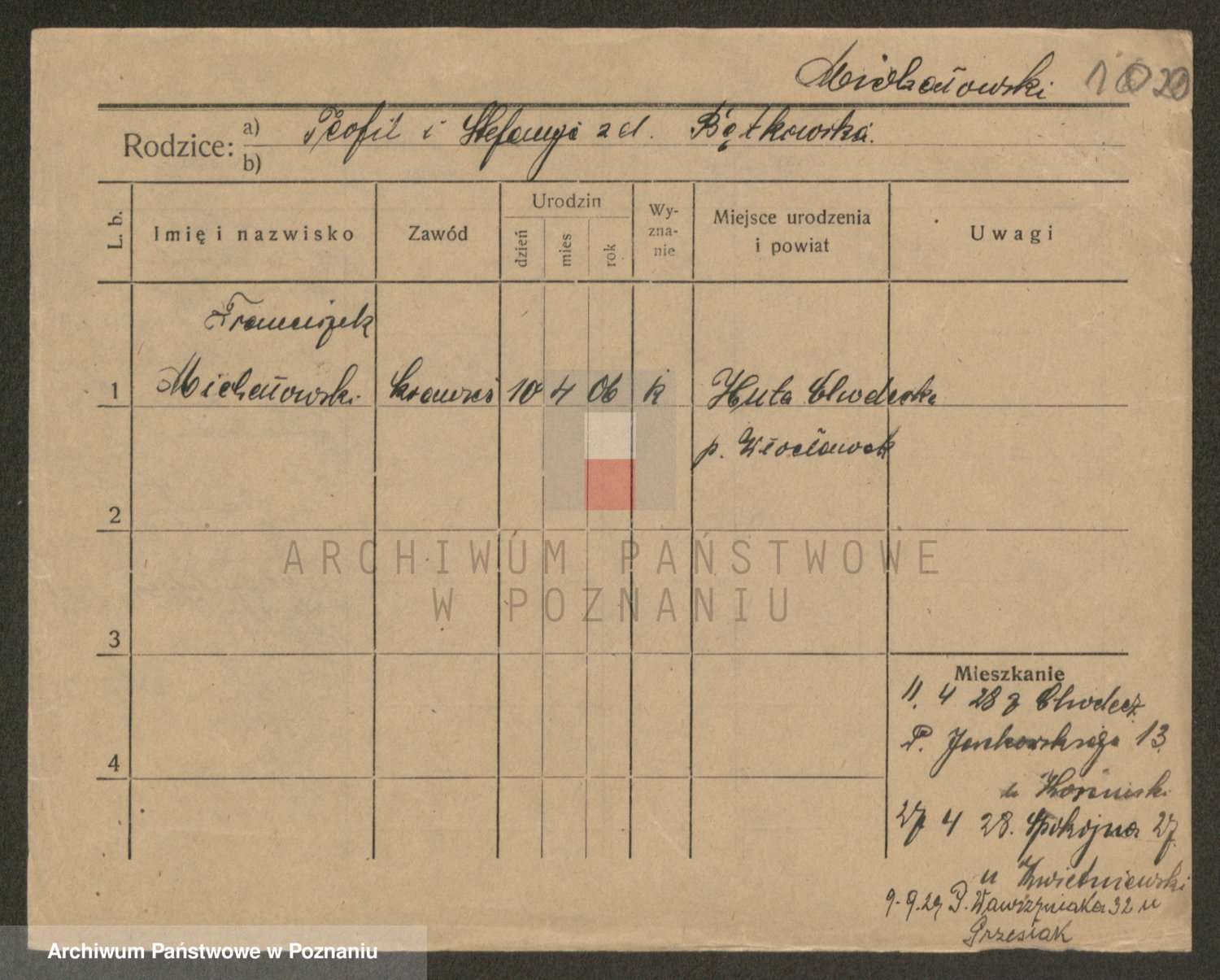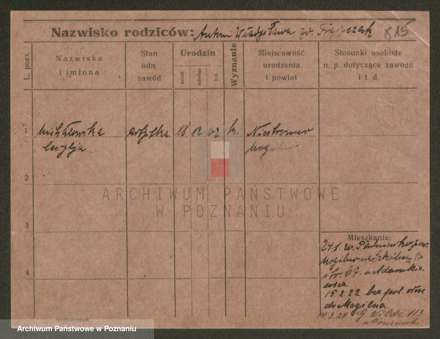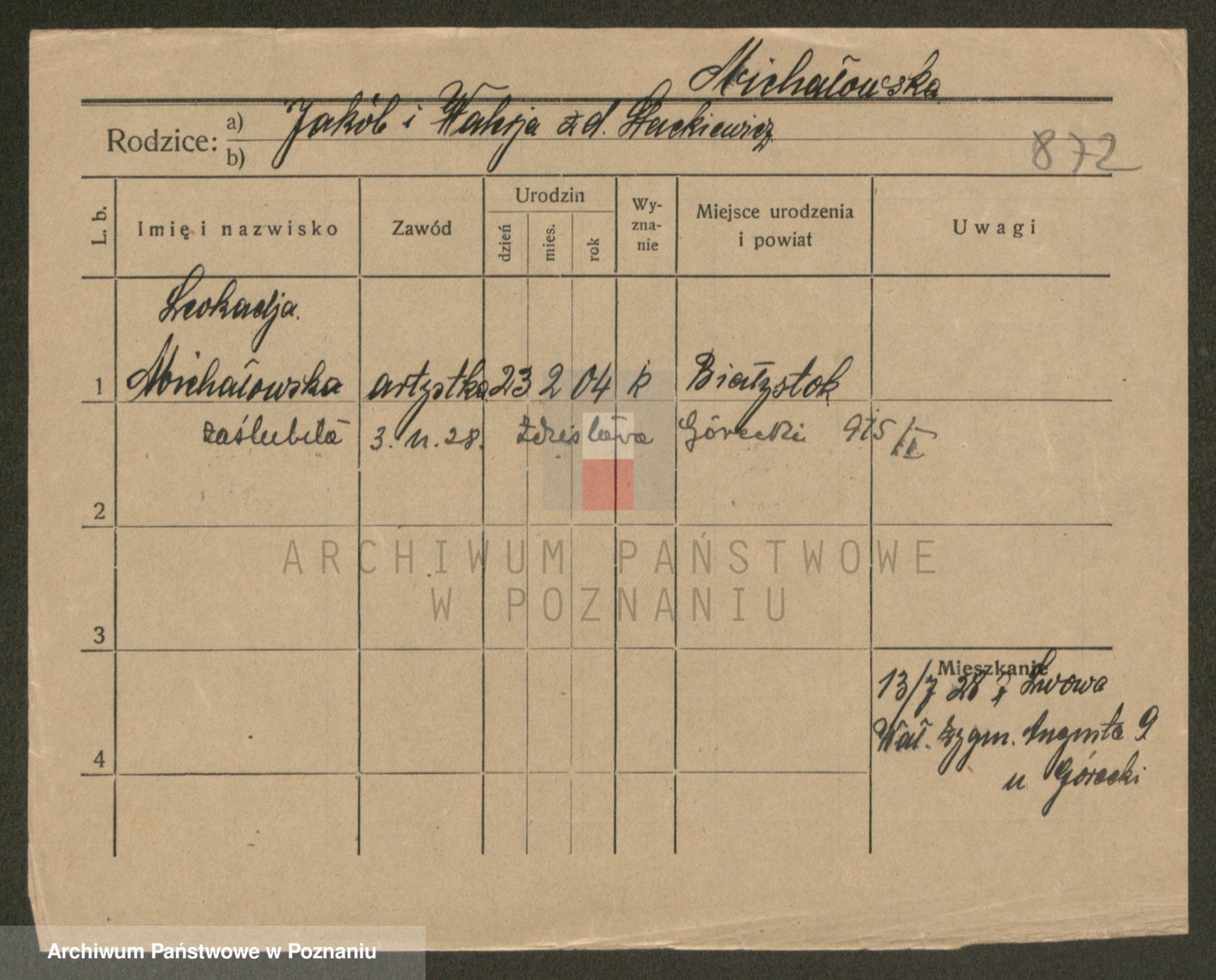 Podgląd karty osobowej dostępny jest po kliknięciu na nazwisko lub ikonkę karty. Można dokonywać powiększenia (ikony na górze) lub przechodzić między kolejnymi skanami (strzałki po bokach).
