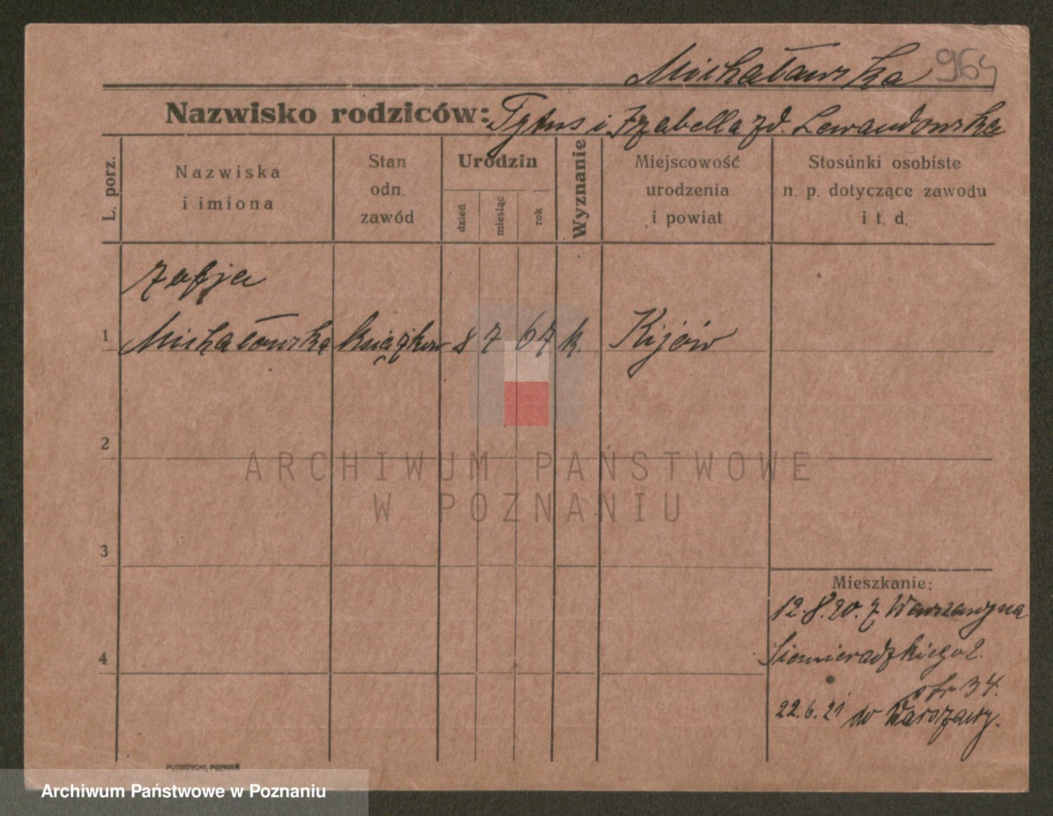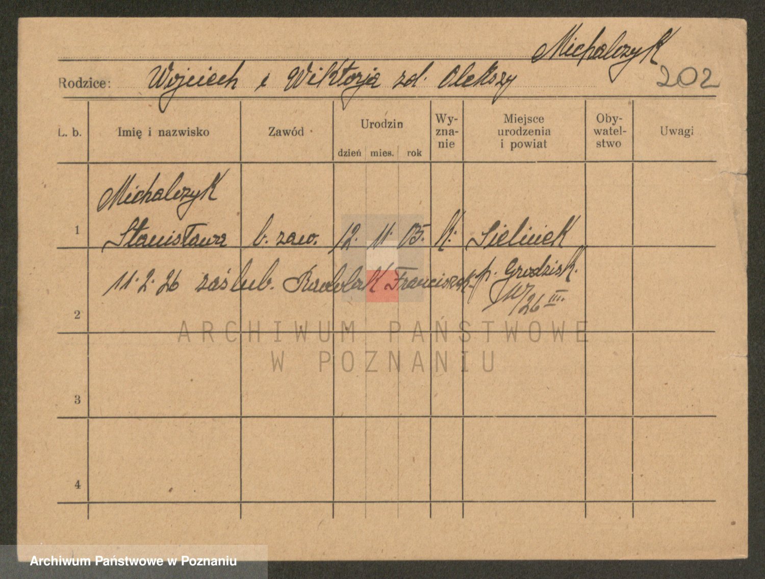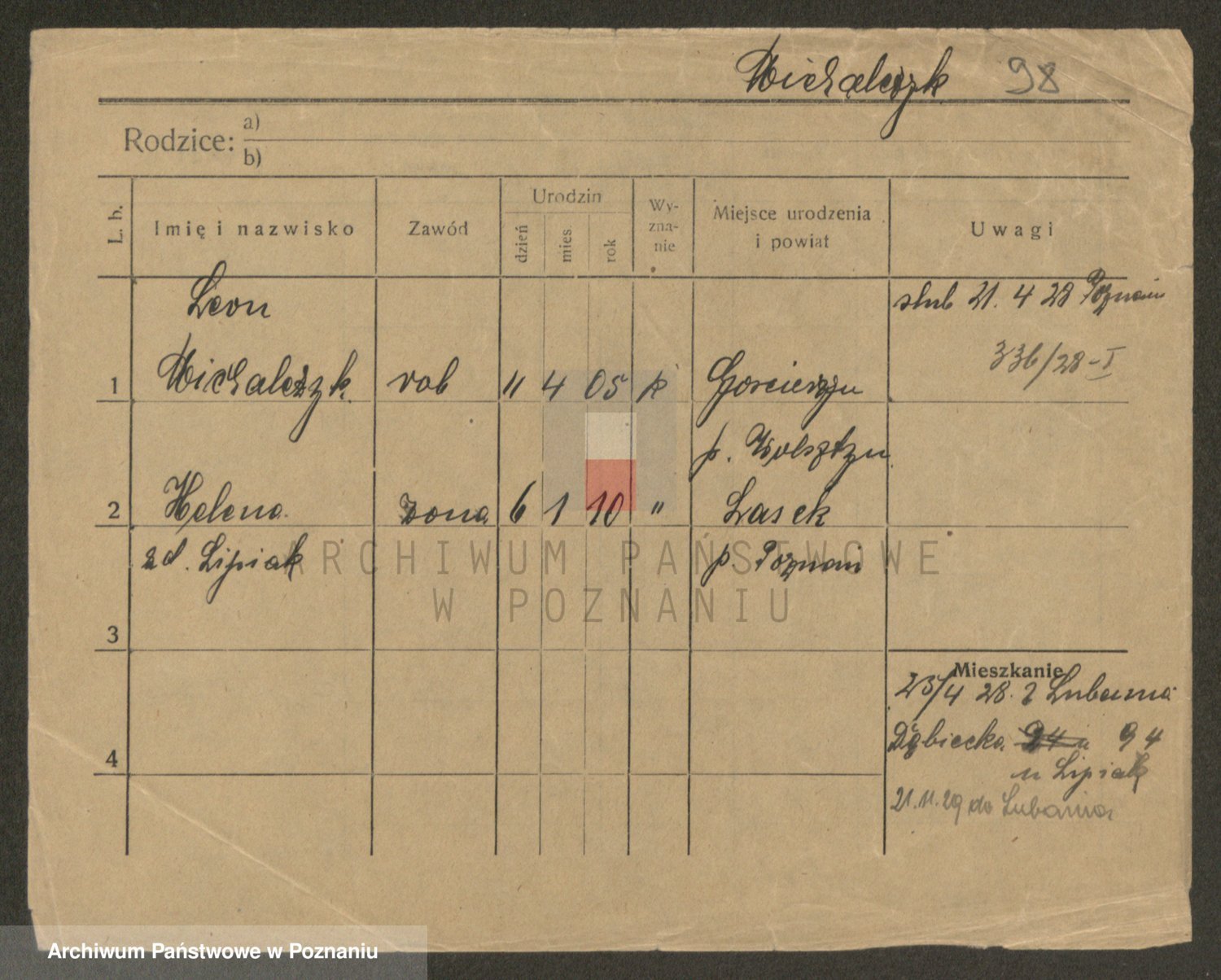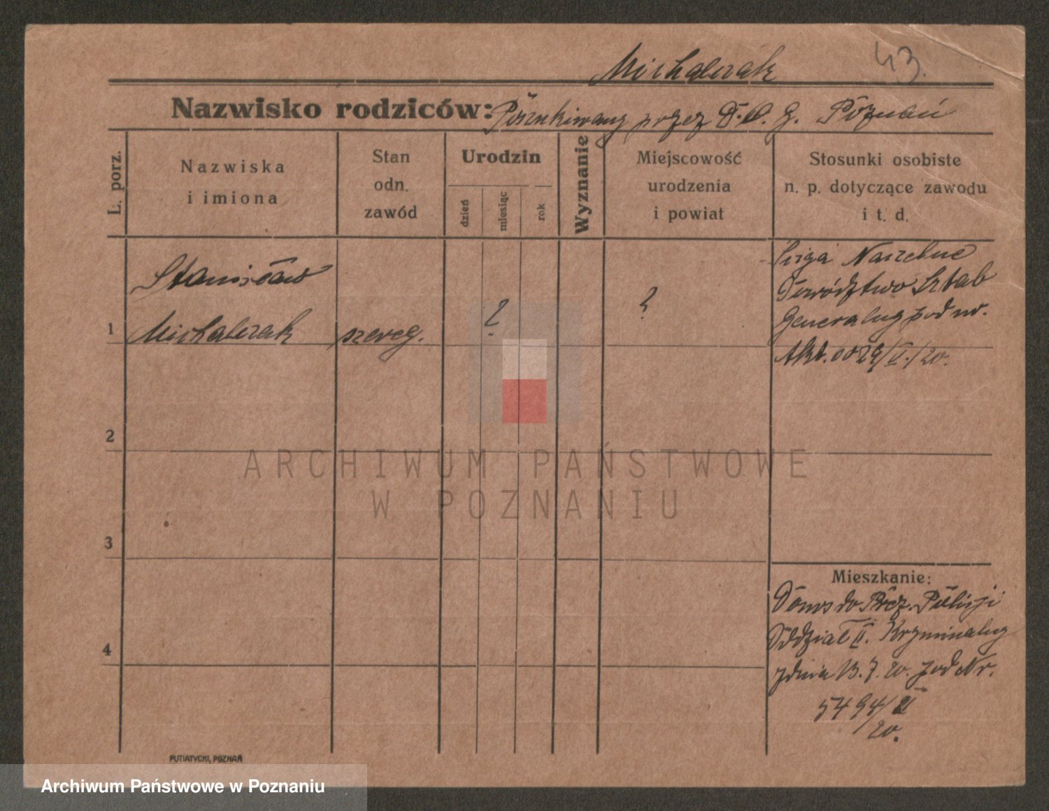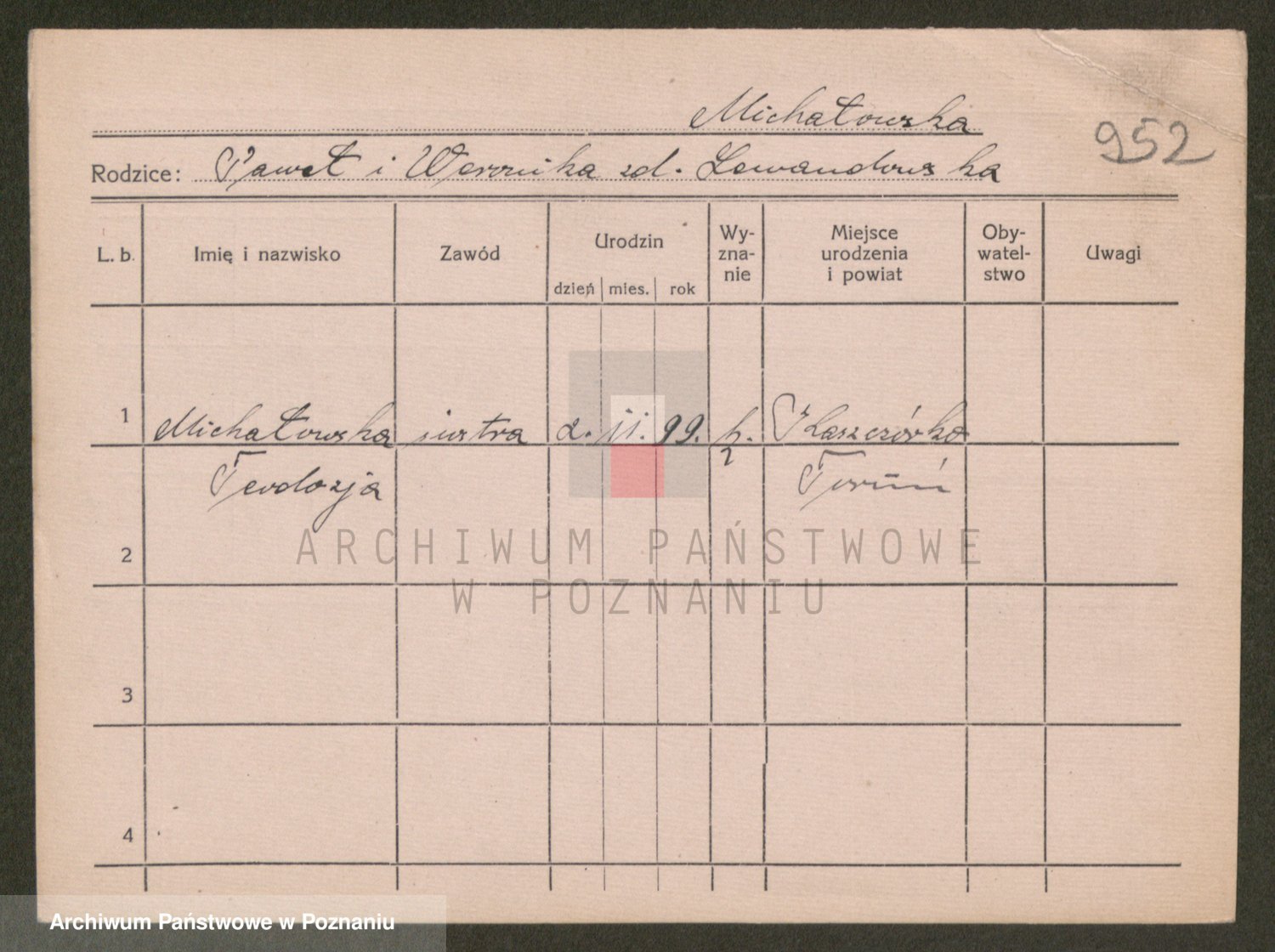 Podgląd karty osobowej dostępny jest po kliknięciu na nazwisko lub ikonkę karty. Można dokonywać powiększenia (ikony na górze) lub przechodzić między kolejnymi skanami (strzałki po bokach).