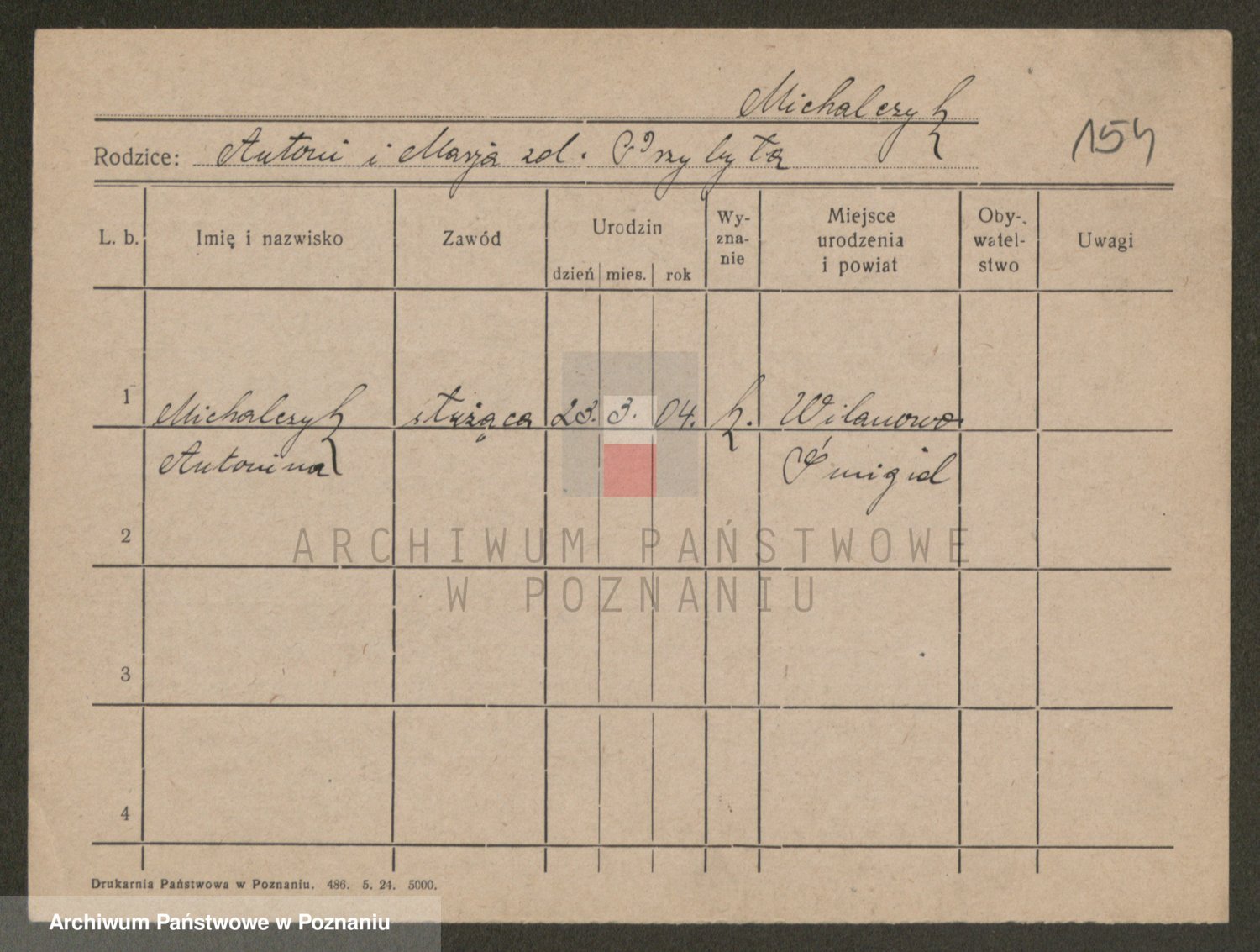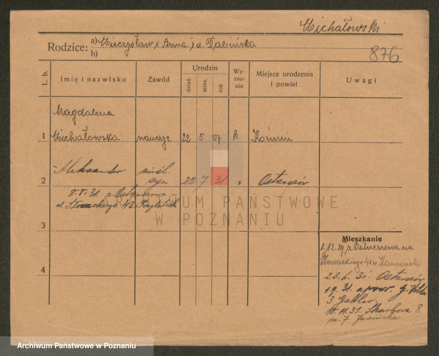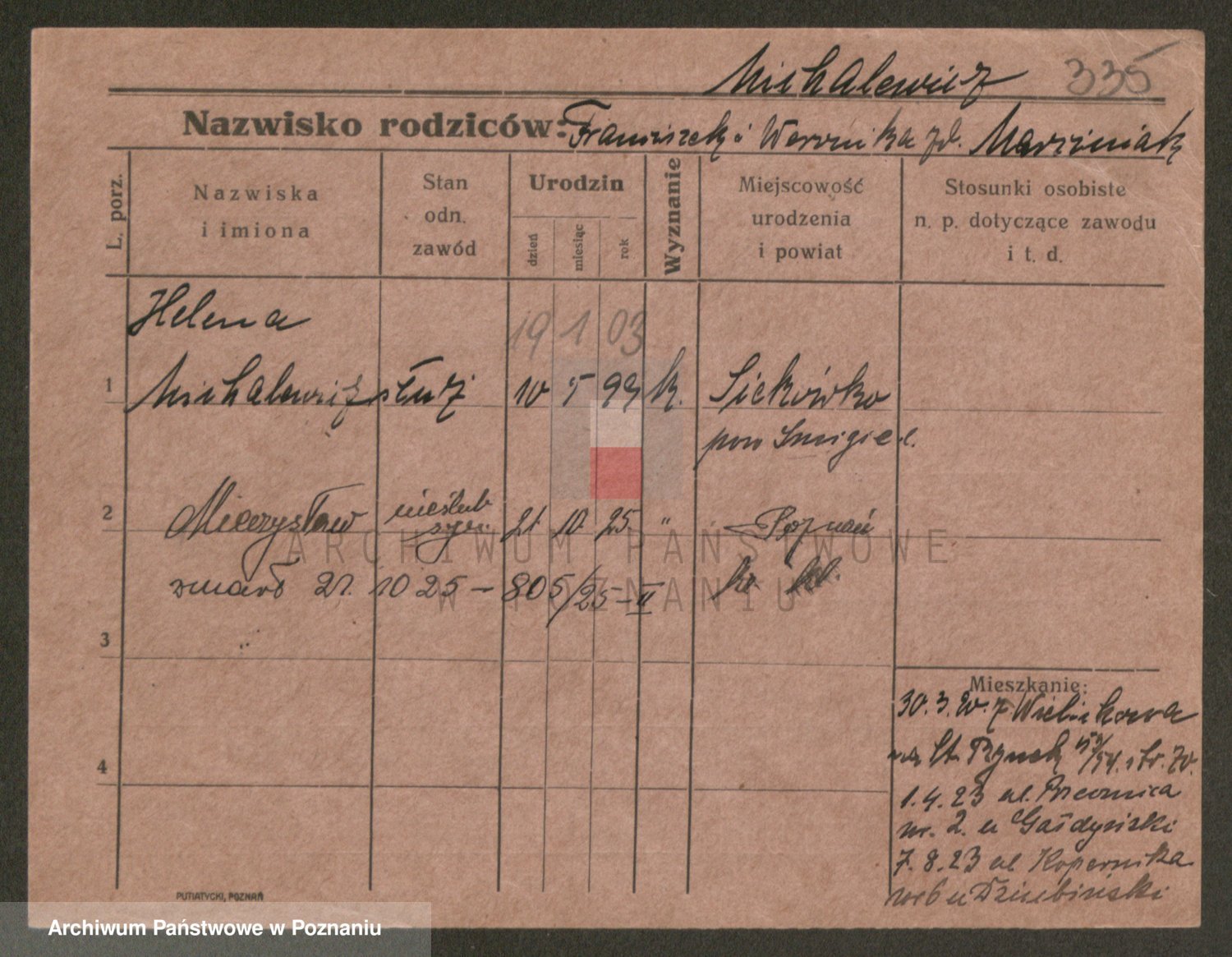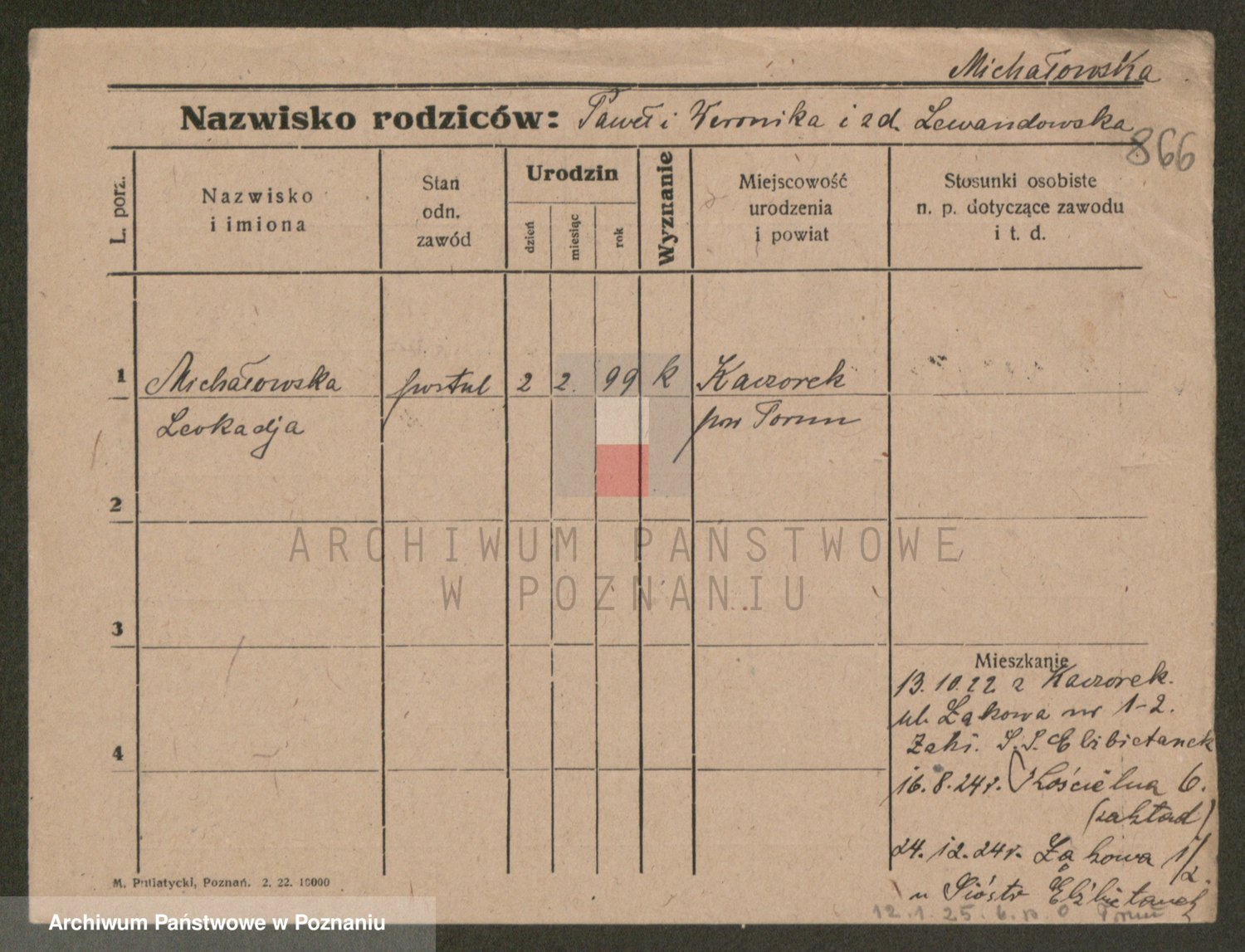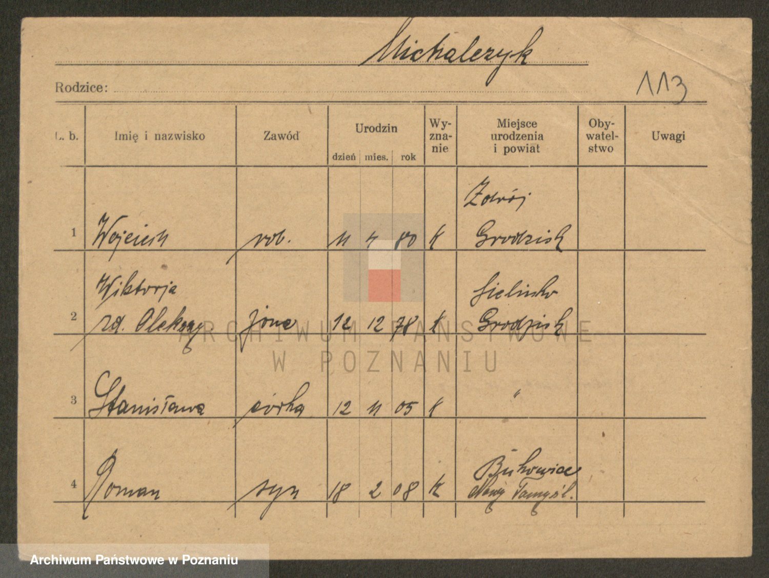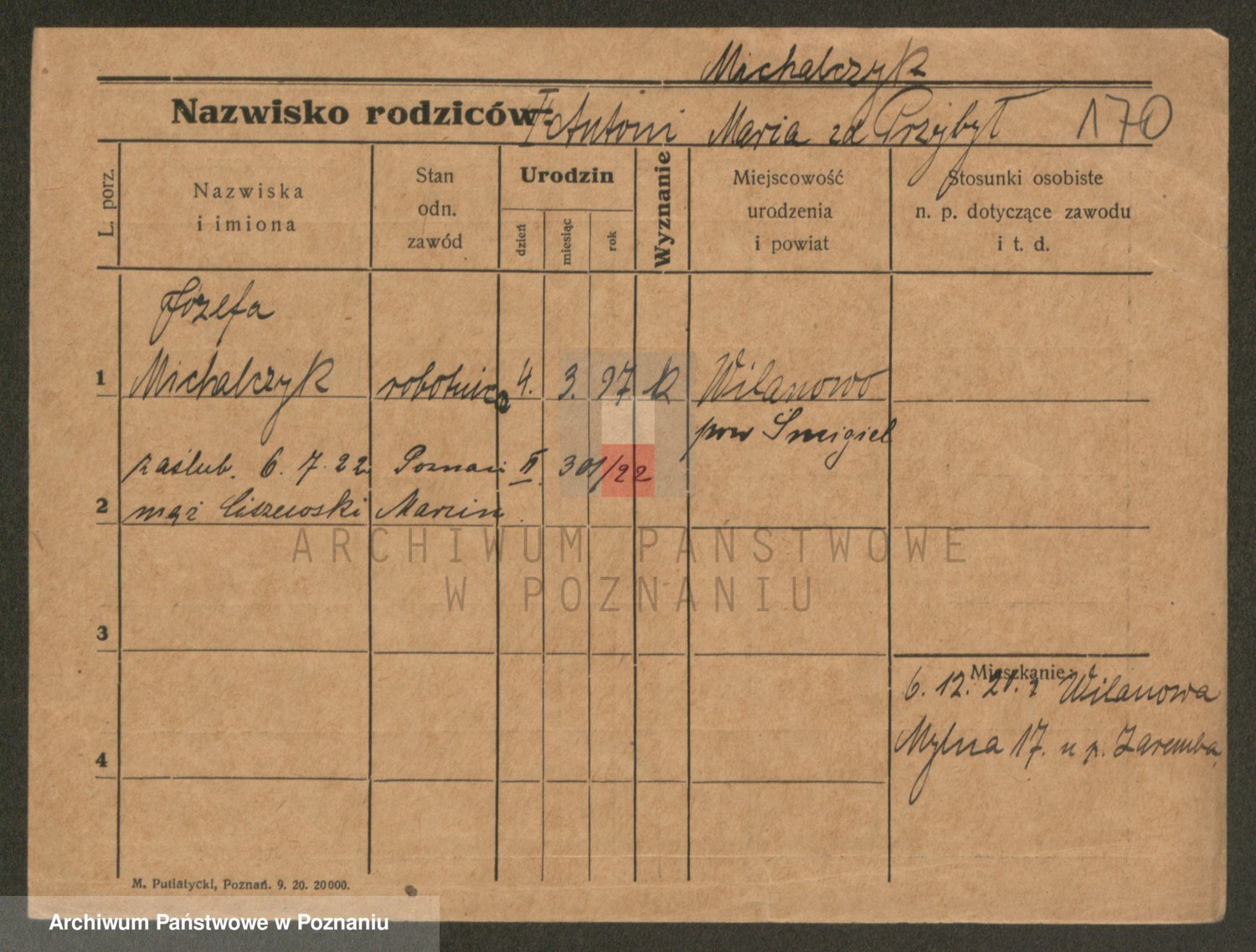 Podgląd karty osobowej dostępny jest po kliknięciu na nazwisko lub ikonkę karty. Można dokonywać powiększenia (ikony na górze) lub przechodzić między kolejnymi skanami (strzałki po bokach).