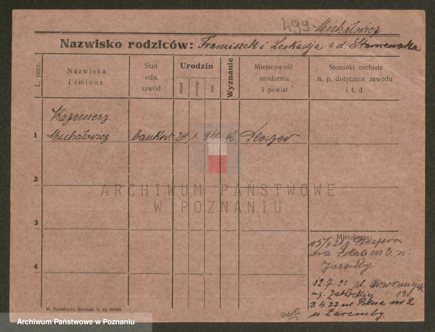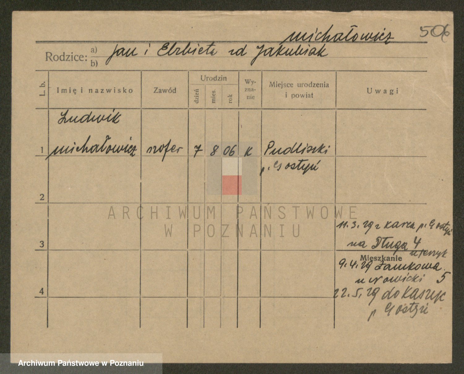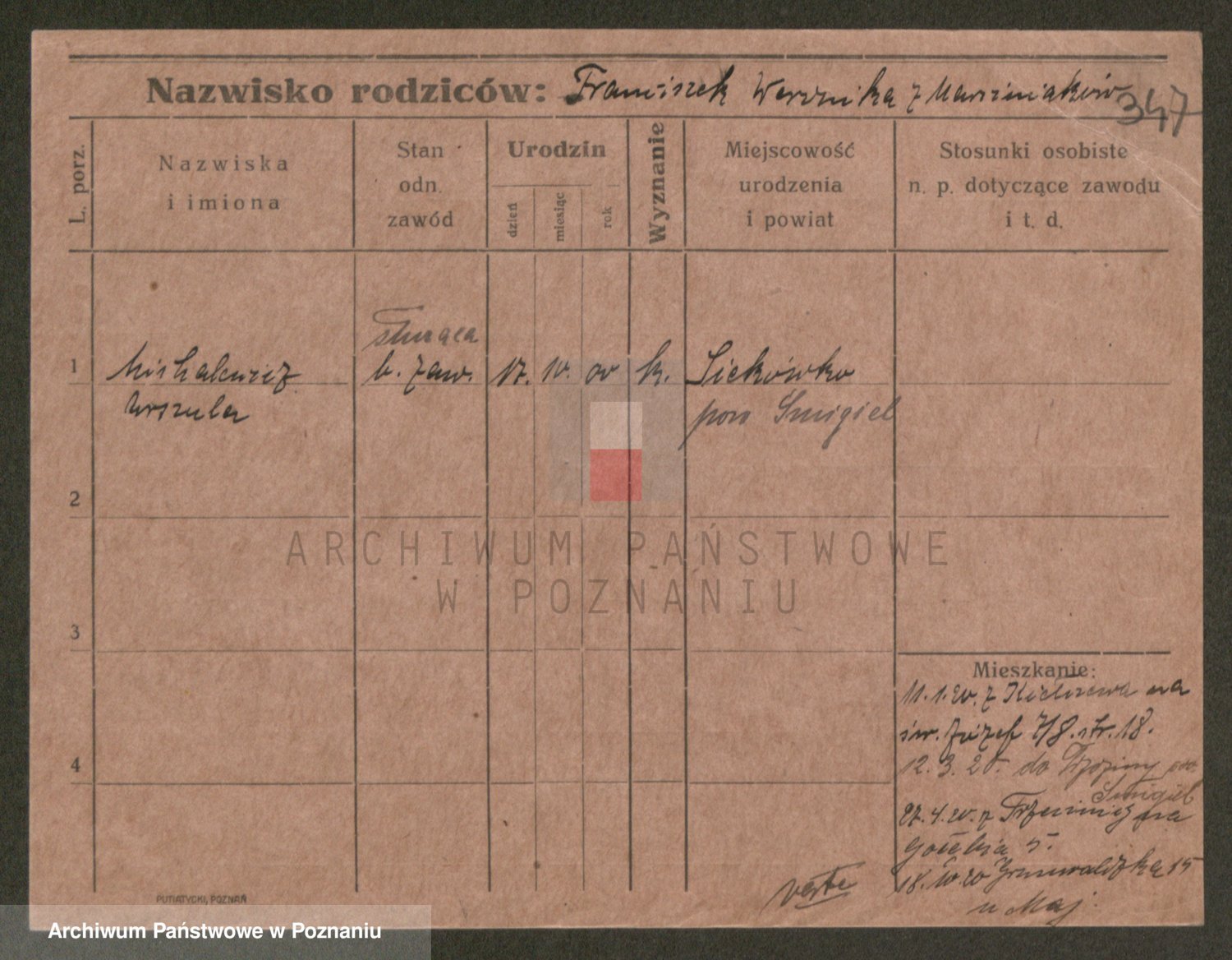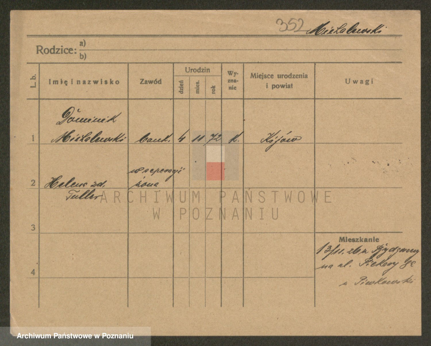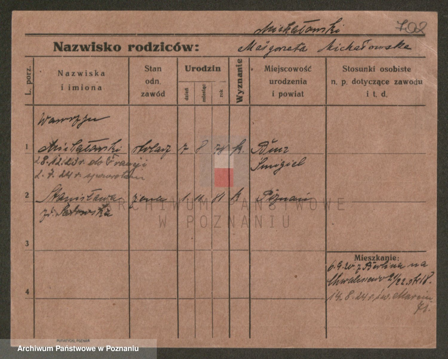 Podgląd karty osobowej dostępny jest po kliknięciu na nazwisko lub ikonkę karty. Można dokonywać powiększenia (ikony na górze) lub przechodzić między kolejnymi skanami (strzałki po bokach).