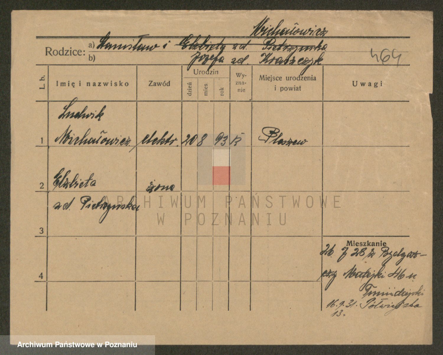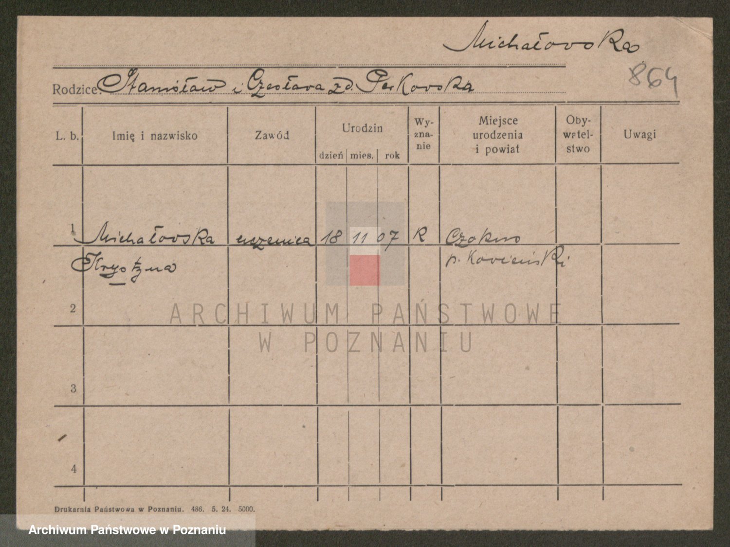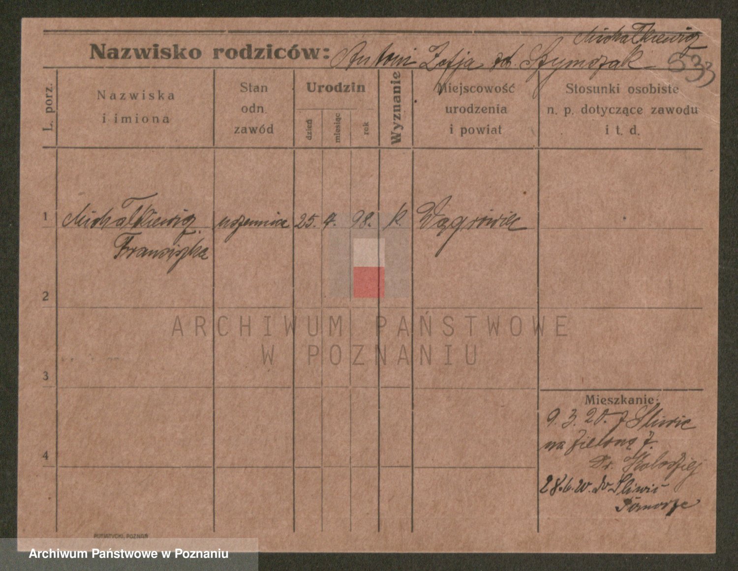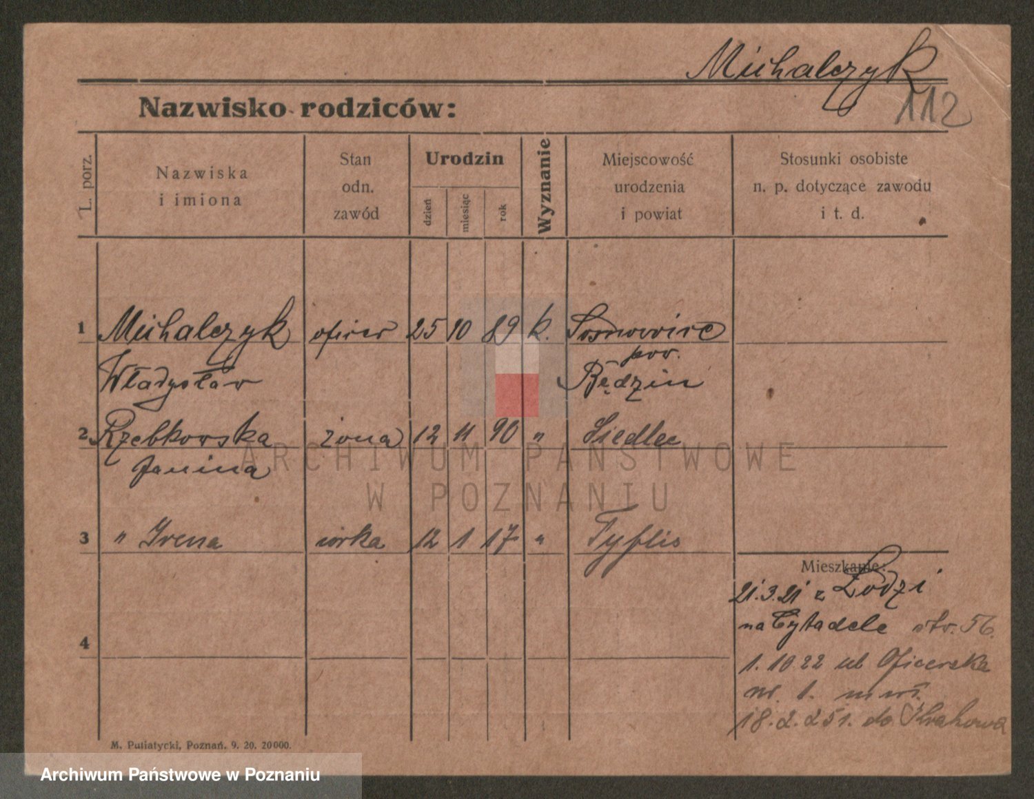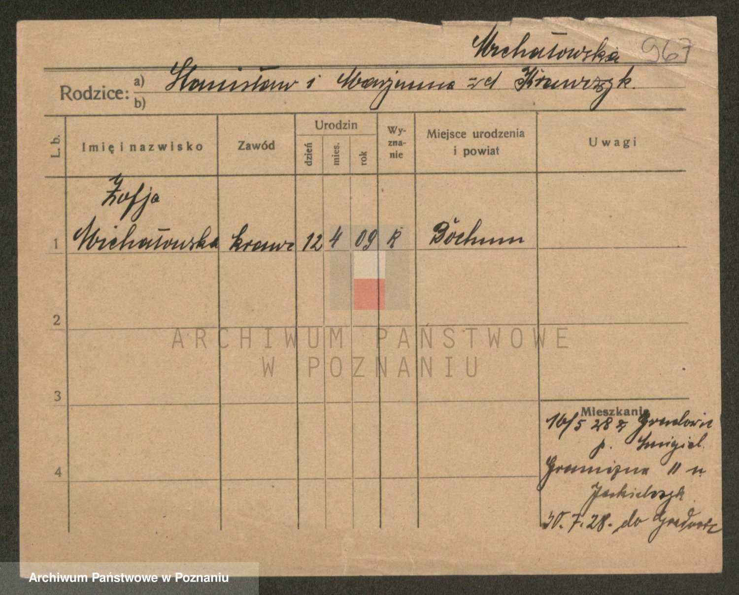 Podgląd karty osobowej dostępny jest po kliknięciu na nazwisko lub ikonkę karty. Można dokonywać powiększenia (ikony na górze) lub przechodzić między kolejnymi skanami (strzałki po bokach).