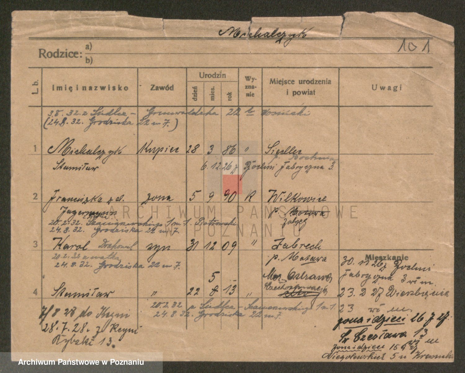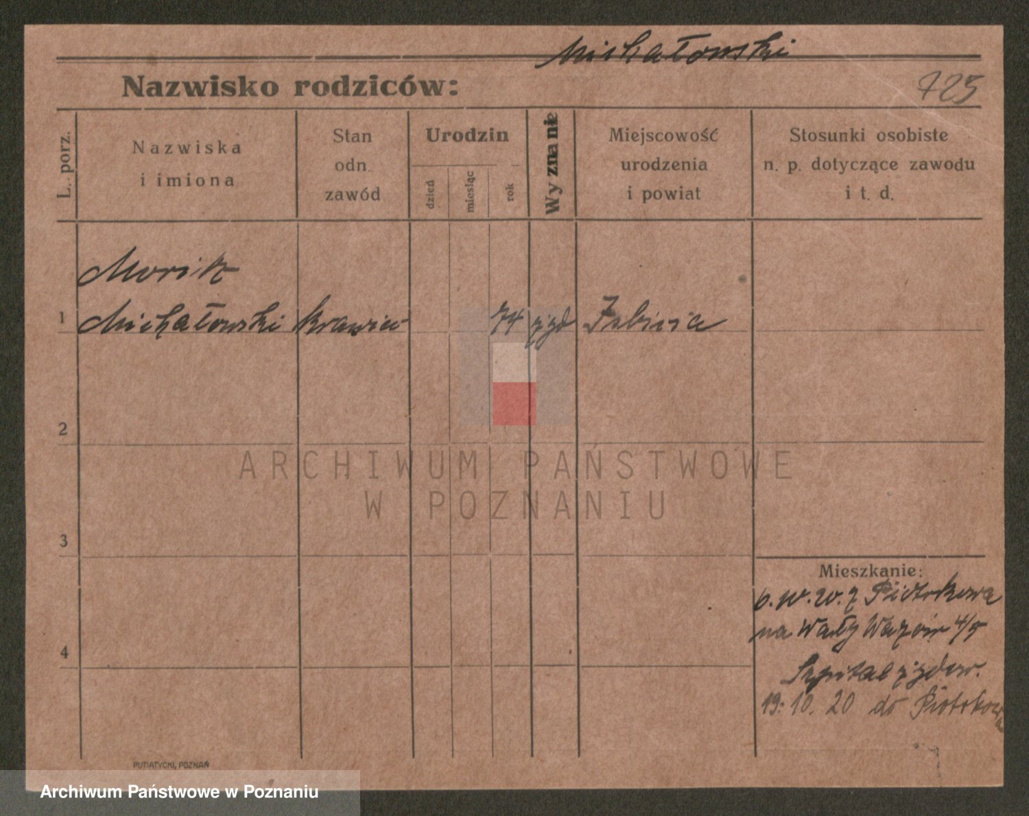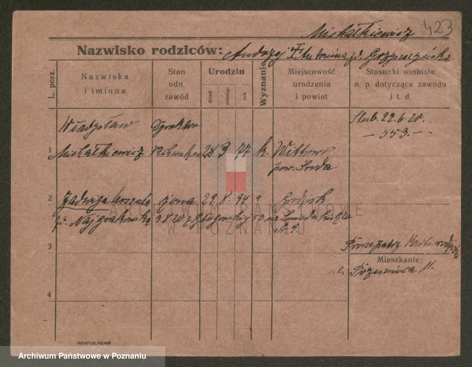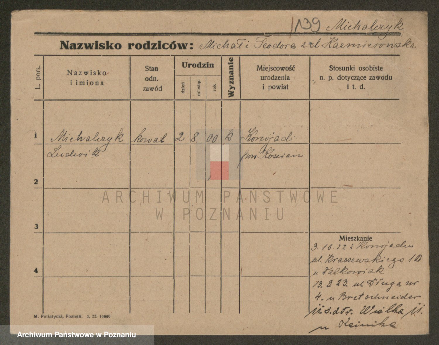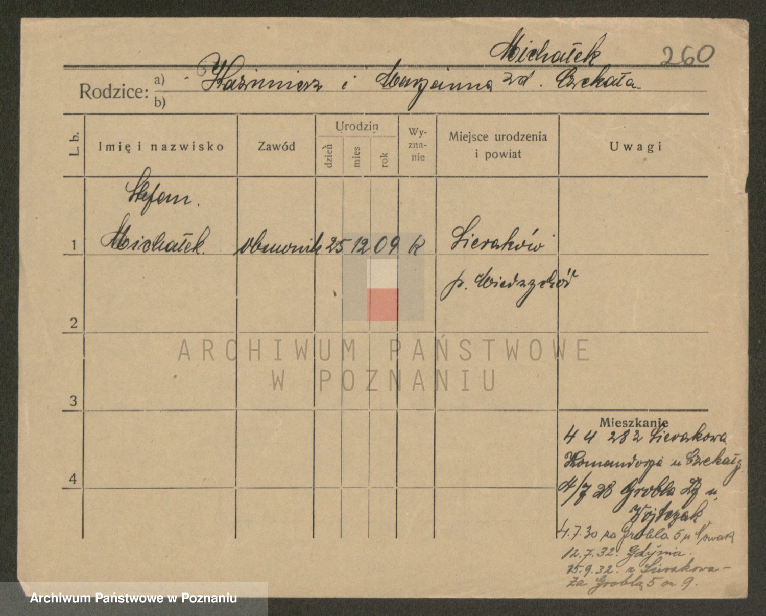 Podgląd karty osobowej dostępny jest po kliknięciu na nazwisko lub ikonkę karty. Można dokonywać powiększenia (ikony na górze) lub przechodzić między kolejnymi skanami (strzałki po bokach).