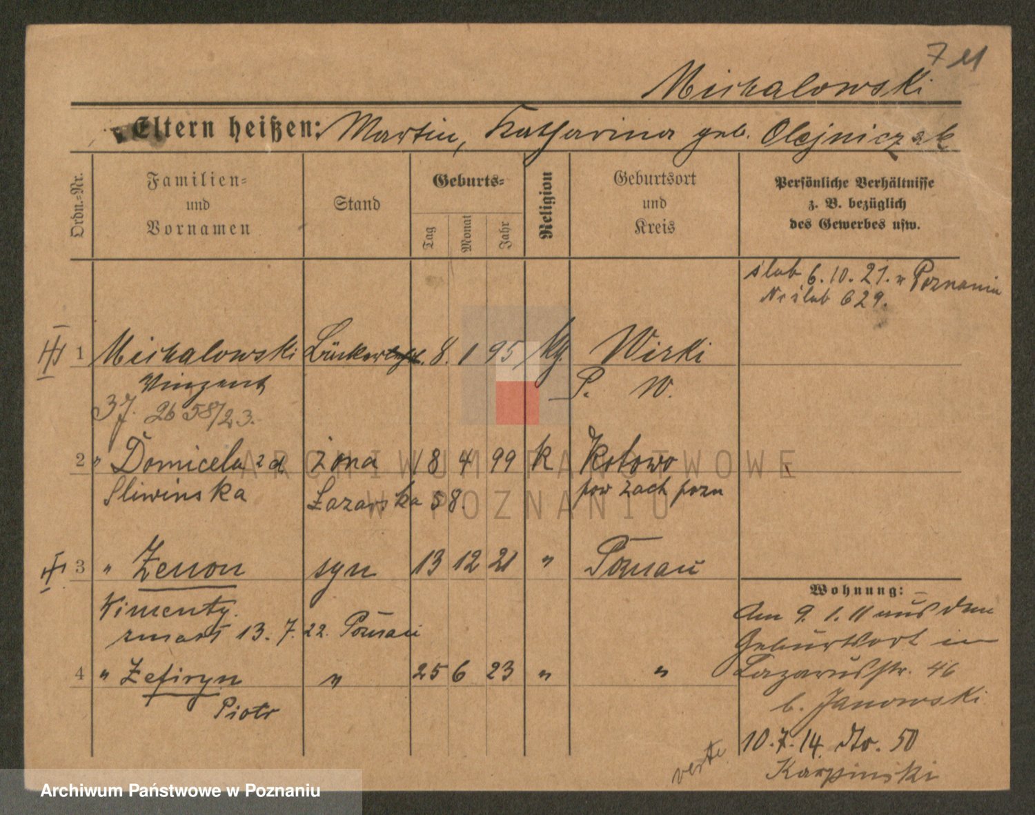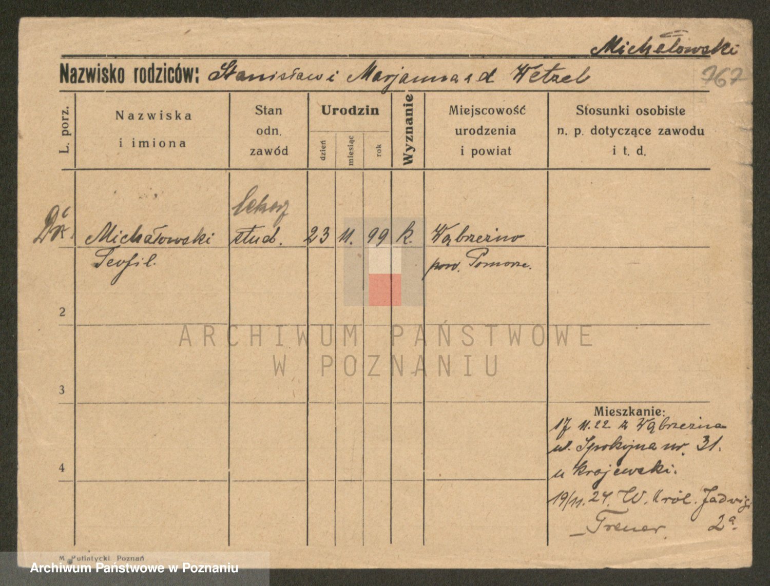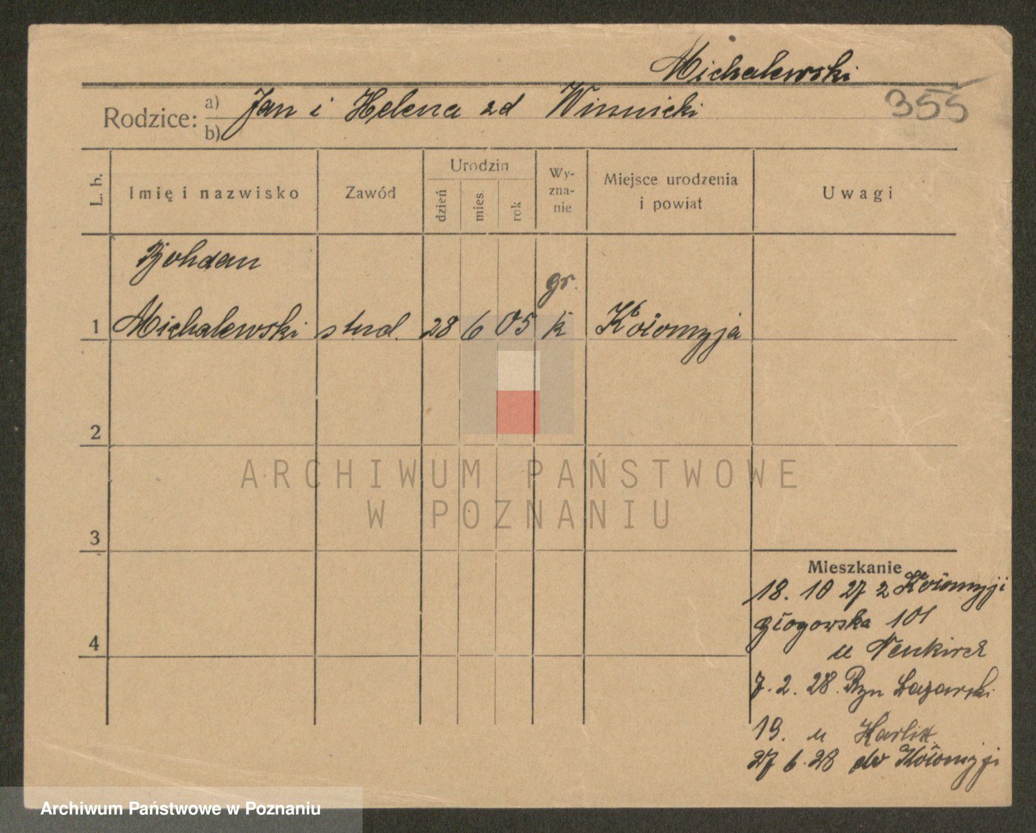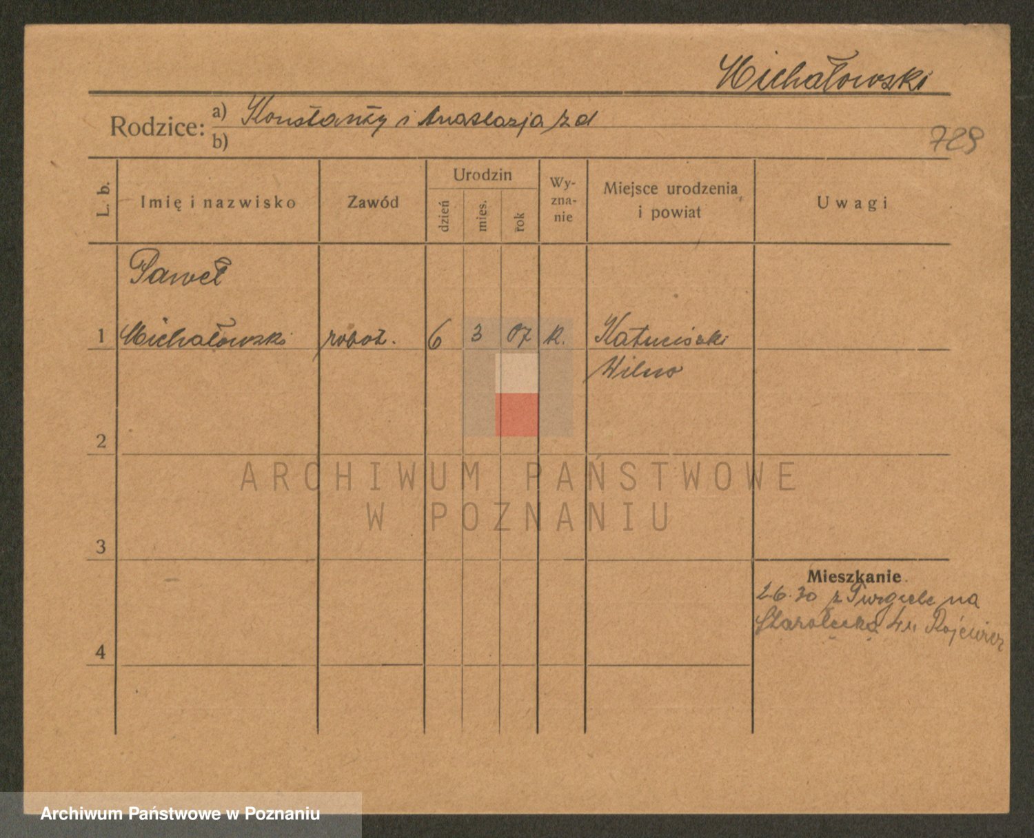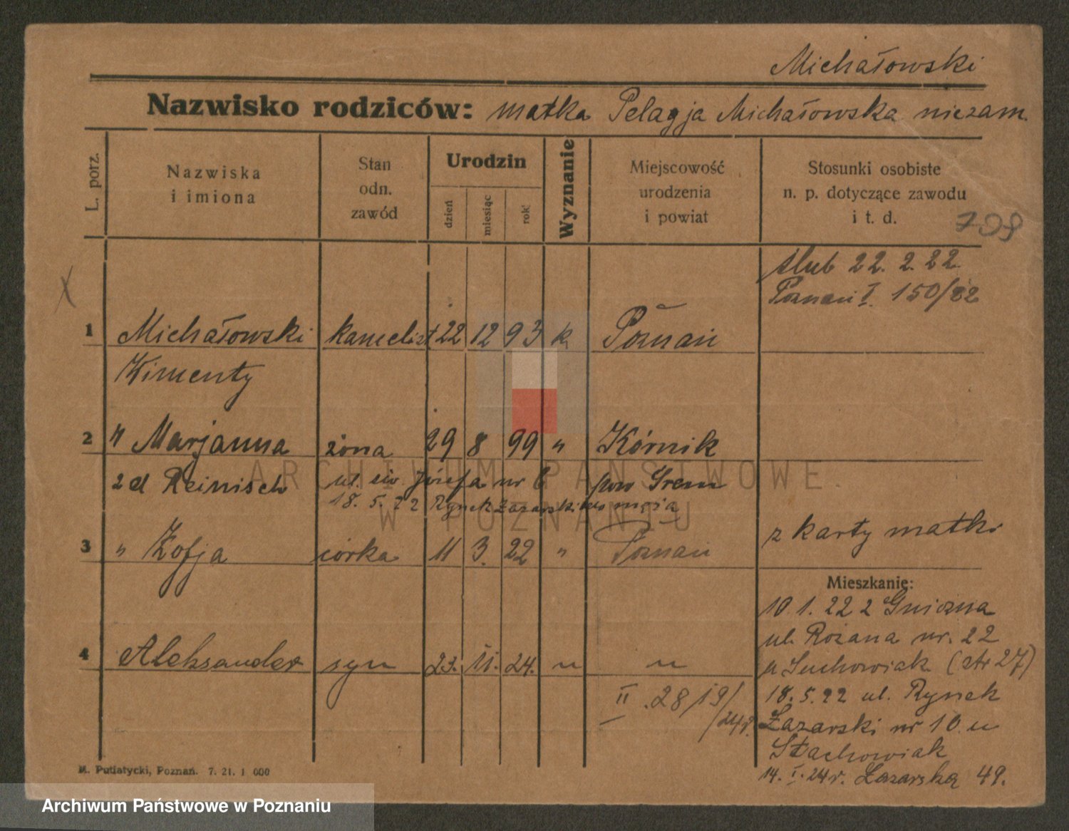 Podgląd karty osobowej dostępny jest po kliknięciu na nazwisko lub ikonkę karty. Można dokonywać powiększenia (ikony na górze) lub przechodzić między kolejnymi skanami (strzałki po bokach).
