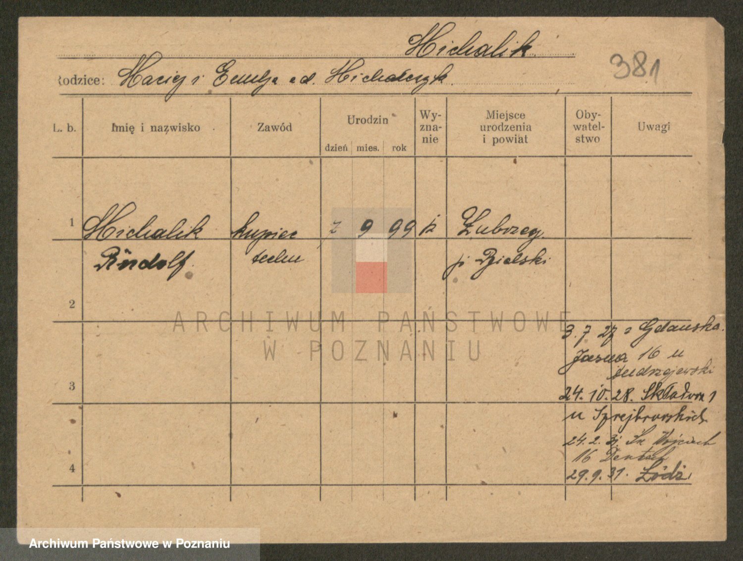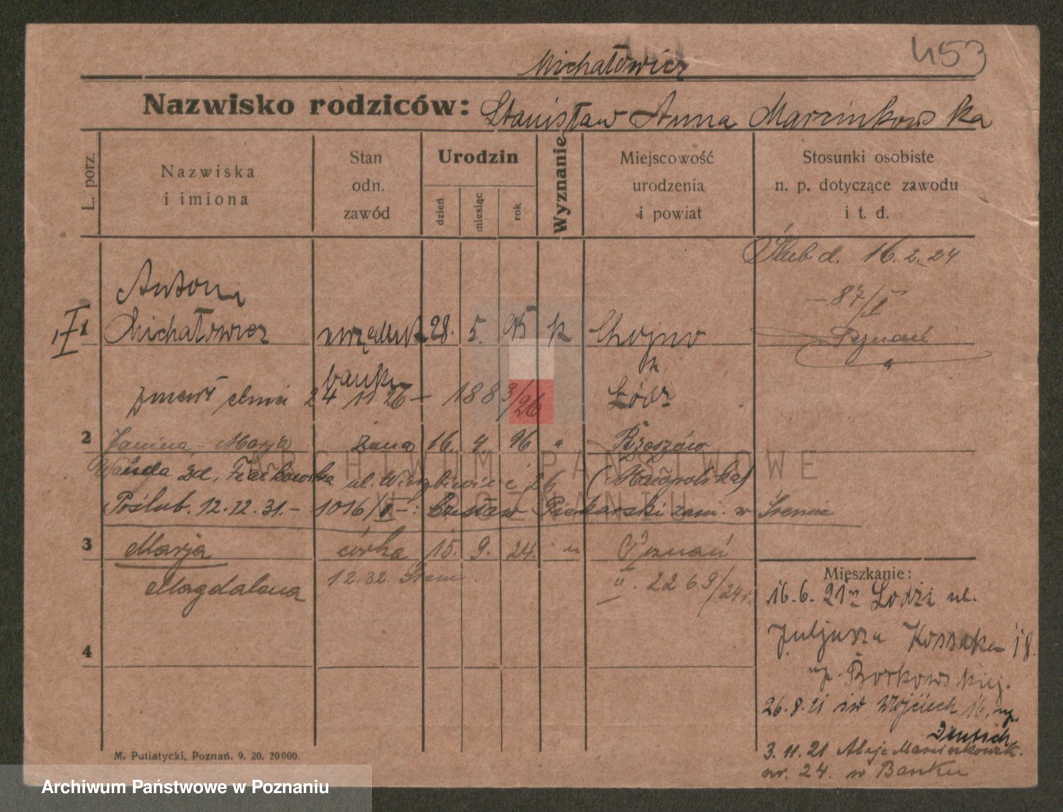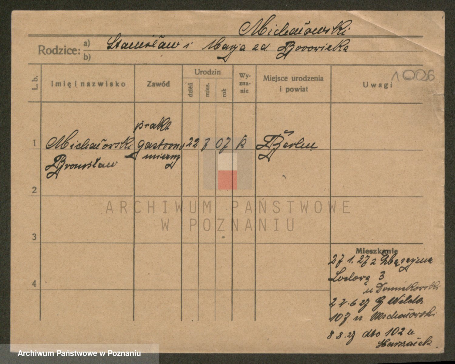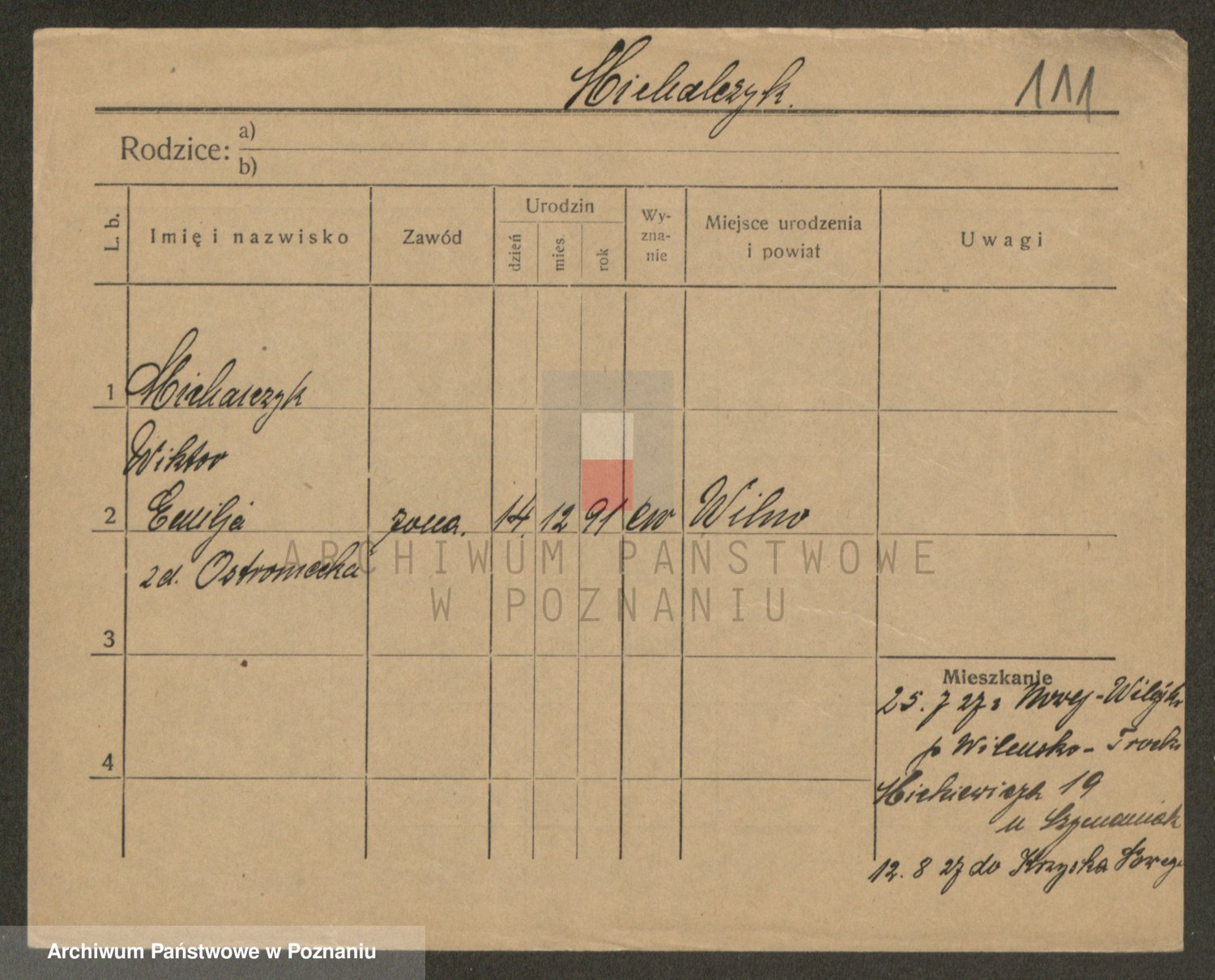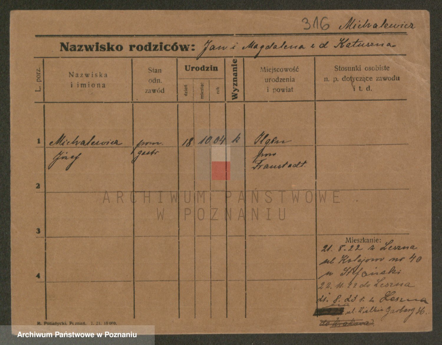 Podgląd karty osobowej dostępny jest po kliknięciu na nazwisko lub ikonkę karty. Można dokonywać powiększenia (ikony na górze) lub przechodzić między kolejnymi skanami (strzałki po bokach).