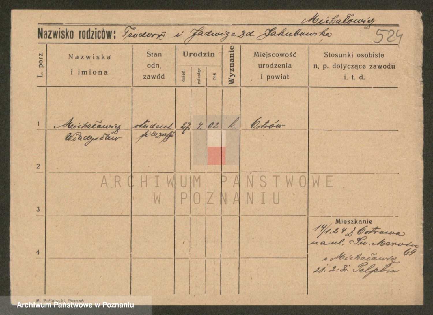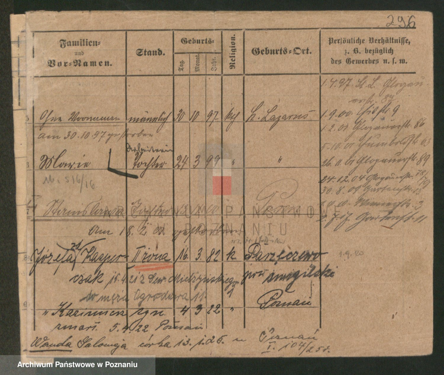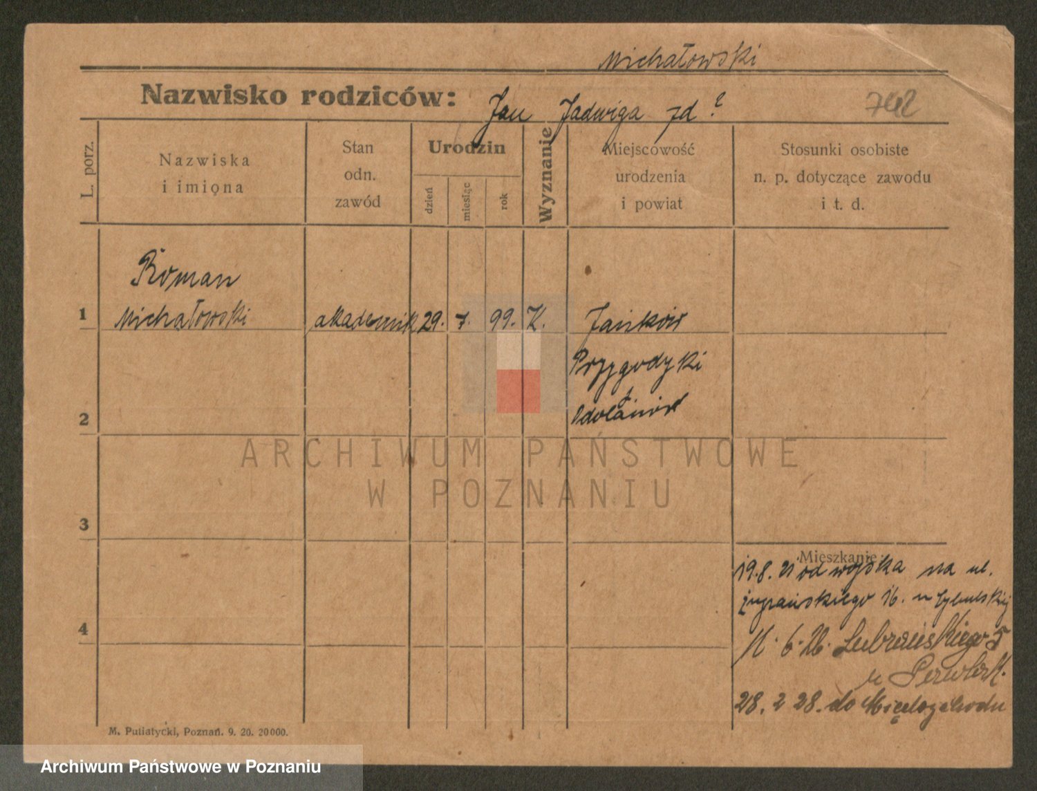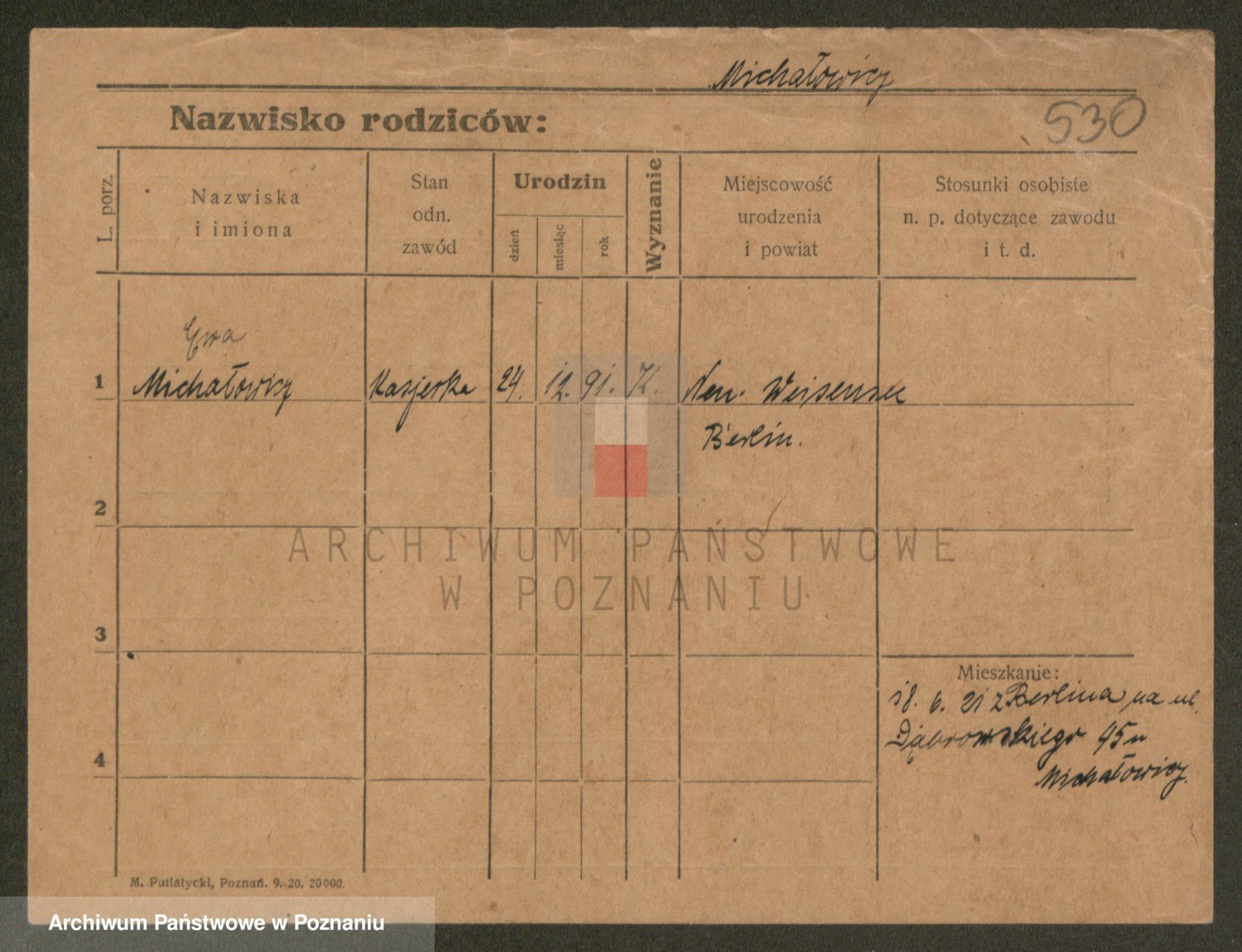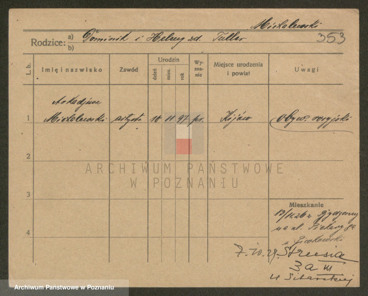 Podgląd karty osobowej dostępny jest po kliknięciu na nazwisko lub ikonkę karty. Można dokonywać powiększenia (ikony na górze) lub przechodzić między kolejnymi skanami (strzałki po bokach).
