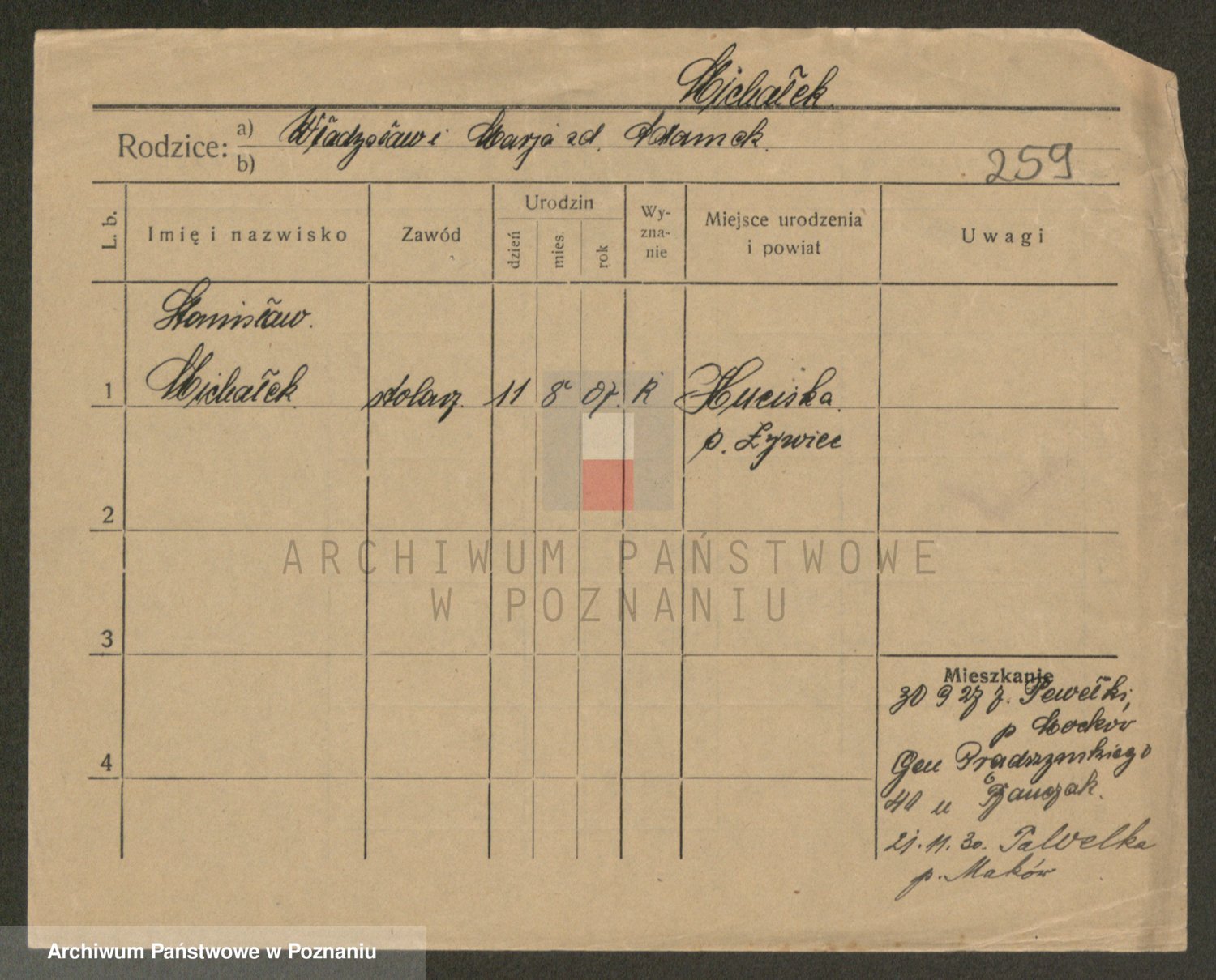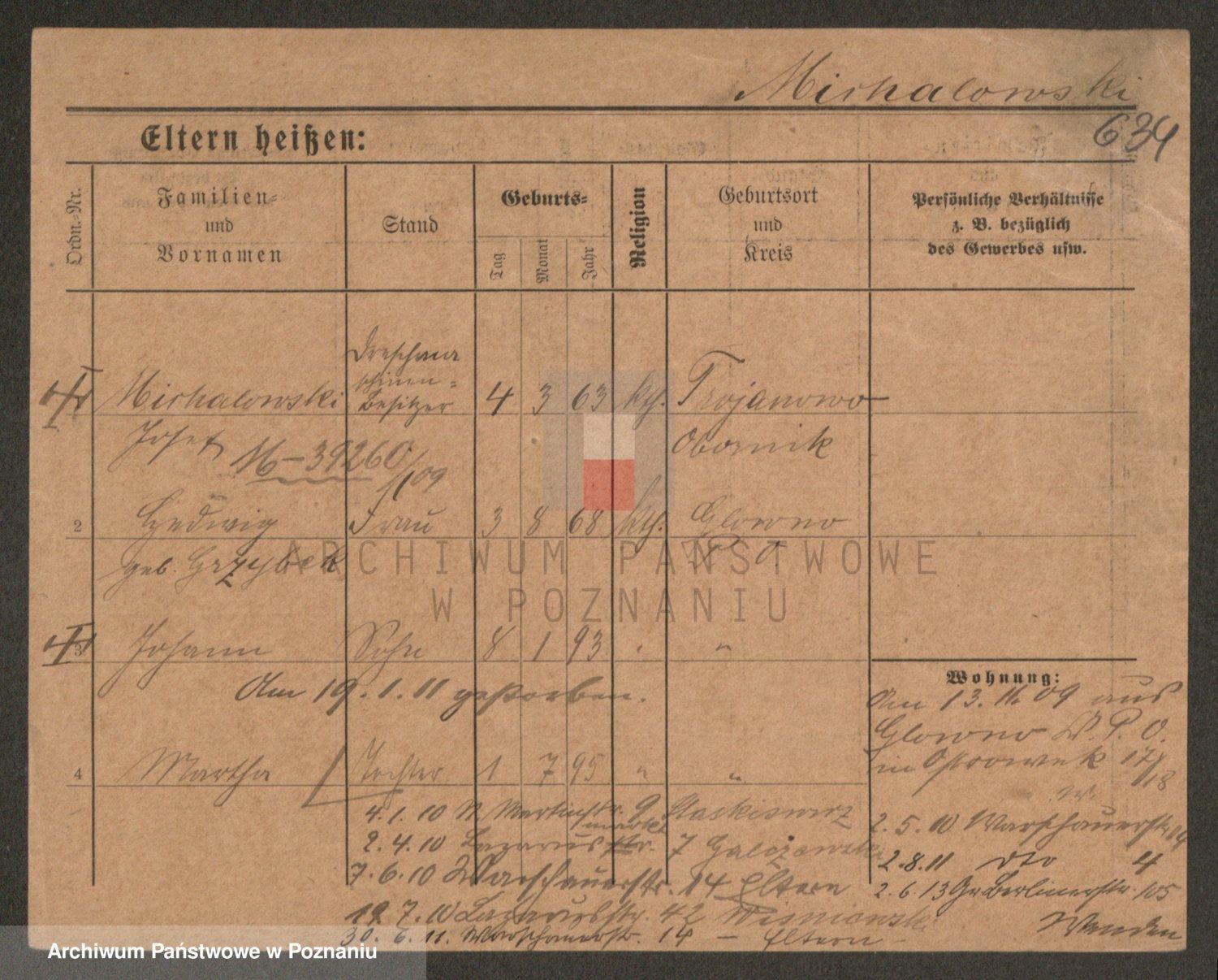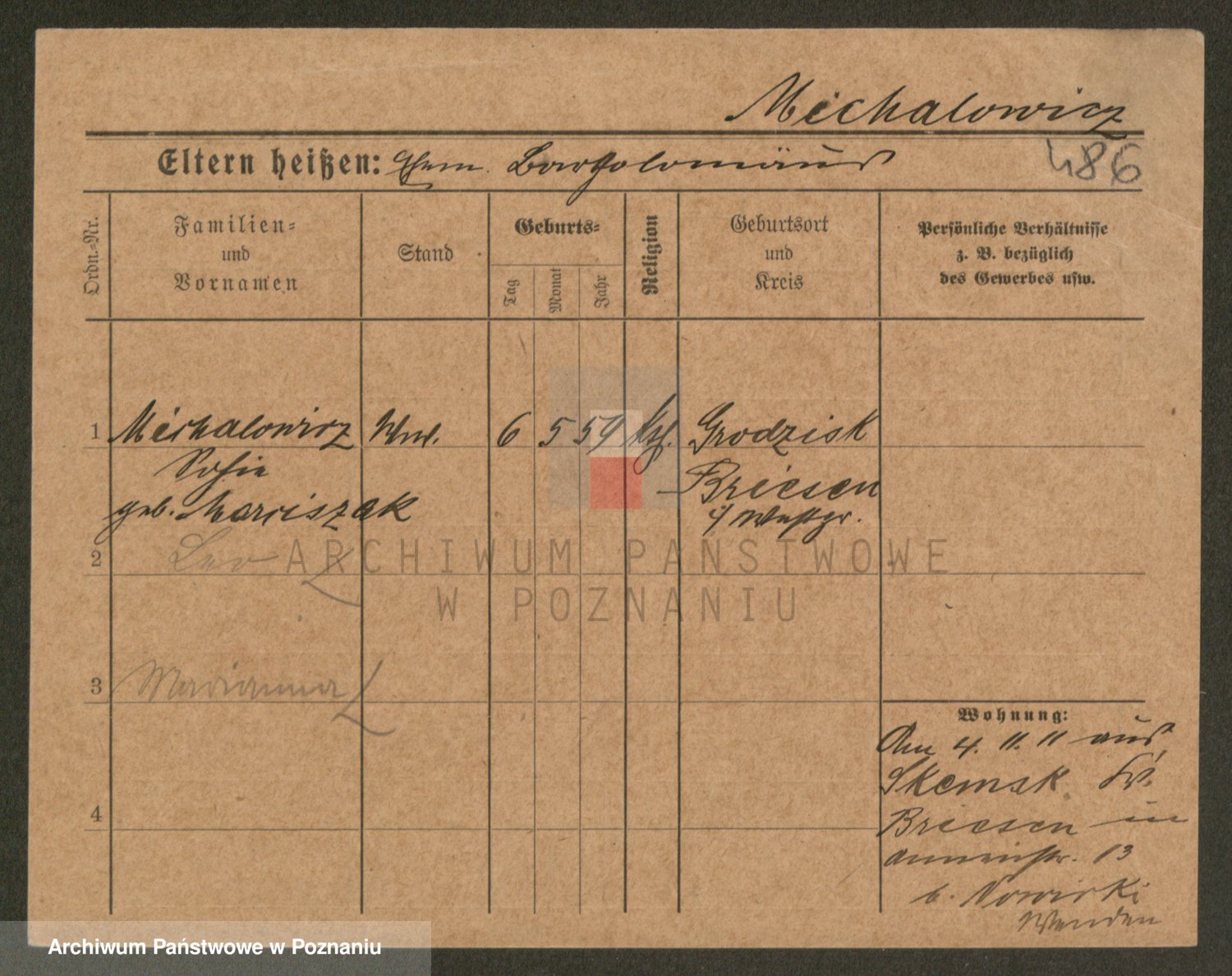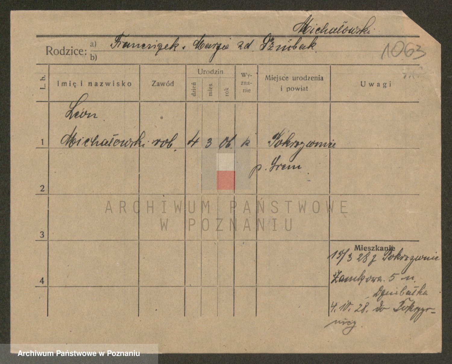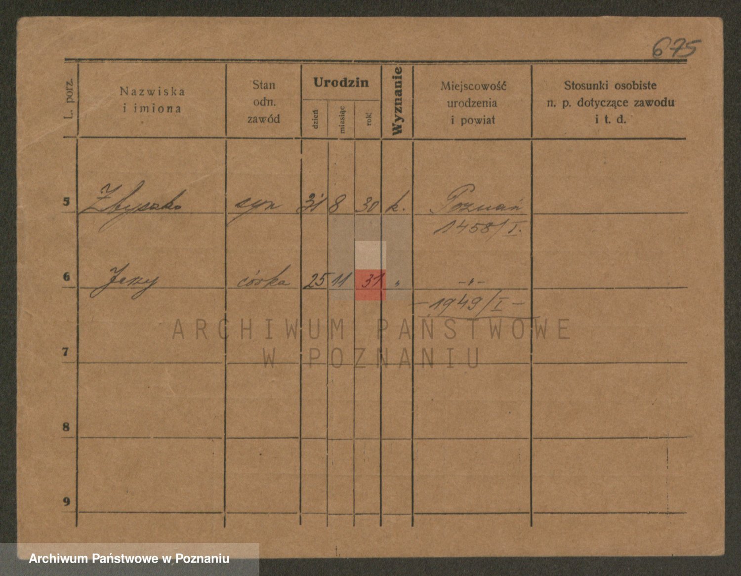 Podgląd karty osobowej dostępny jest po kliknięciu na nazwisko lub ikonkę karty. Można dokonywać powiększenia (ikony na górze) lub przechodzić między kolejnymi skanami (strzałki po bokach).