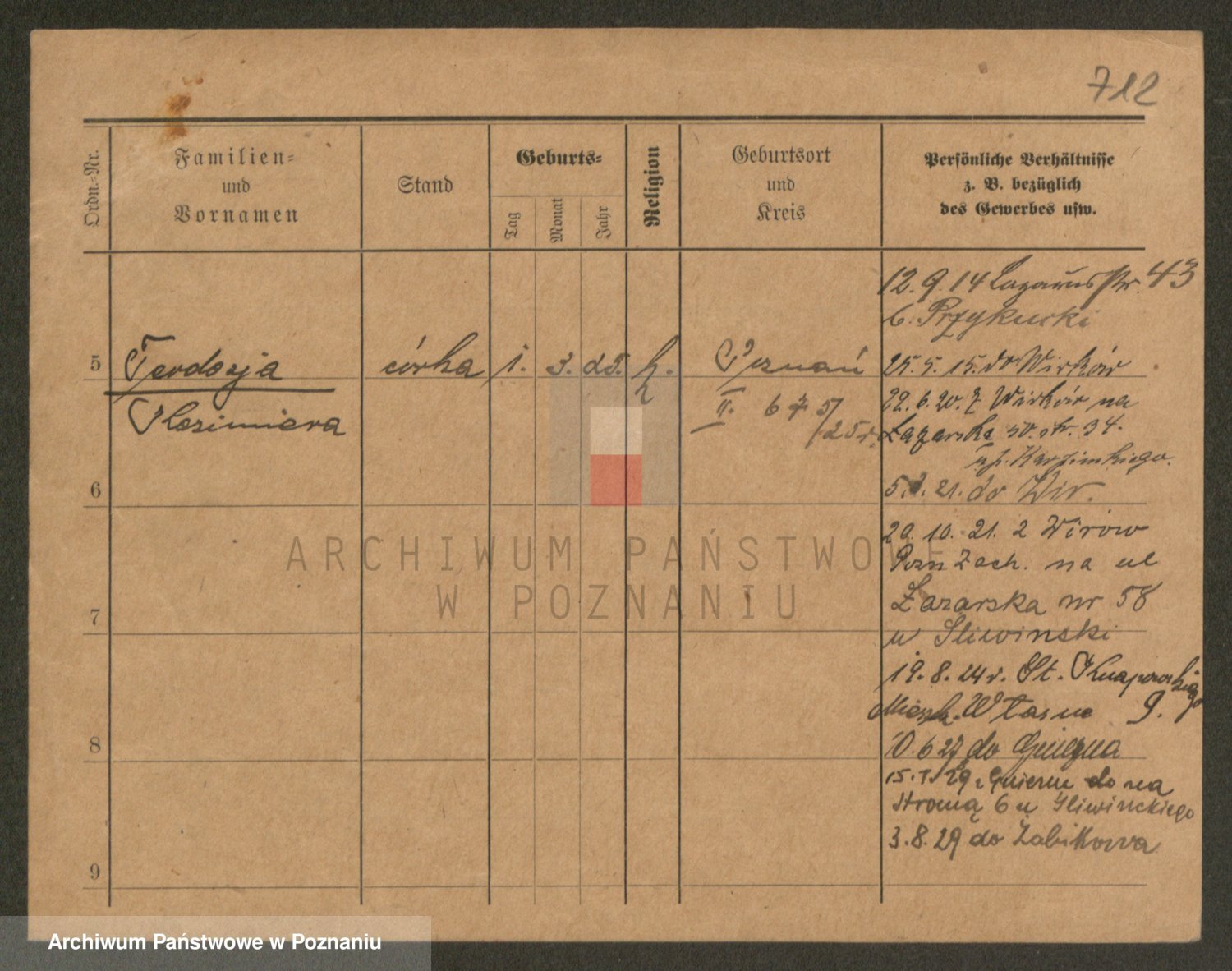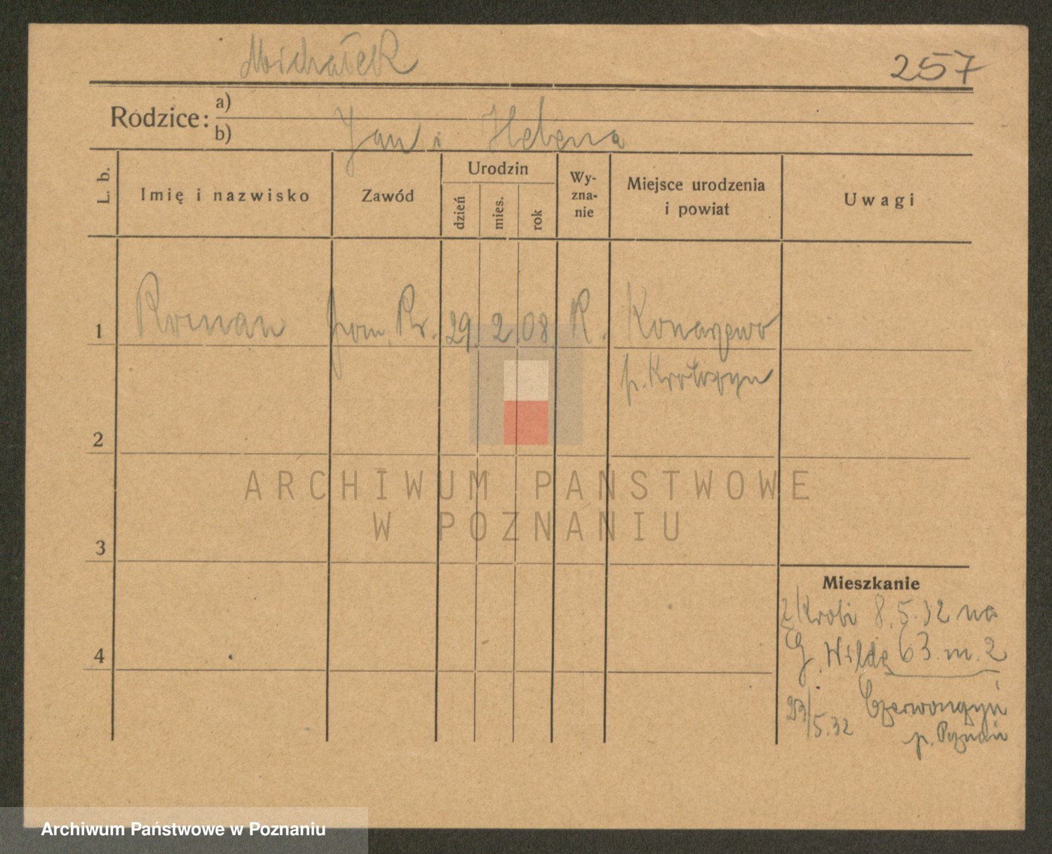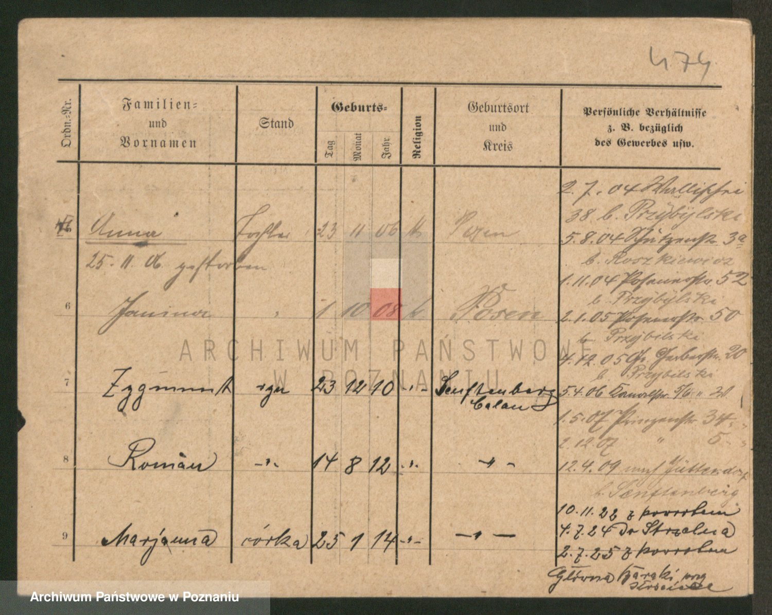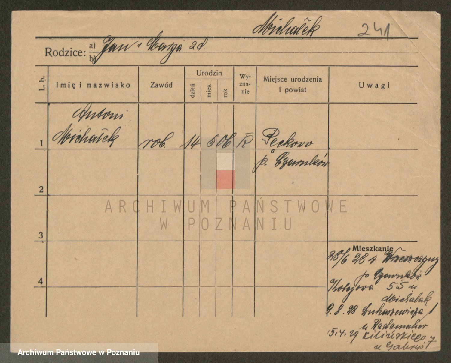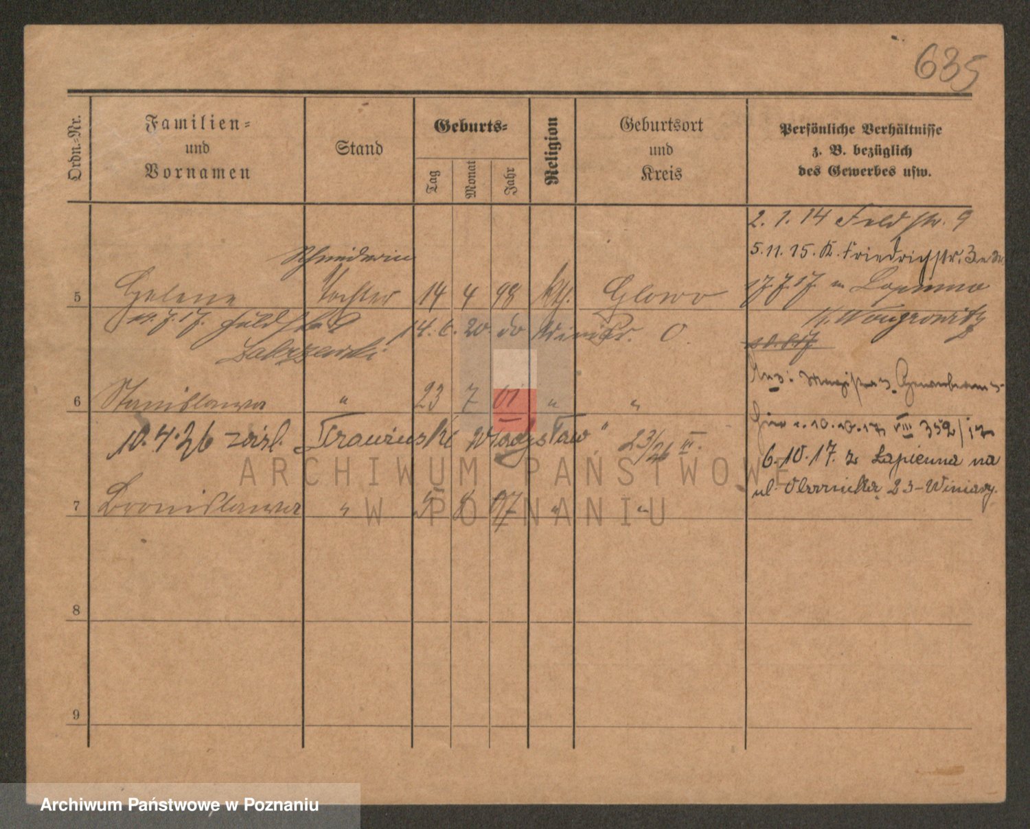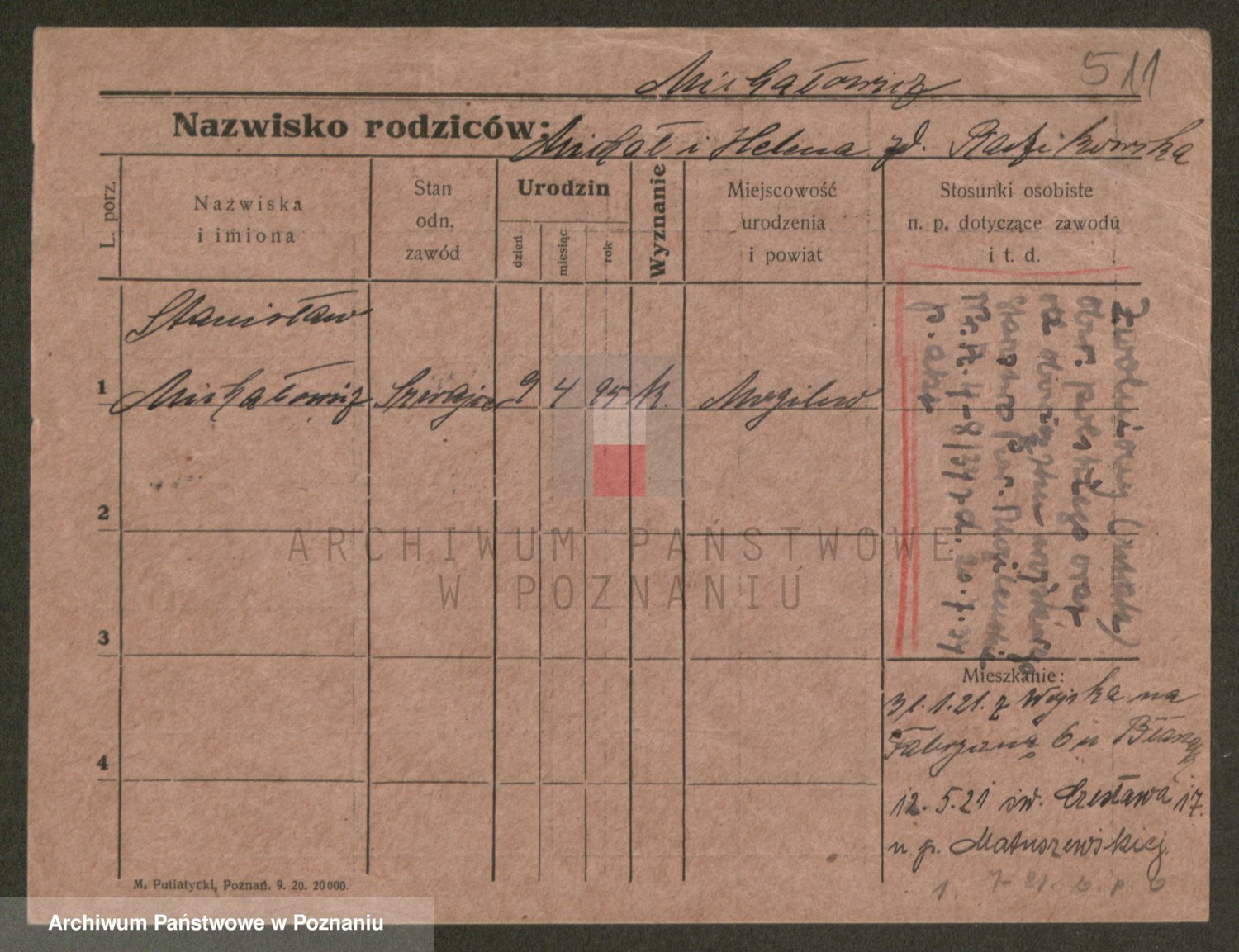 Podgląd karty osobowej dostępny jest po kliknięciu na nazwisko lub ikonkę karty. Można dokonywać powiększenia (ikony na górze) lub przechodzić między kolejnymi skanami (strzałki po bokach).