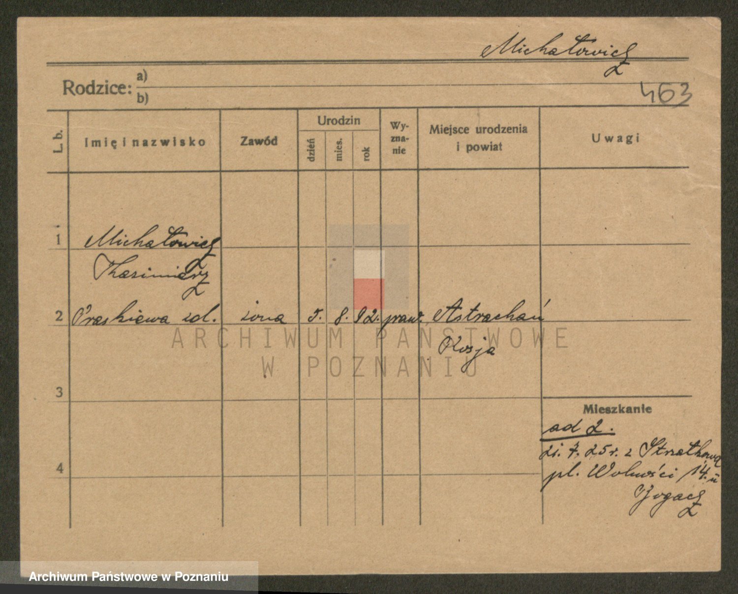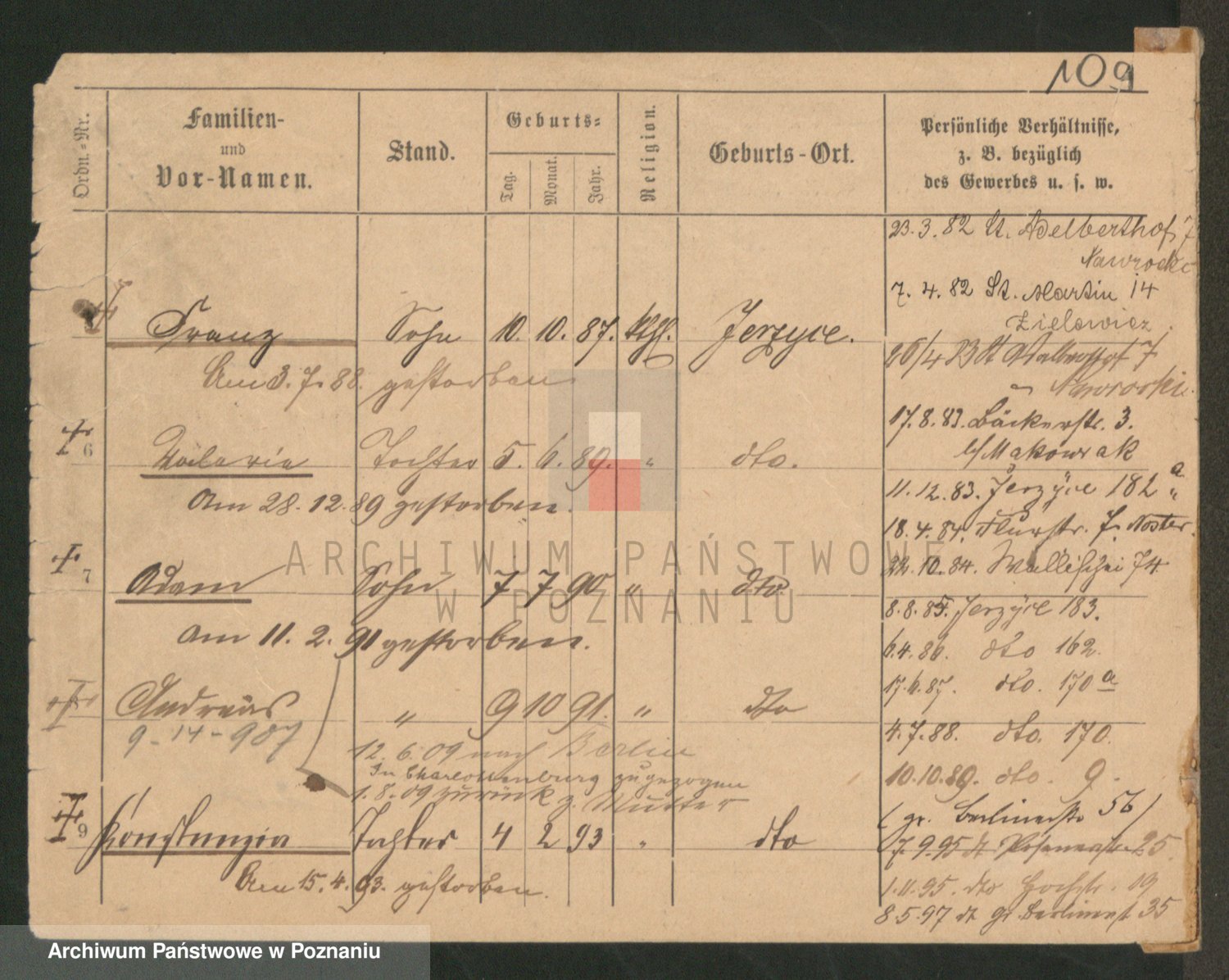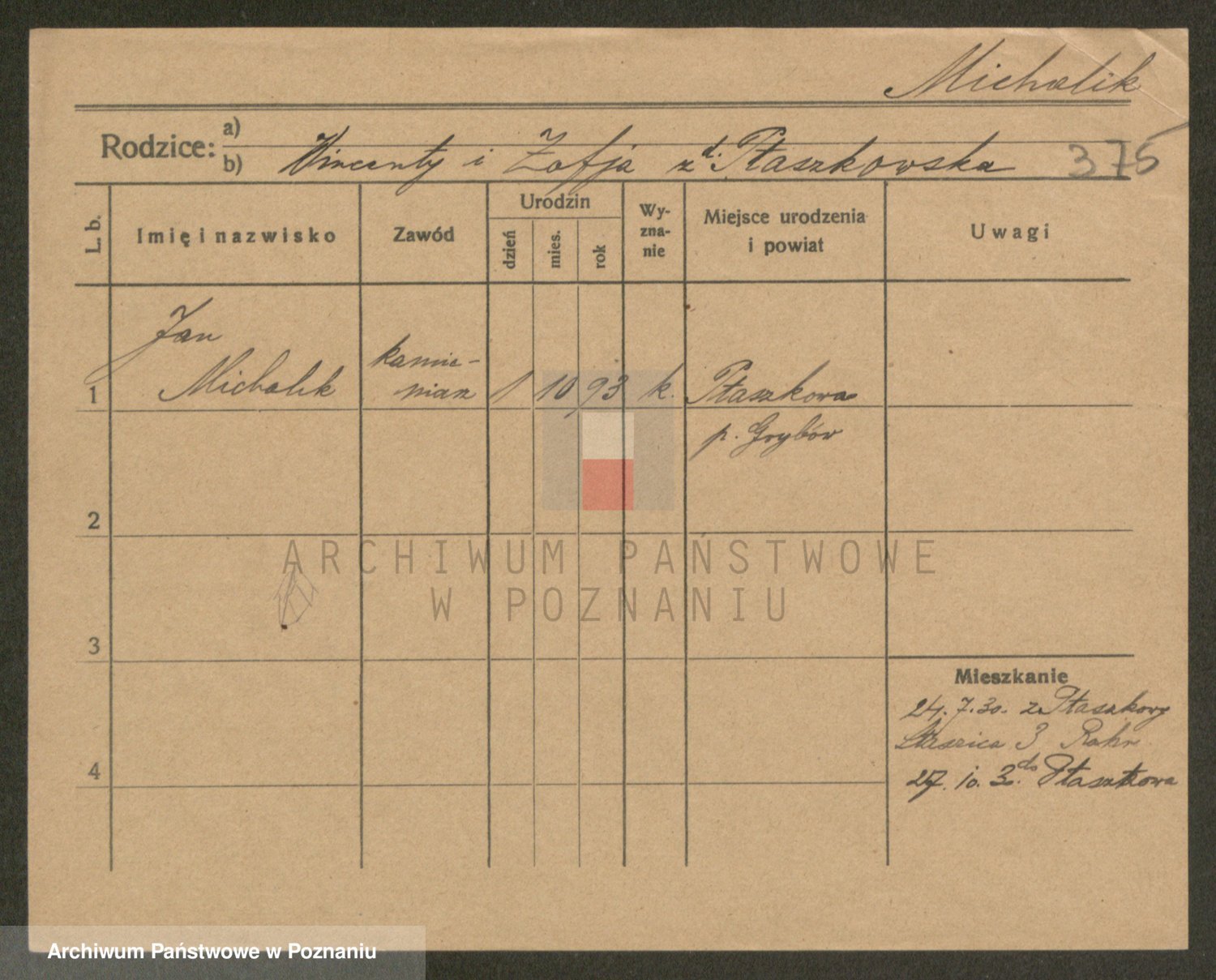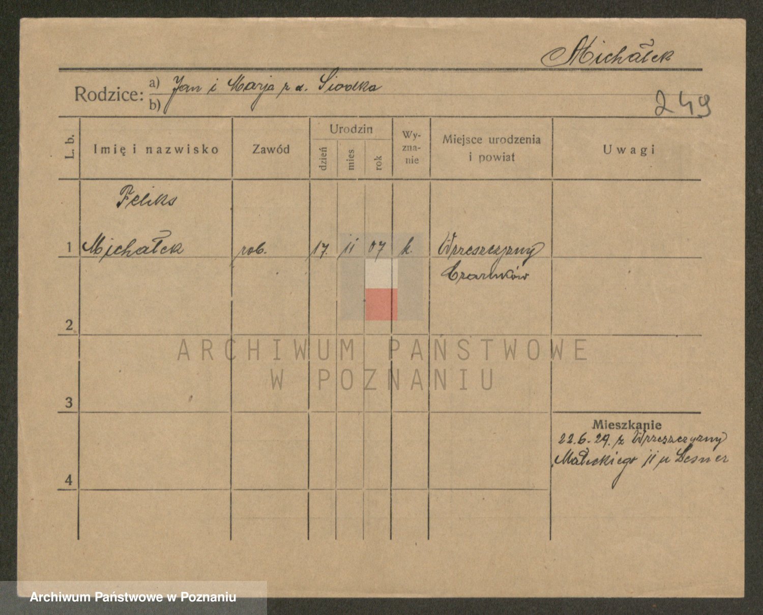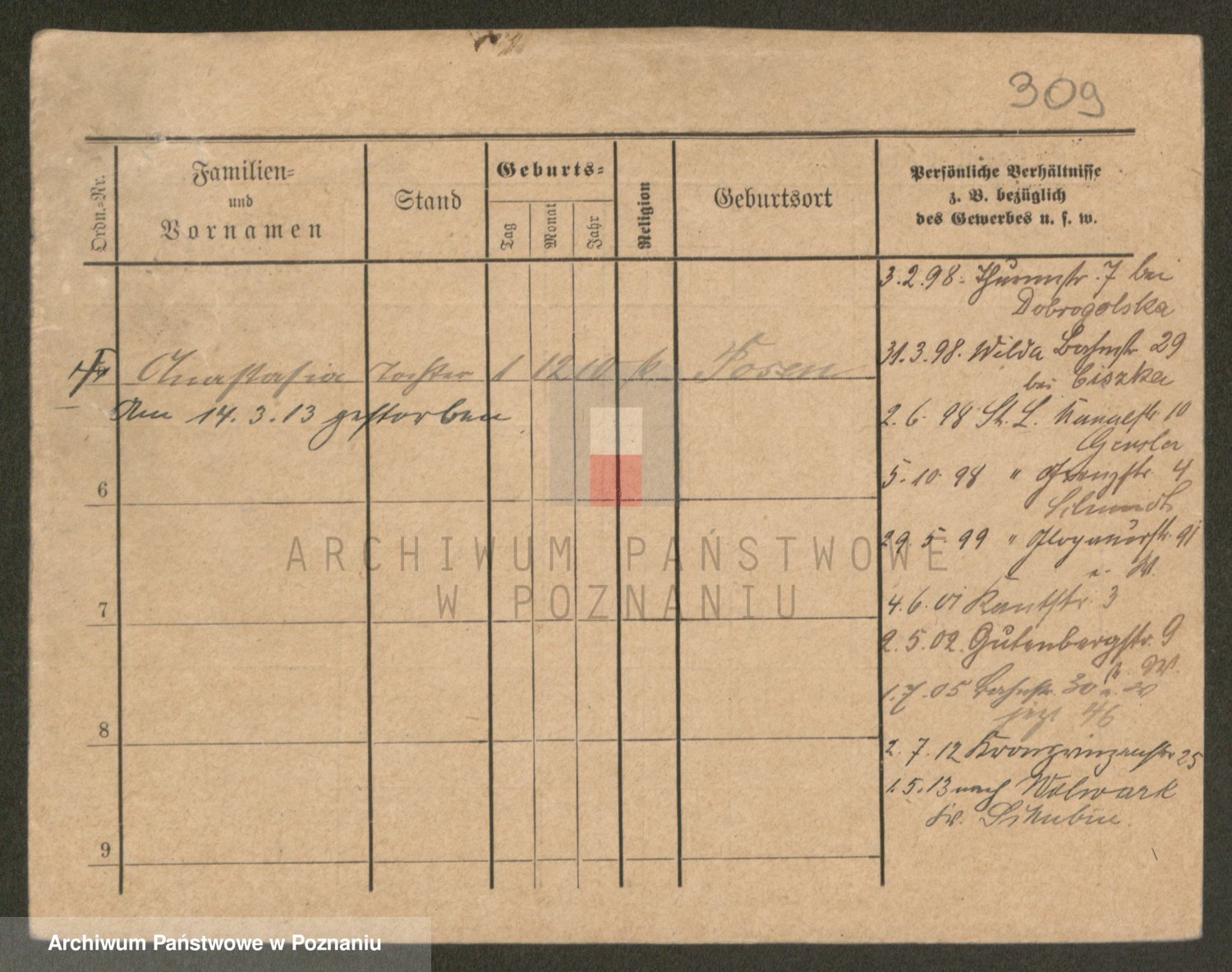 Podgląd karty osobowej dostępny jest po kliknięciu na nazwisko lub ikonkę karty. Można dokonywać powiększenia (ikony na górze) lub przechodzić między kolejnymi skanami (strzałki po bokach).