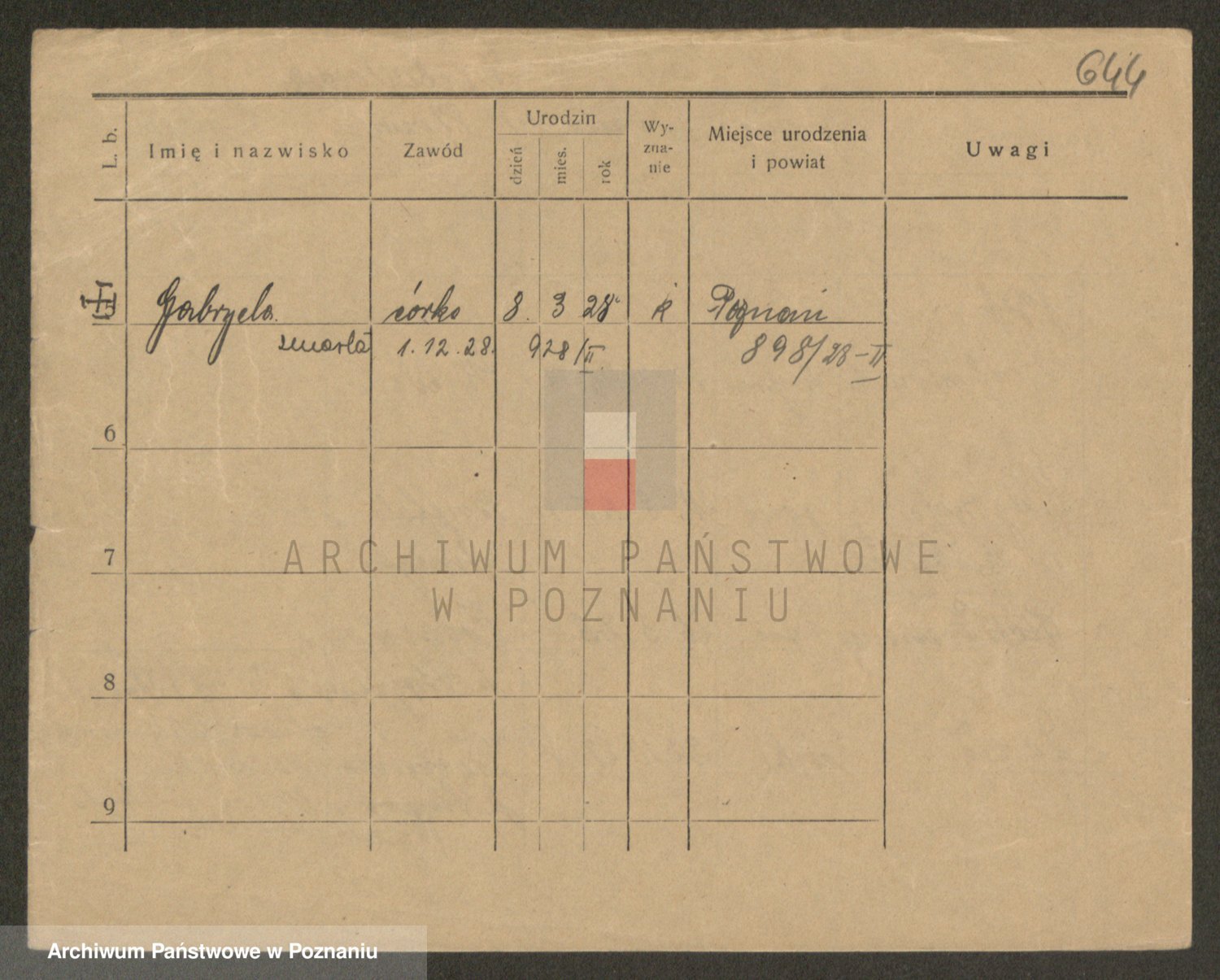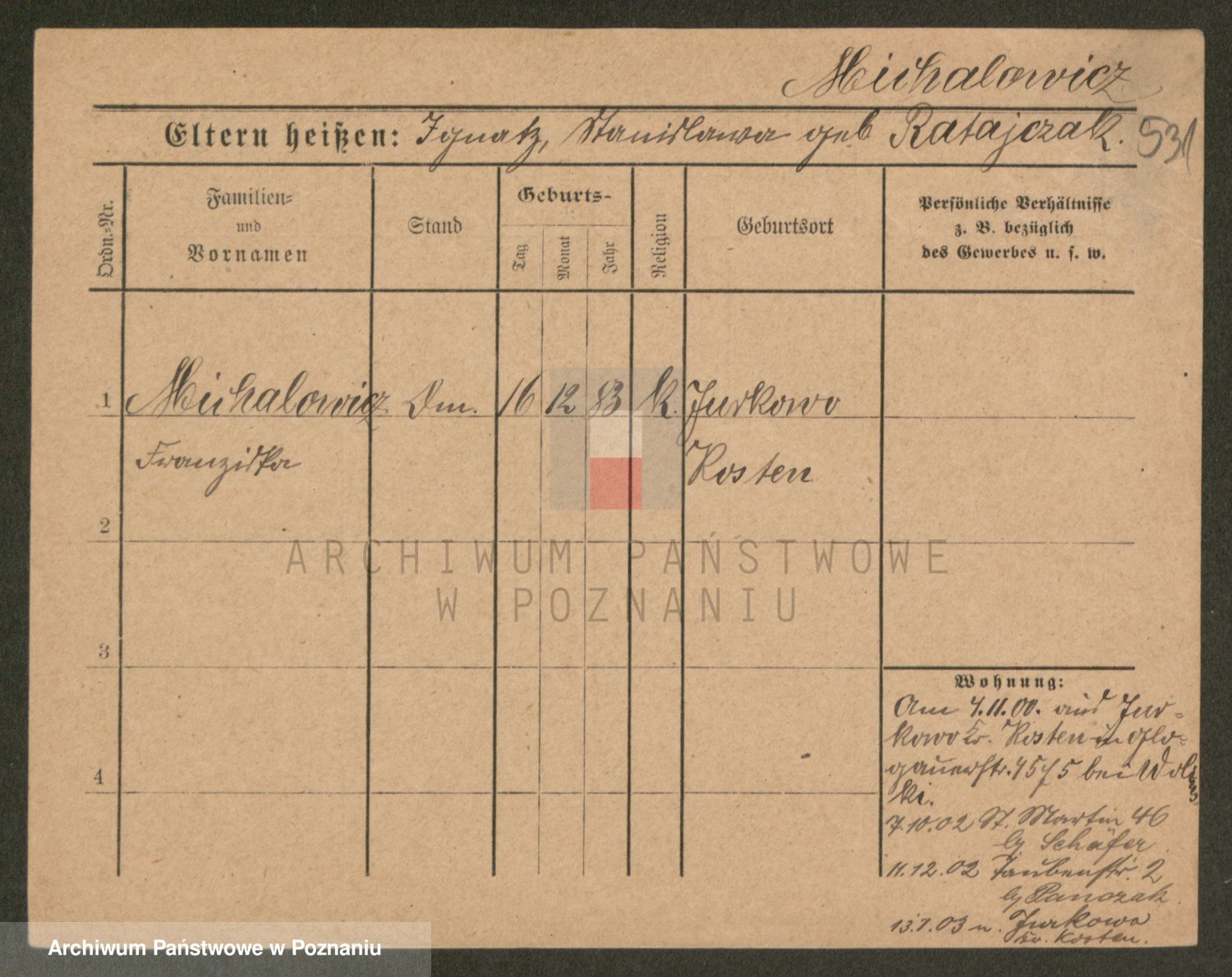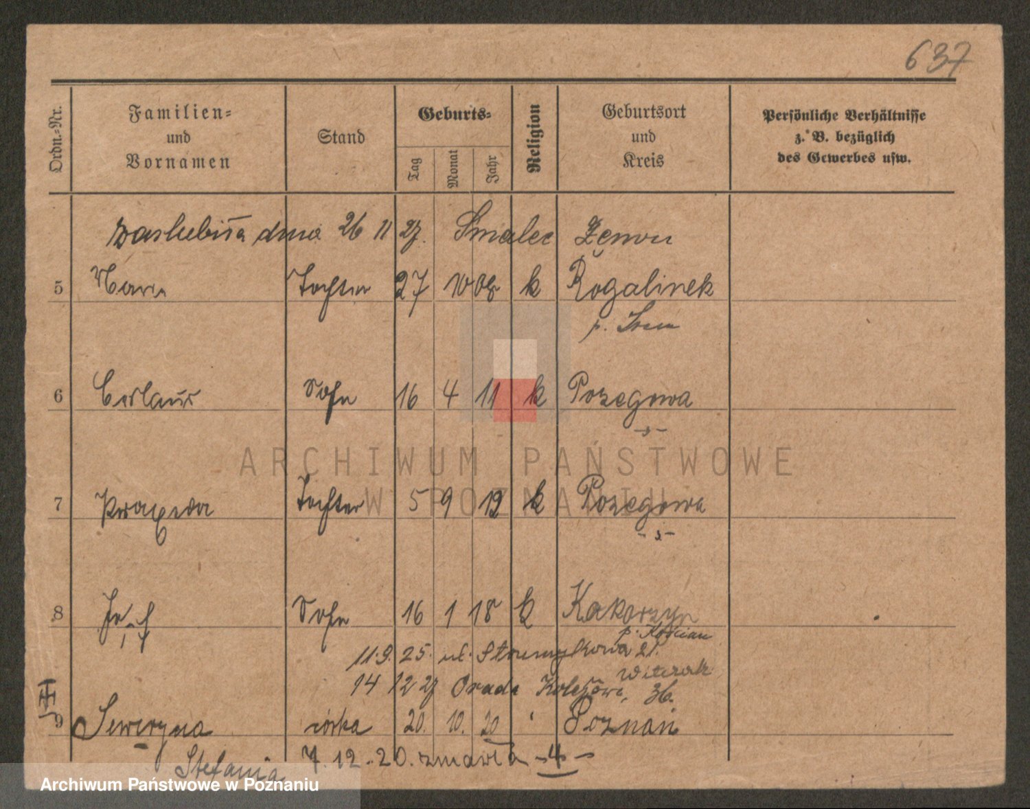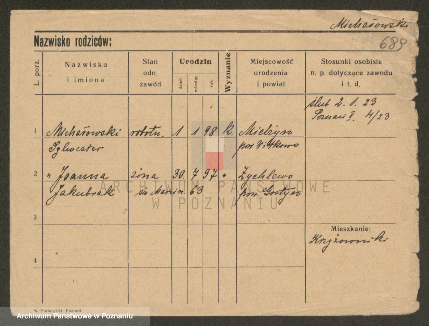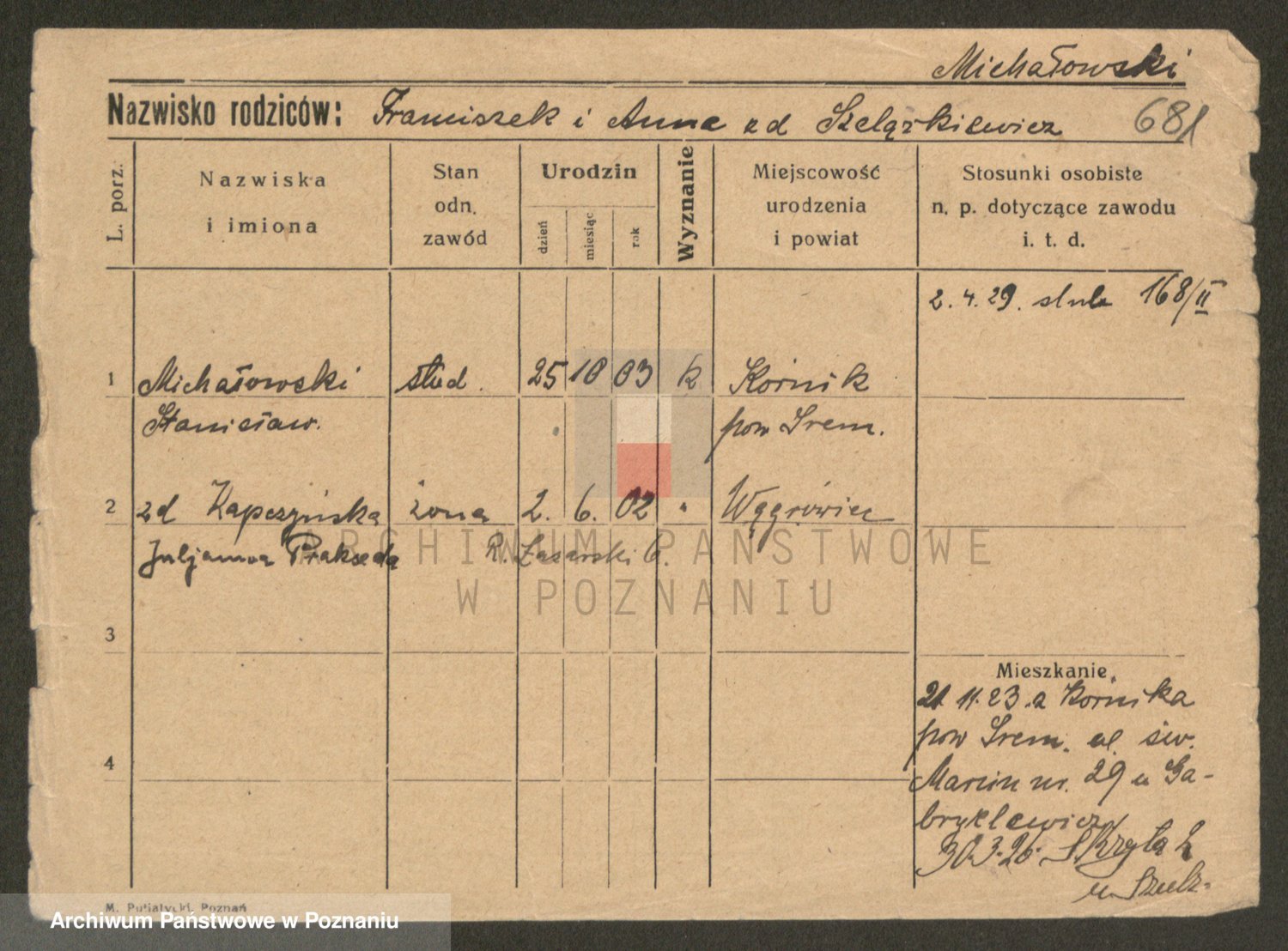 Podgląd karty osobowej dostępny jest po kliknięciu na nazwisko lub ikonkę karty. Można dokonywać powiększenia (ikony na górze) lub przechodzić między kolejnymi skanami (strzałki po bokach).