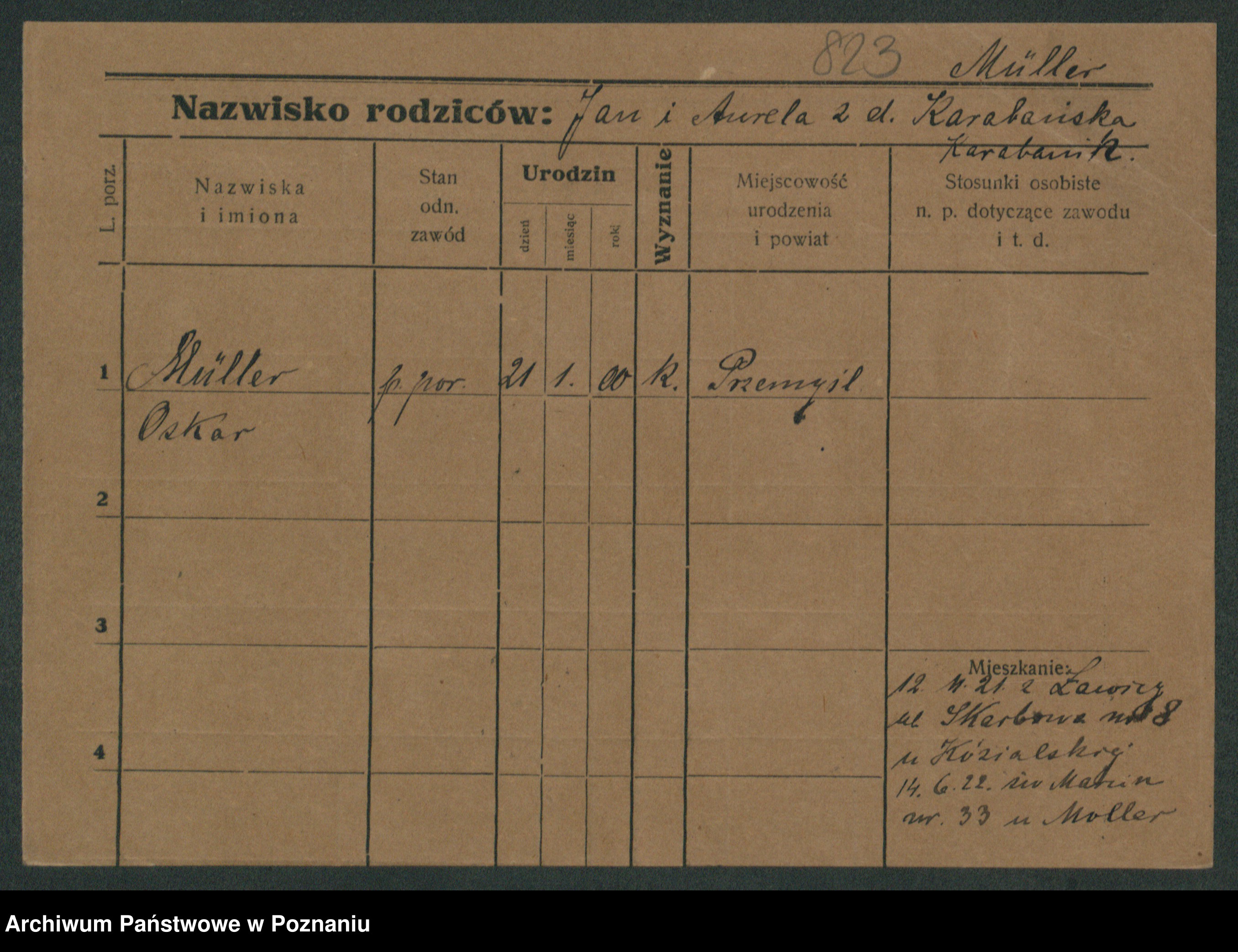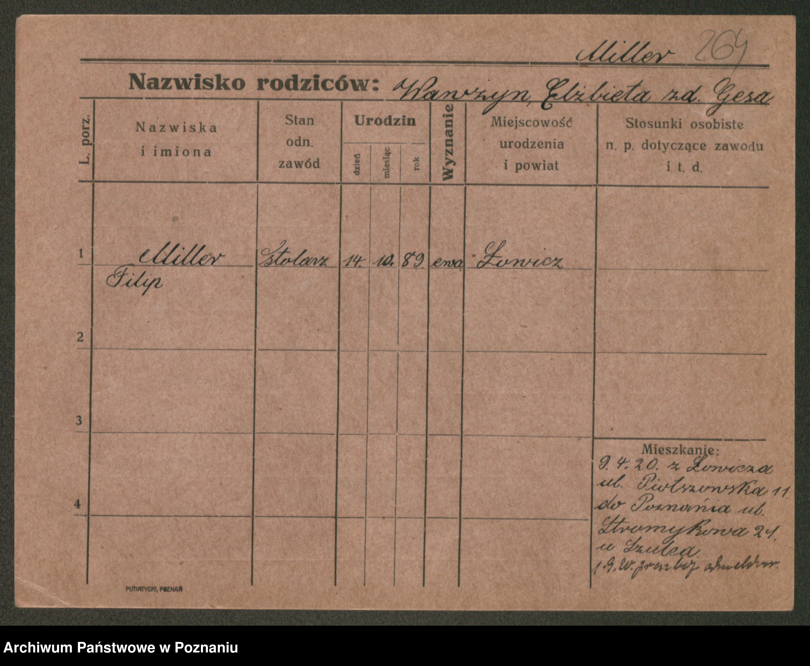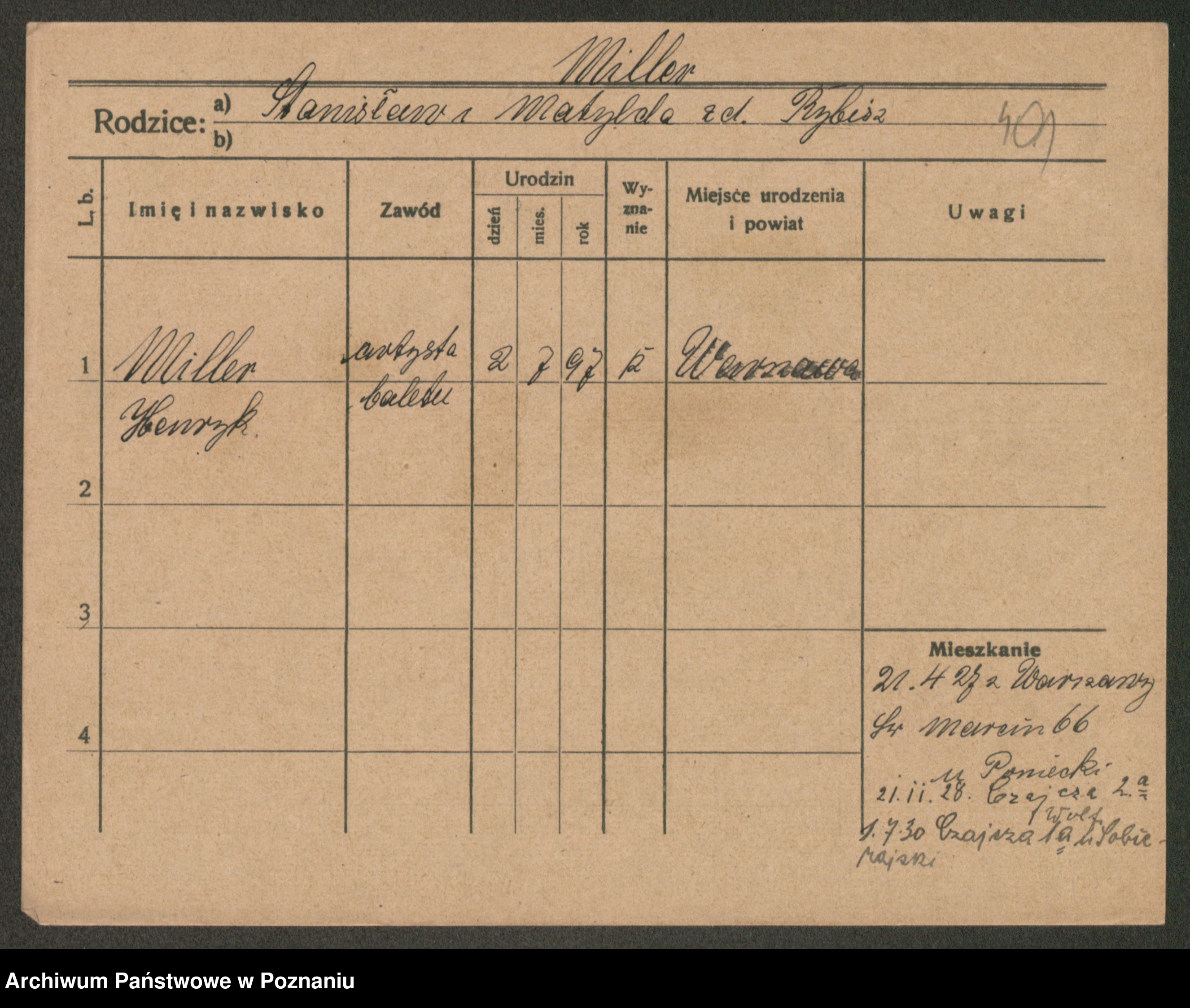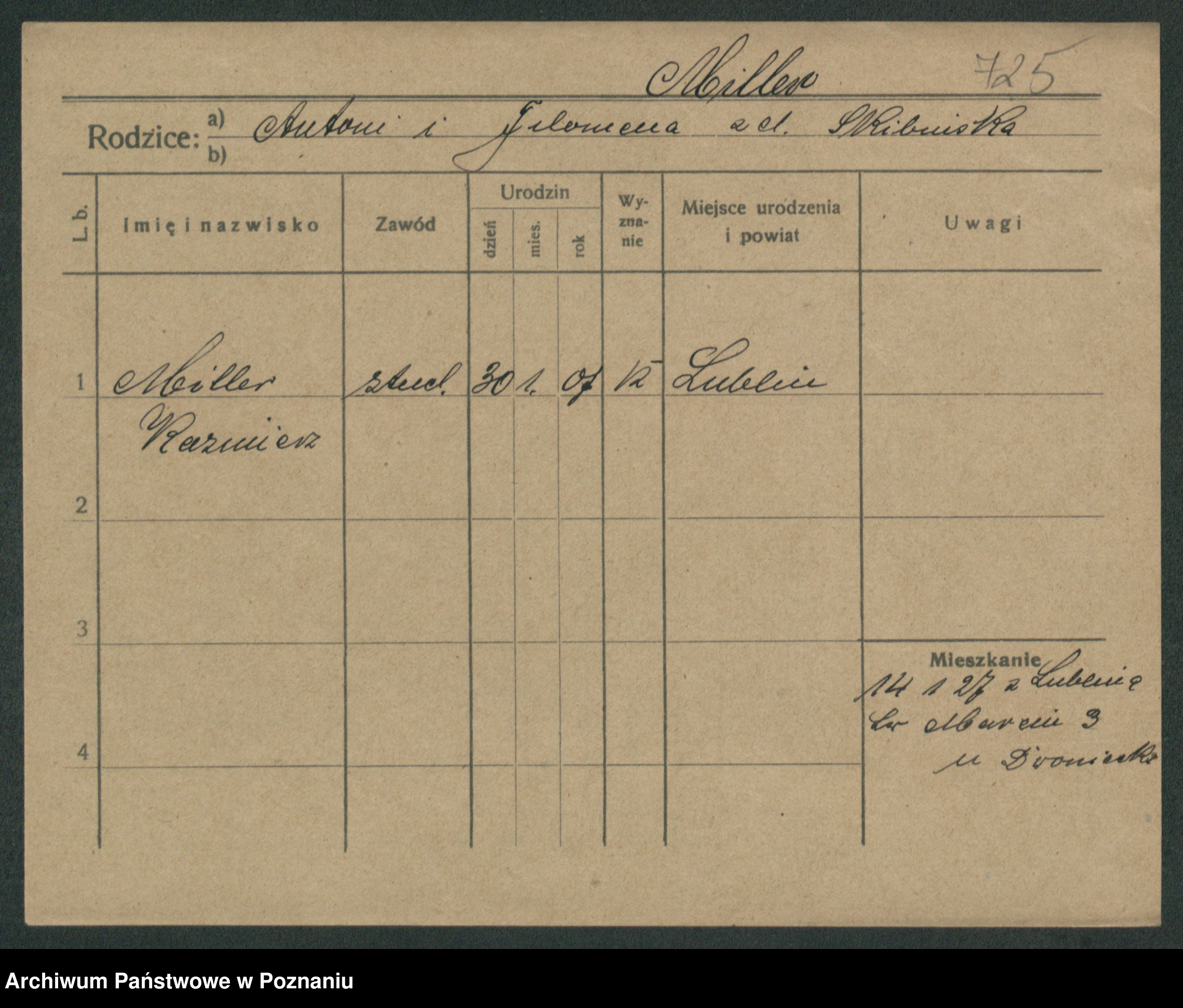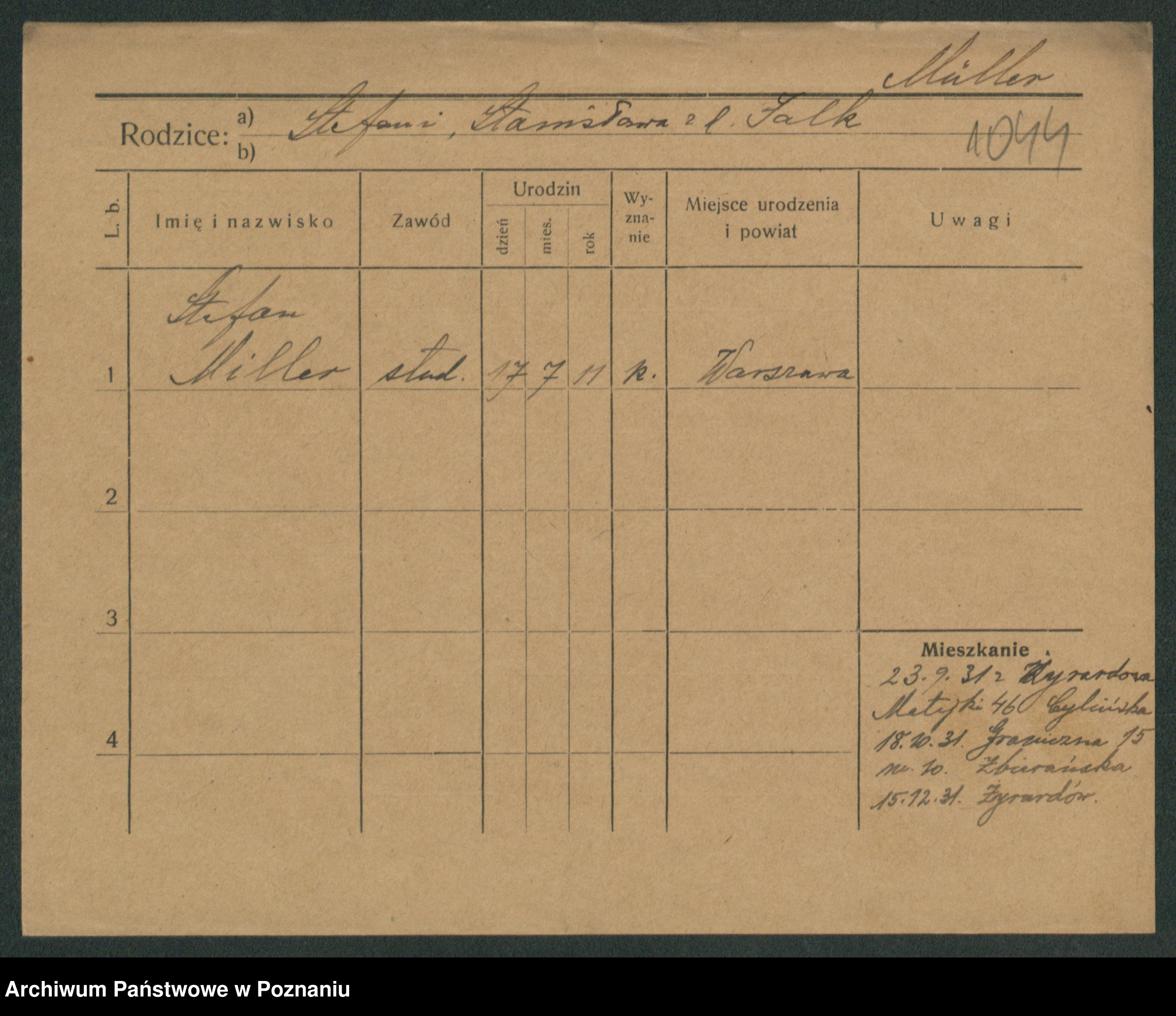 Podgląd karty osobowej dostępny jest po kliknięciu na nazwisko lub ikonkę karty. Można dokonywać powiększenia (ikony na górze) lub przechodzić między kolejnymi skanami (strzałki po bokach).