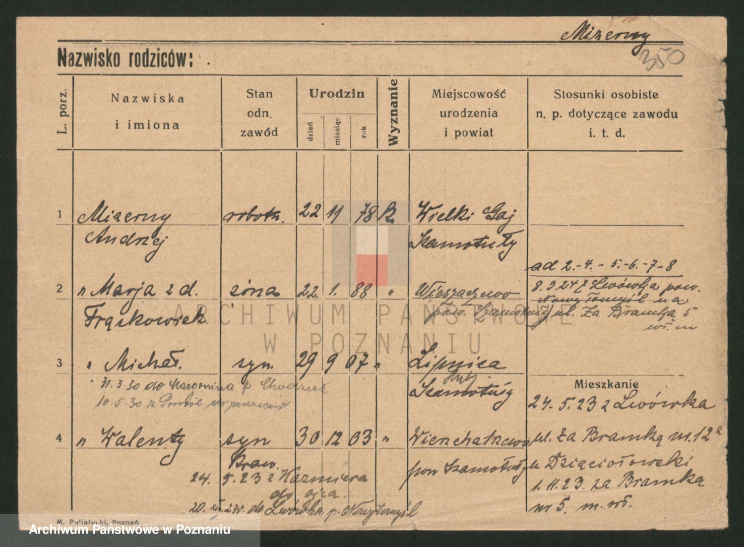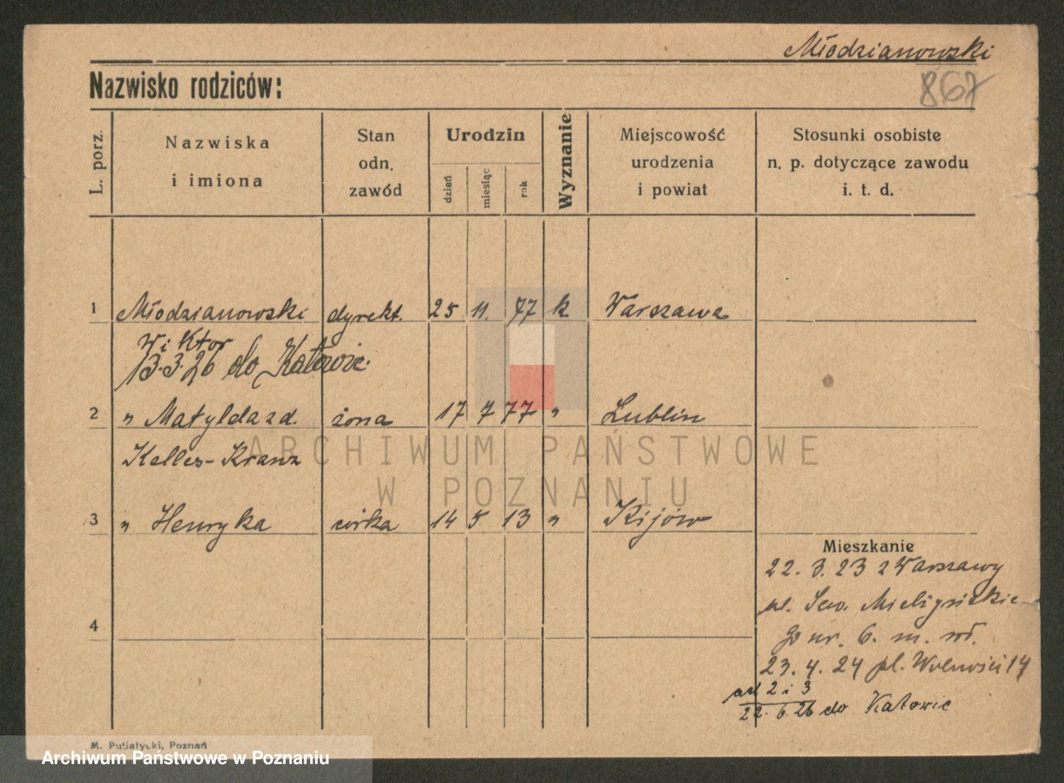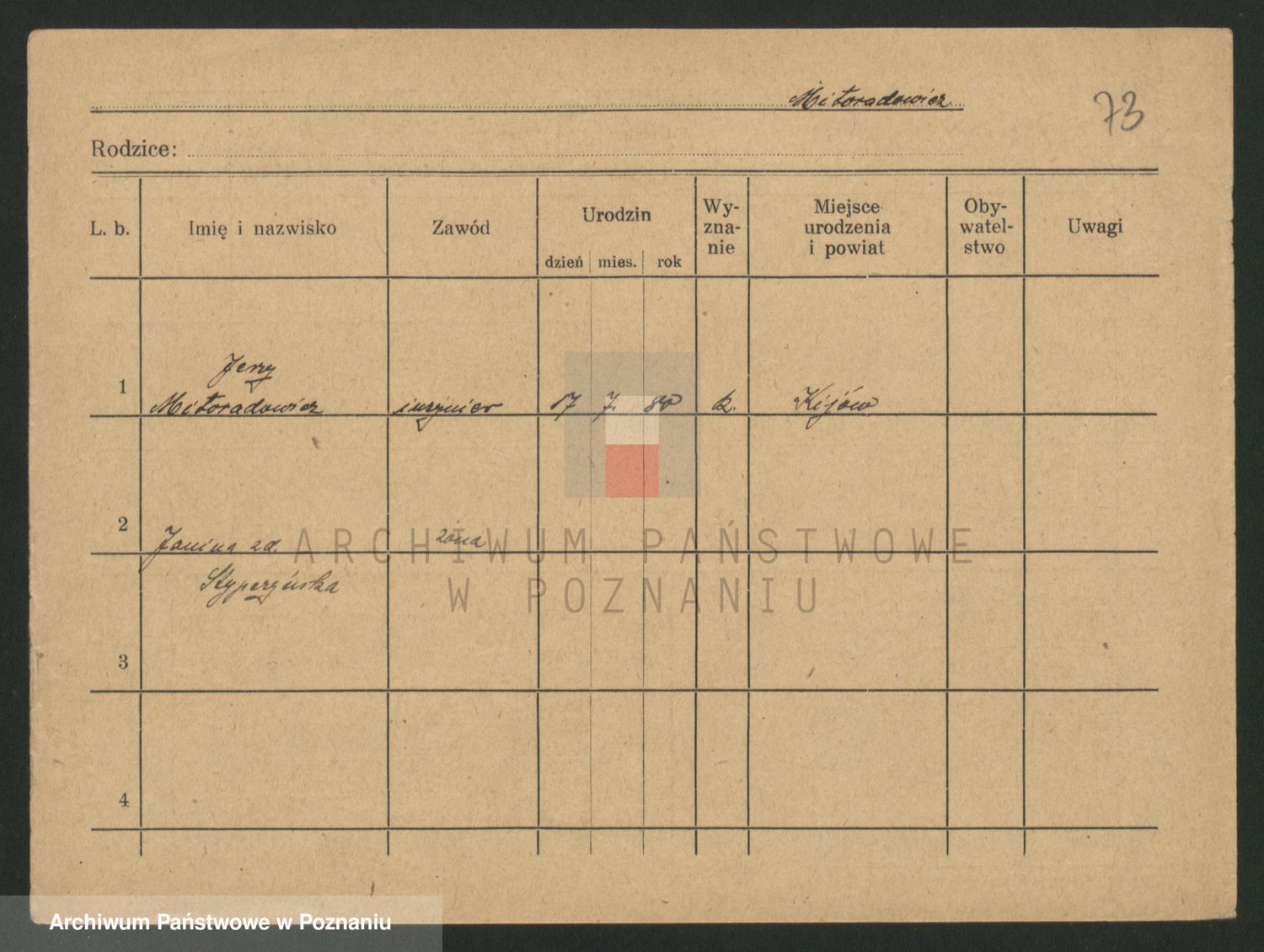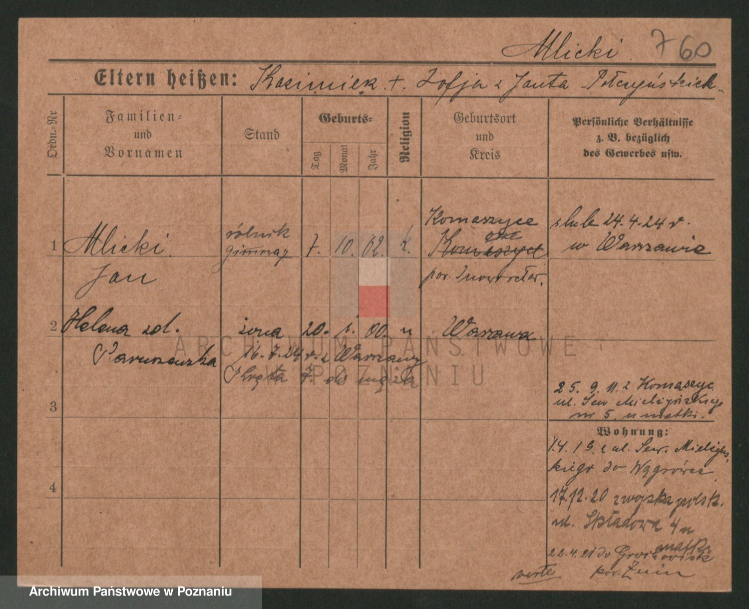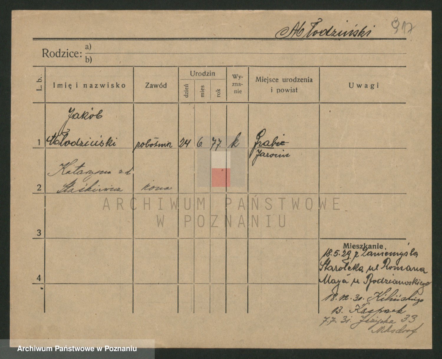 Podgląd karty osobowej dostępny jest po kliknięciu na nazwisko lub ikonkę karty. Można dokonywać powiększenia (ikony na górze) lub przechodzić między kolejnymi skanami (strzałki po bokach).
