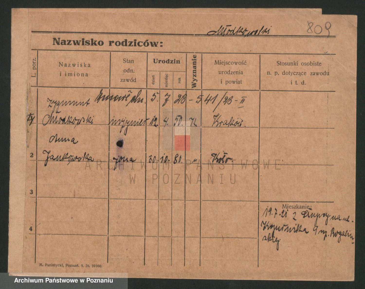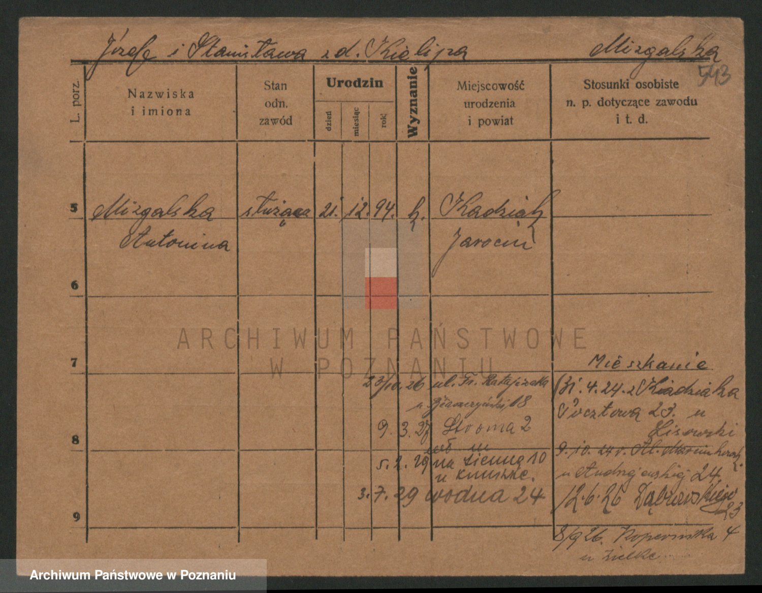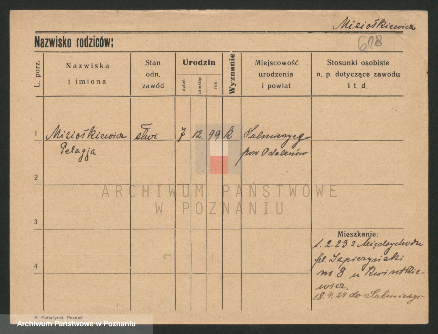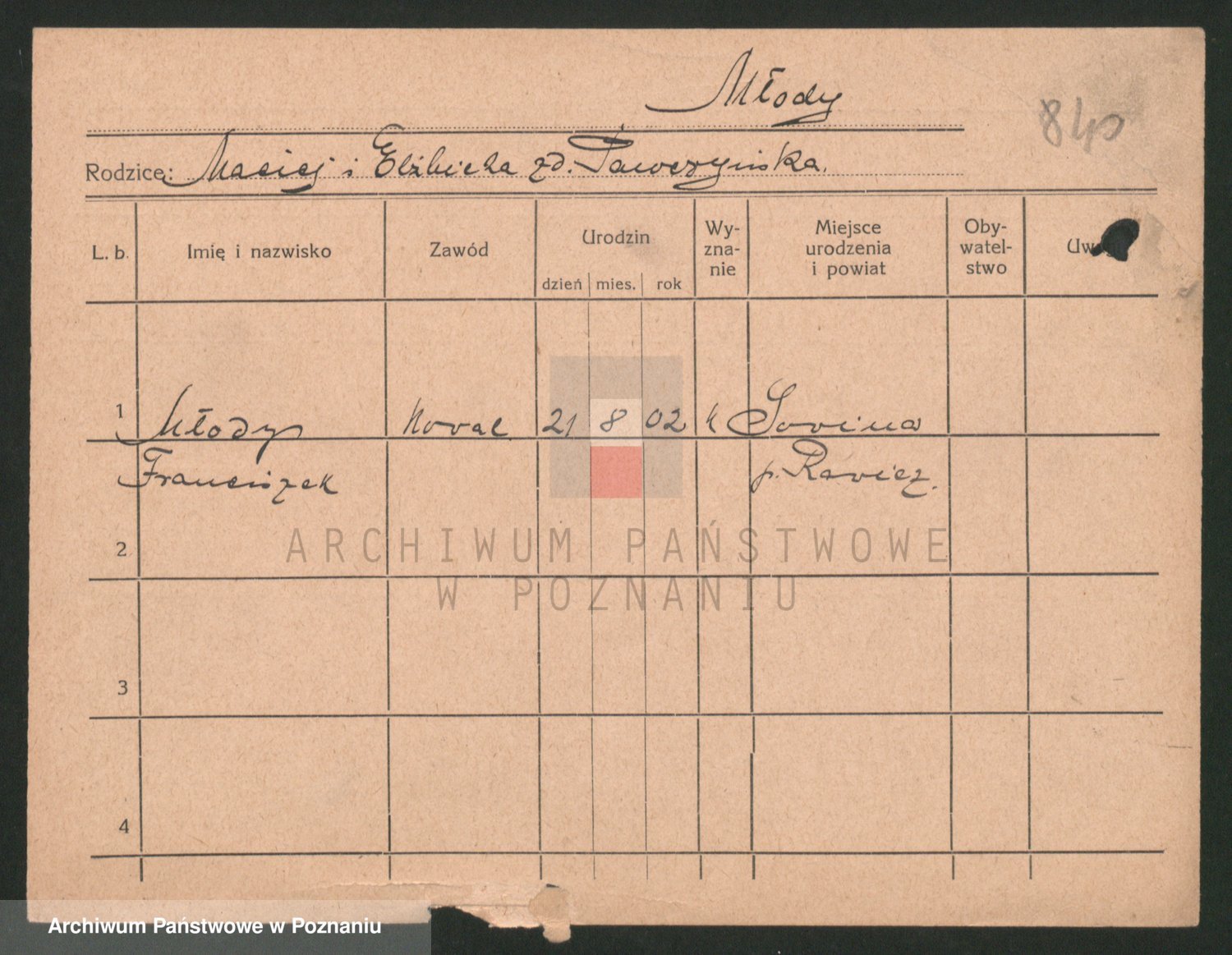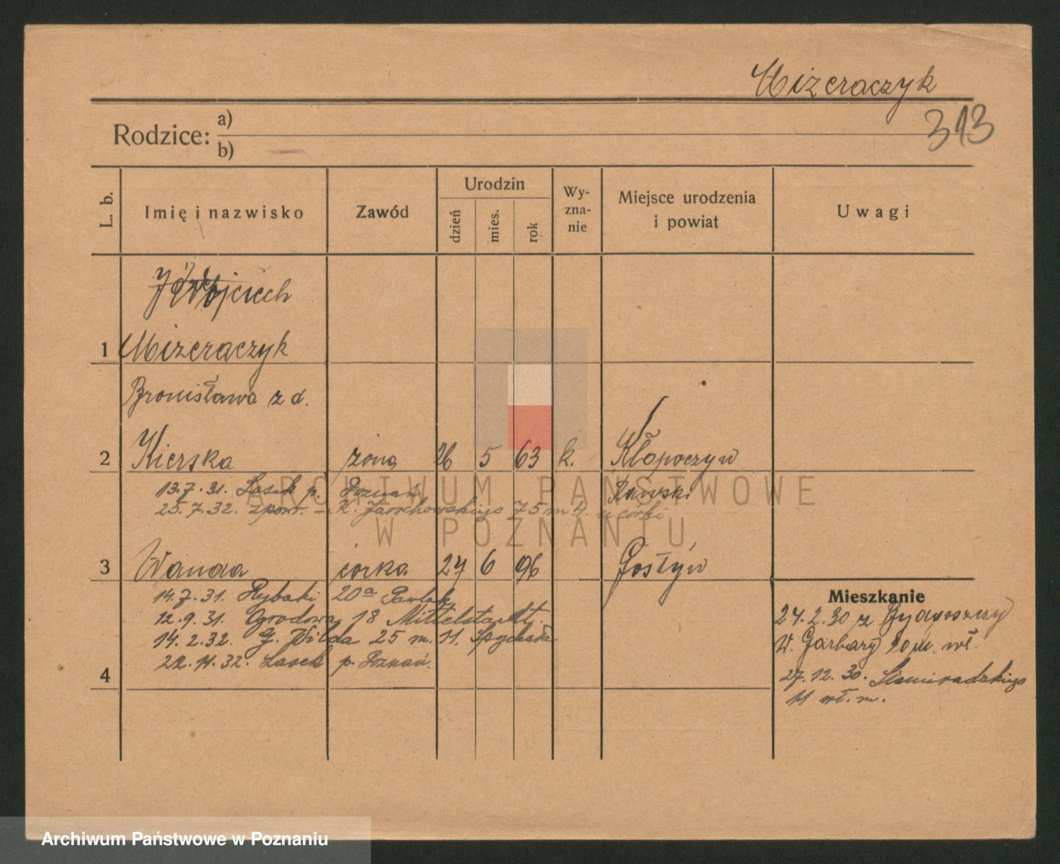 Podgląd karty osobowej dostępny jest po kliknięciu na nazwisko lub ikonkę karty. Można dokonywać powiększenia (ikony na górze) lub przechodzić między kolejnymi skanami (strzałki po bokach).