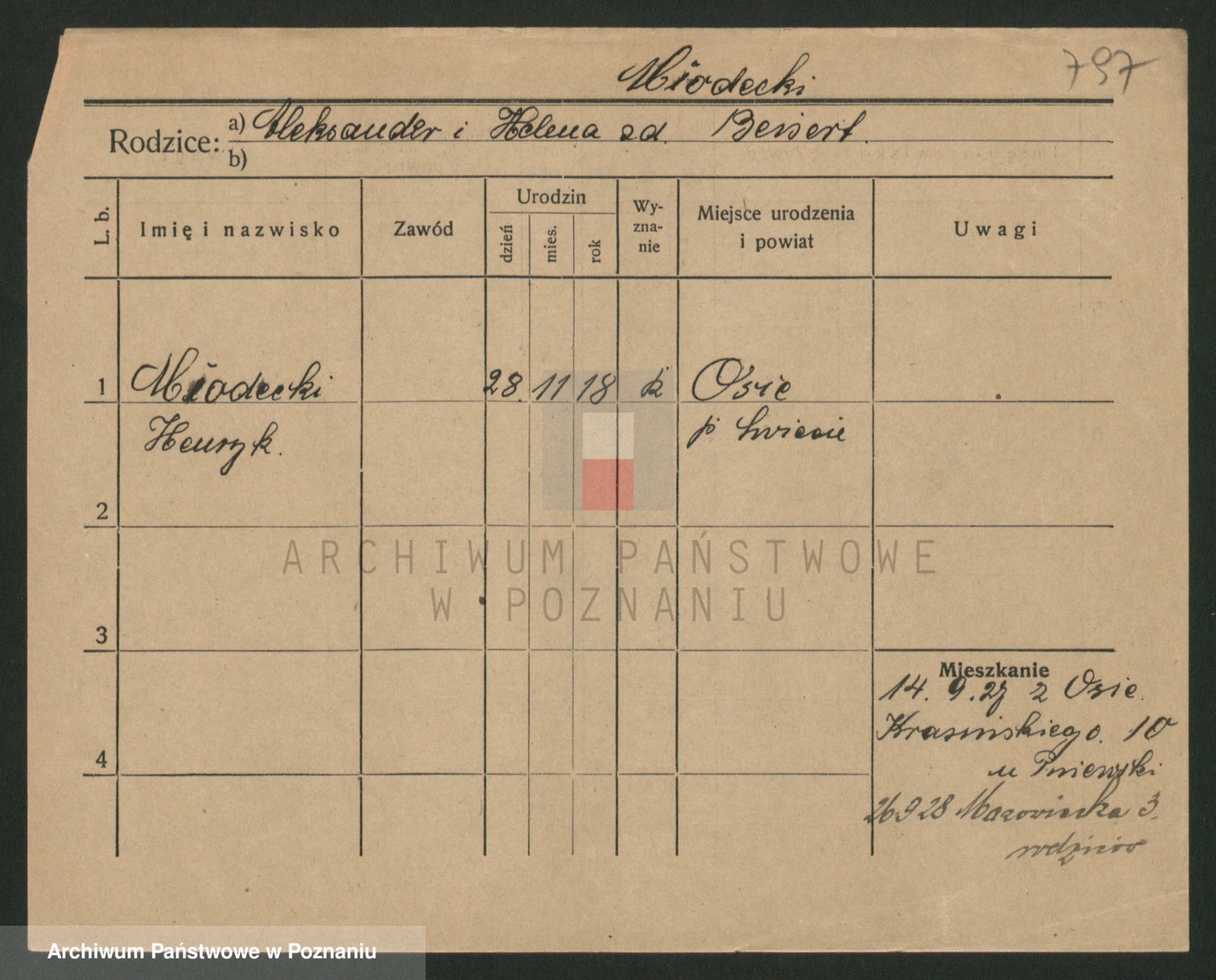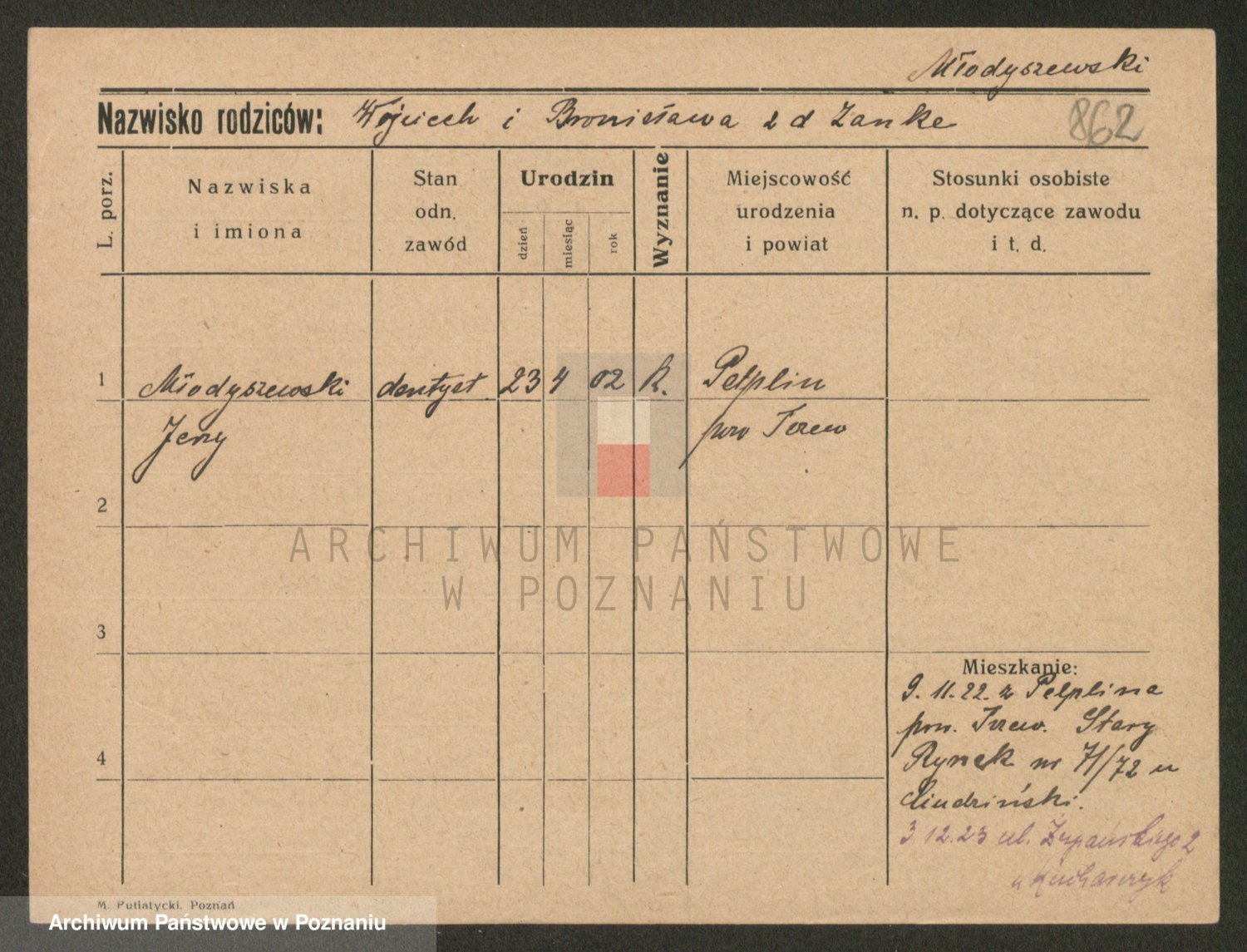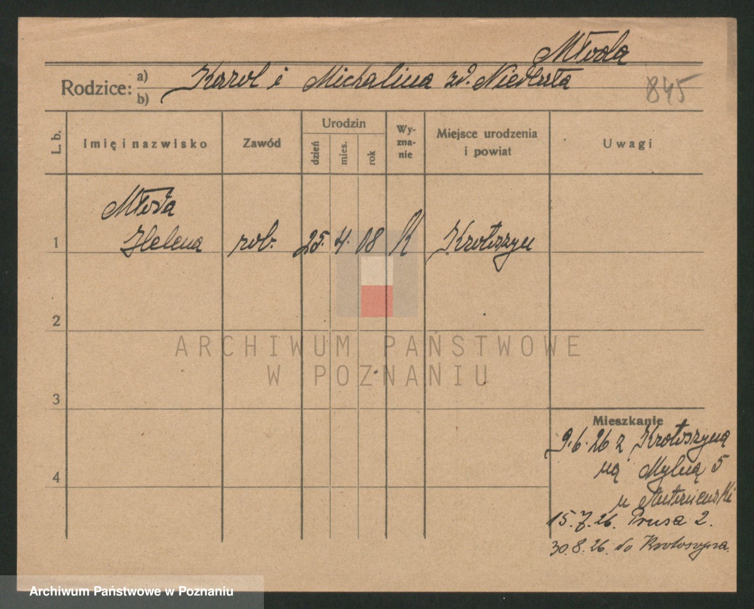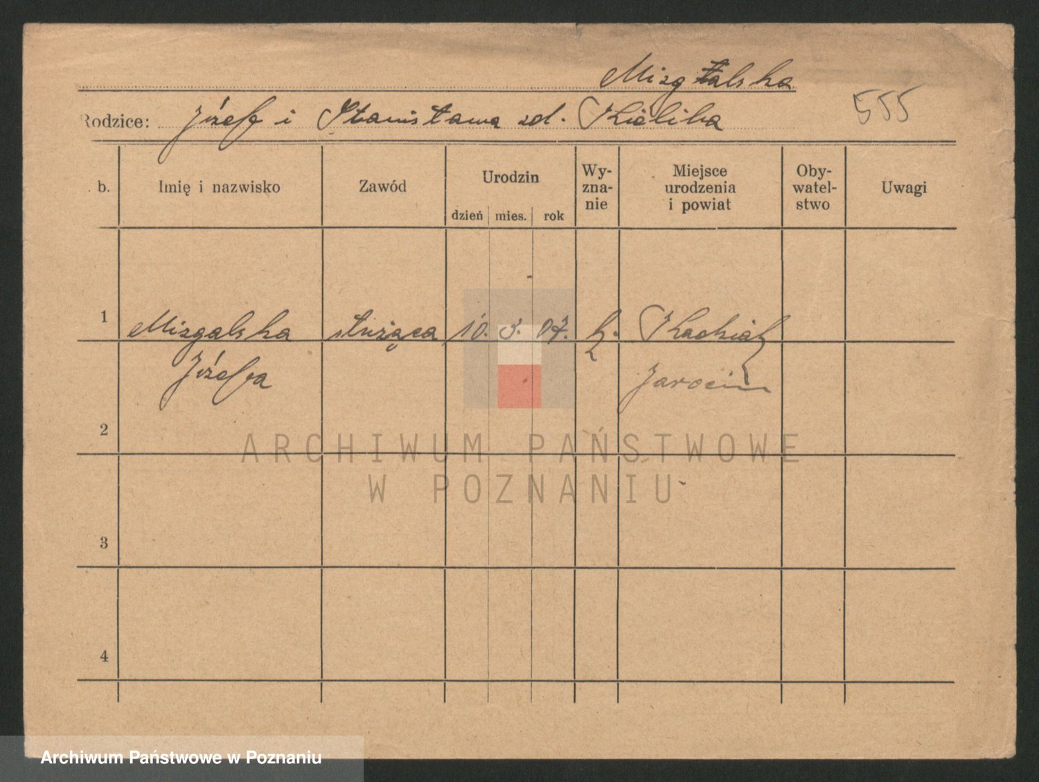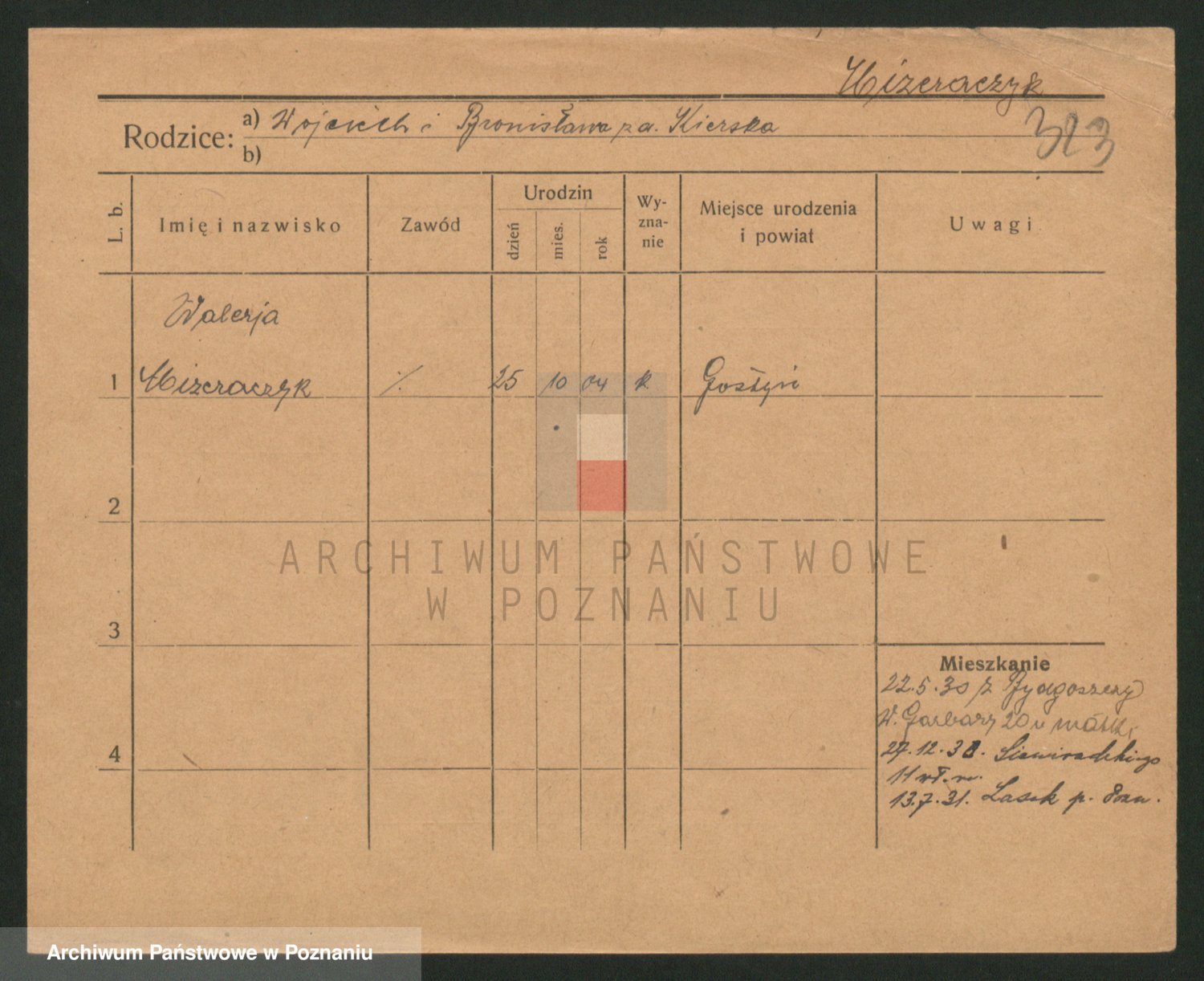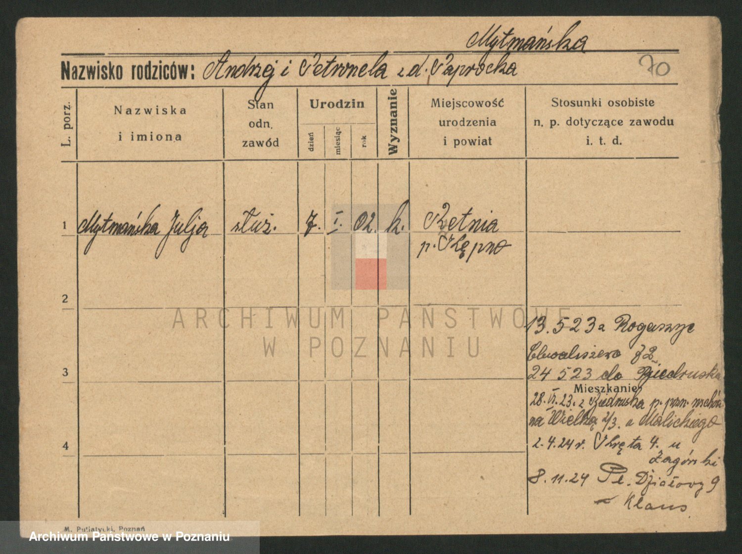 Podgląd karty osobowej dostępny jest po kliknięciu na nazwisko lub ikonkę karty. Można dokonywać powiększenia (ikony na górze) lub przechodzić między kolejnymi skanami (strzałki po bokach).