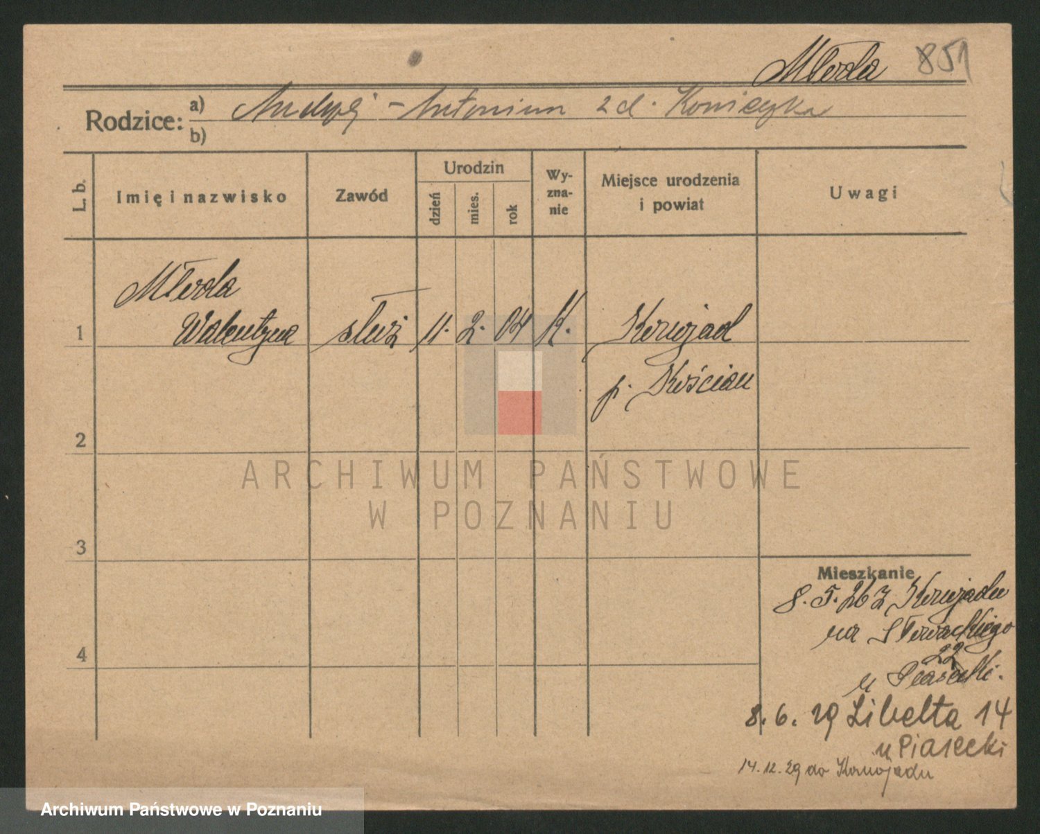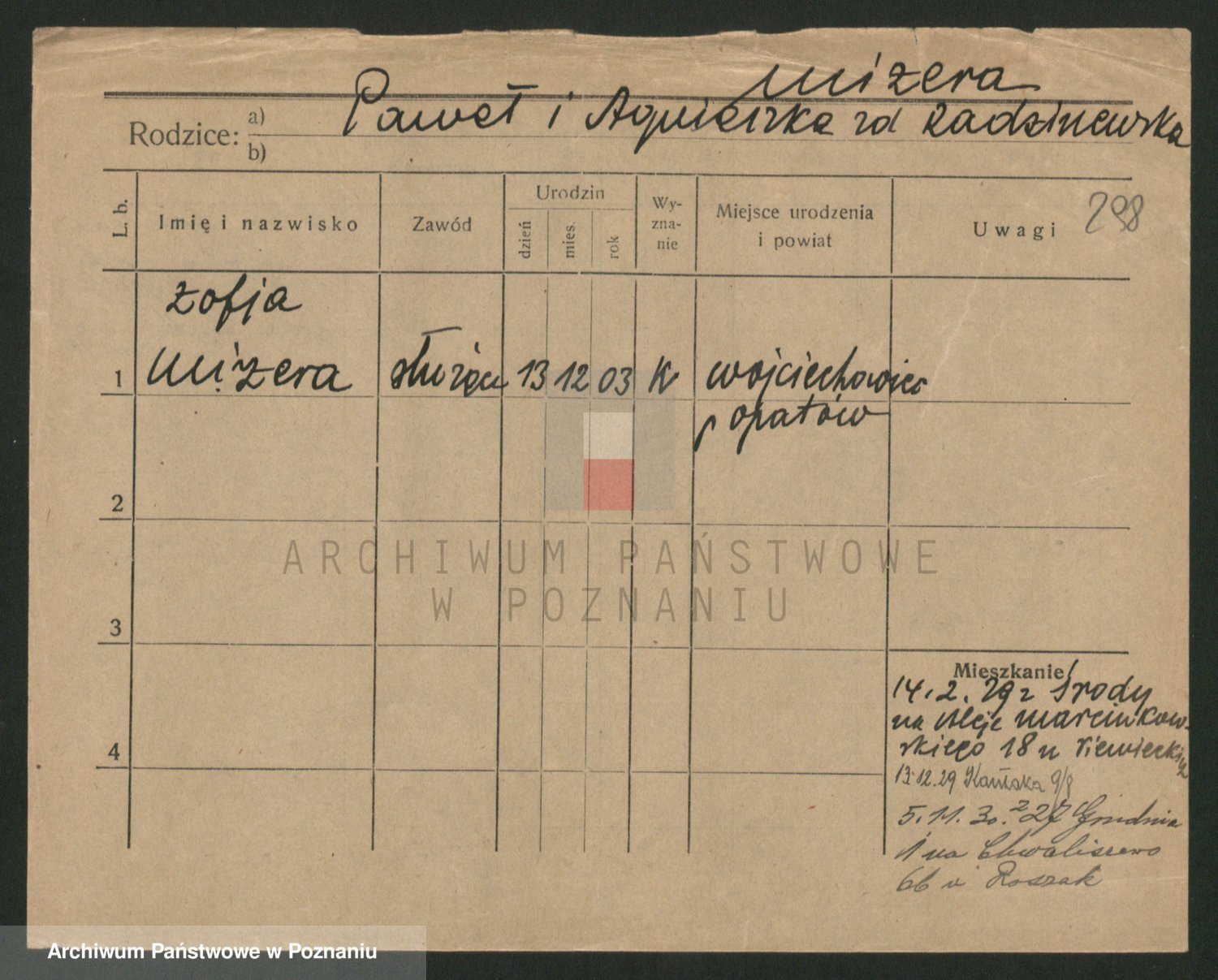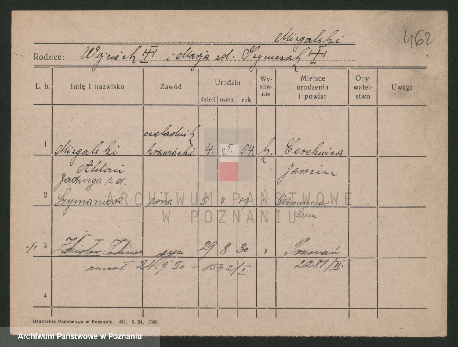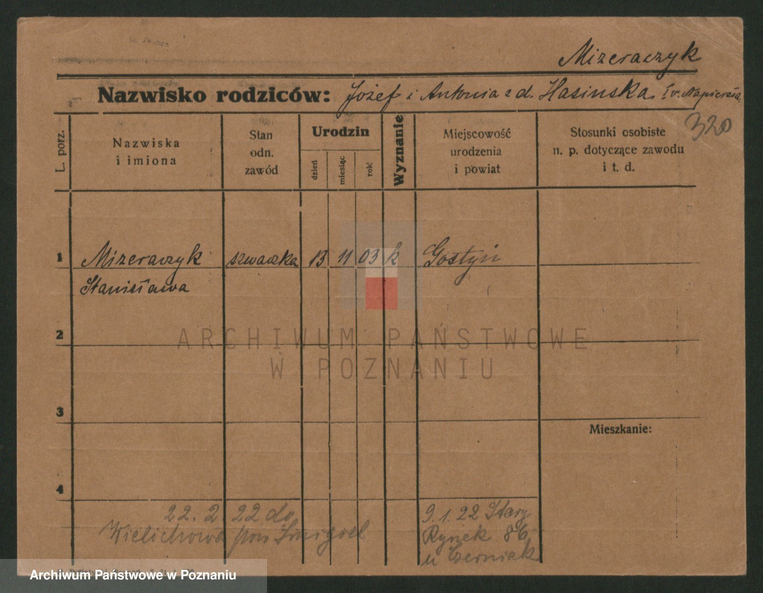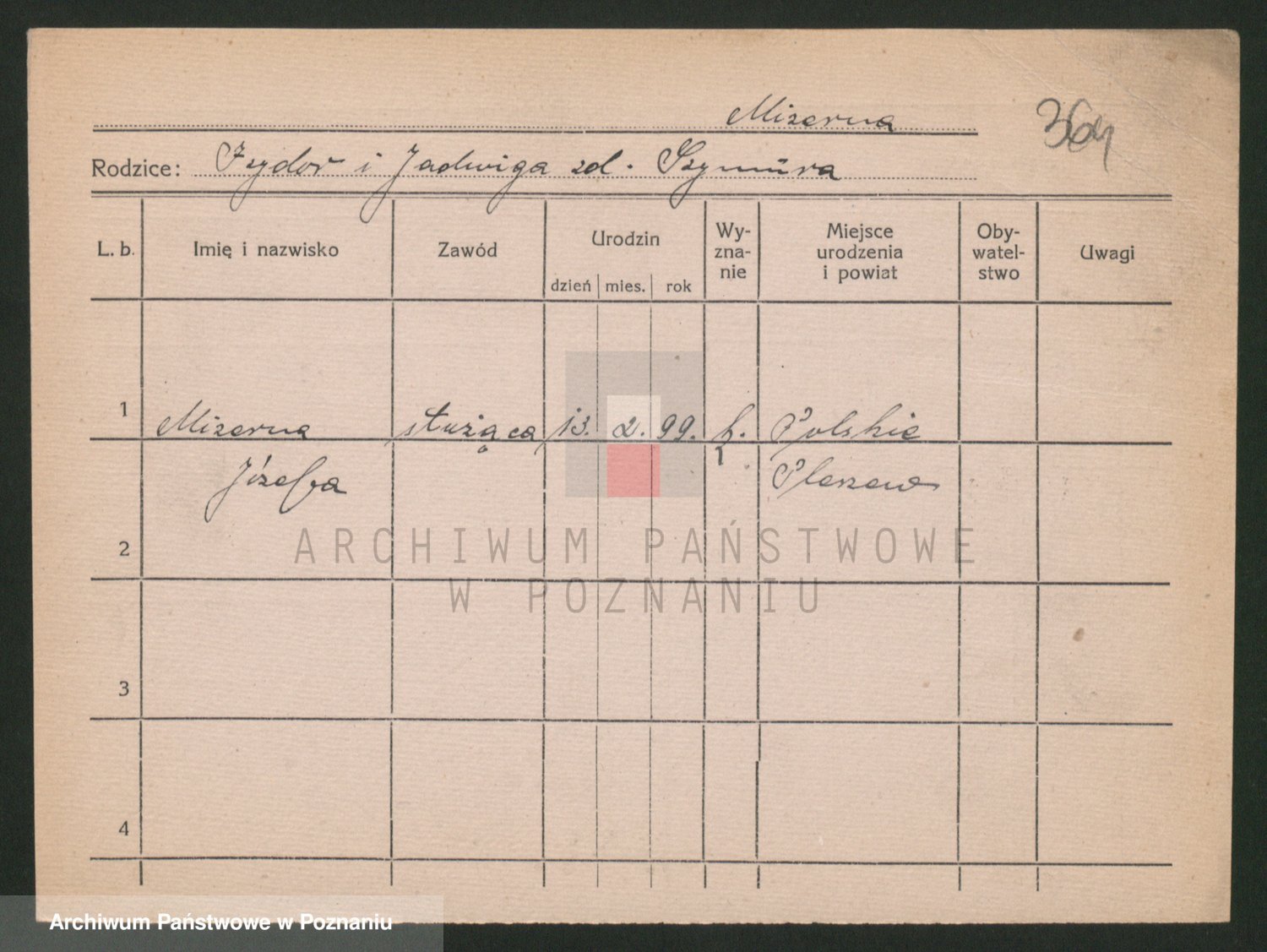 Podgląd karty osobowej dostępny jest po kliknięciu na nazwisko lub ikonkę karty. Można dokonywać powiększenia (ikony na górze) lub przechodzić między kolejnymi skanami (strzałki po bokach).