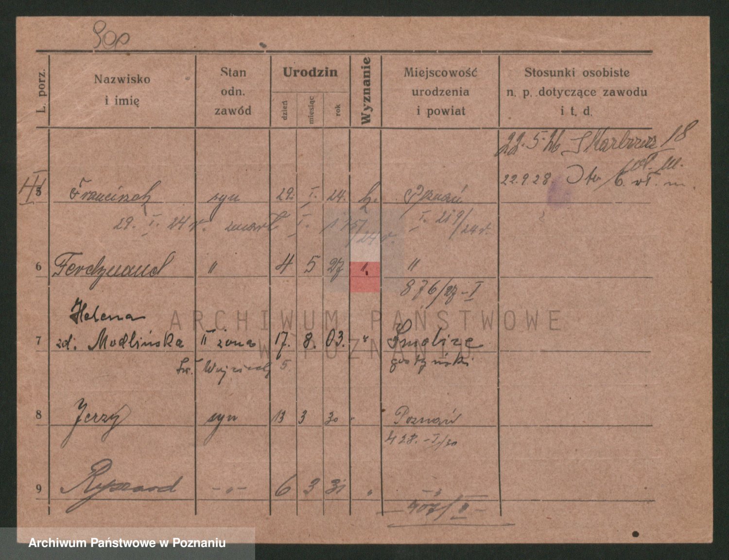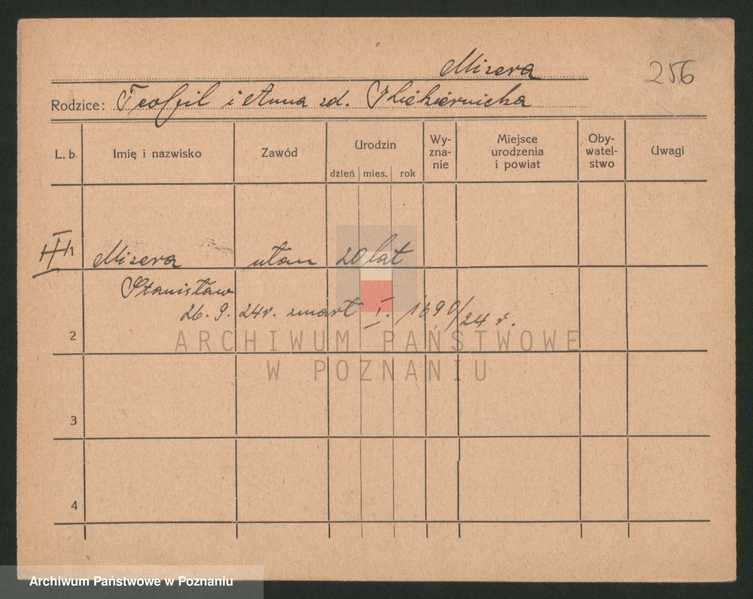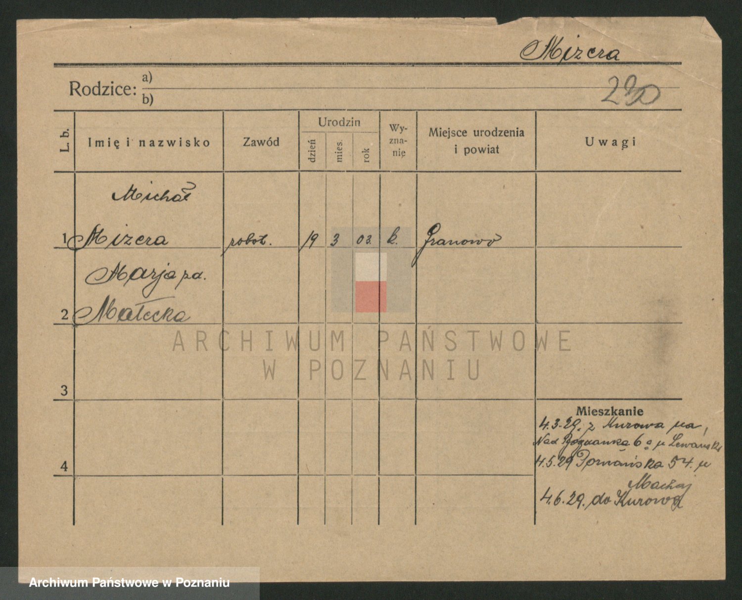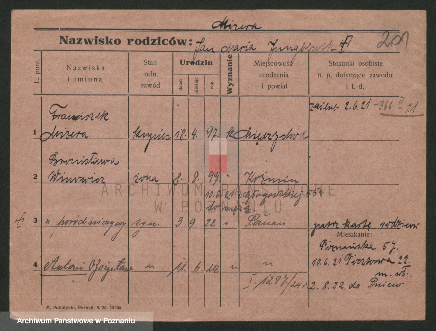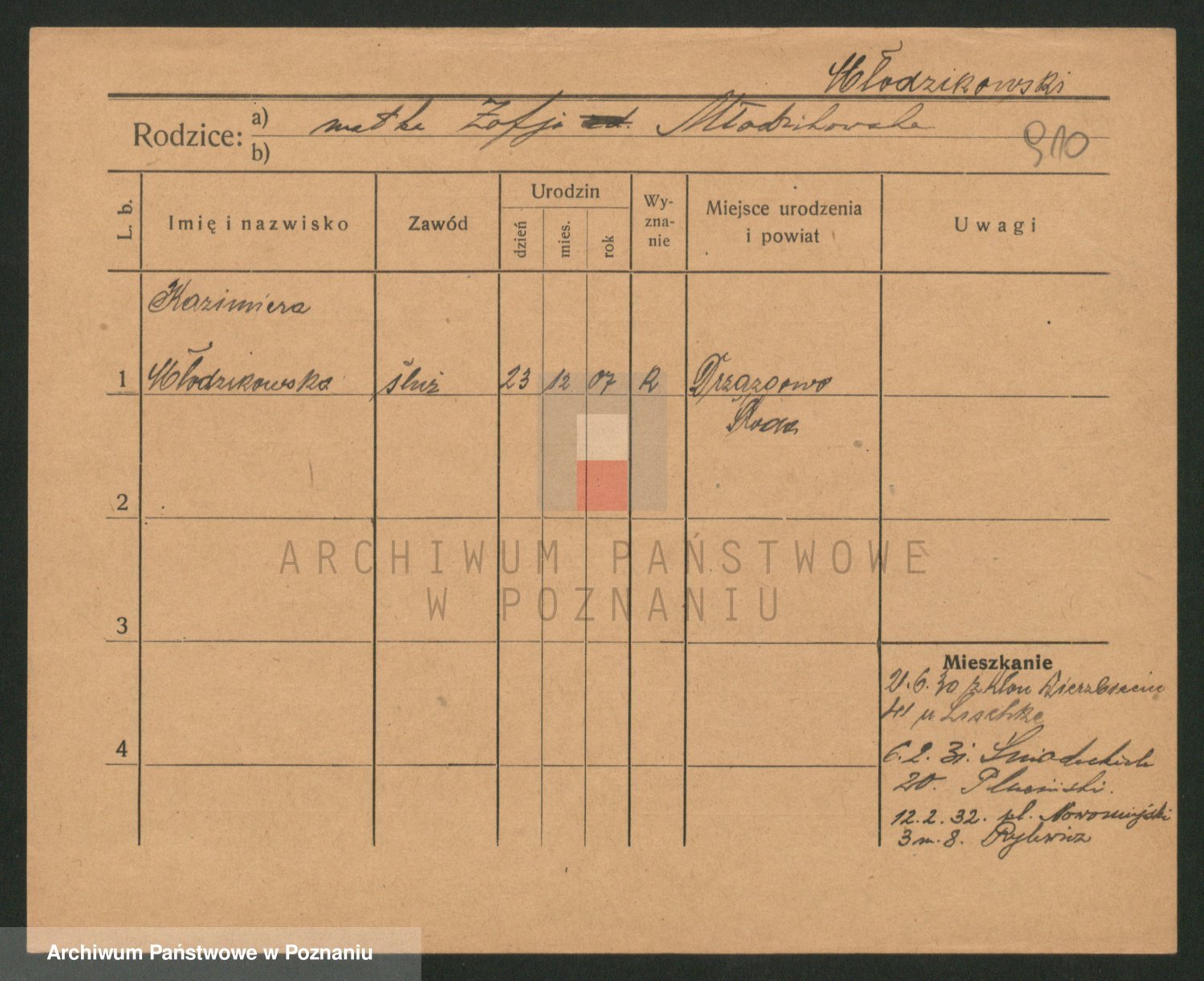 Podgląd karty osobowej dostępny jest po kliknięciu na nazwisko lub ikonkę karty. Można dokonywać powiększenia (ikony na górze) lub przechodzić między kolejnymi skanami (strzałki po bokach).