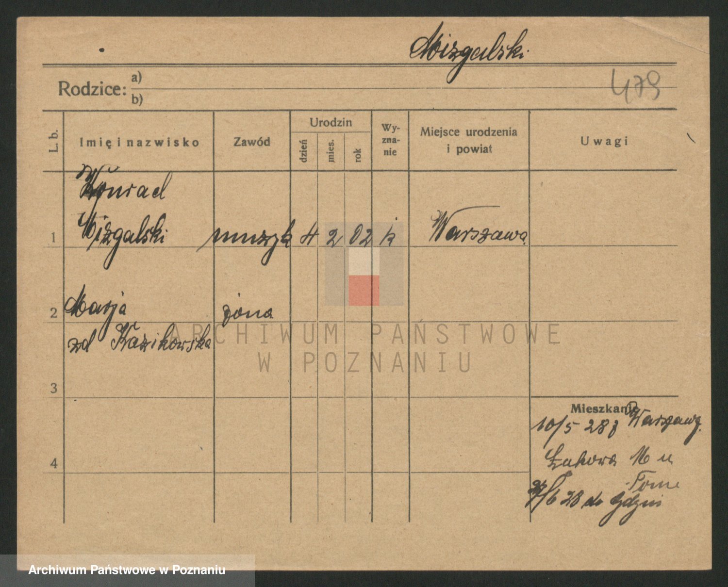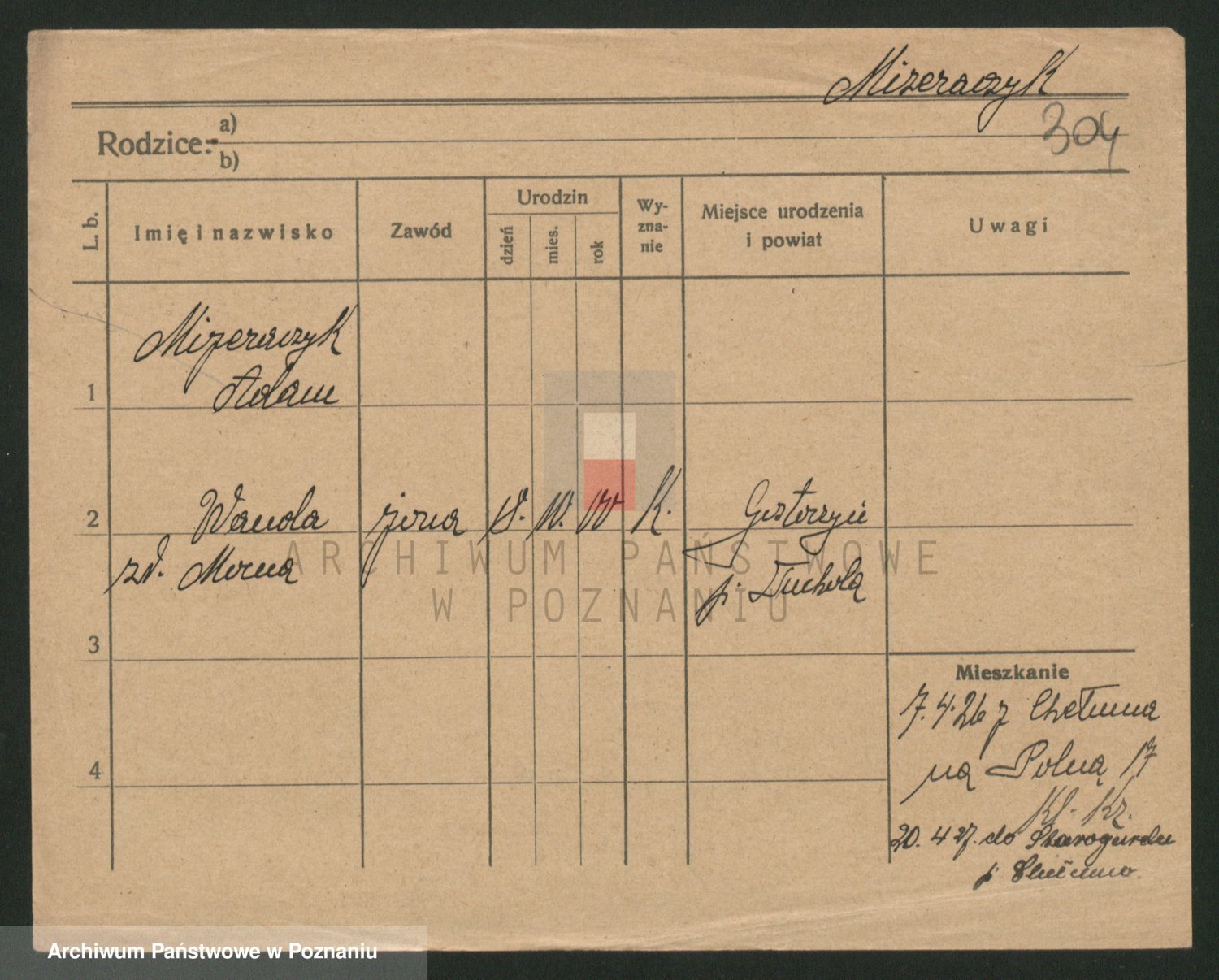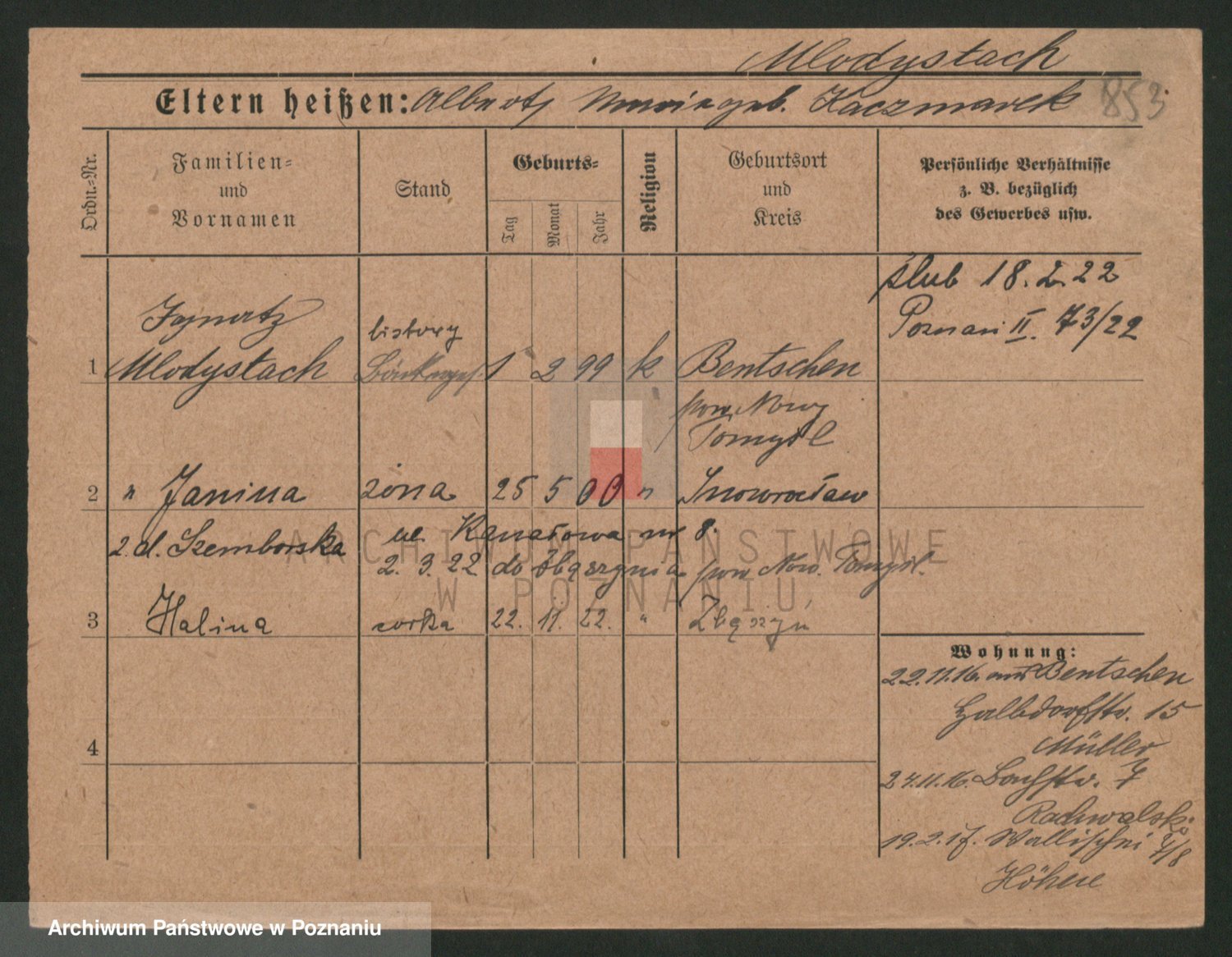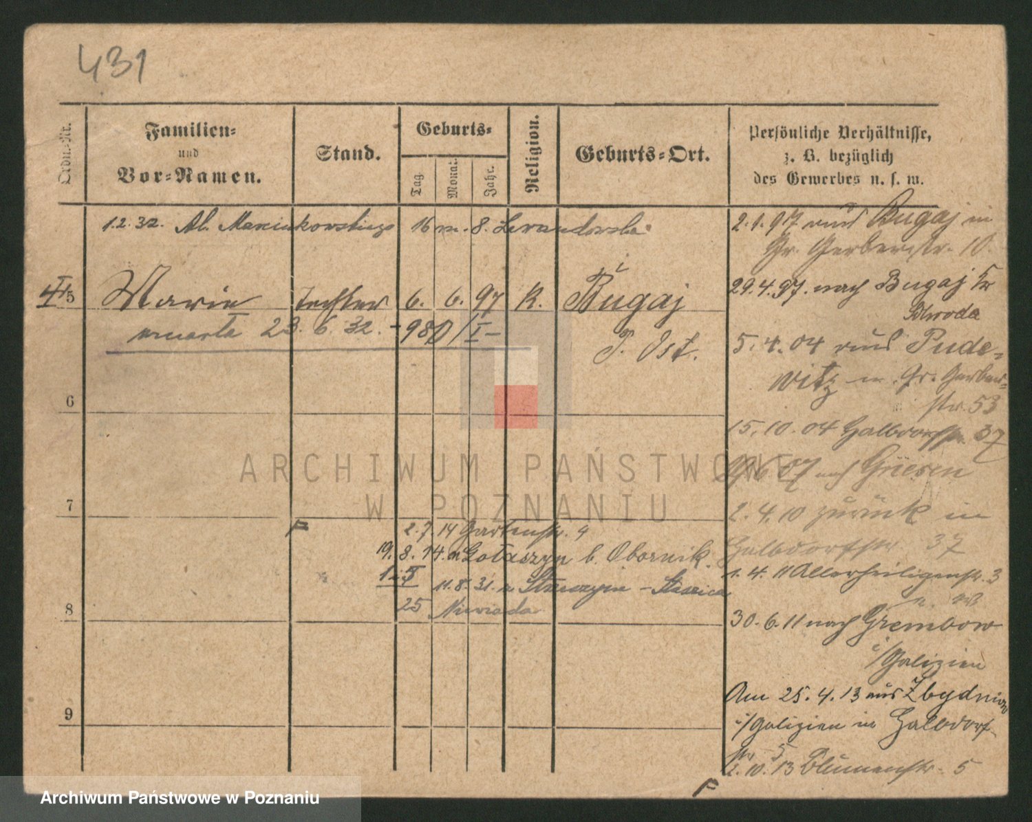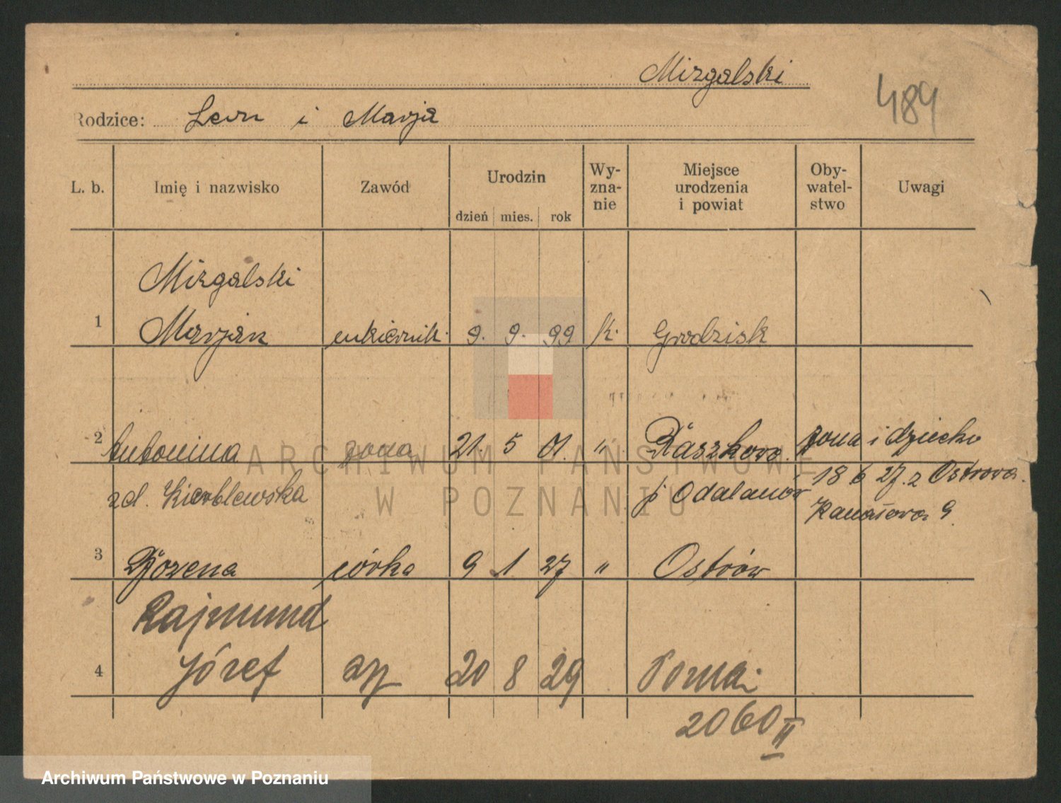 Podgląd karty osobowej dostępny jest po kliknięciu na nazwisko lub ikonkę karty. Można dokonywać powiększenia (ikony na górze) lub przechodzić między kolejnymi skanami (strzałki po bokach).