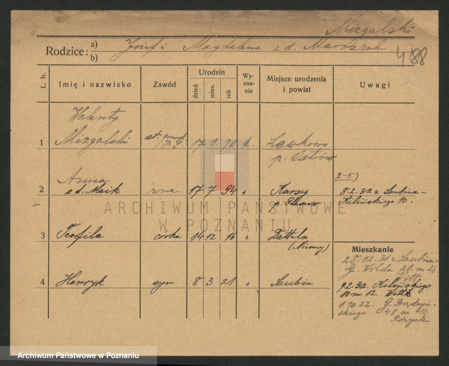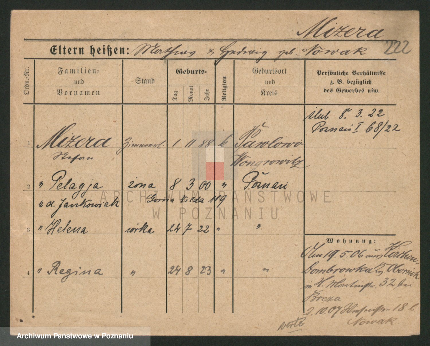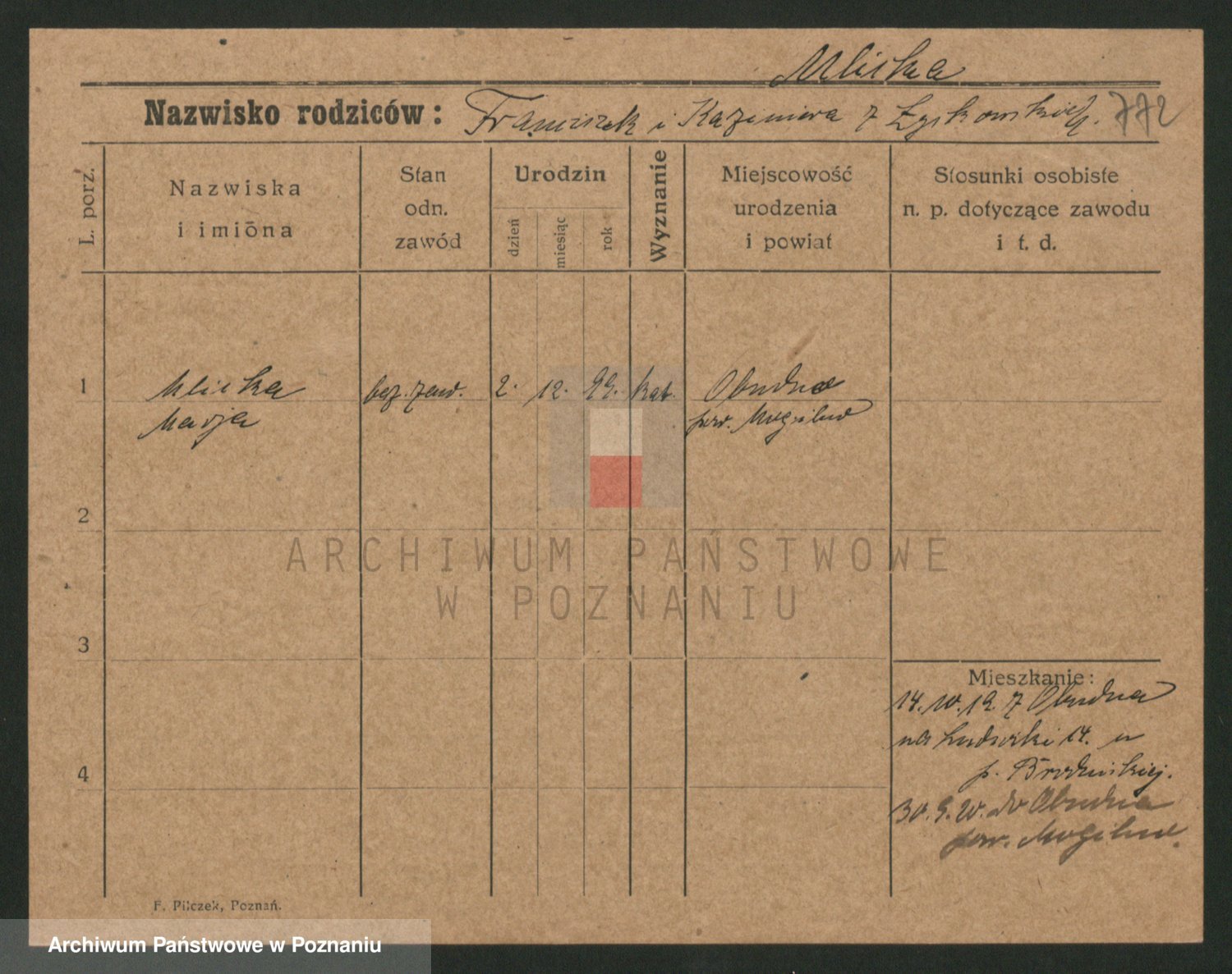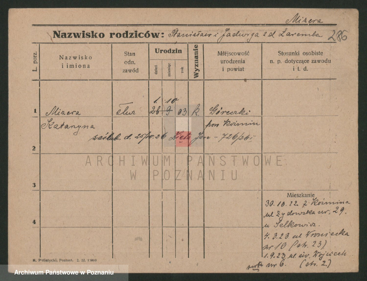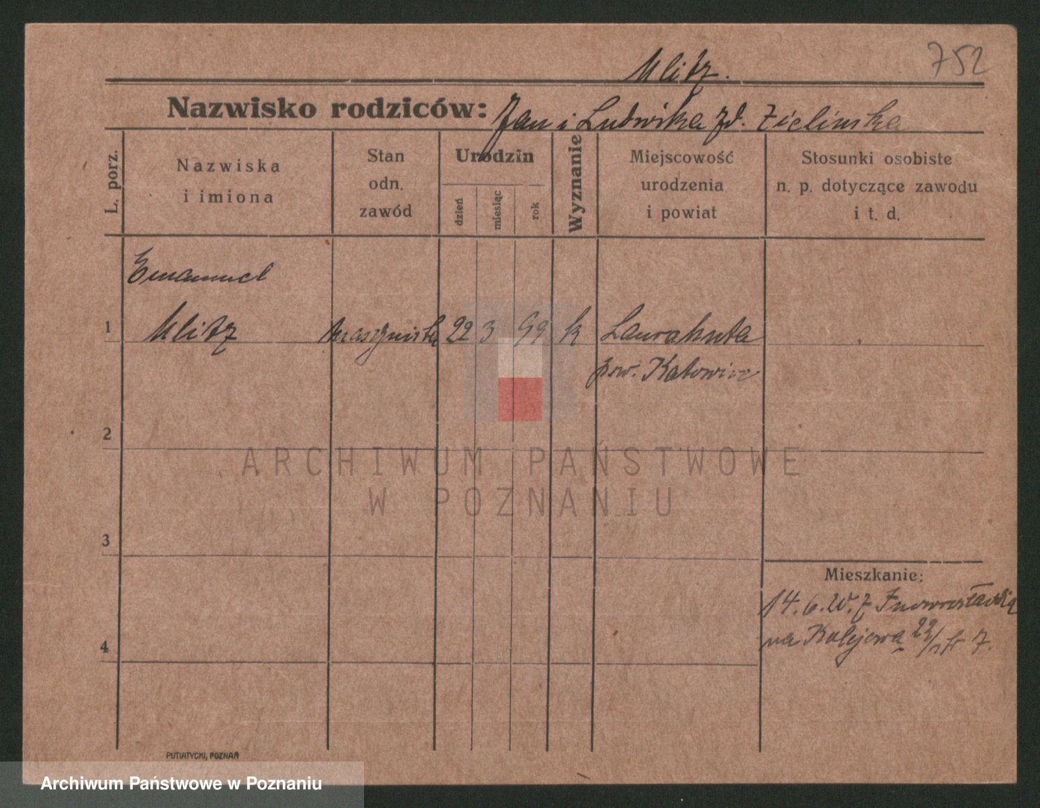 Podgląd karty osobowej dostępny jest po kliknięciu na nazwisko lub ikonkę karty. Można dokonywać powiększenia (ikony na górze) lub przechodzić między kolejnymi skanami (strzałki po bokach).