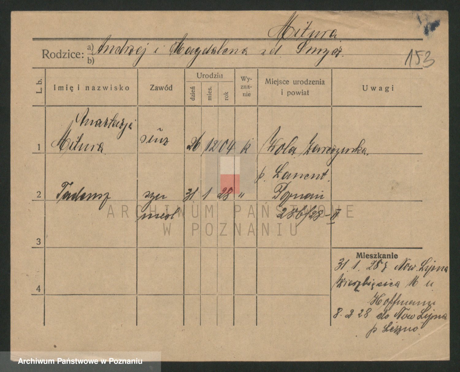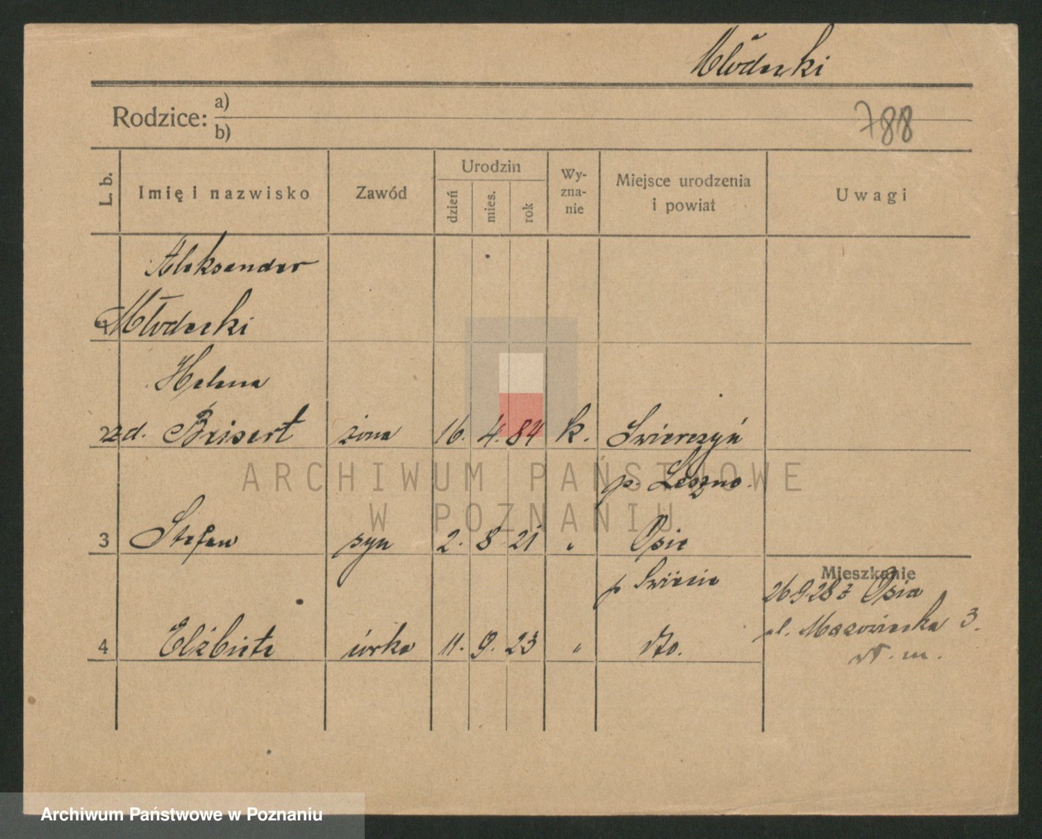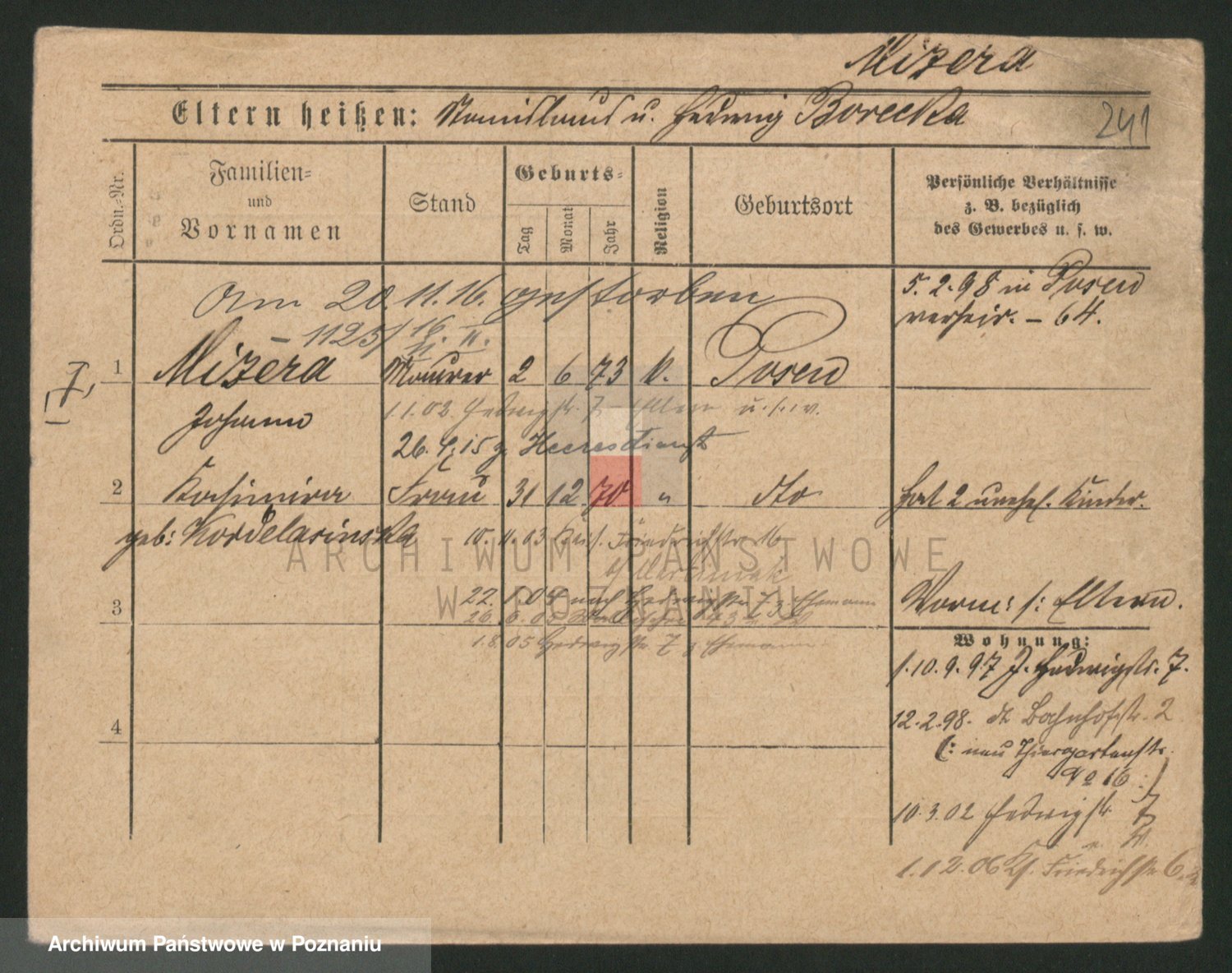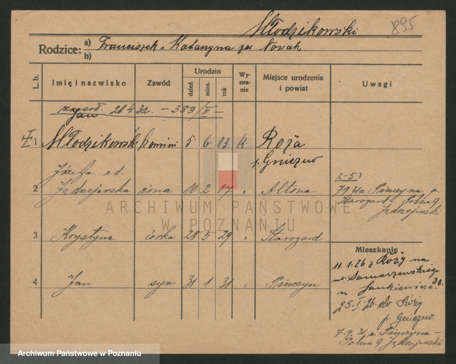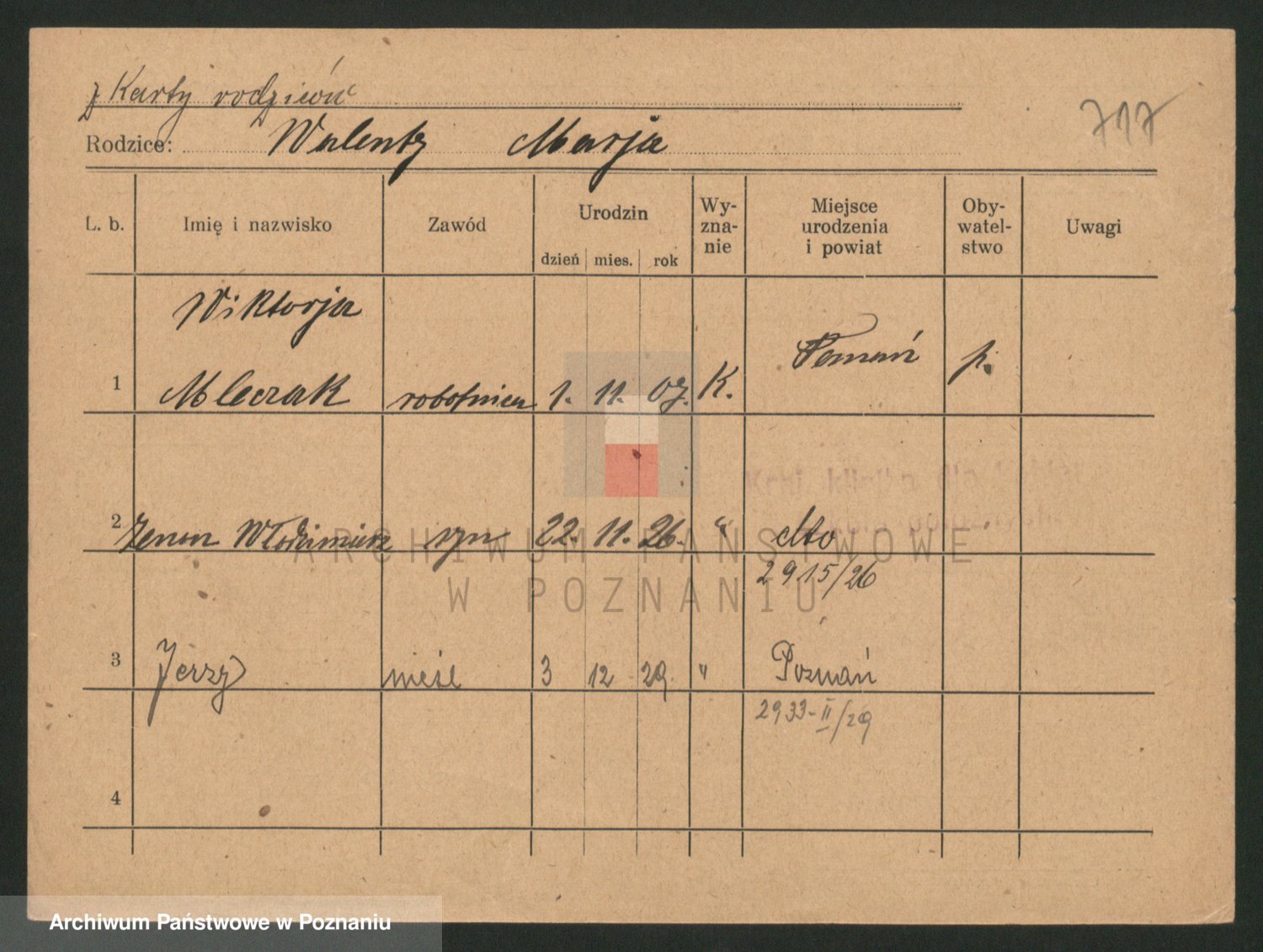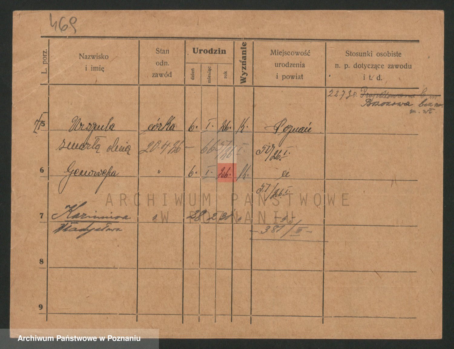 Podgląd karty osobowej dostępny jest po kliknięciu na nazwisko lub ikonkę karty. Można dokonywać powiększenia (ikony na górze) lub przechodzić między kolejnymi skanami (strzałki po bokach).