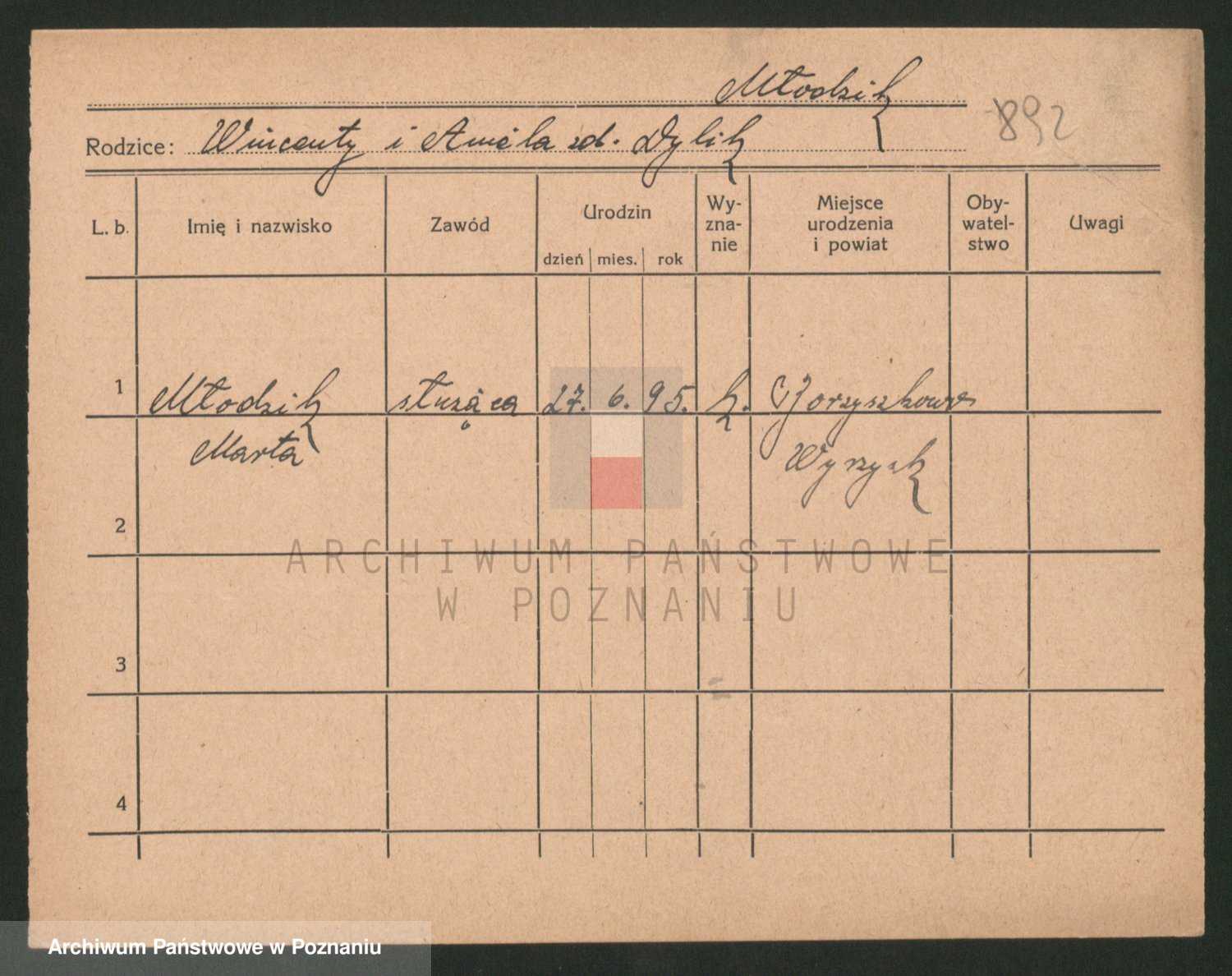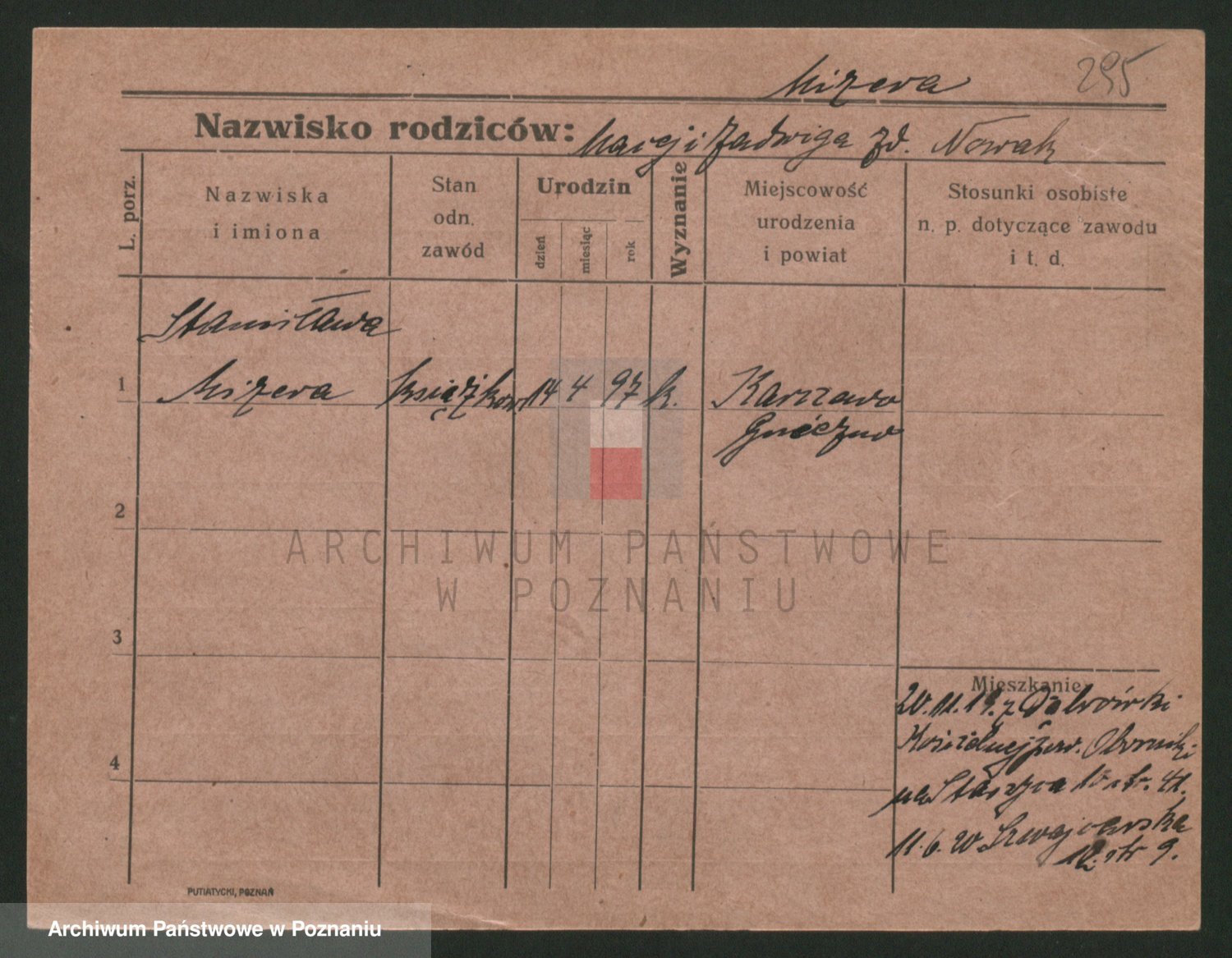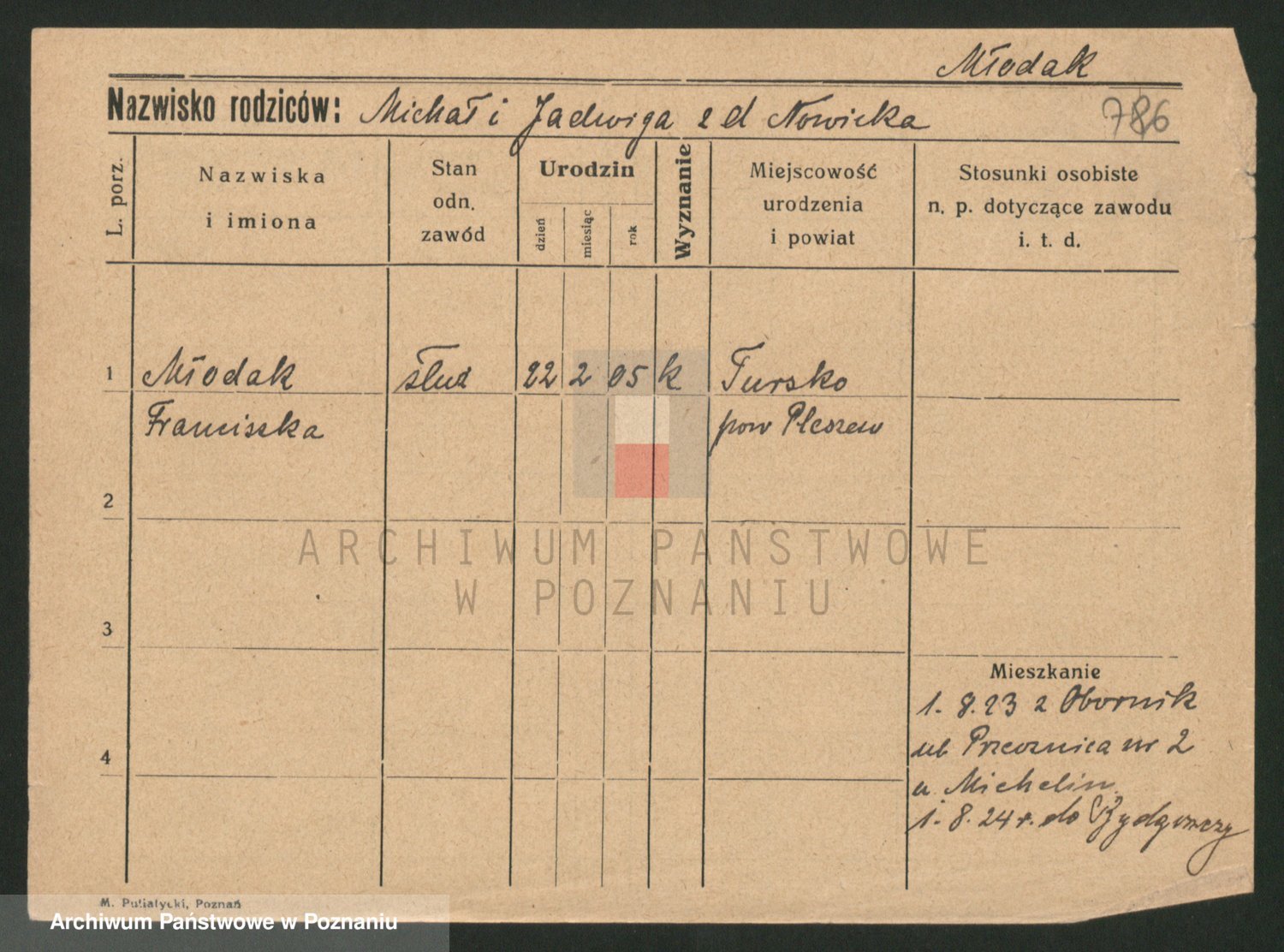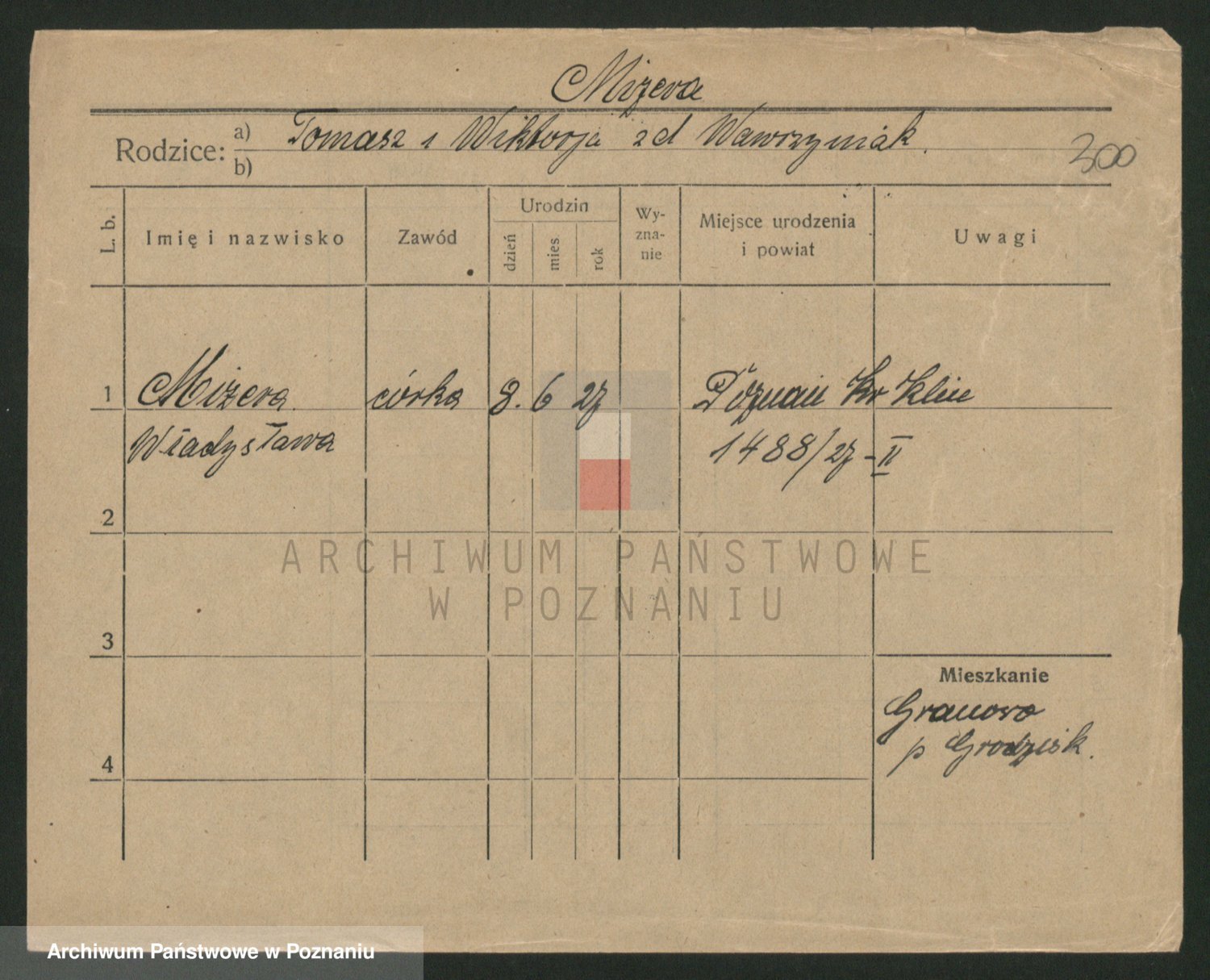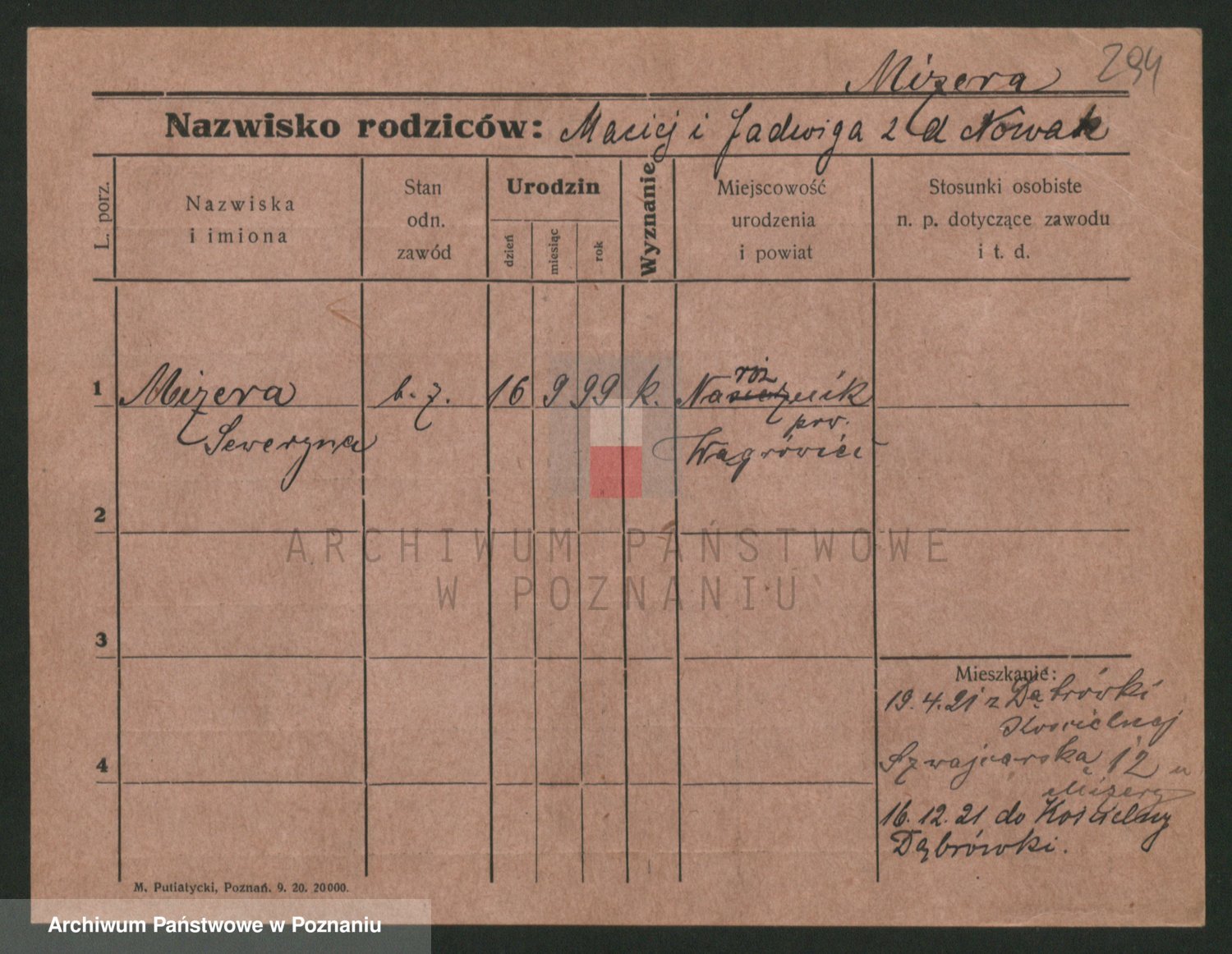 Podgląd karty osobowej dostępny jest po kliknięciu na nazwisko lub ikonkę karty. Można dokonywać powiększenia (ikony na górze) lub przechodzić między kolejnymi skanami (strzałki po bokach).