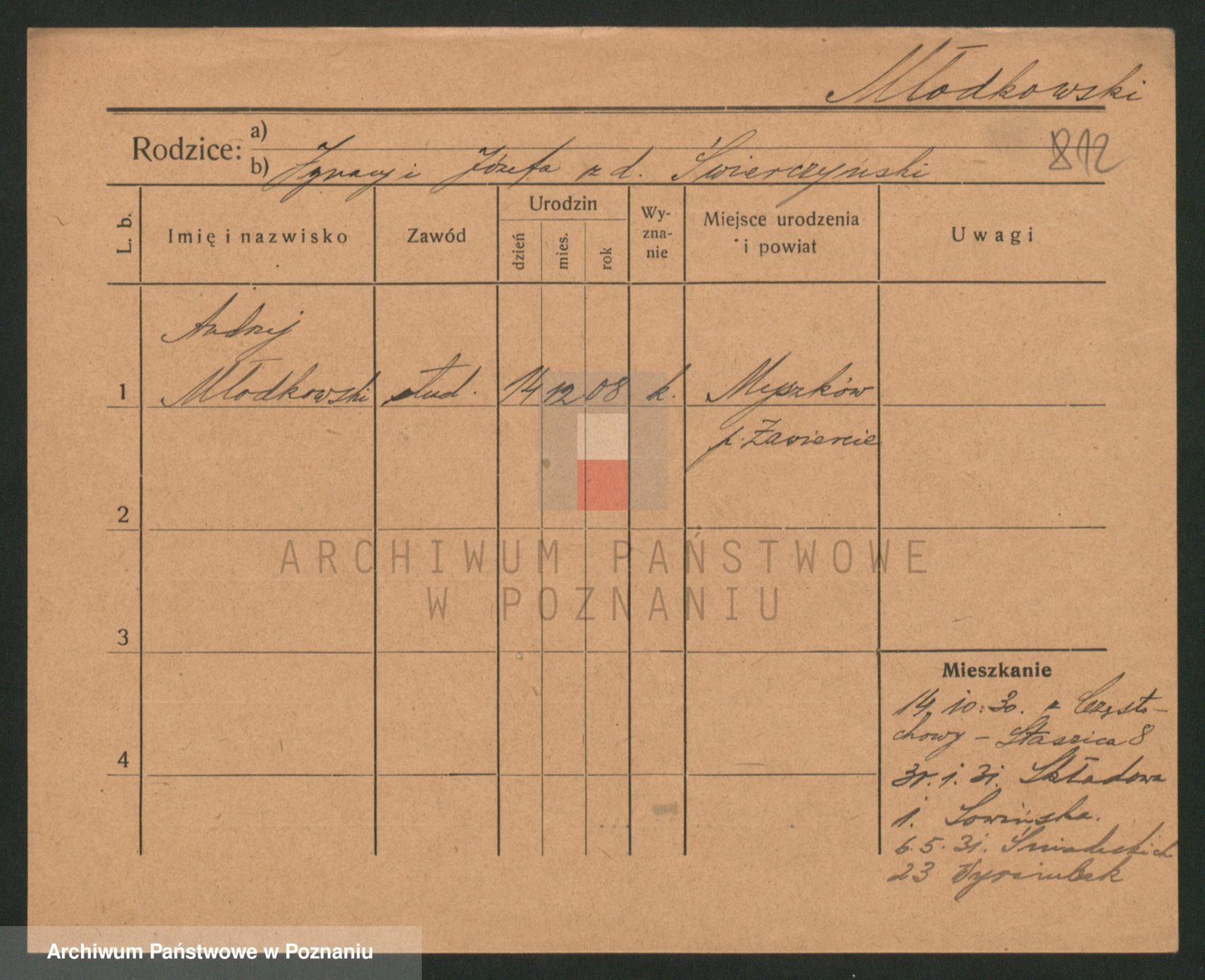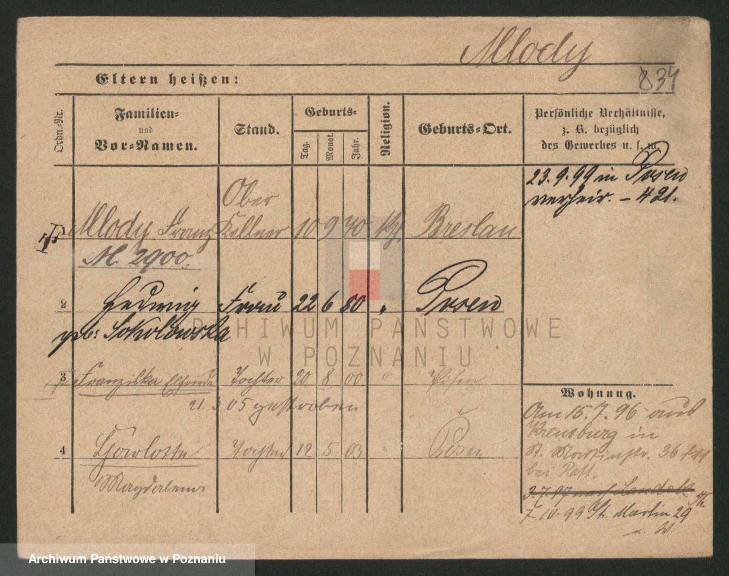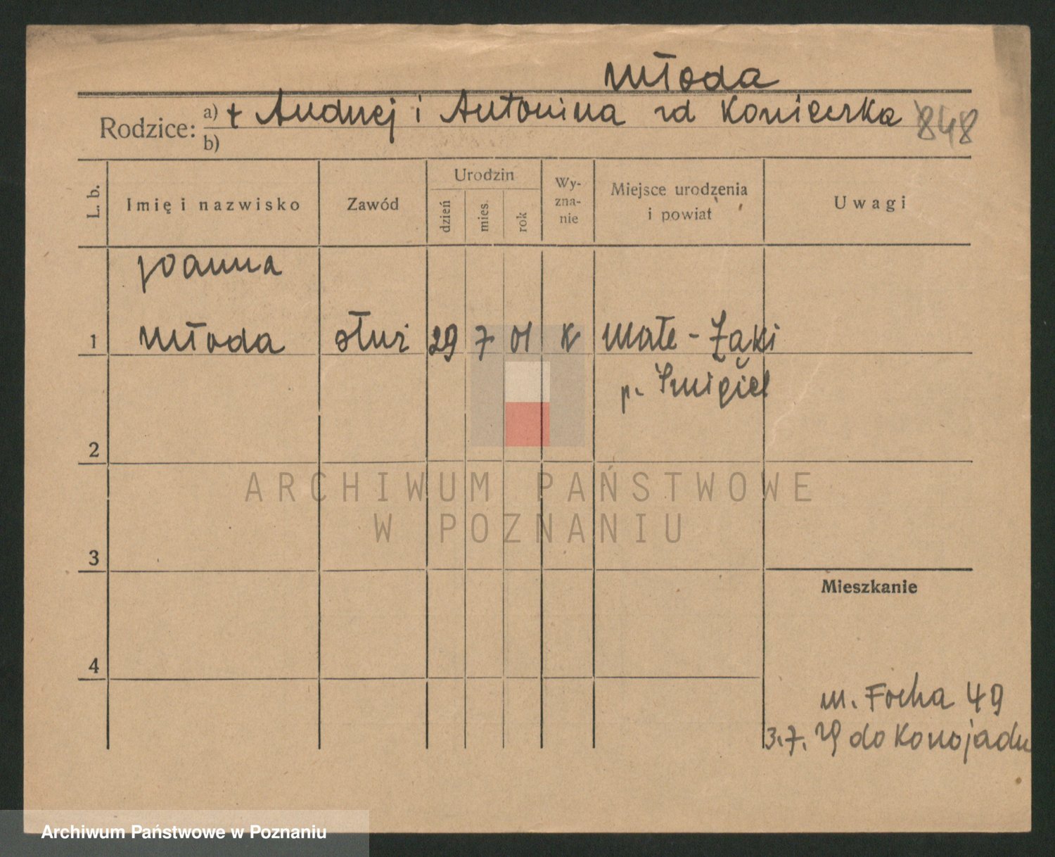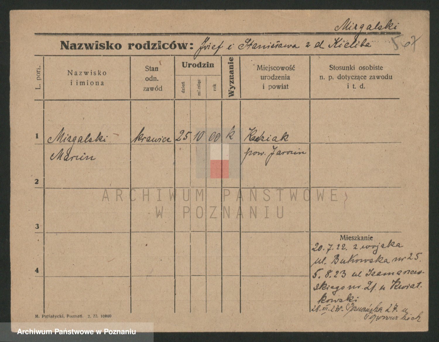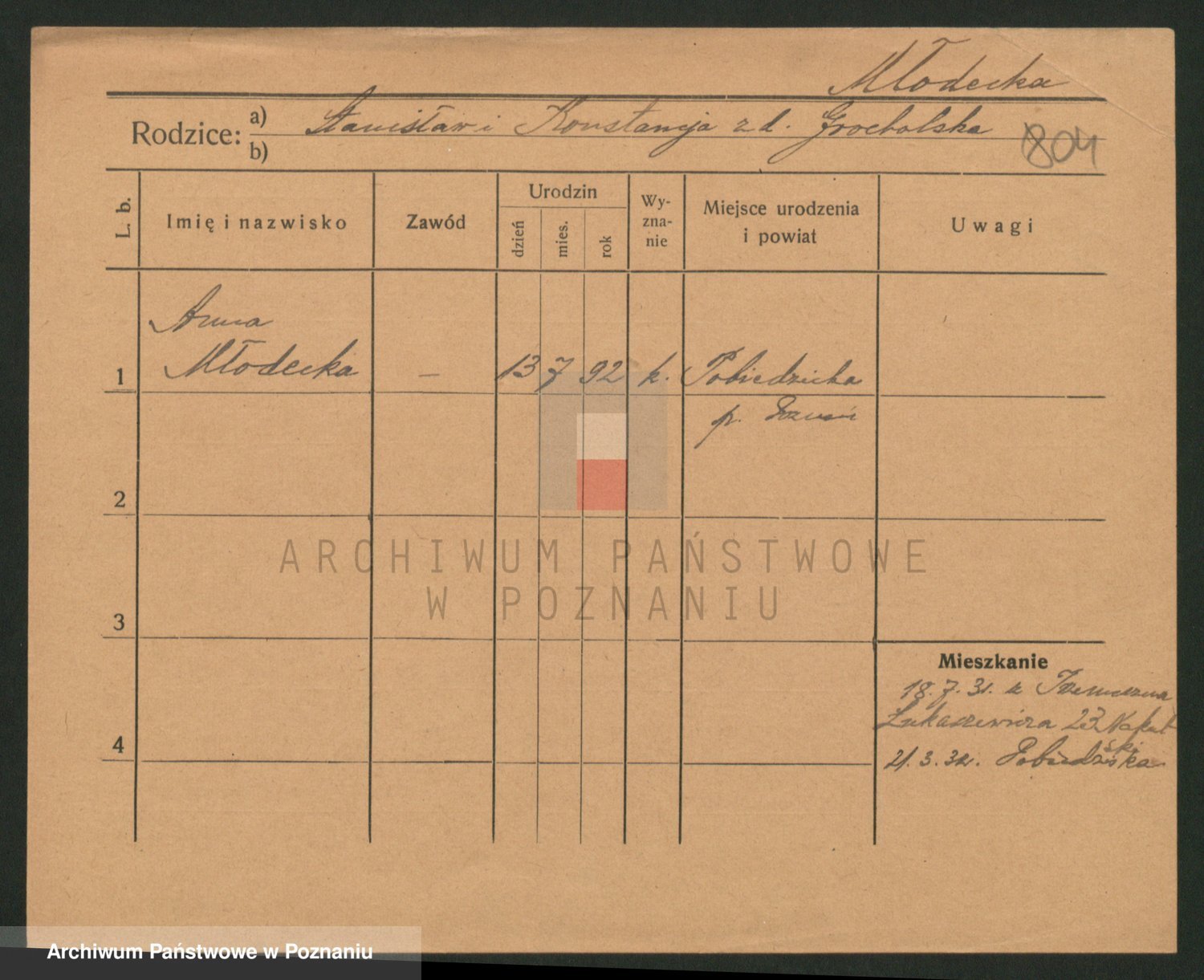 Podgląd karty osobowej dostępny jest po kliknięciu na nazwisko lub ikonkę karty. Można dokonywać powiększenia (ikony na górze) lub przechodzić między kolejnymi skanami (strzałki po bokach).