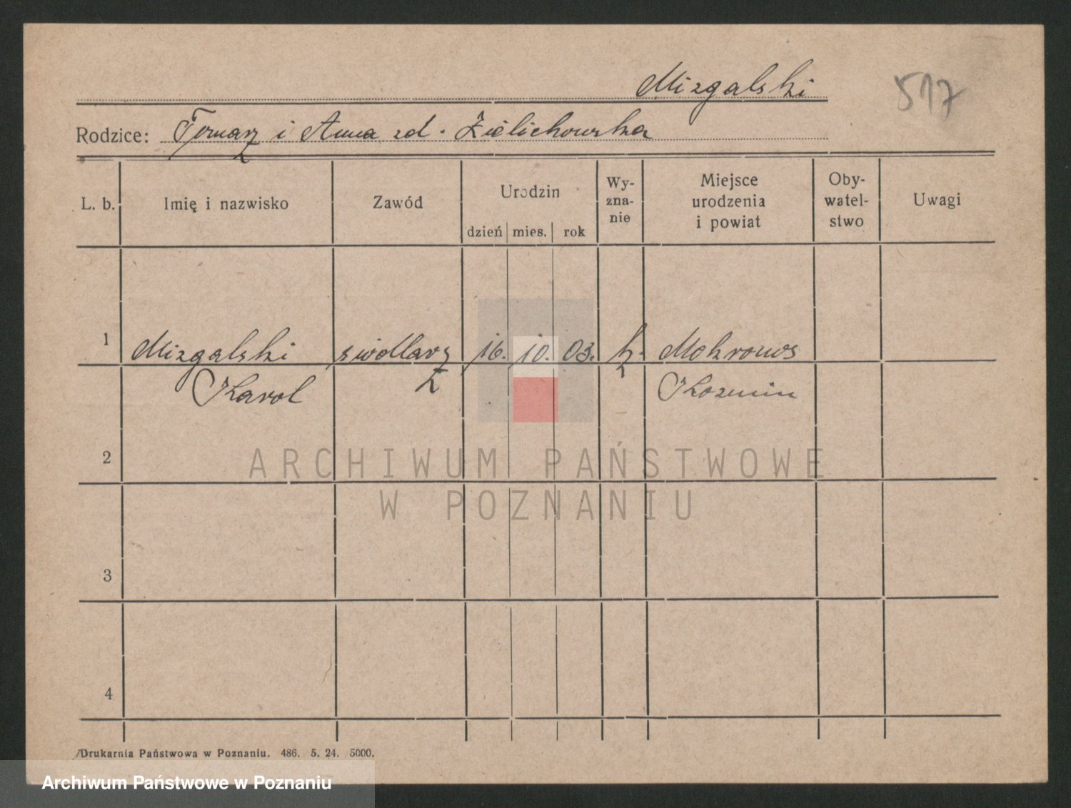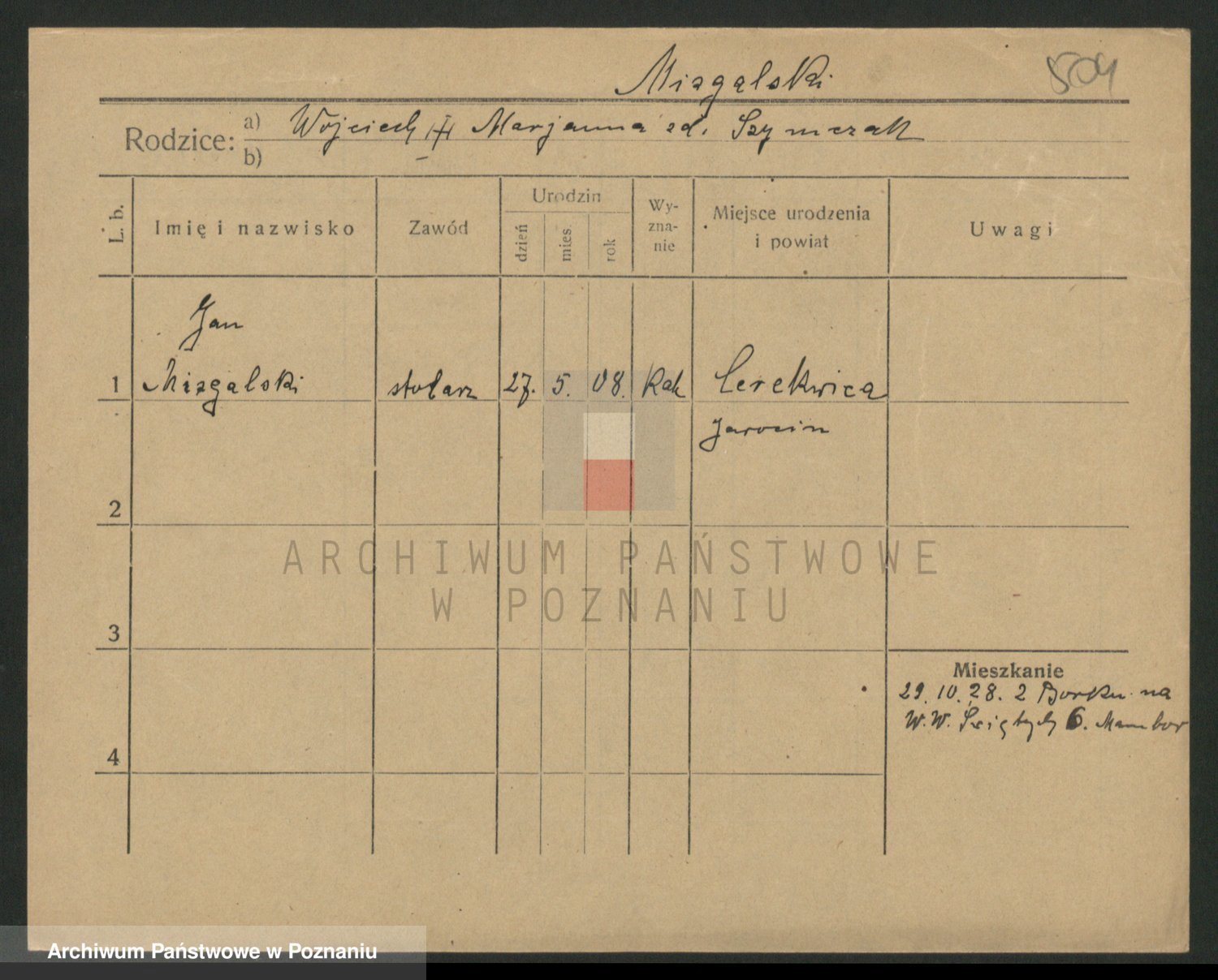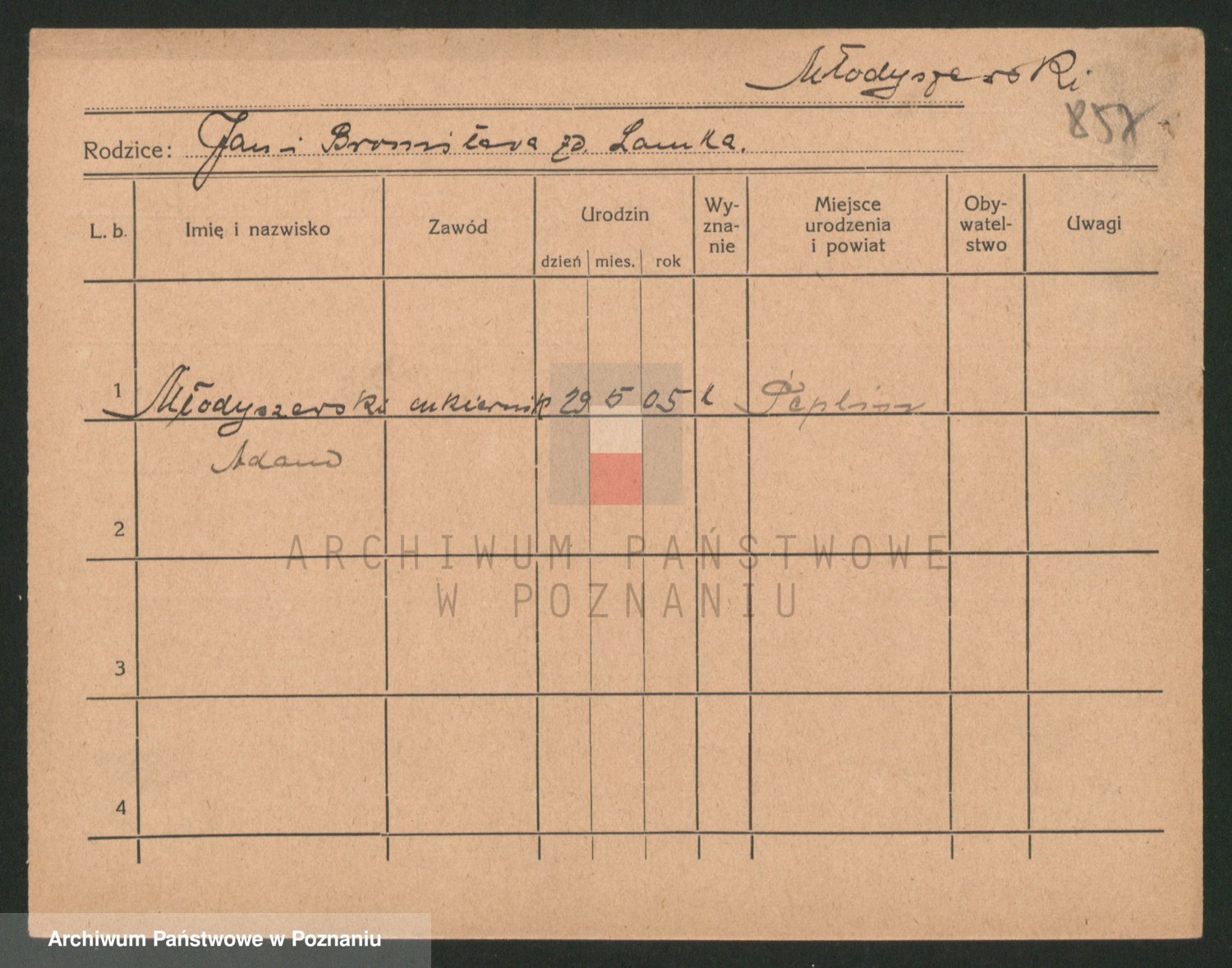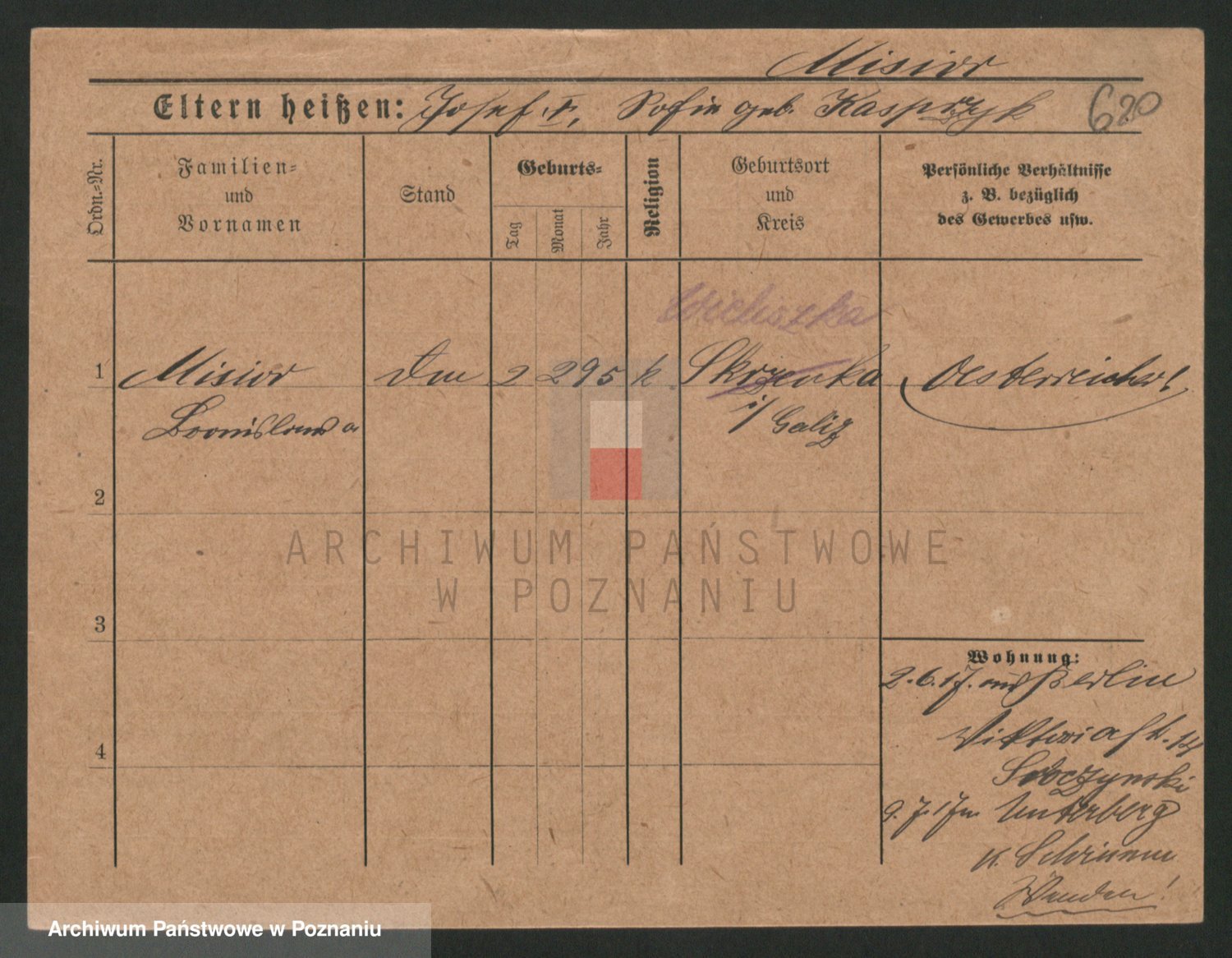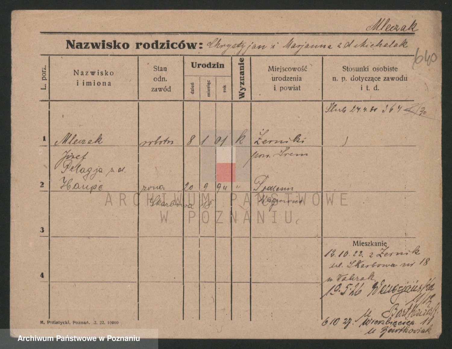 Podgląd karty osobowej dostępny jest po kliknięciu na nazwisko lub ikonkę karty. Można dokonywać powiększenia (ikony na górze) lub przechodzić między kolejnymi skanami (strzałki po bokach).