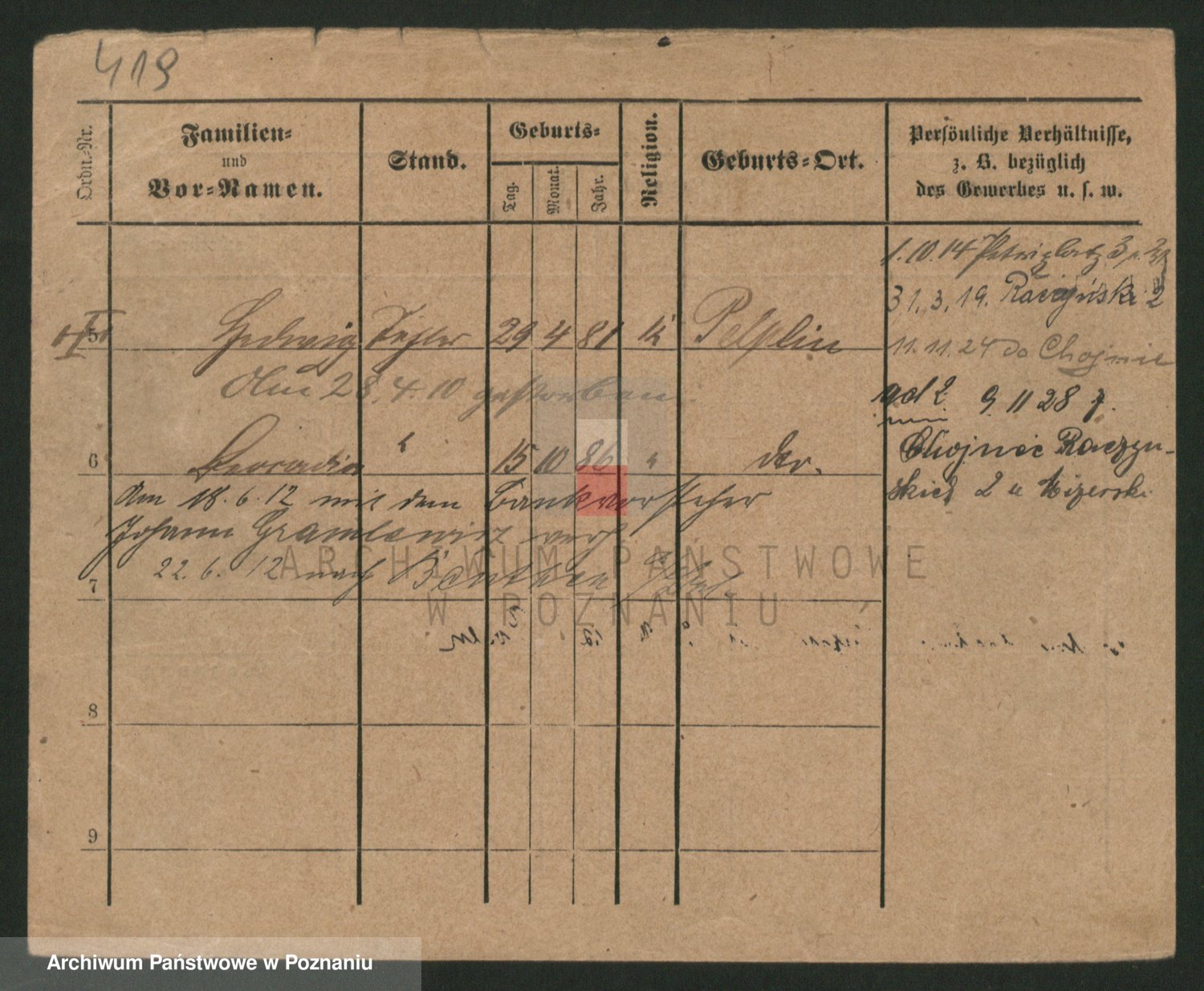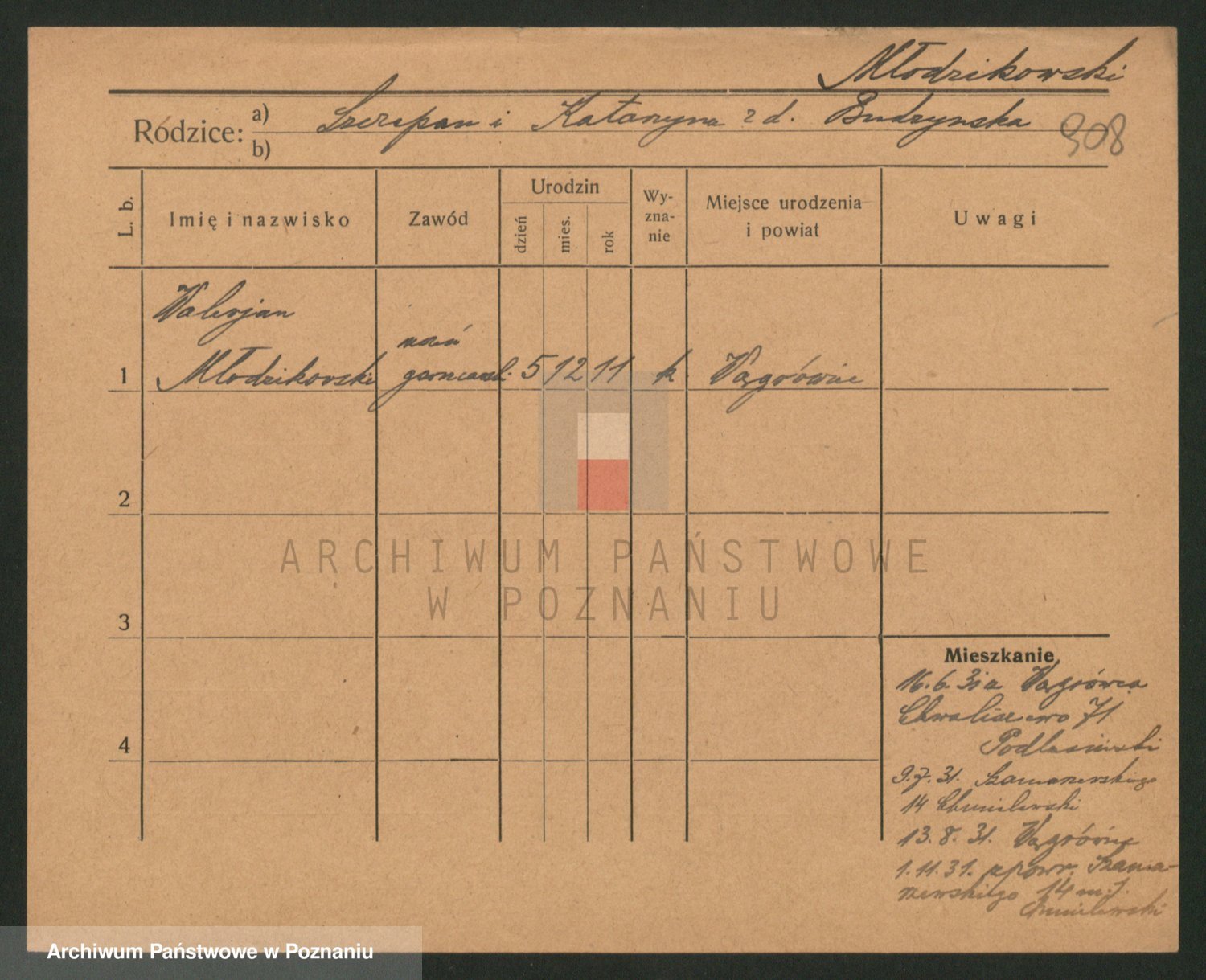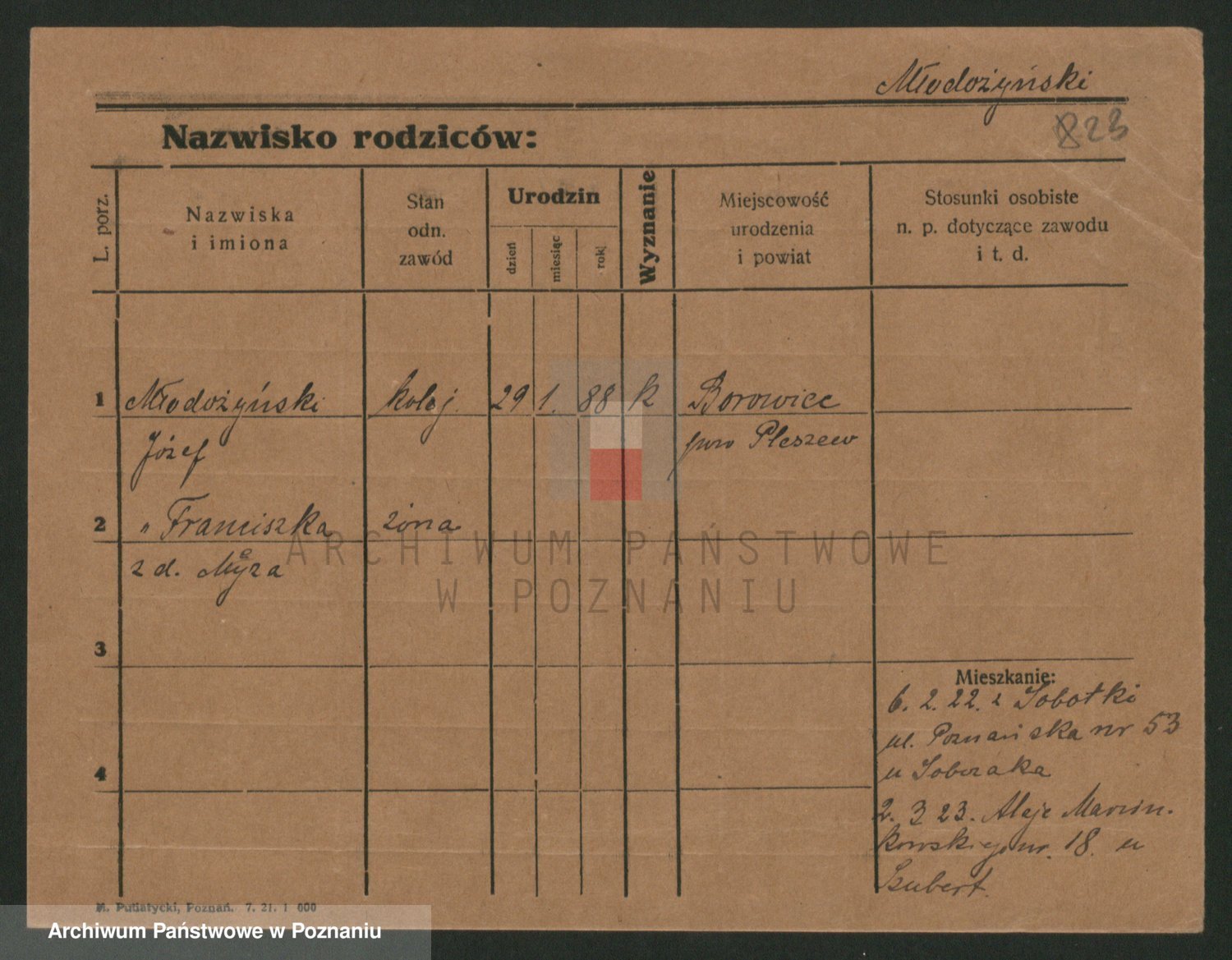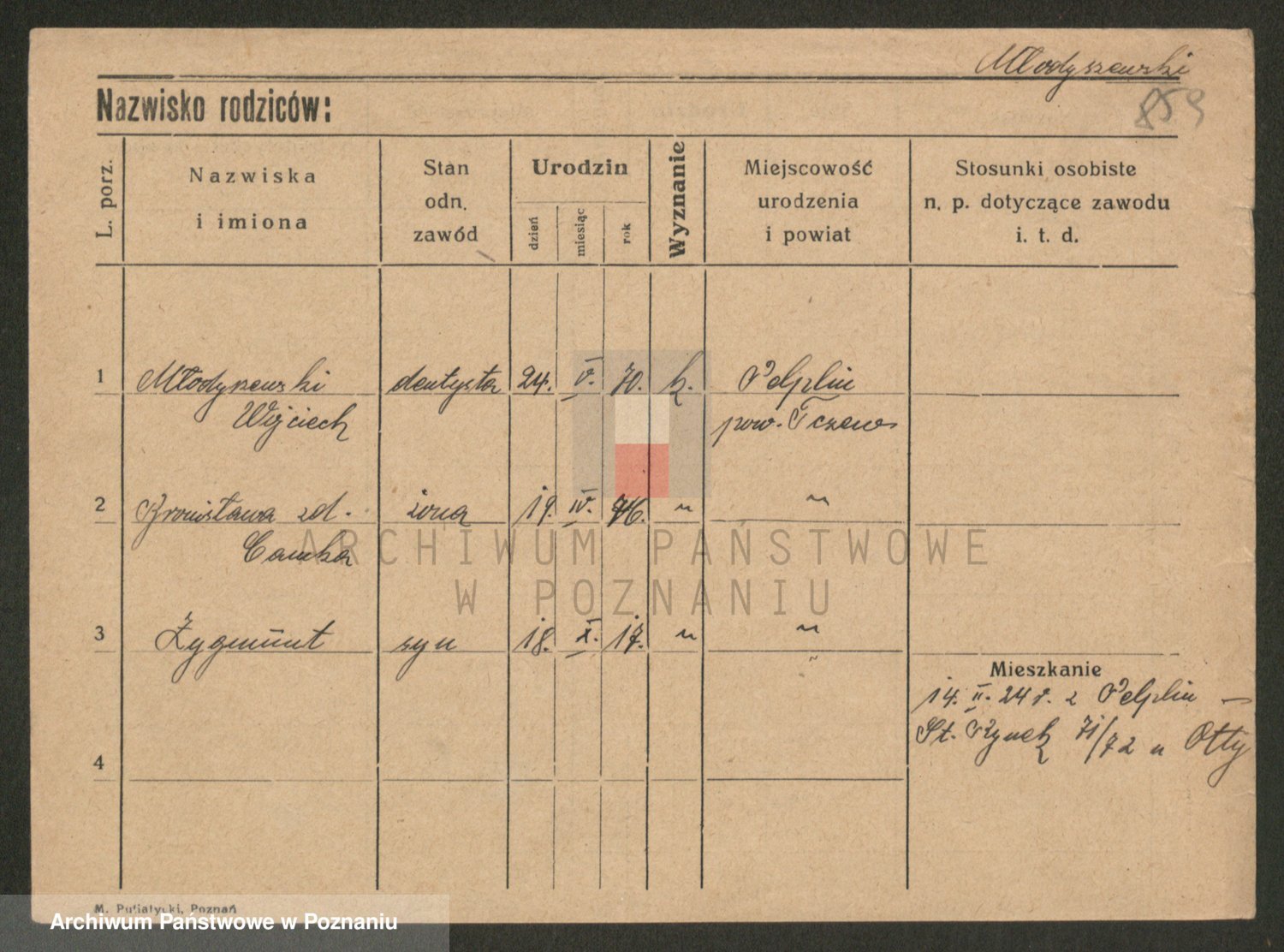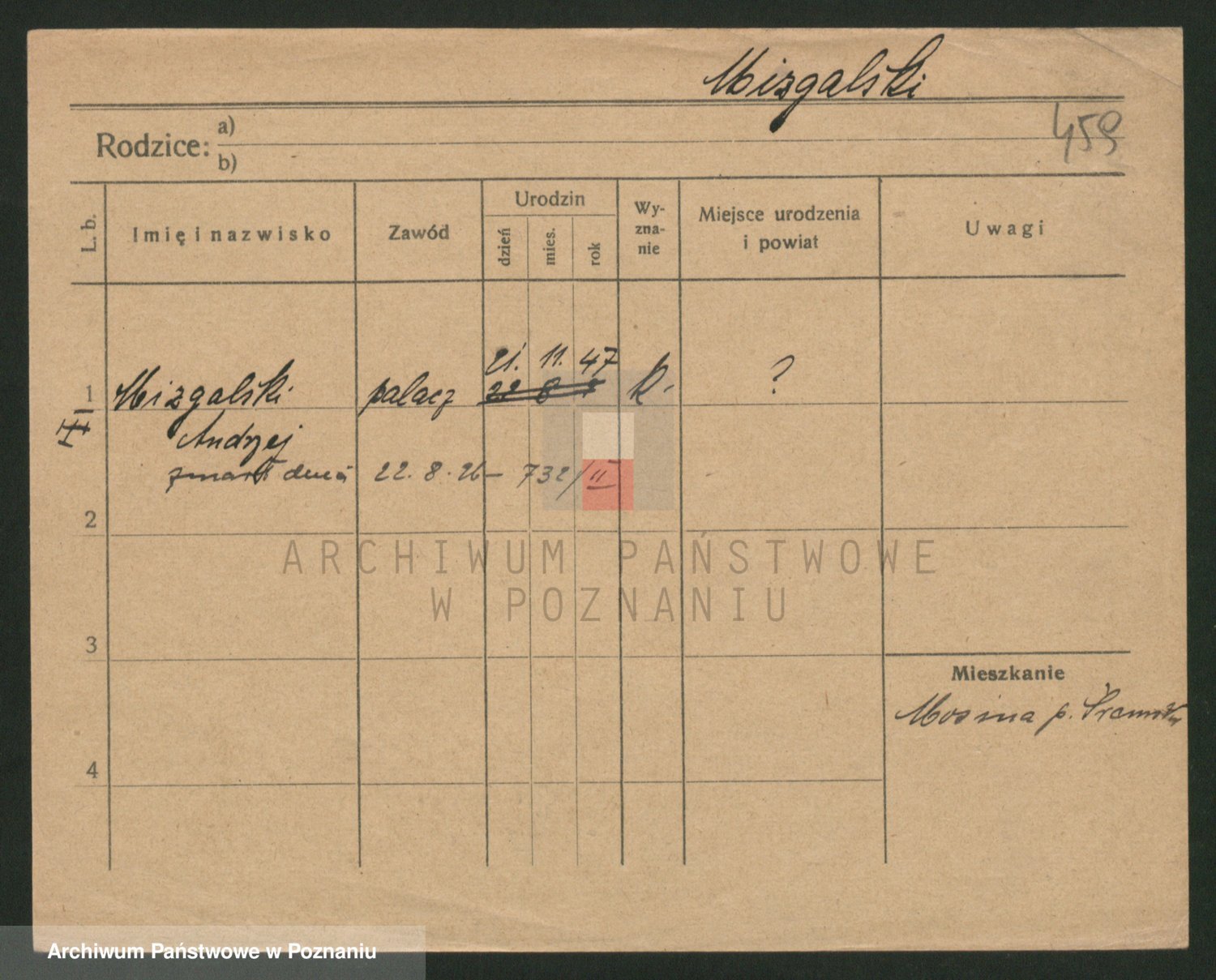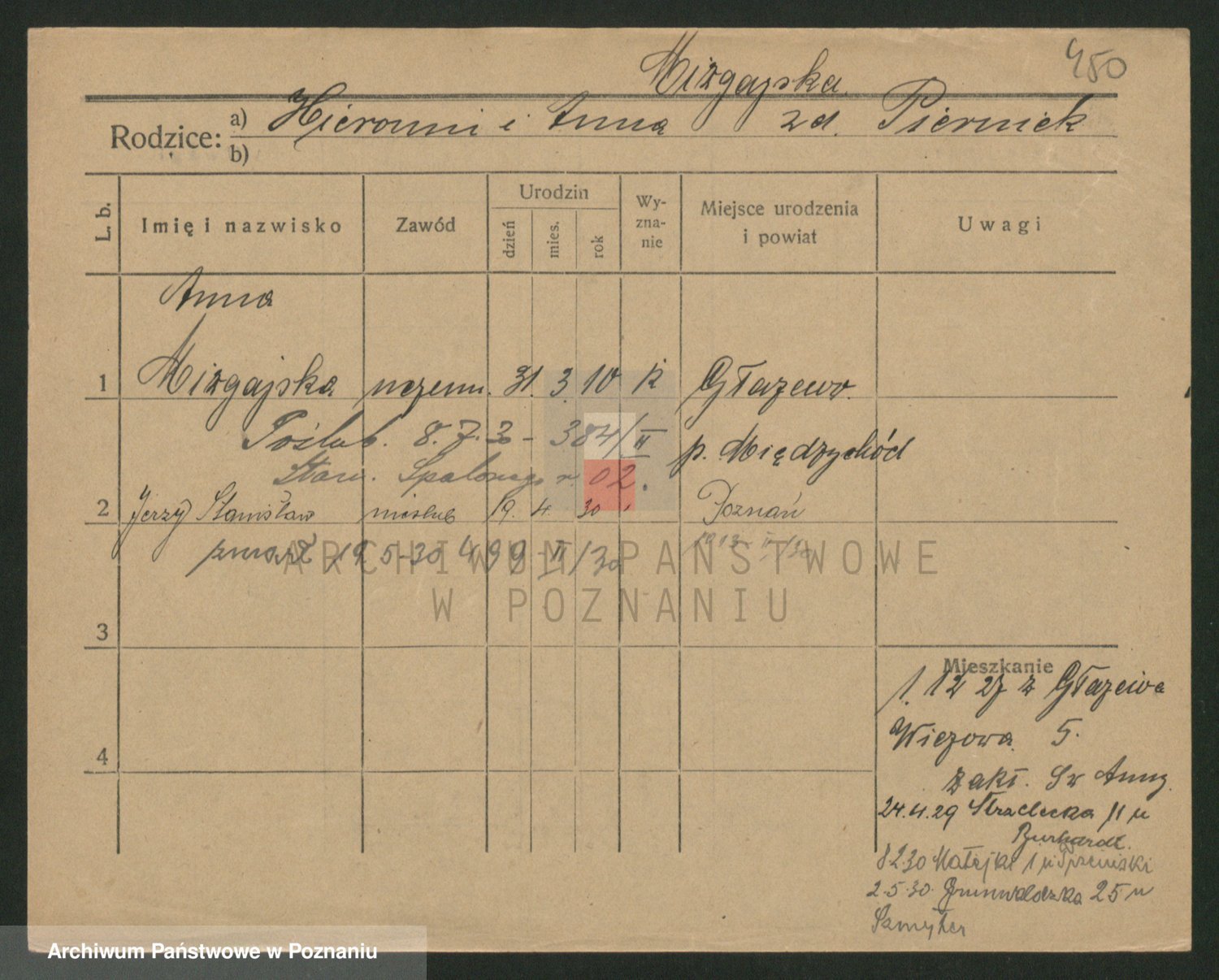 Podgląd karty osobowej dostępny jest po kliknięciu na nazwisko lub ikonkę karty. Można dokonywać powiększenia (ikony na górze) lub przechodzić między kolejnymi skanami (strzałki po bokach).
