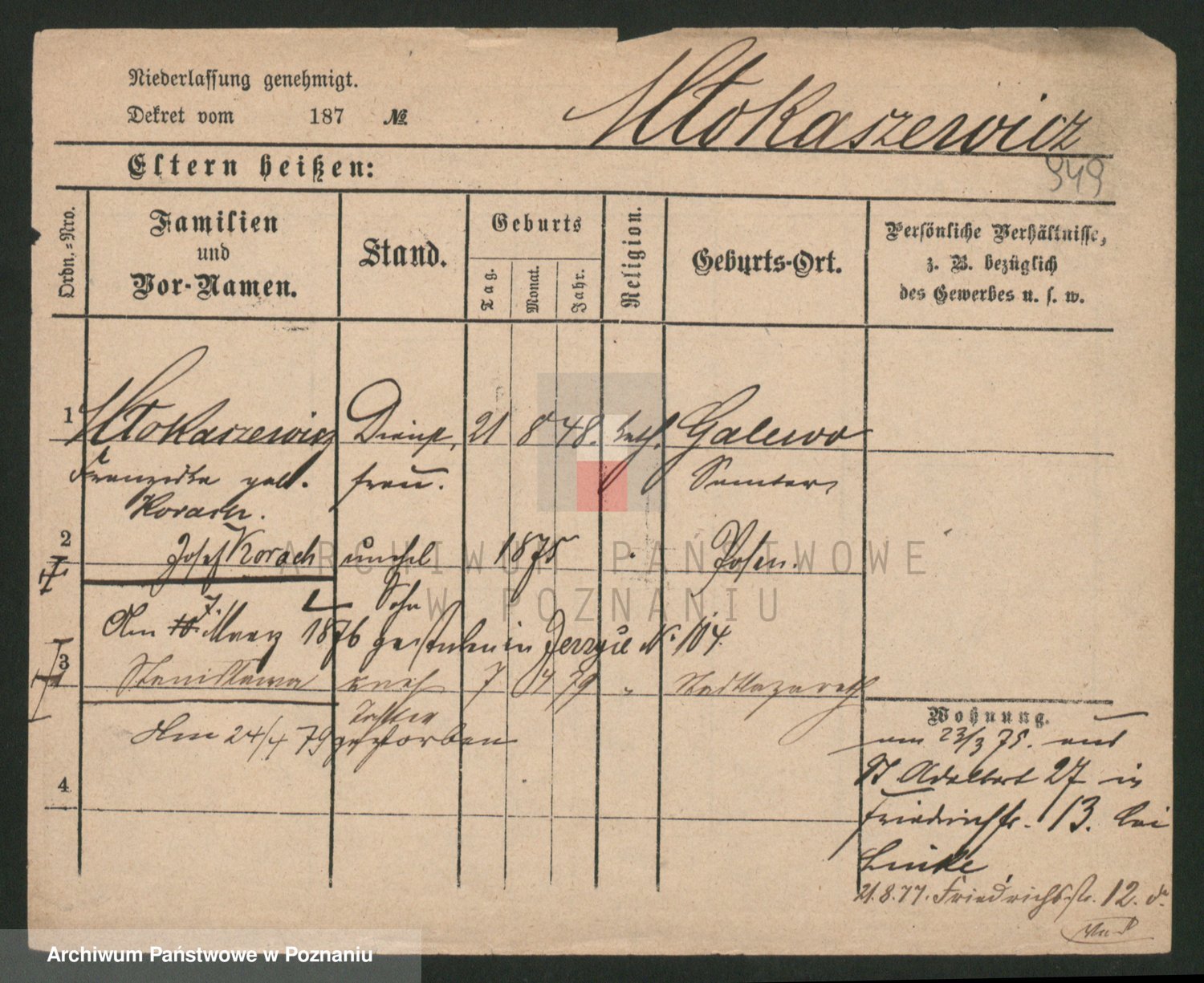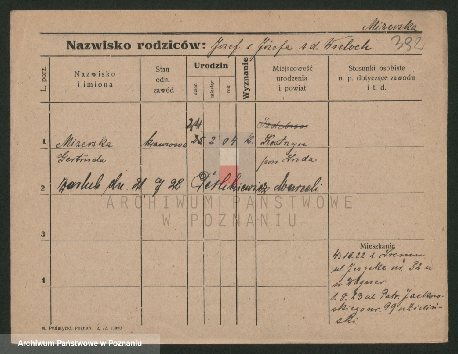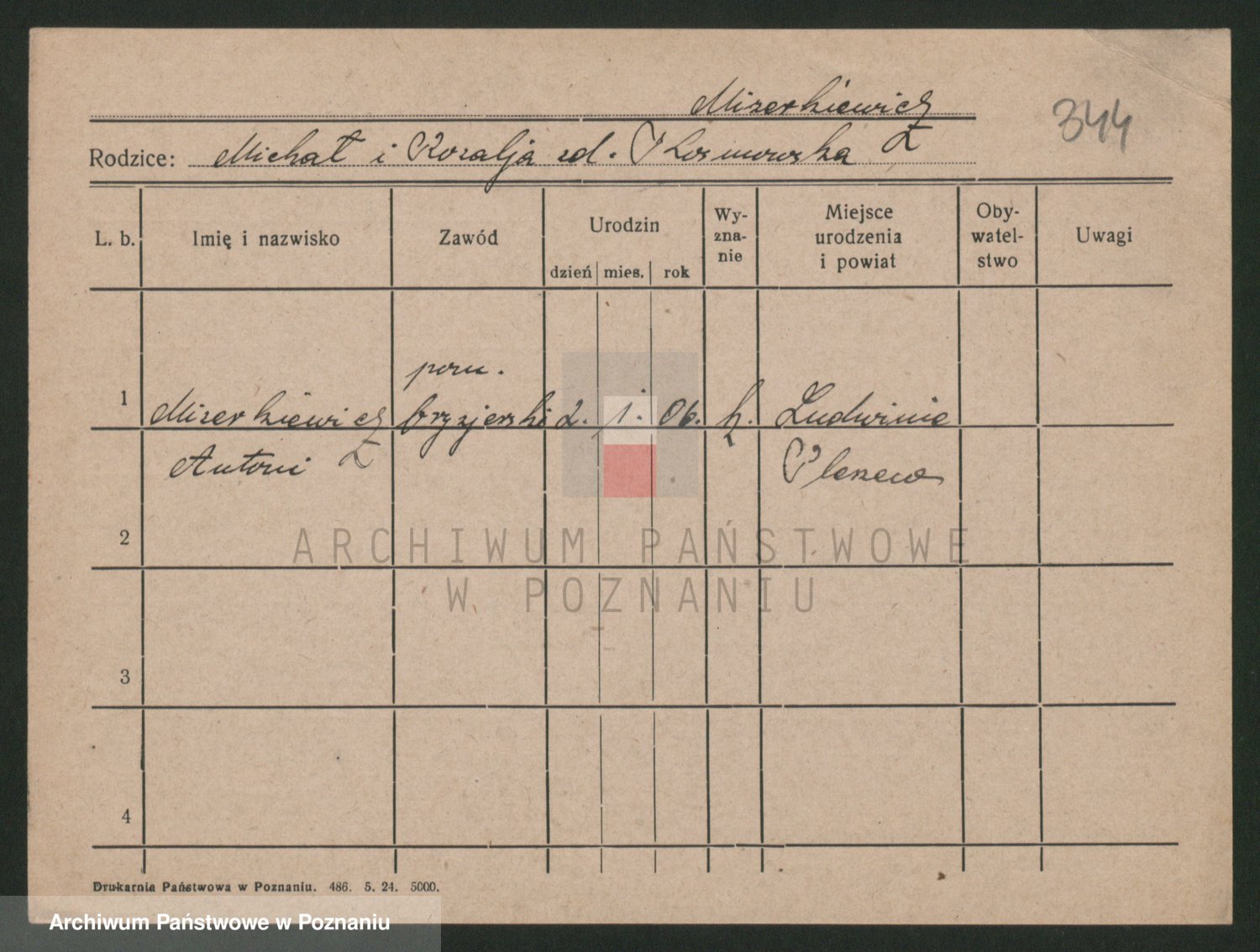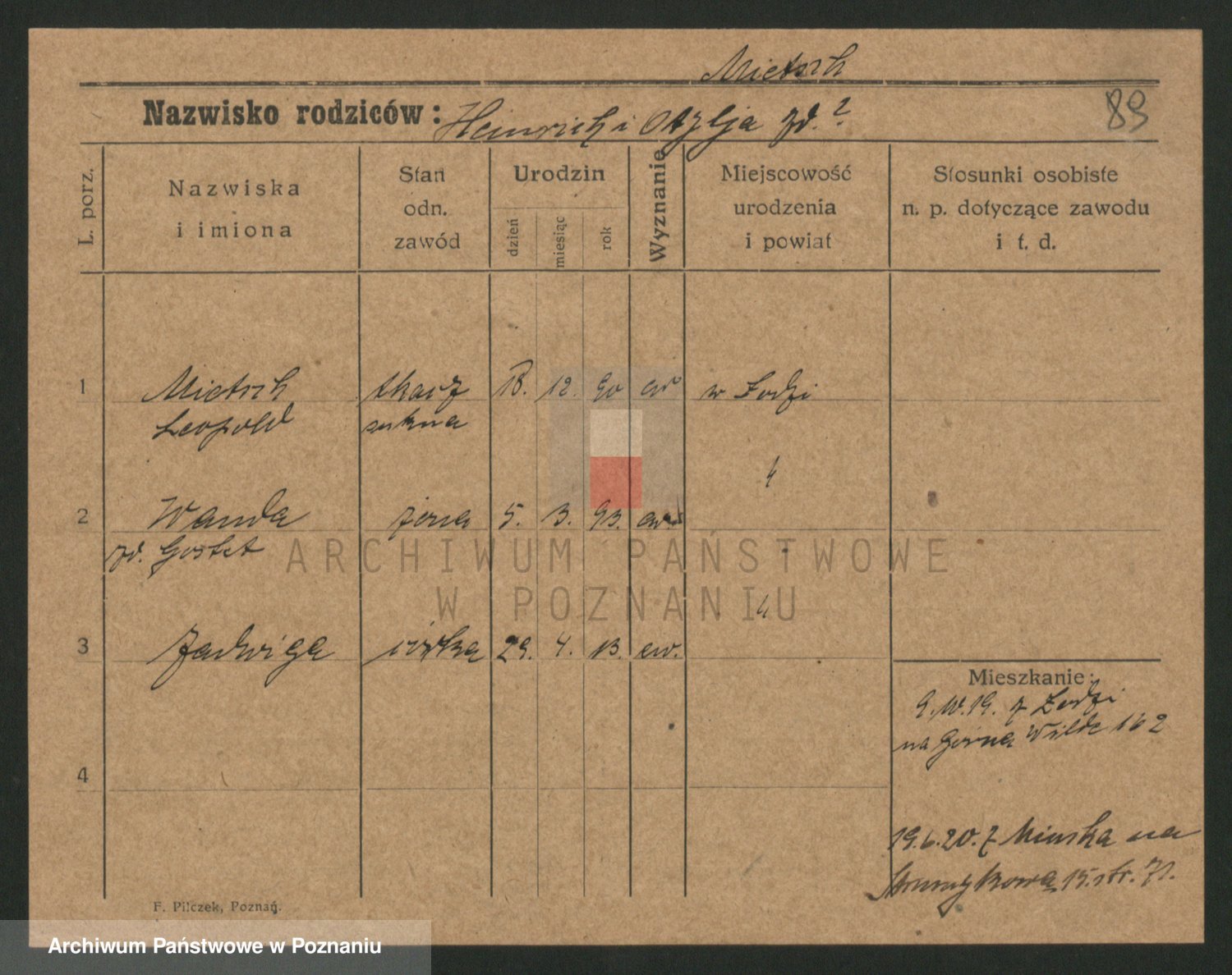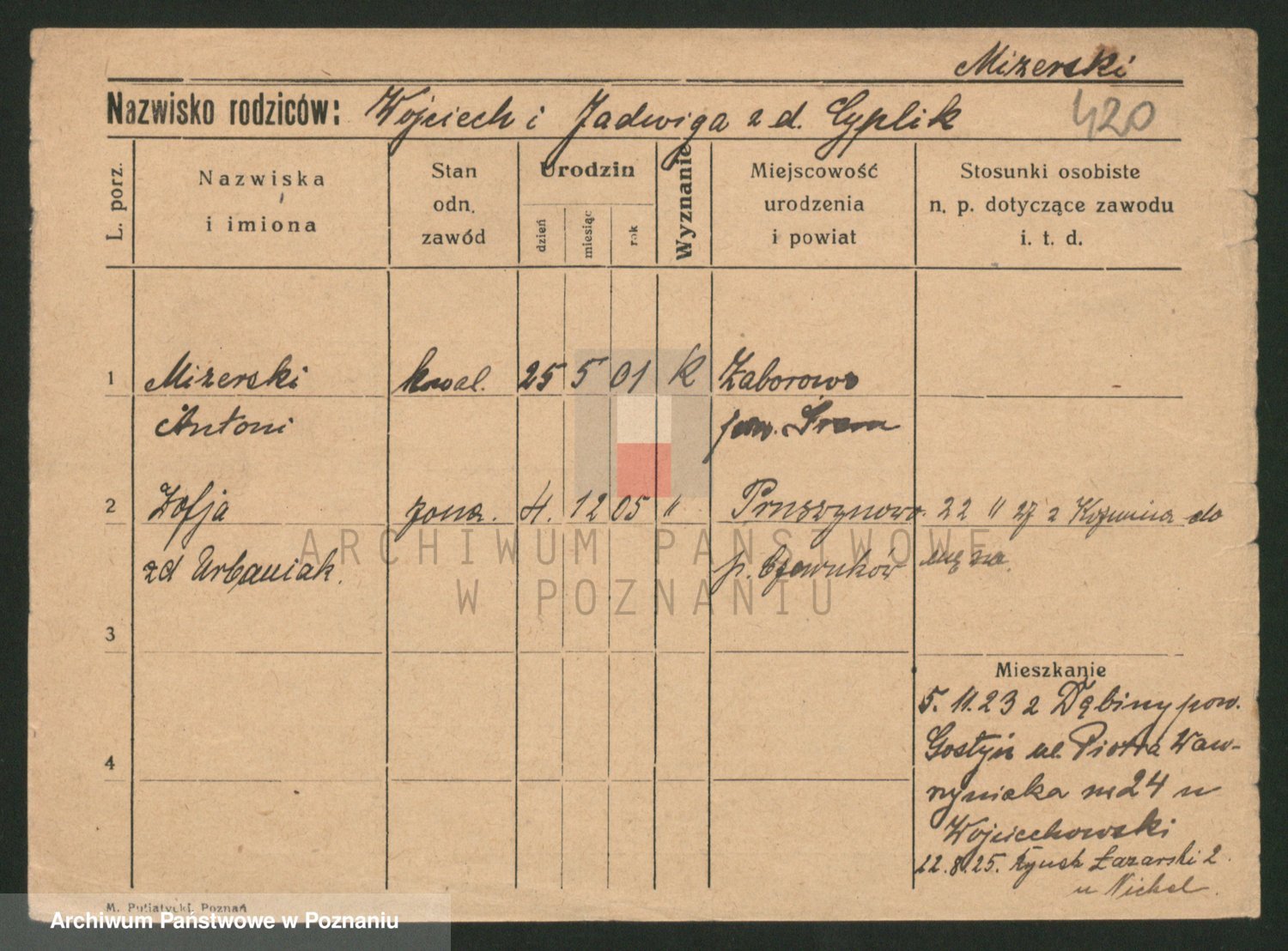 Podgląd karty osobowej dostępny jest po kliknięciu na nazwisko lub ikonkę karty. Można dokonywać powiększenia (ikony na górze) lub przechodzić między kolejnymi skanami (strzałki po bokach).