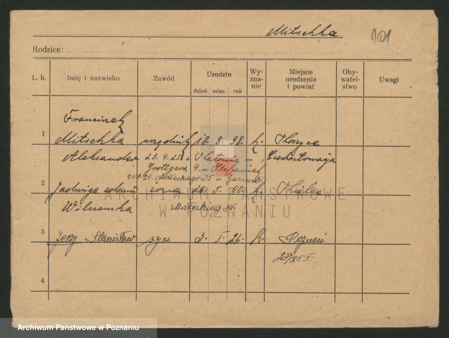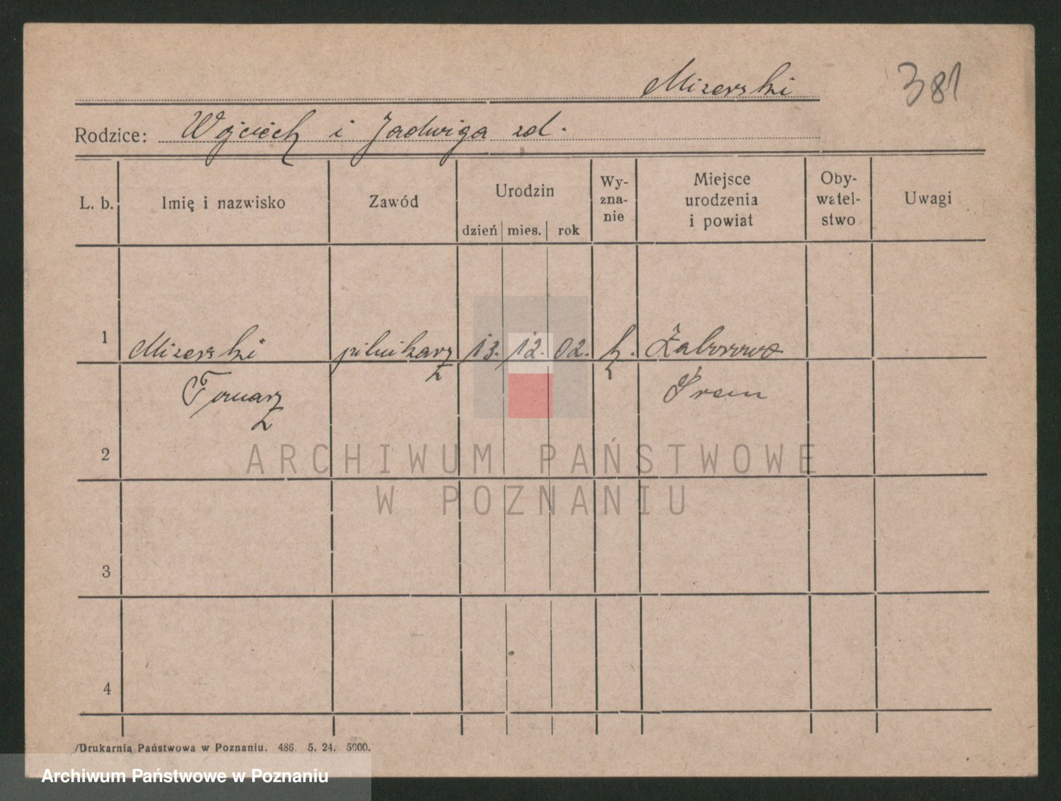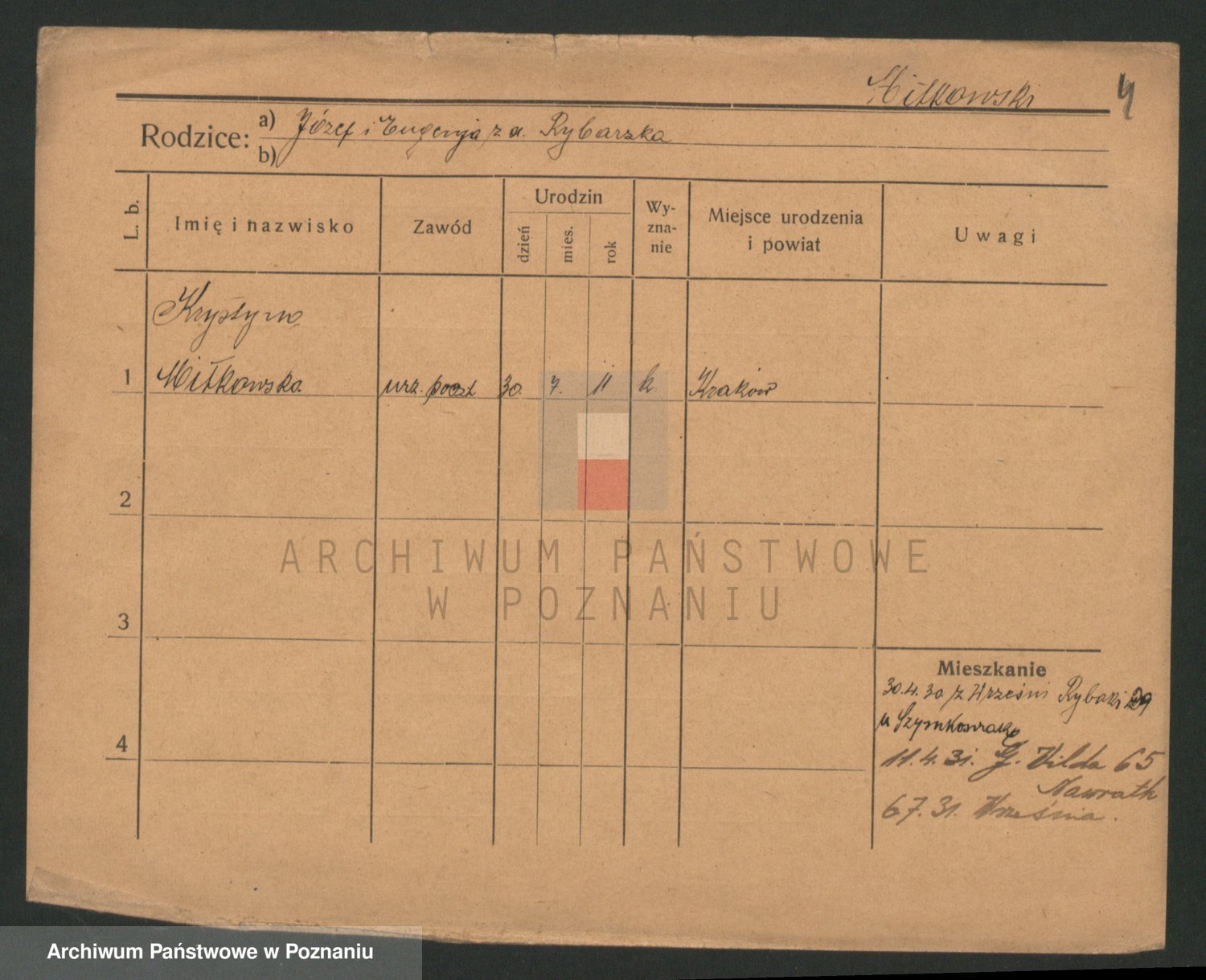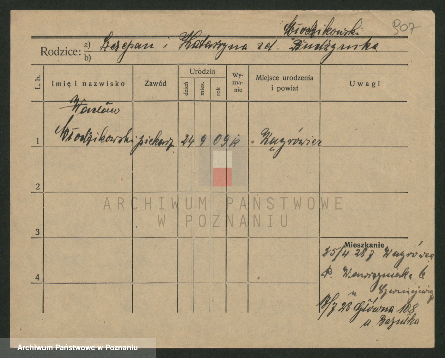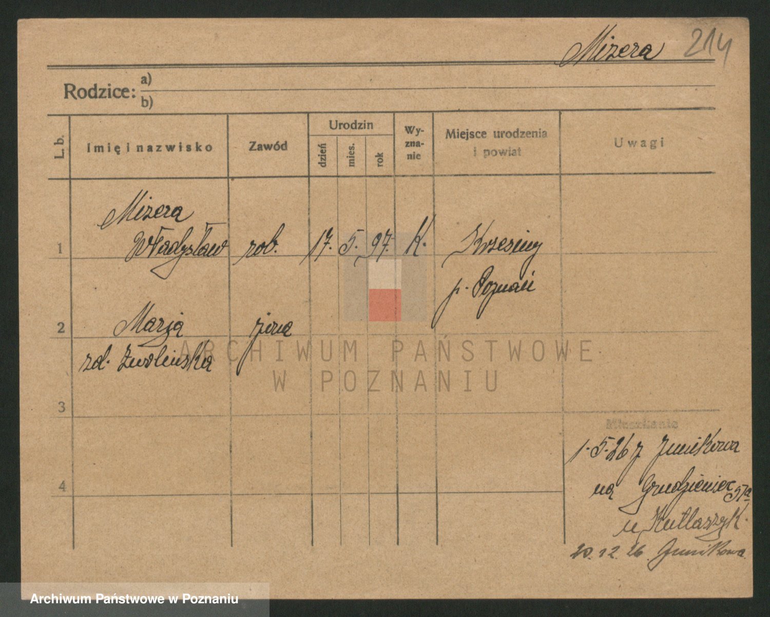 Podgląd karty osobowej dostępny jest po kliknięciu na nazwisko lub ikonkę karty. Można dokonywać powiększenia (ikony na górze) lub przechodzić między kolejnymi skanami (strzałki po bokach).